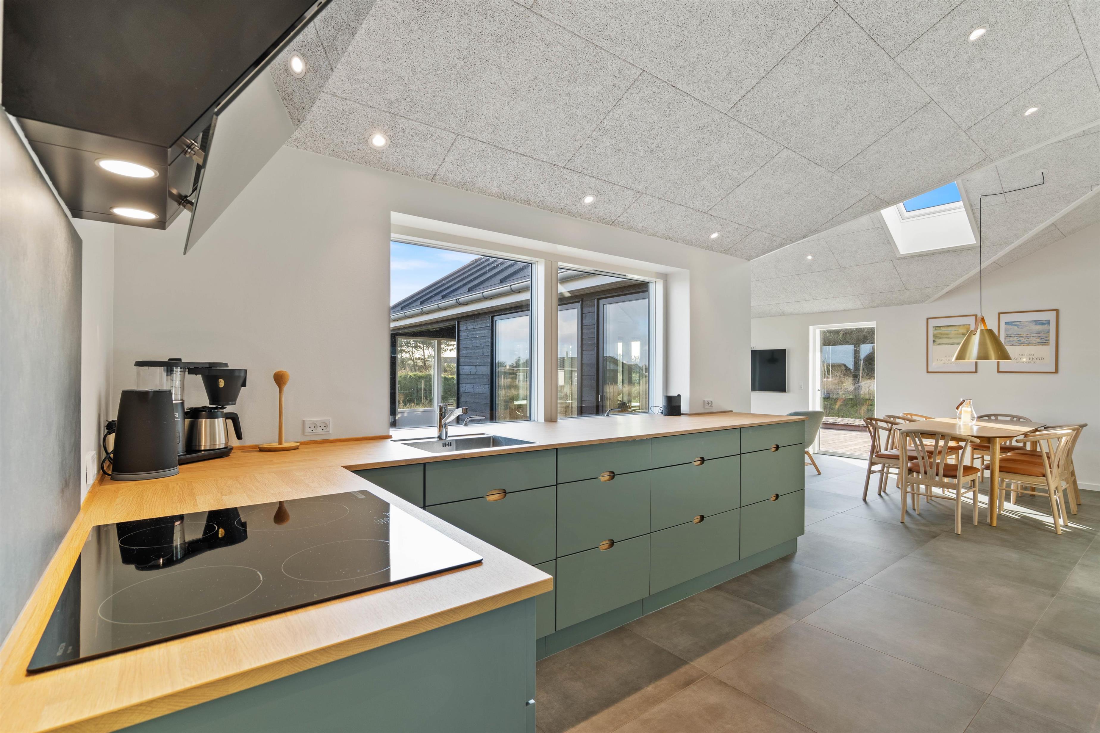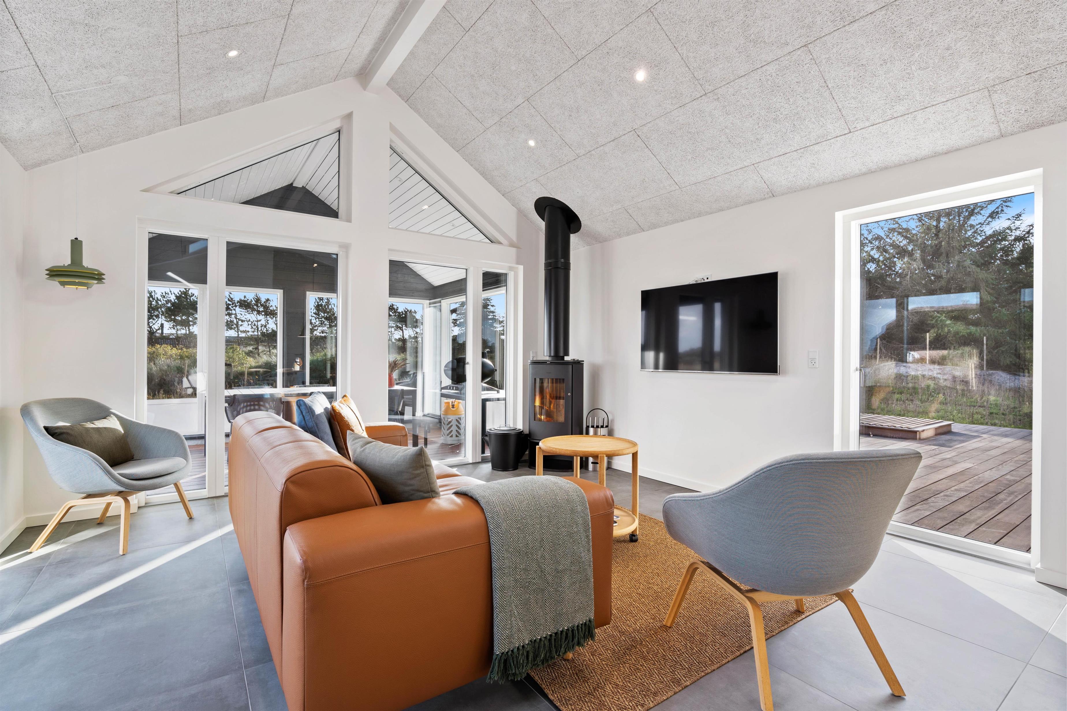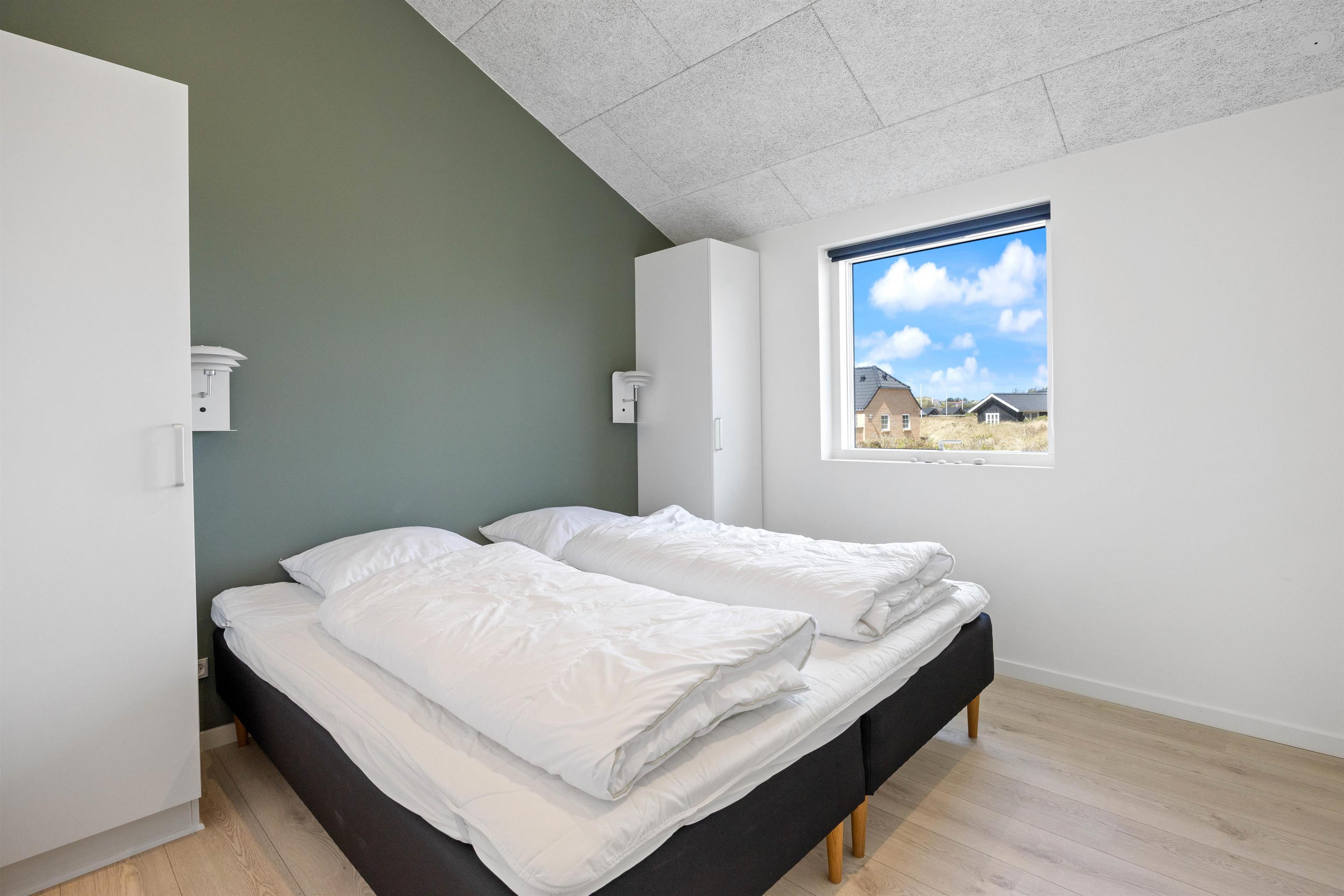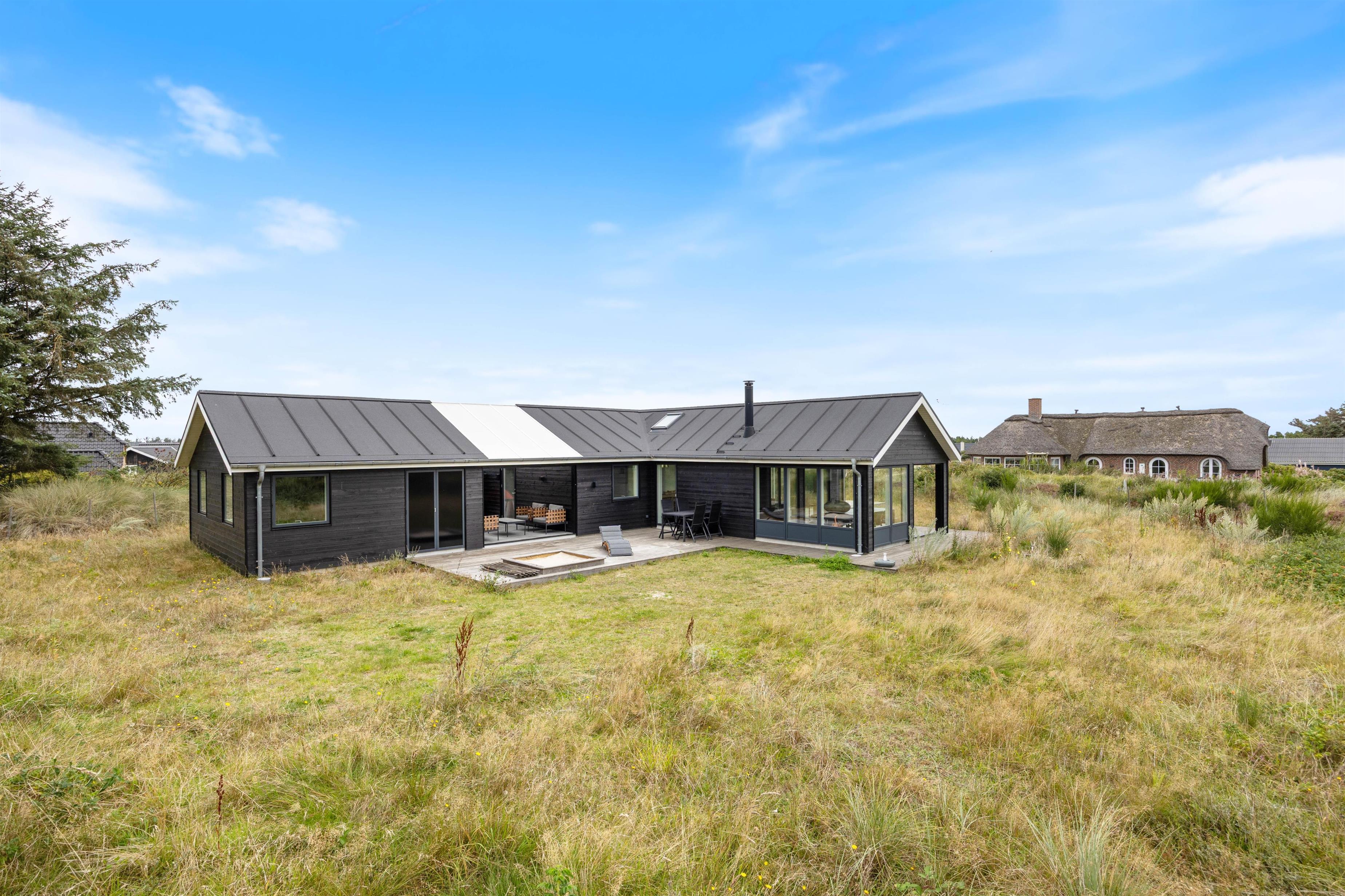 Sommerhuset på Hjelmevej 155 i Søndervig er bygget i 2022, og når I træder indenfor, bliver I mødt af en moderne indretning, som I uden tvivl vil føle jer hjemme i! Her lukker ovenlysvinduer og store vinduespartier masser af lys ind, som er med til at skabe den helt rette ferieatmosfære.