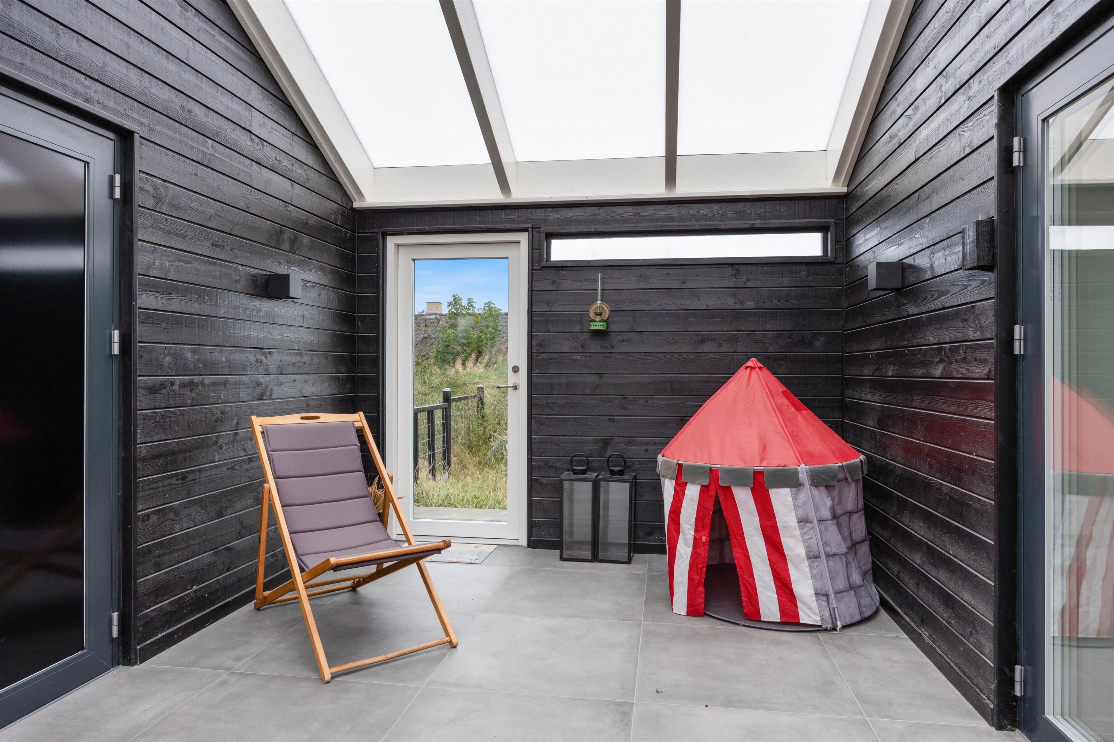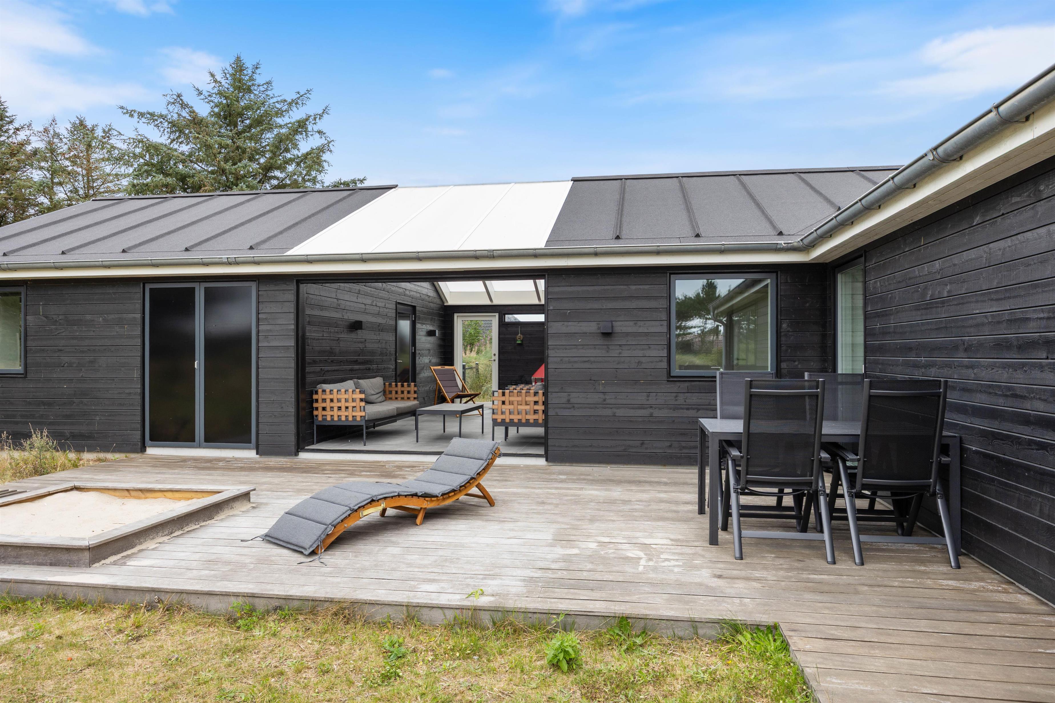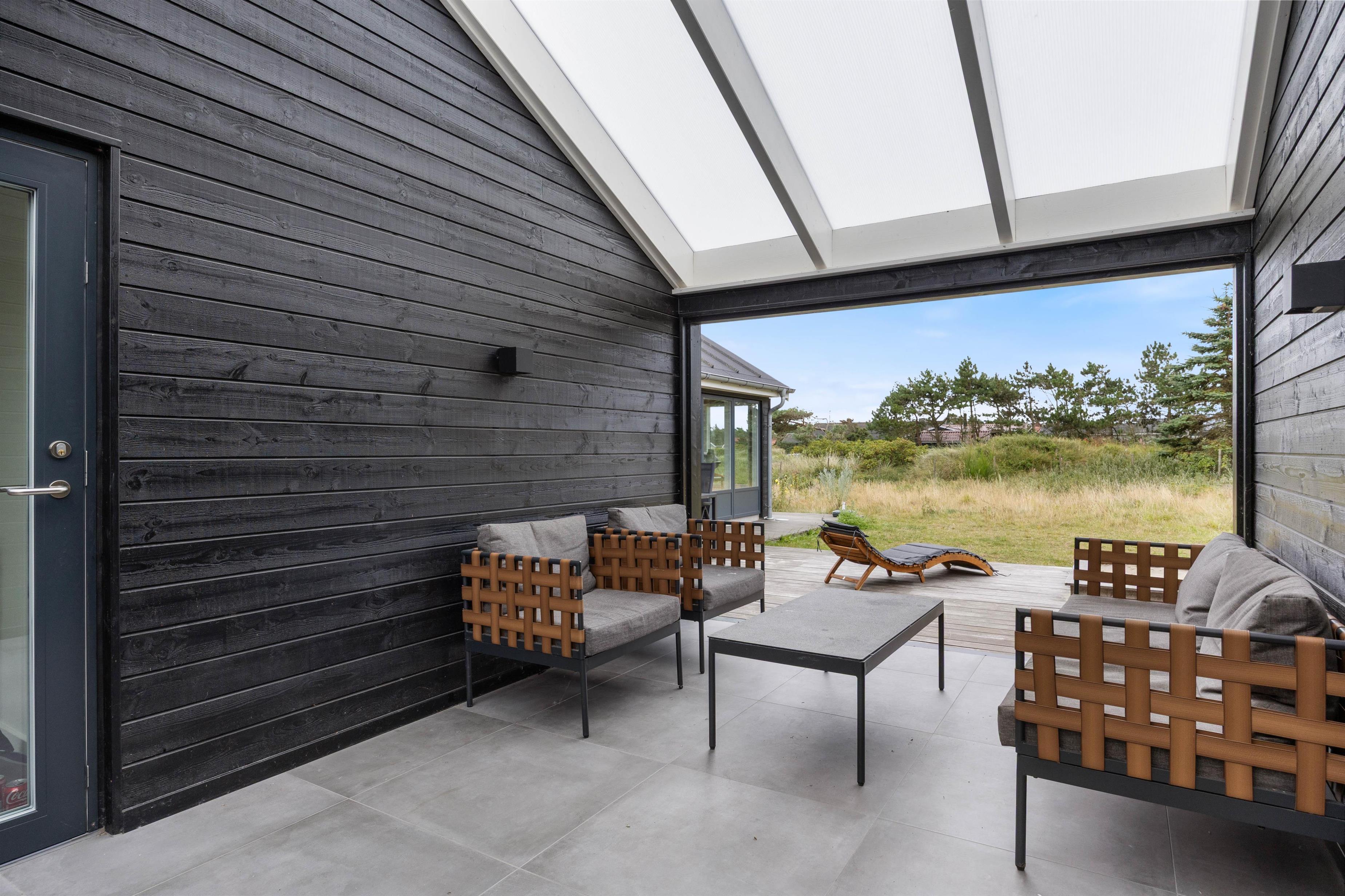 Sommerhuset byder på et dejligt udeområde, og her kan I nyde mange skønne stunder i det fri i løbet af jeres ferie. Her er der havemøbler og liggestole til jer, som I kan finde jer til rette i på en god plads, hvor I kan slappe af i solen. Noget af terrassen er desuden overdækket og afskærmet, så her kan I altså sidde i ly og læ, hvis vejret ikke er i top.