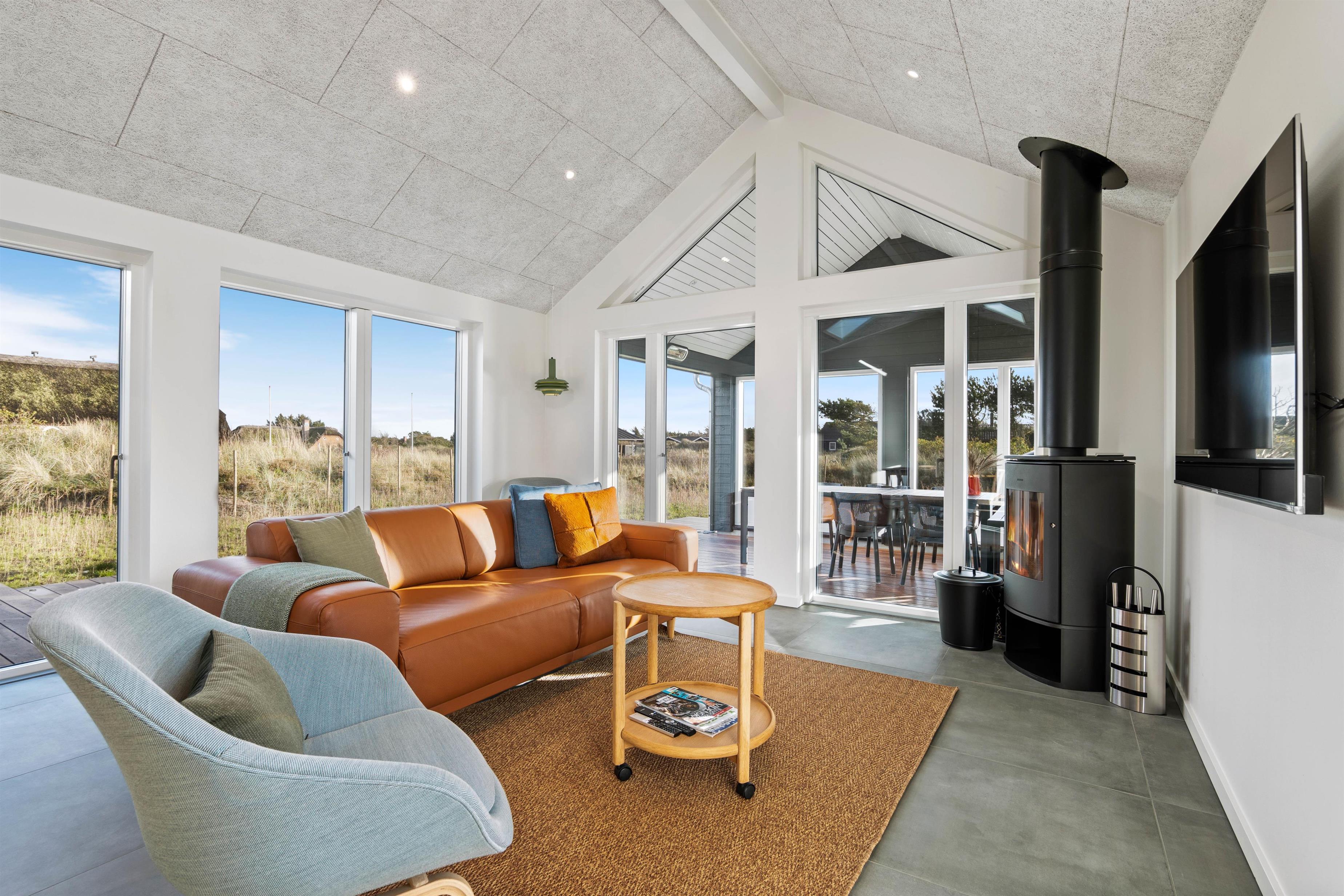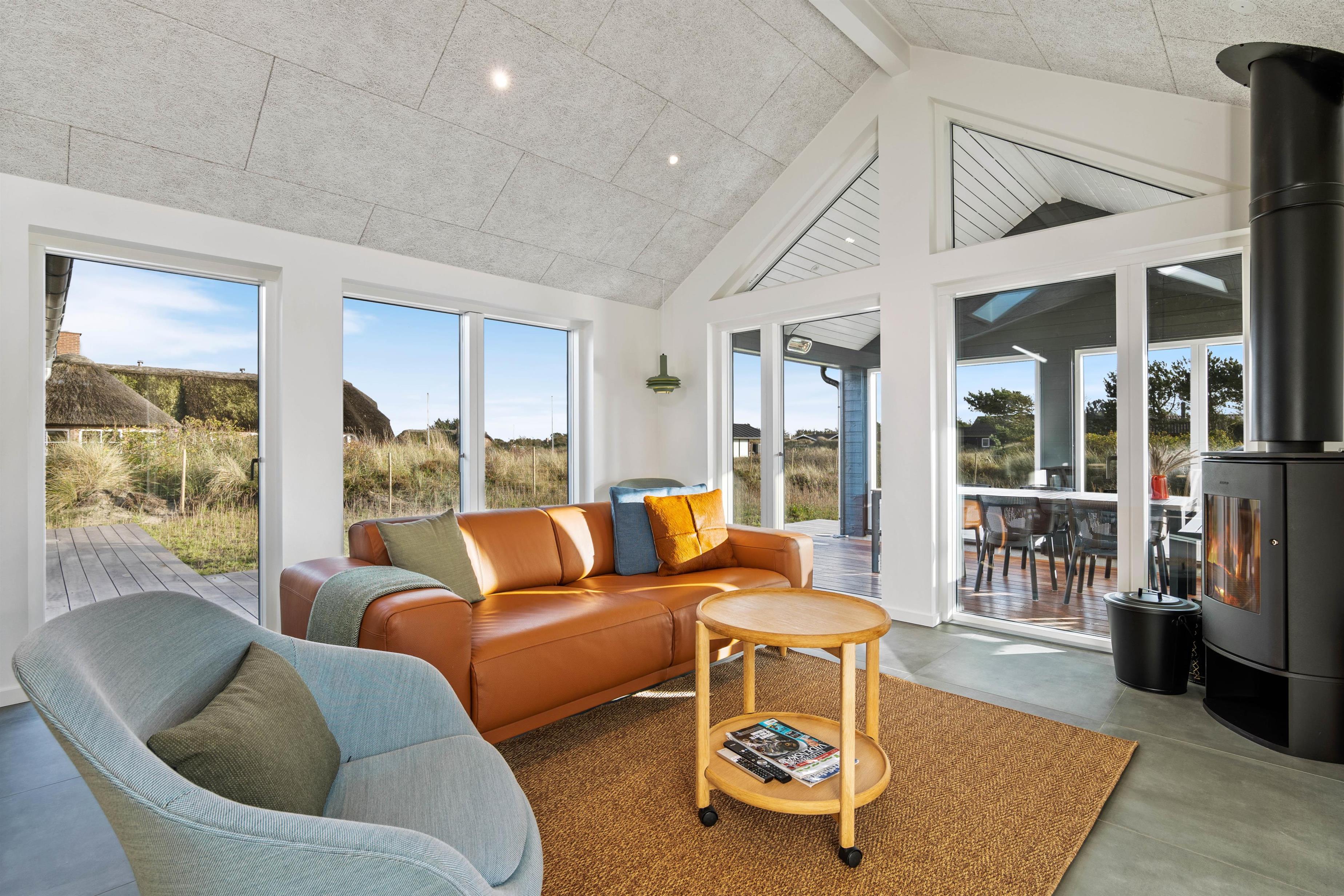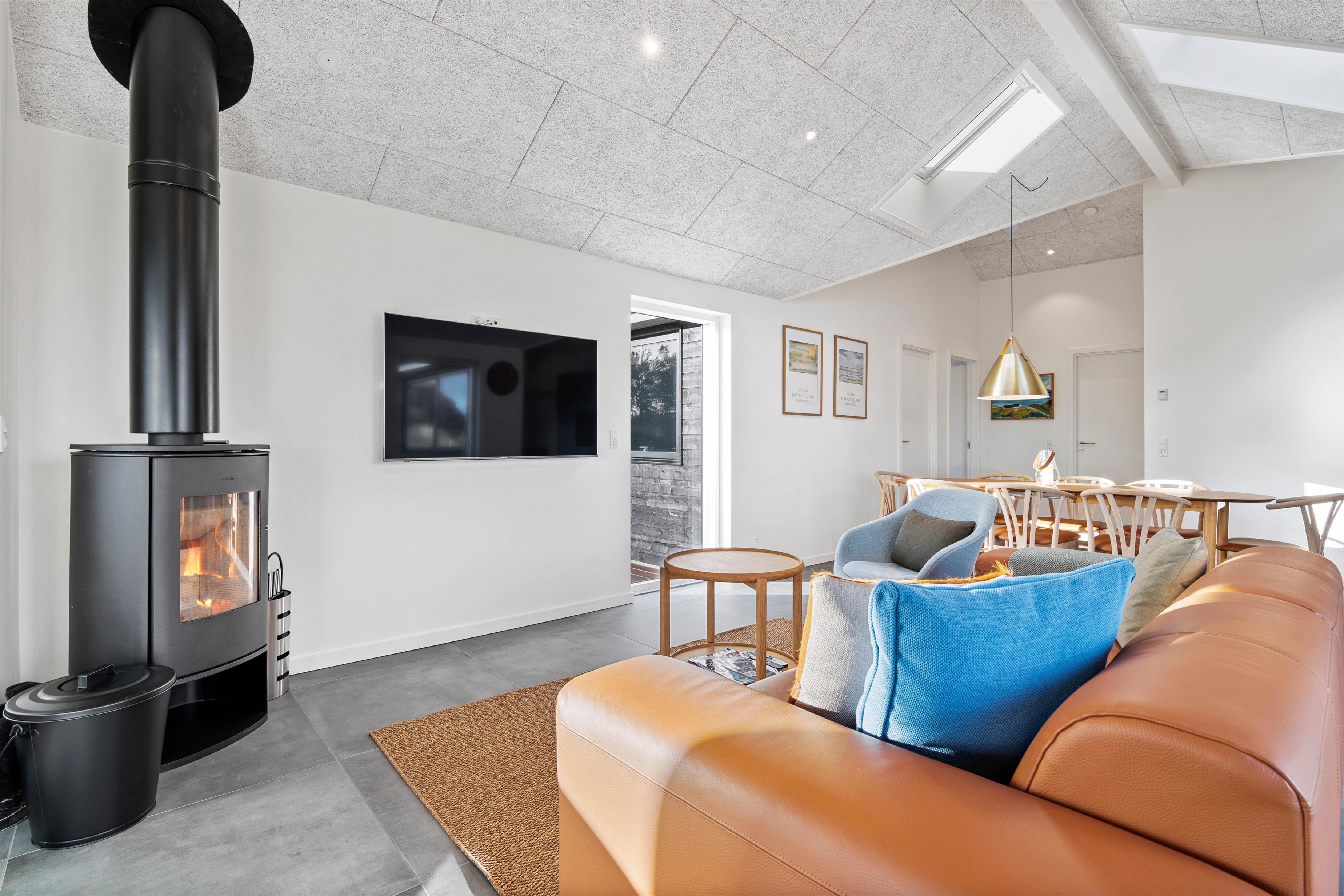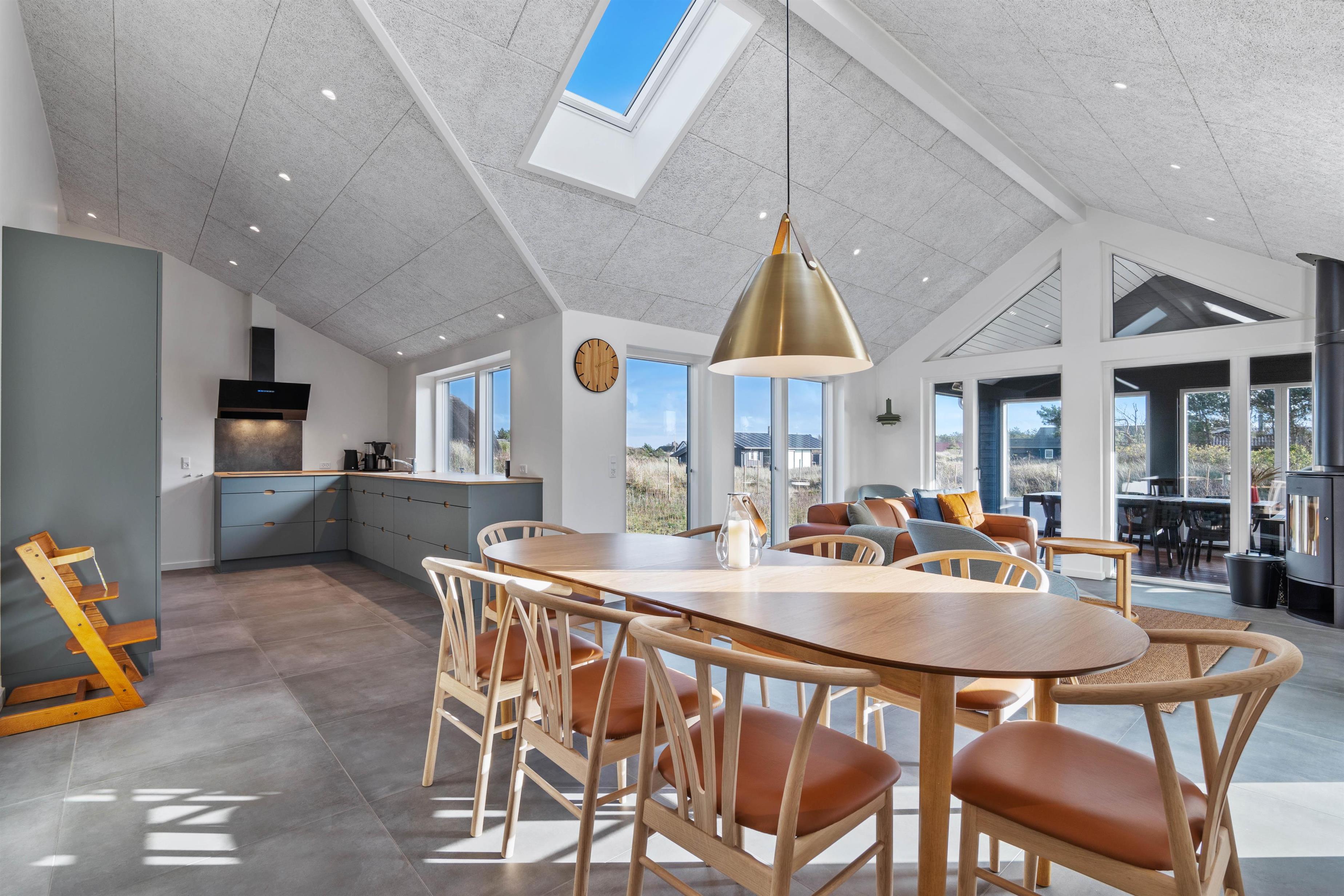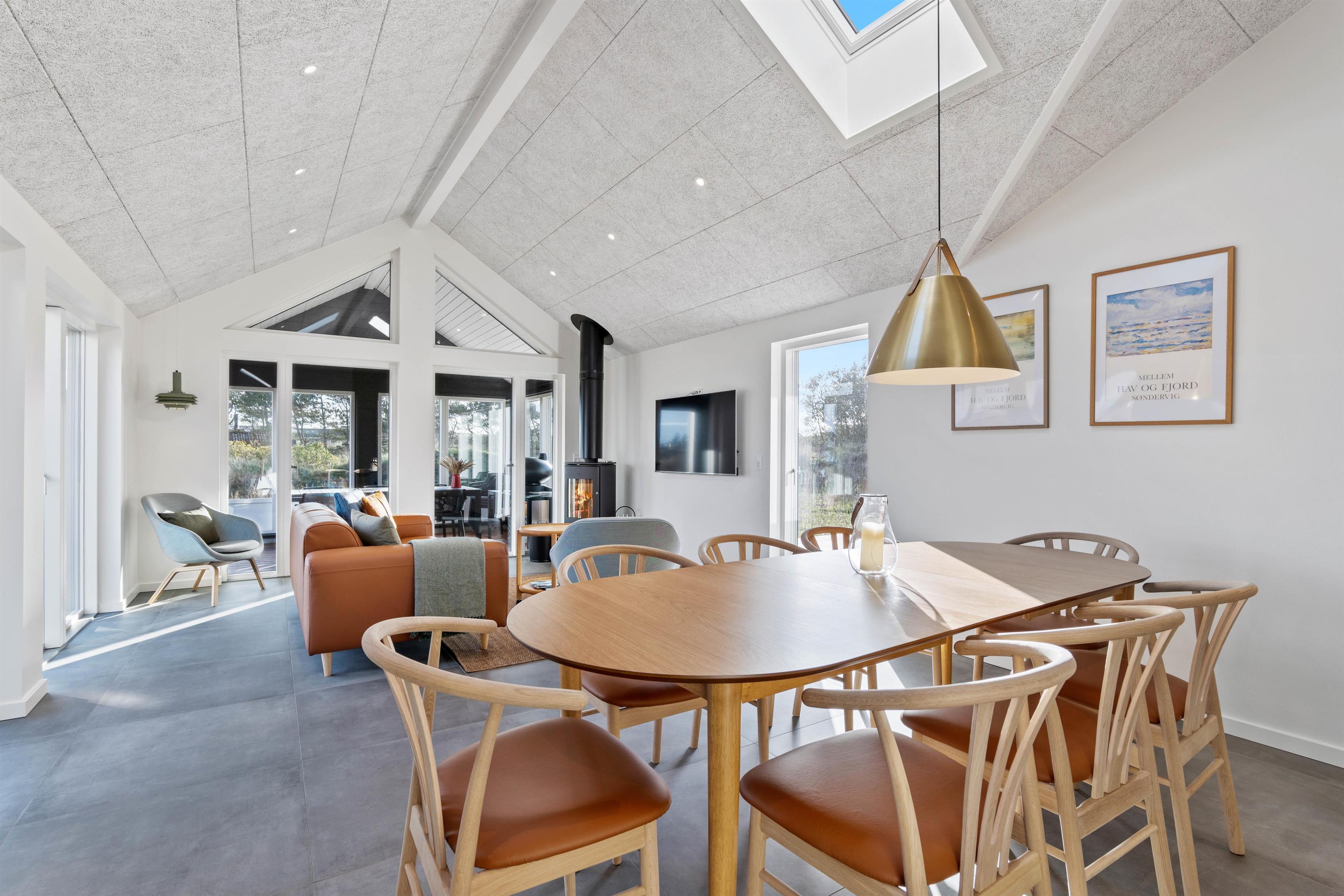 Alrummet, der forener køkken, stue og spiseplads, udgør hjertet i det 155 kvadratmeter store feriehus. Her kan I samle hele ferieflokken til hyggelige feriestunder, som brændeovnen fuldender med sin knitren i baggrunden.