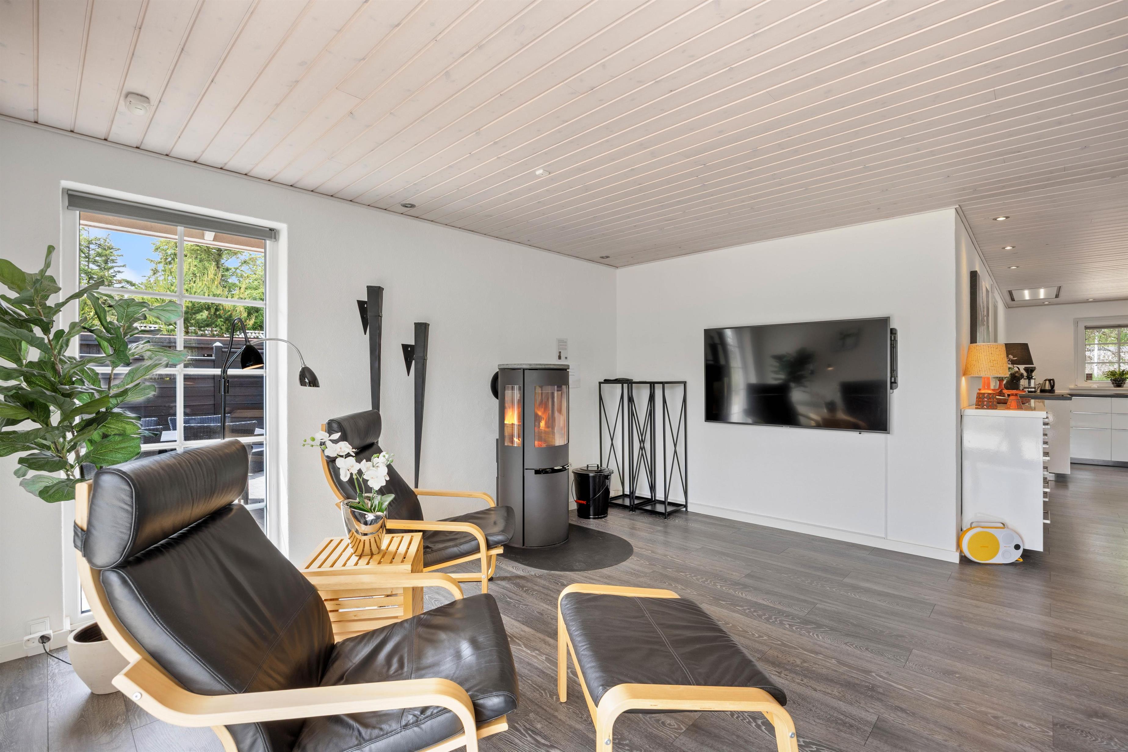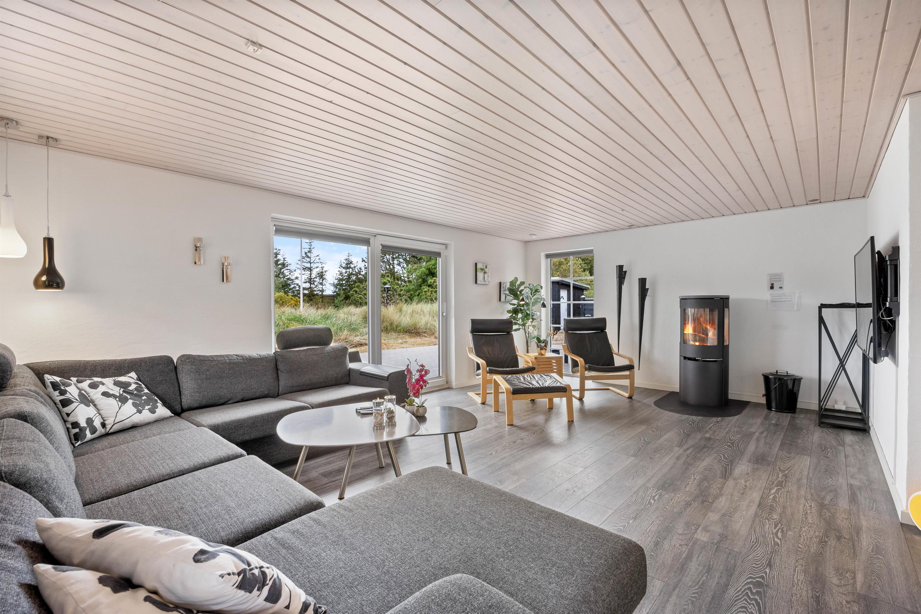 Når I træder ind i sommerhuset, møder I et hyggeligt og rummeligt køkken-alrum. Her er blandt andet en lækker brændeovn, hvor I kan sætte jer godt til rette foran den knitrende ild på kølige aftener og bare slappe af. Ved siden af er der en åben spiseplads med plads til seks personer. Det store vinduesparti i stuen sørger også for et godt lysindfald, hvilket er prikken over i’et i dette dejlige rum.