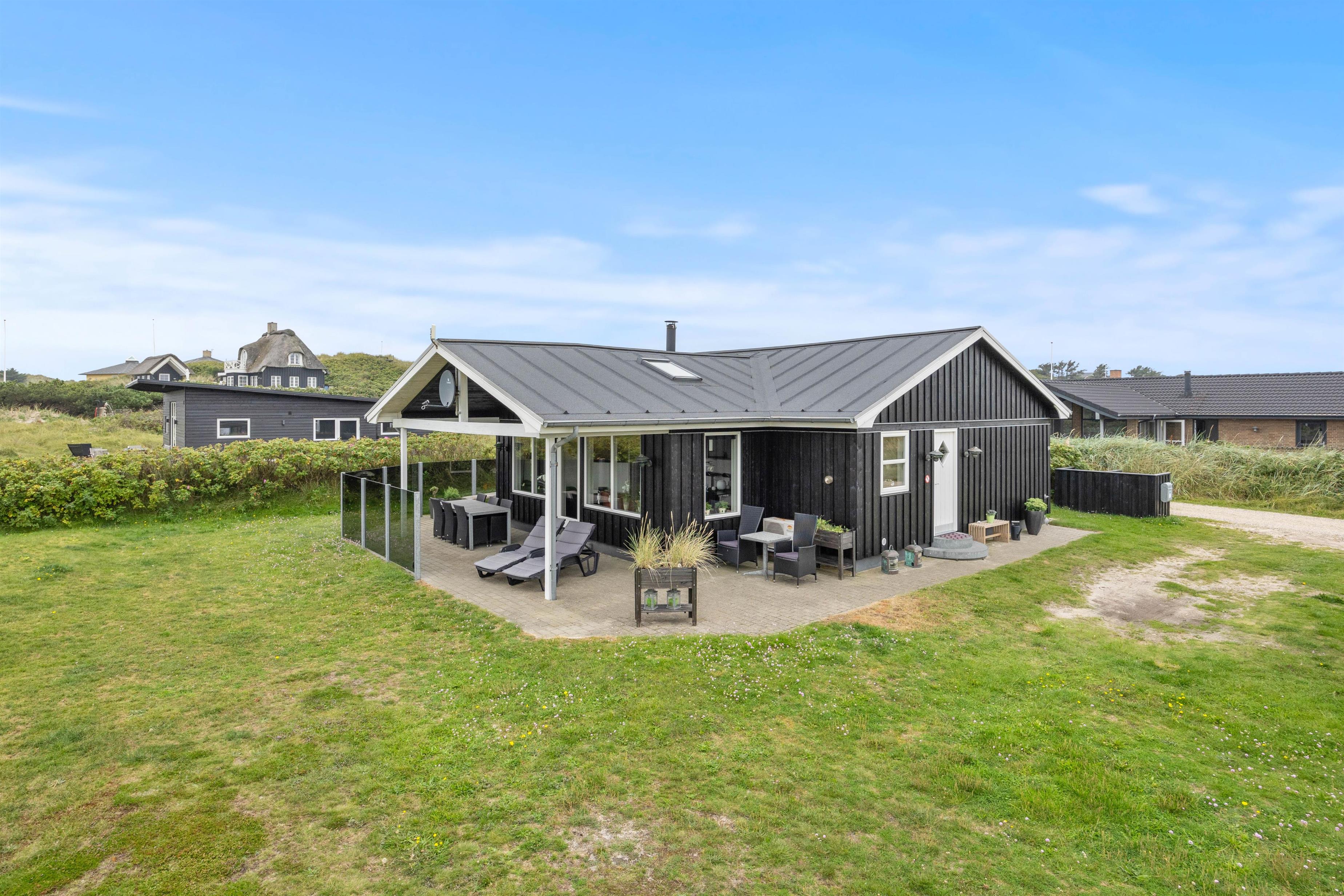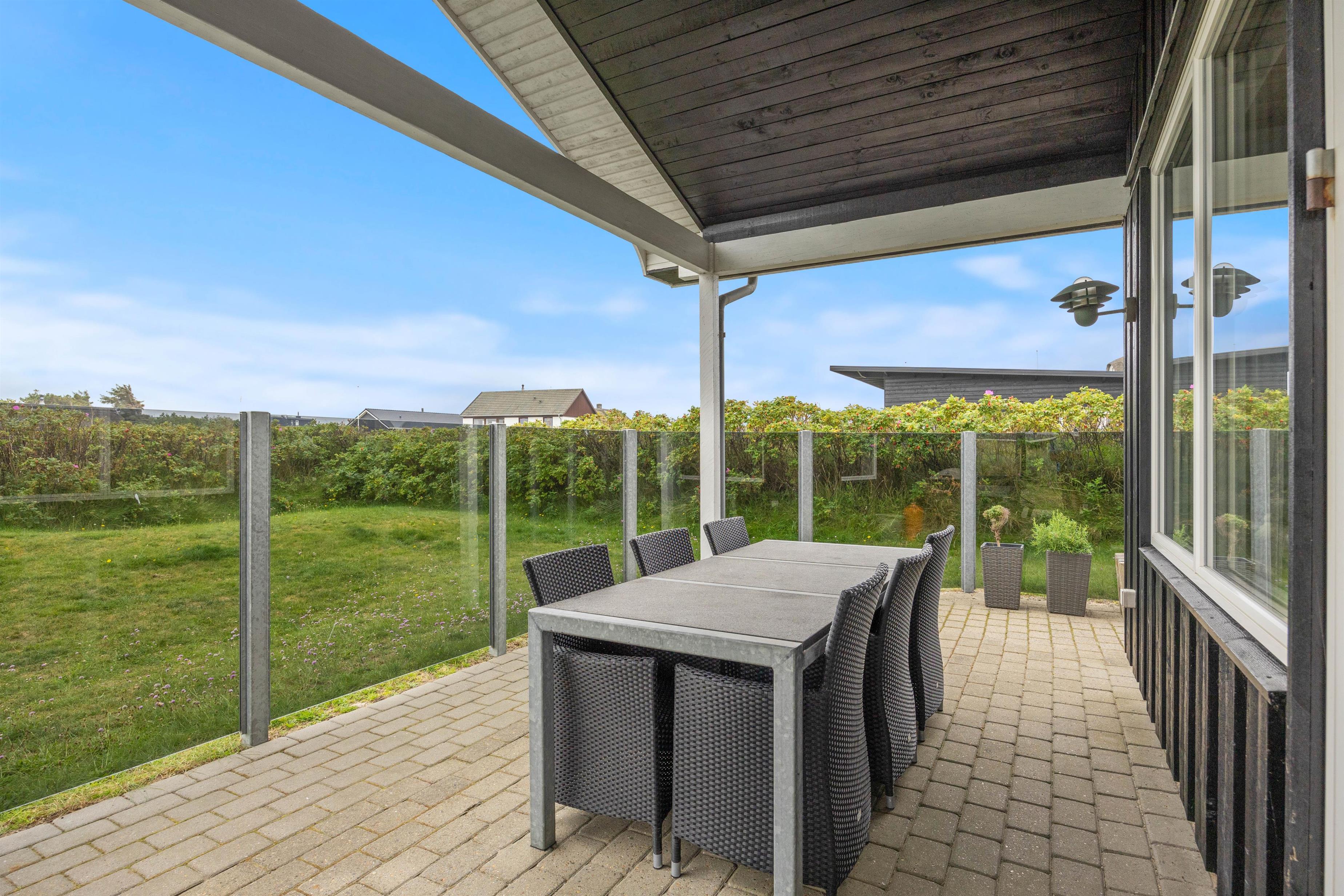 Når I træder uden for feriehuset på Nordsøvej 94, møder I mod syd en god, delvis overdækket terrasse, så I har mulighed for at læne jer tilbage i feriehusets havemøbler og liggestole og nyde det omkringliggende område og den friske havluft samtidig med, at den tilhørende grill sørger for et lækkert aftensmåltid.