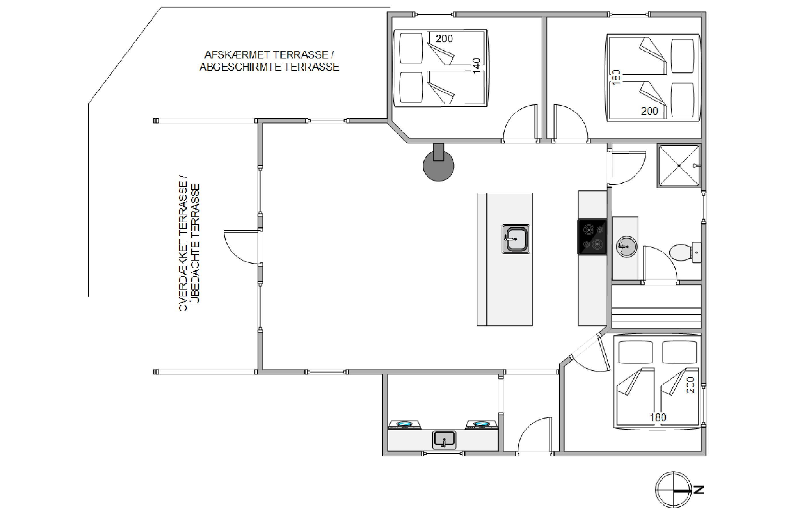 Feriehuset råder over 6 sovepladser fordelt på 3 soverum, der hver især er udstyret med en dobbeltseng. Her kan I efter en god lang dag igen lade batterierne op. Derudover er der et rigtigt flot og rummeligt badeværelse, hvorfra I har adgang til saunaen, som især på de køligere dage indbyder til afslapning, varme og velvære for krop og sjæl.