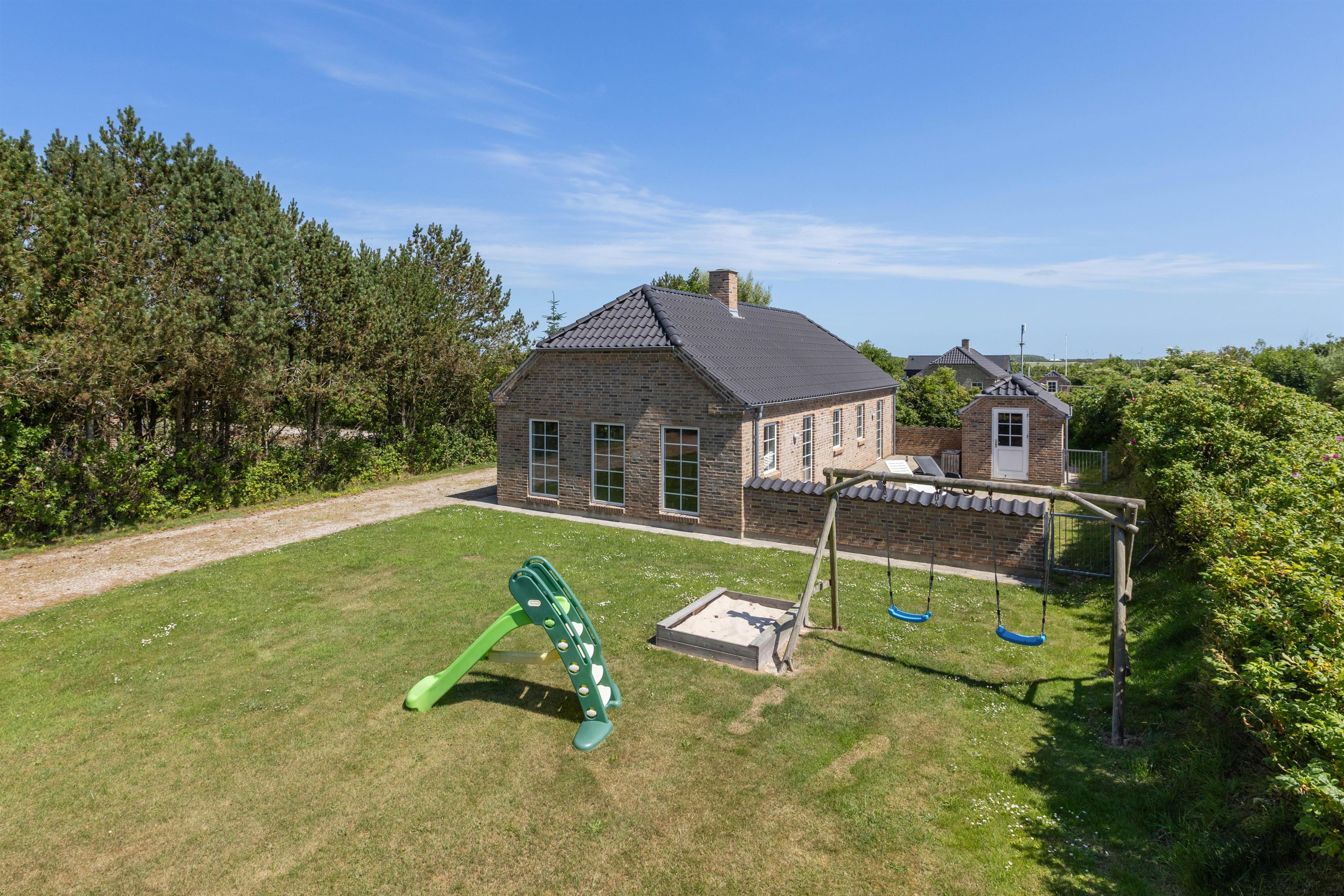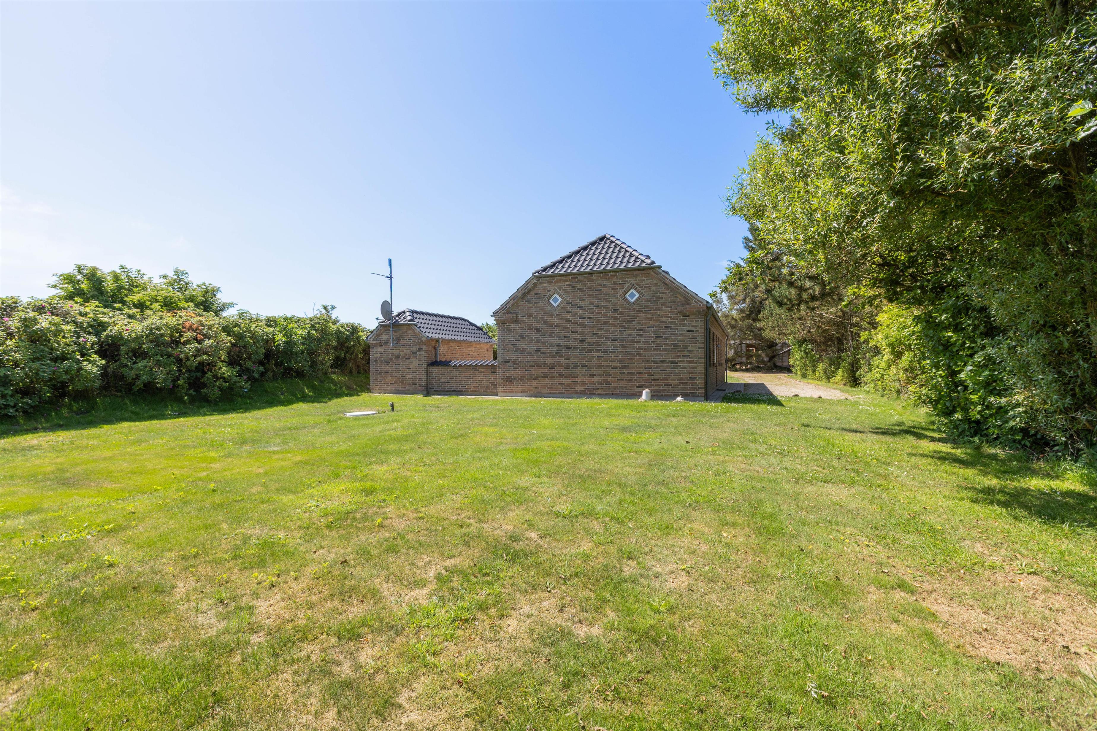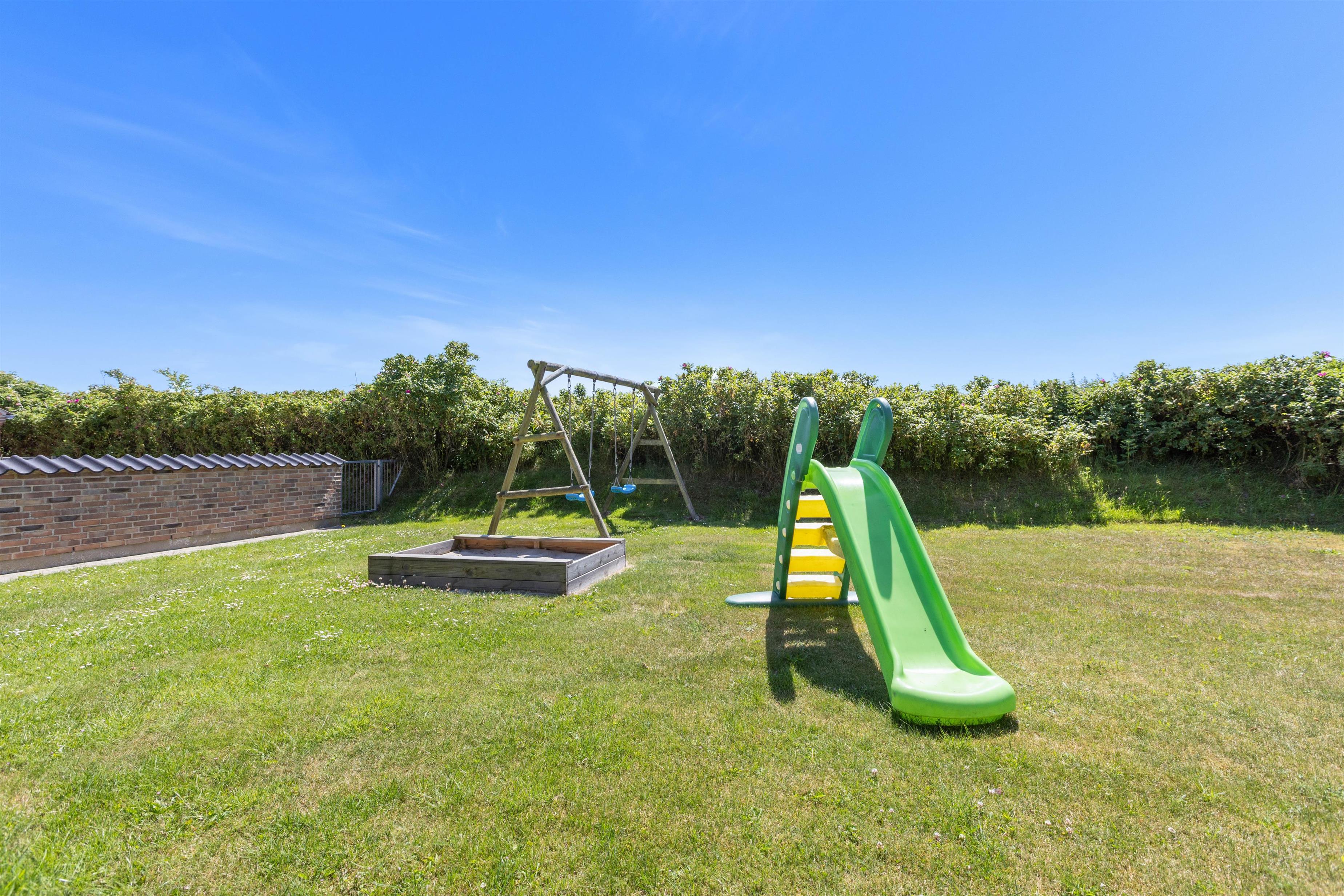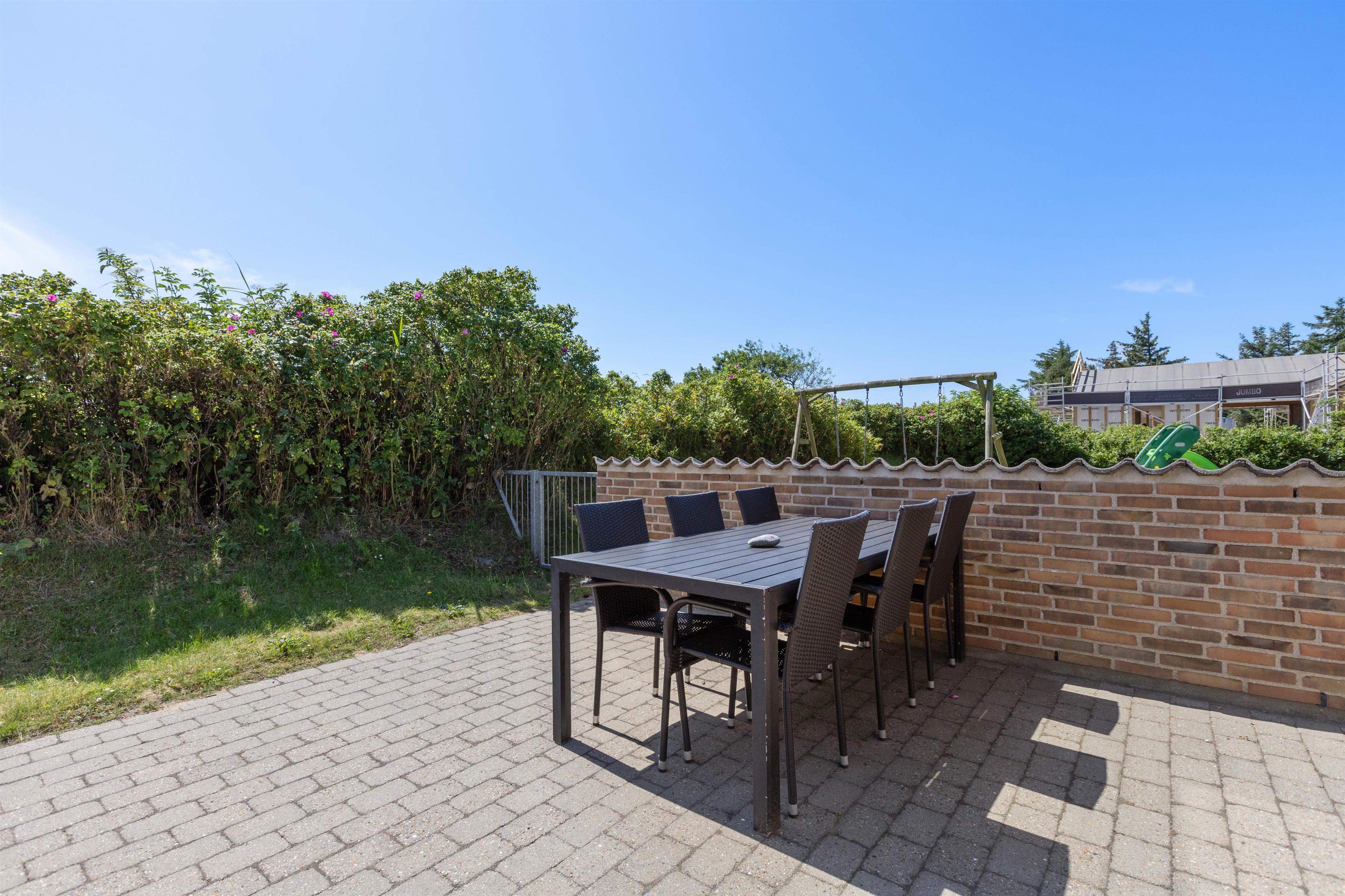 En skøn græsplane med gynge og sandkasse hører til huset, her kan børn og barnlige sjæle rigtig boltre sig. Grunden er naturligt afskærmet af buske, træer og en lang høj. Terrassen er udstyret med havebord, stole og solsenge og selvfølgelig en grill, så man kan nyde de lange skønne aftener om sommeren. Terasssen er endvidere også lukket, hvilket er meget praktisk hvis man rejser med småbørn
