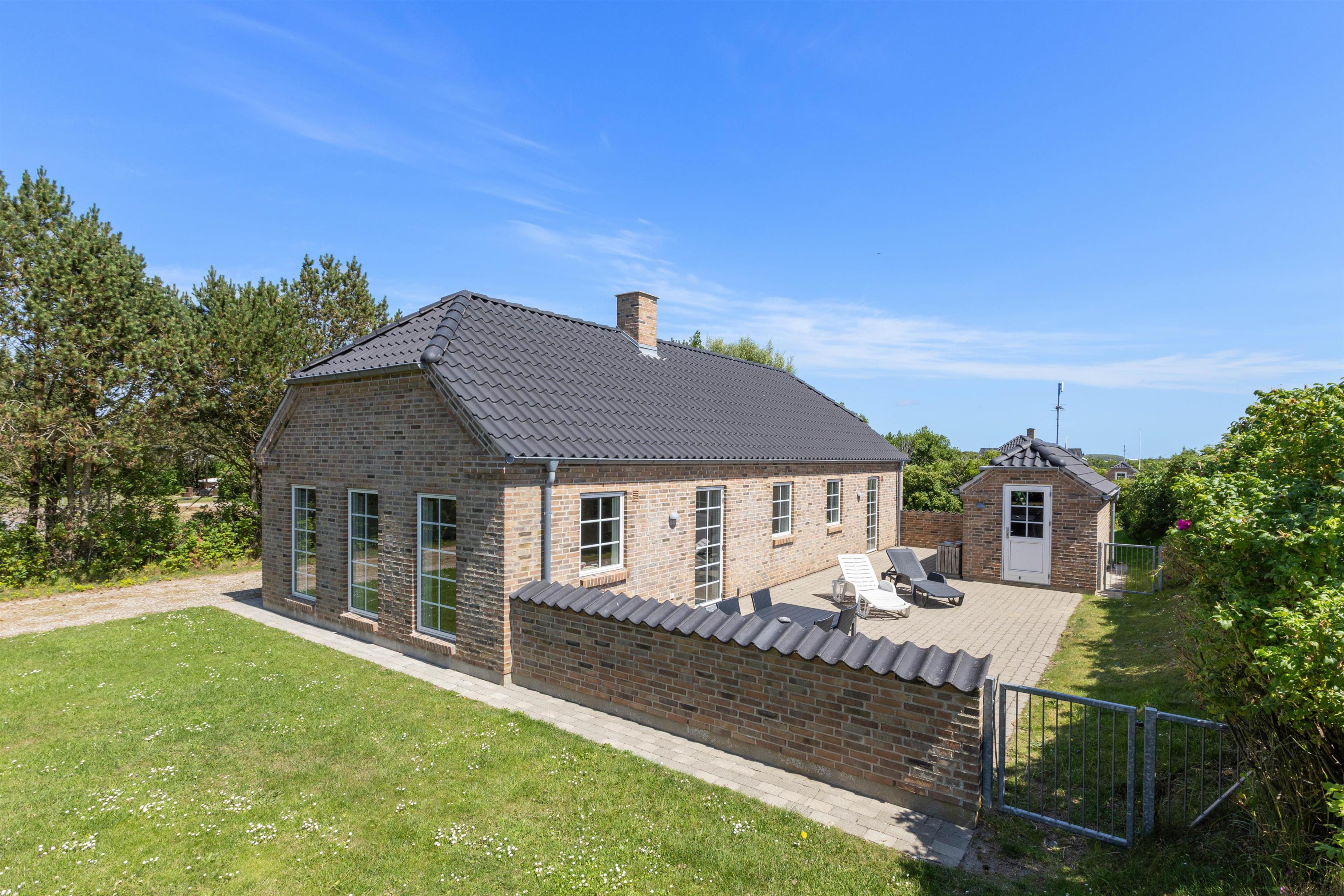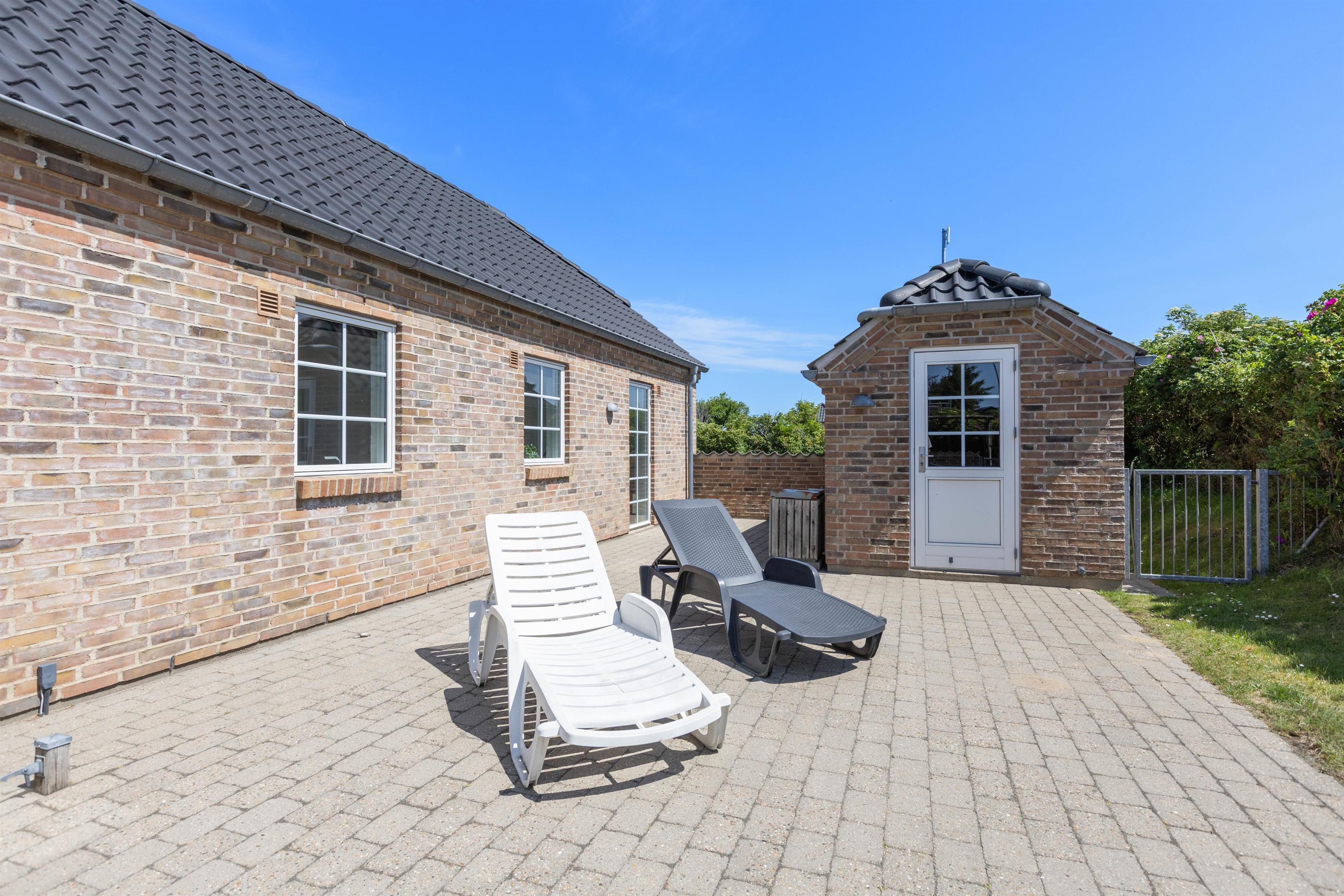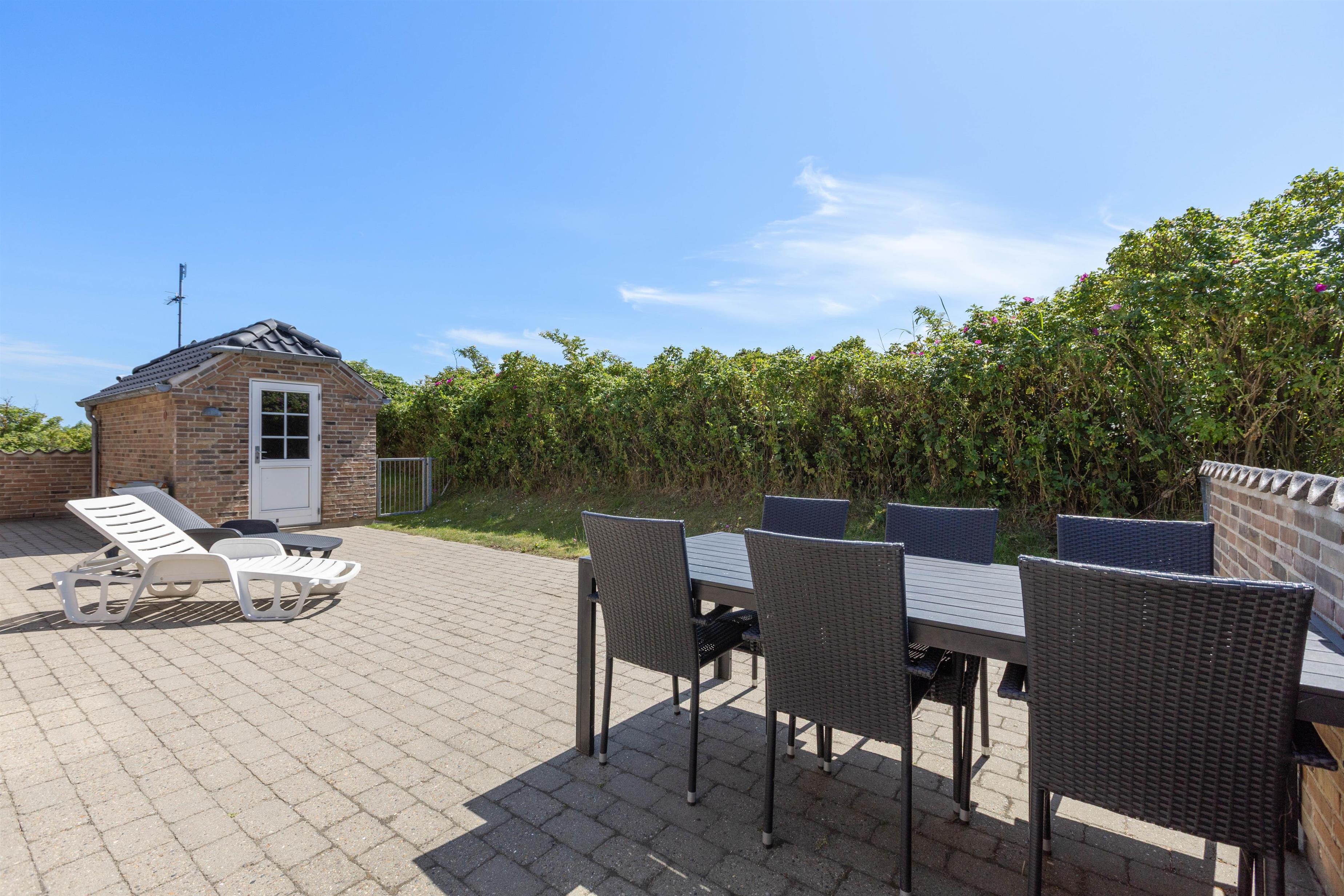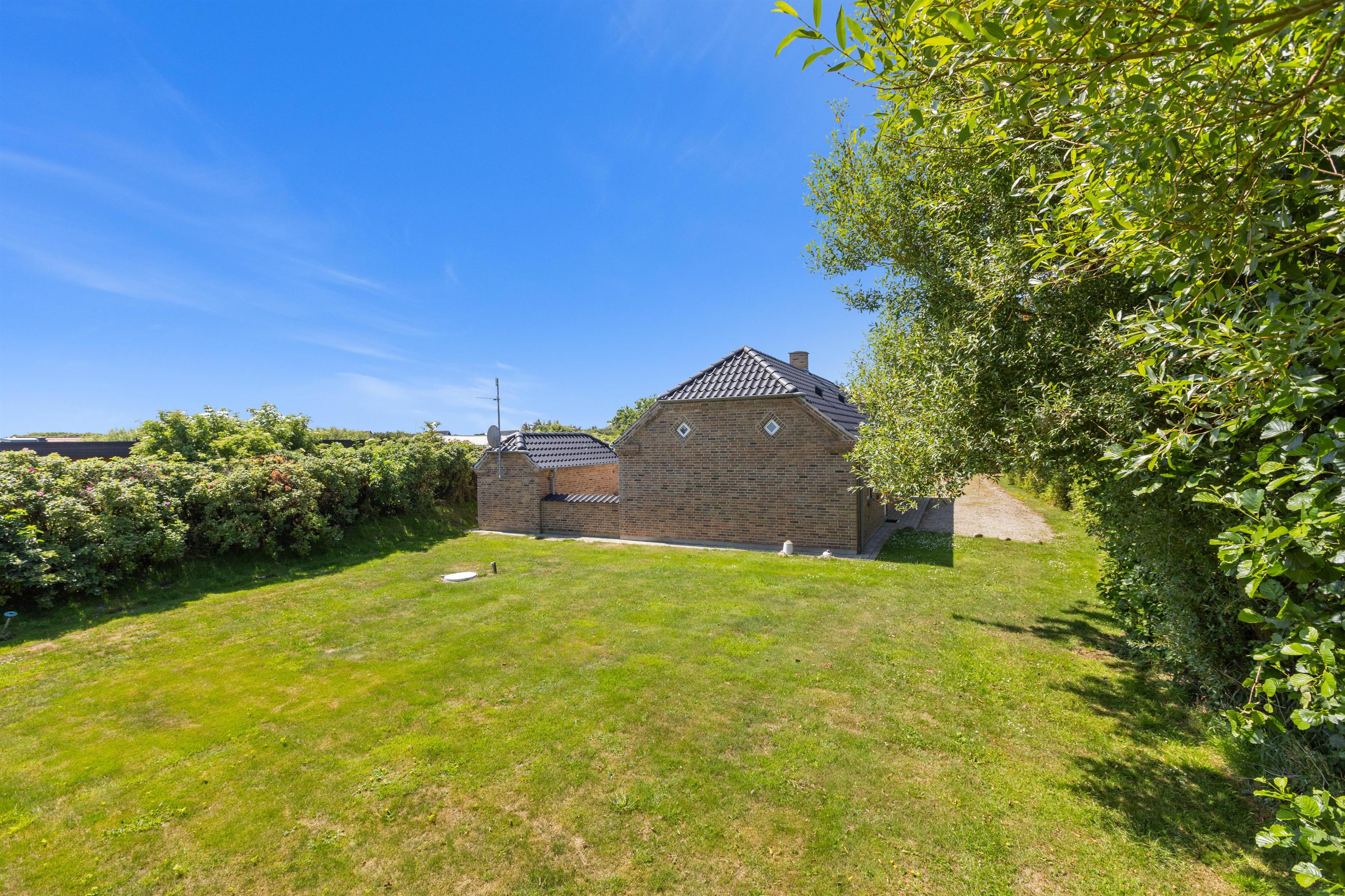 En skøn græsplane med gynge og sandkasse hører til huset, her kan børn og barnlige sjæle rigtig boltre sig. Grunden er naturligt afskærmet af buske, træer og en lang høj. Terrassen er udstyret med havebord, stole og solsenge og selvfølgelig en grill, så man kan nyde de lange skønne aftener om sommeren. Terasssen er endvidere også lukket, hvilket er meget praktisk hvis man rejser med småbørn