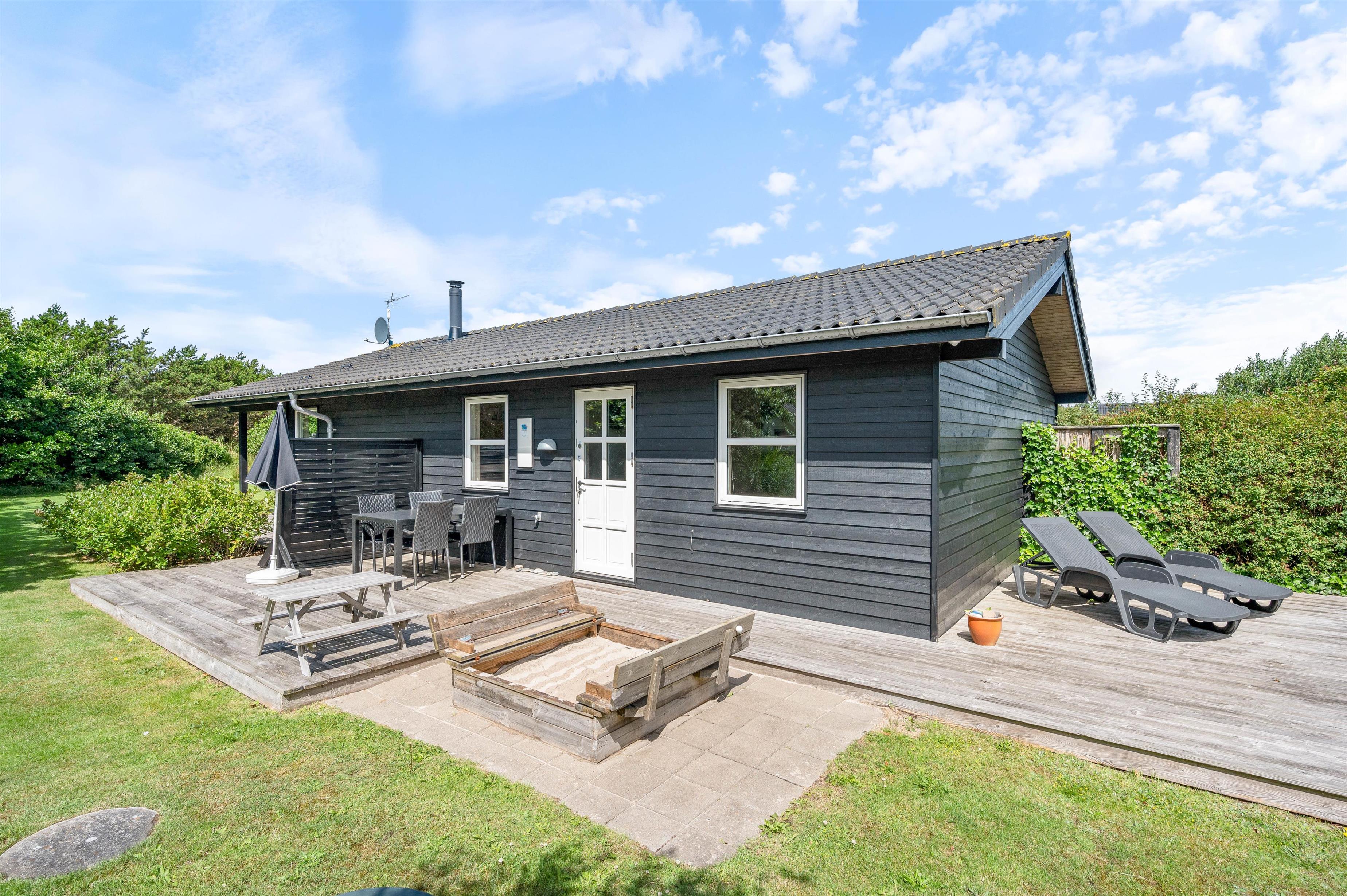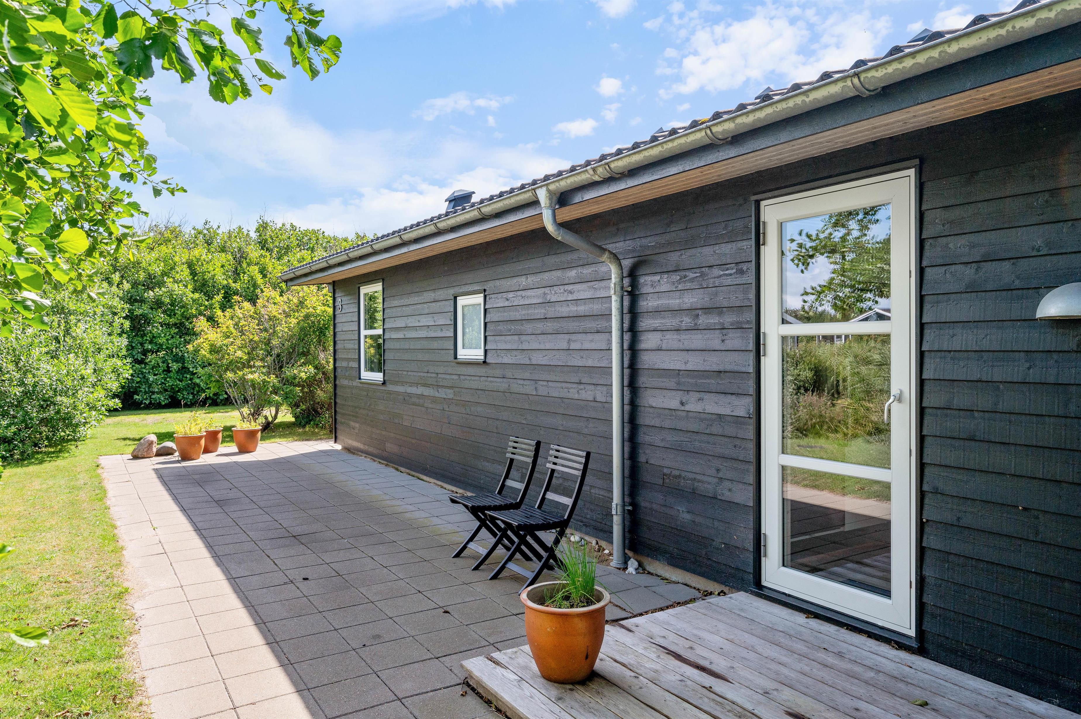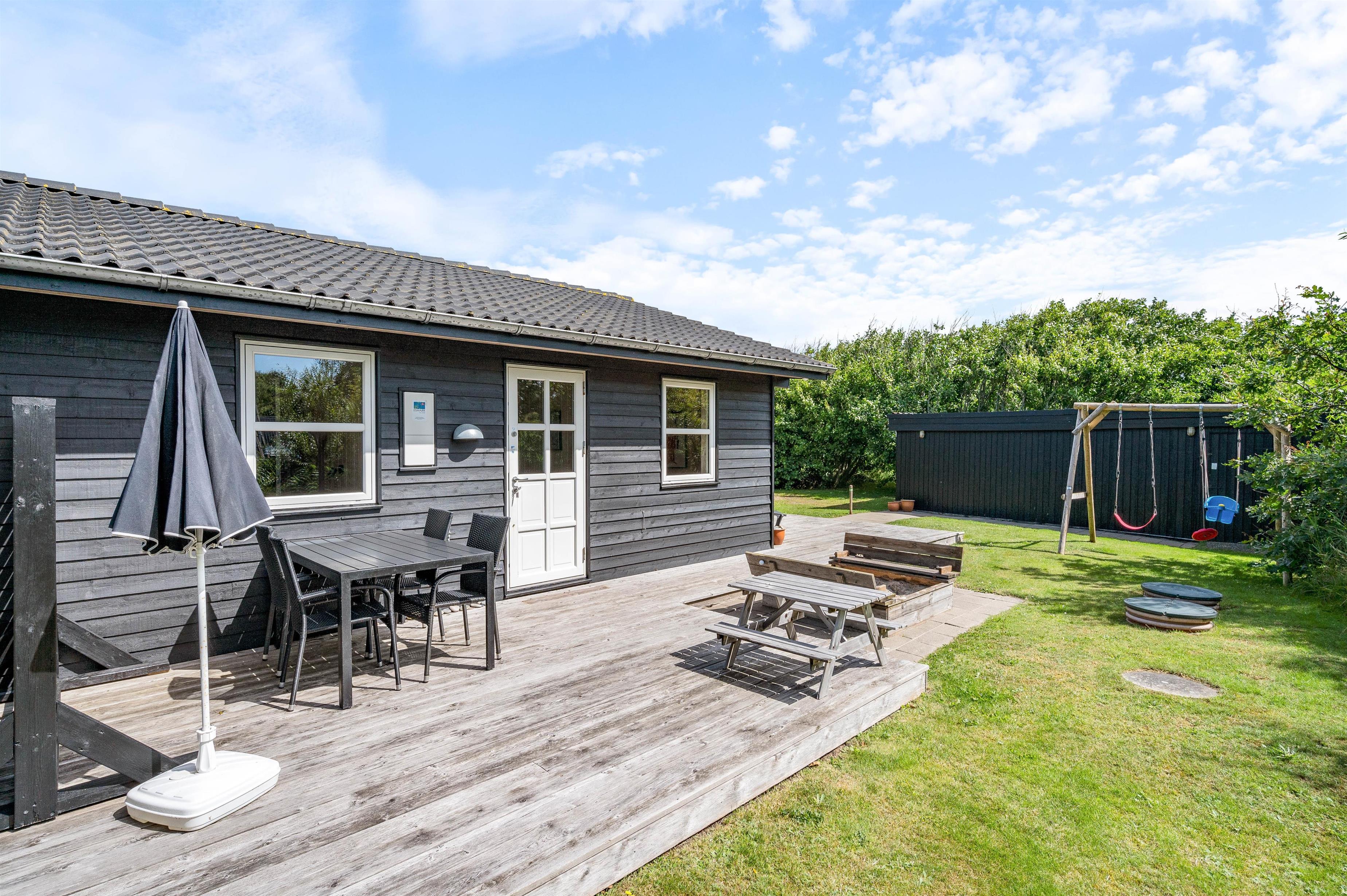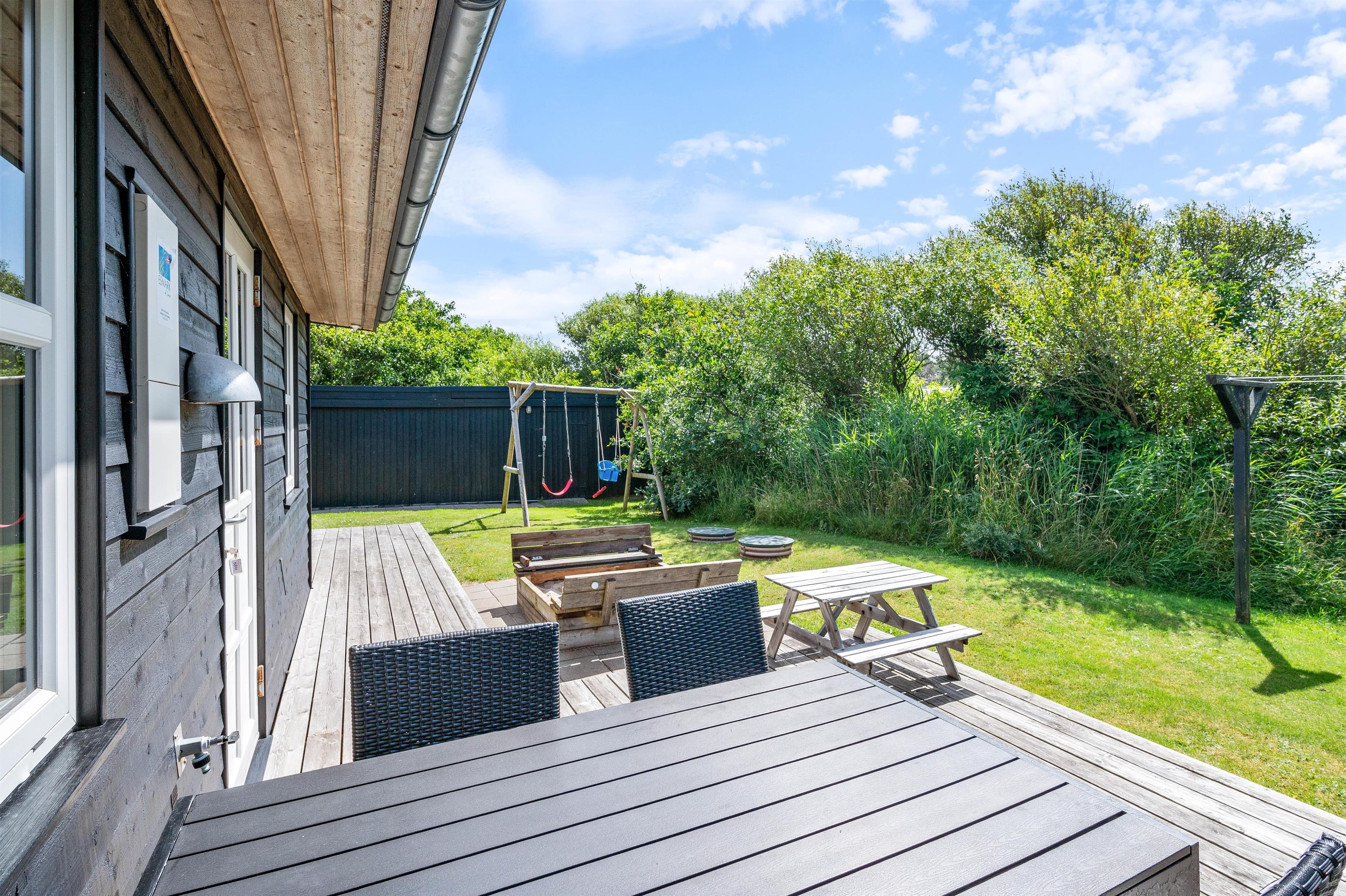 Fra stuen træder I ud på en stor, delvist overdækket terrasse, som omkranser huset næsten hele vejen rundt. Her kan I nyde en dejlig grillmiddag tilberedt på husets grill. For børnens velbehag er der en dejlig stor græsplane med et fodboldmål og en rigtig god sandkasse som kan lukkes, og selvfølgelig er der også en gynge. På terrassen kan de lange lyse sommer aftner nydes i gode møbler. Feriehuset ligger på en naturlig afskærmet grund, ikke langt fra Søndervig centrum.