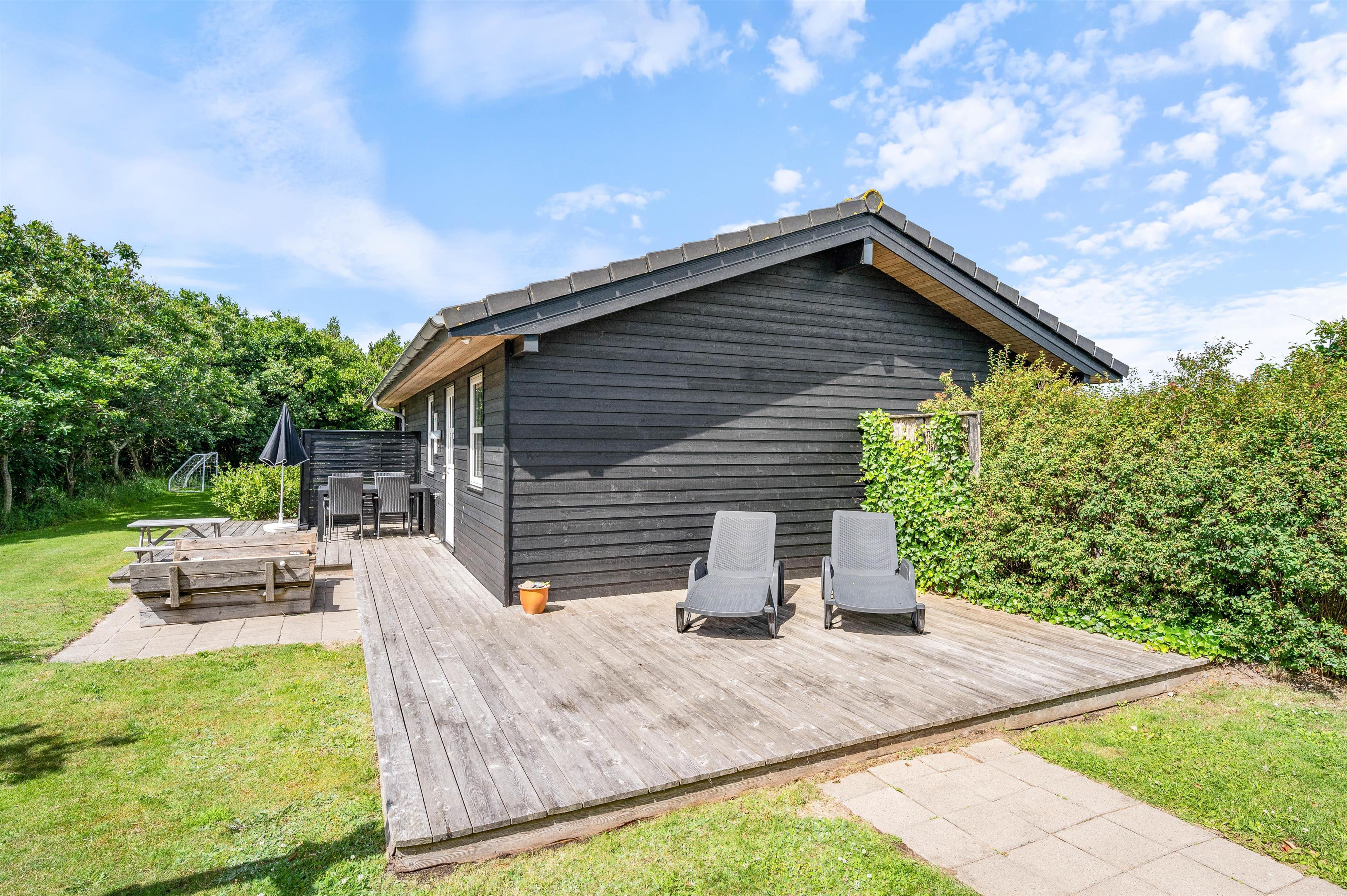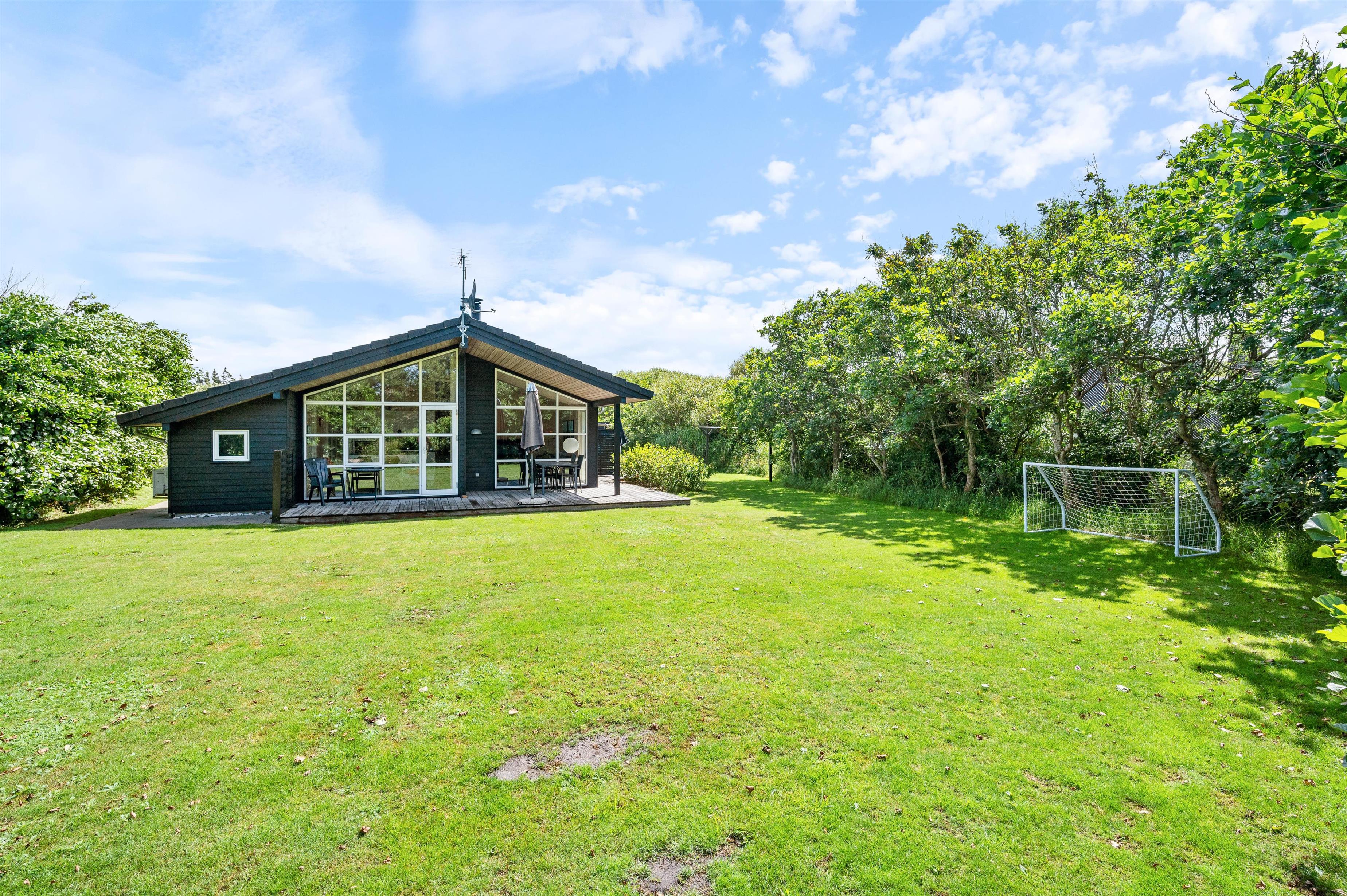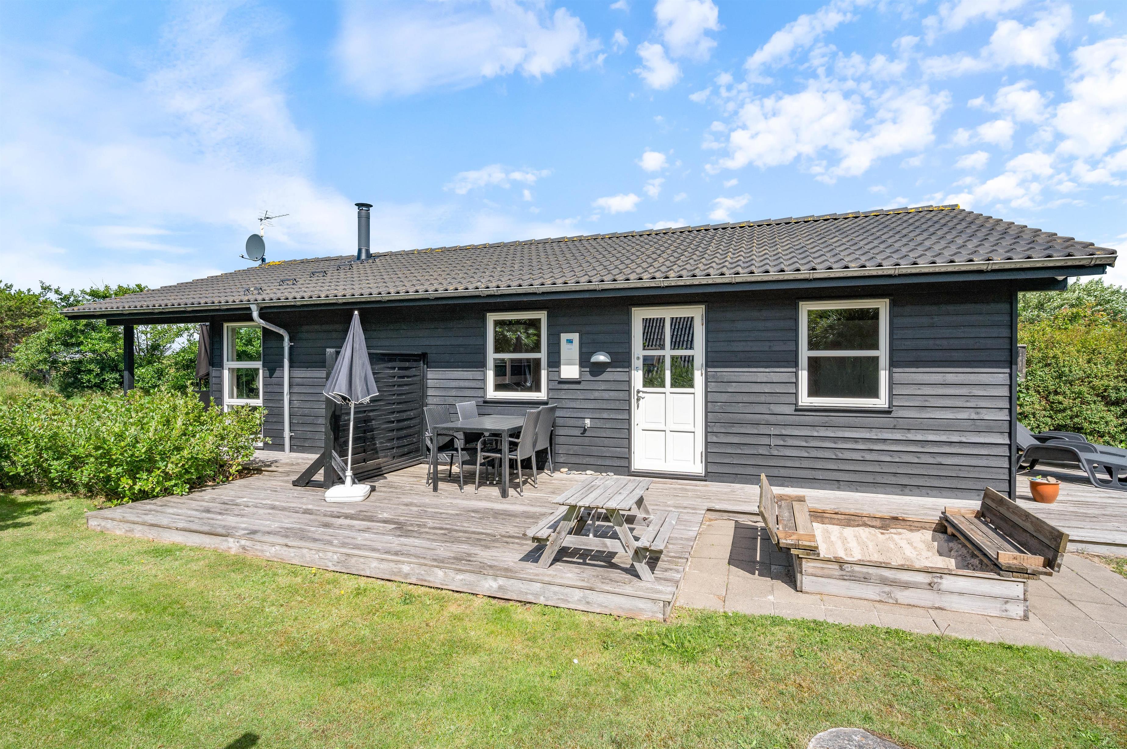 Fra stuen træder I ud på en stor, delvist overdækket terrasse, som omkranser huset næsten hele vejen rundt. Her kan I nyde en dejlig grillmiddag tilberedt på husets grill. For børnens velbehag er der en dejlig stor græsplane med et fodboldmål og en rigtig god sandkasse som kan lukkes, og selvfølgelig er der også en gynge. På terrassen kan de lange lyse sommer aftner nydes i gode møbler. Feriehuset ligger på en naturlig afskærmet grund, ikke langt fra Søndervig centrum.