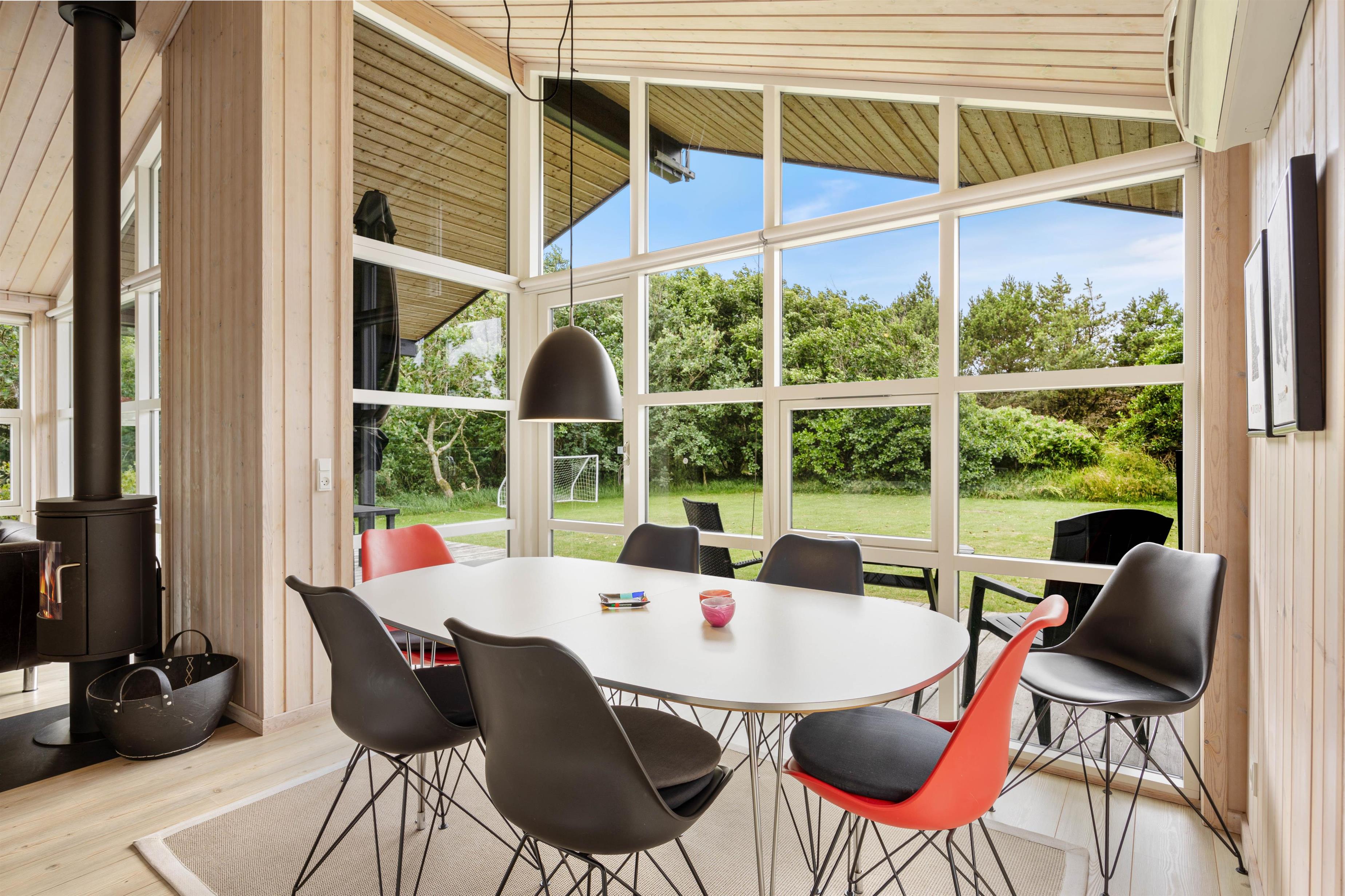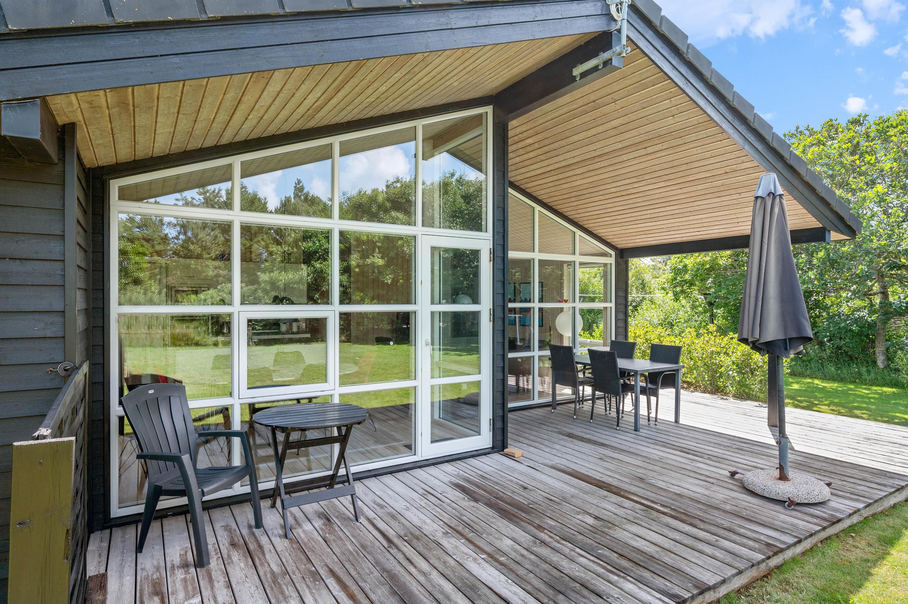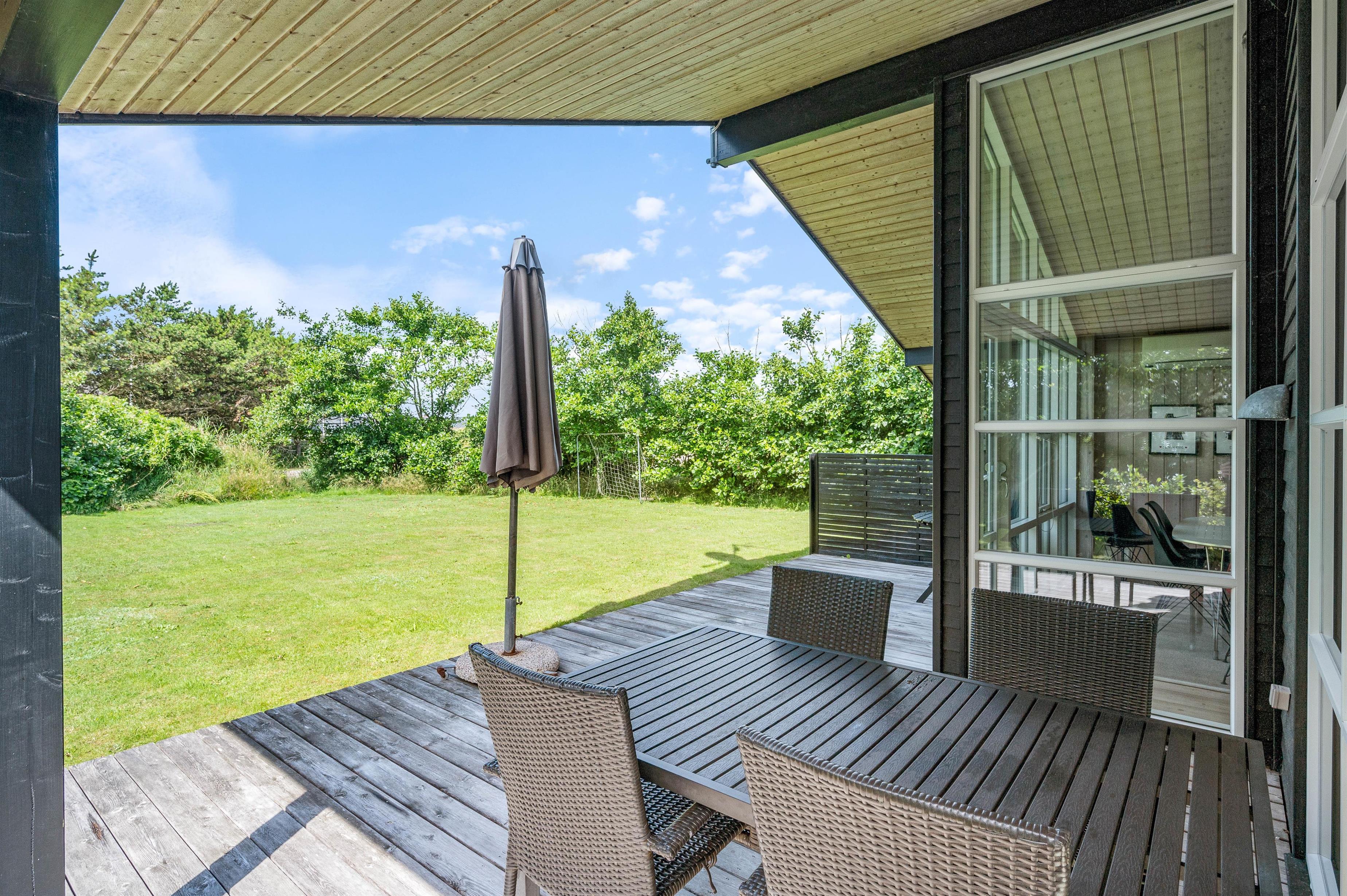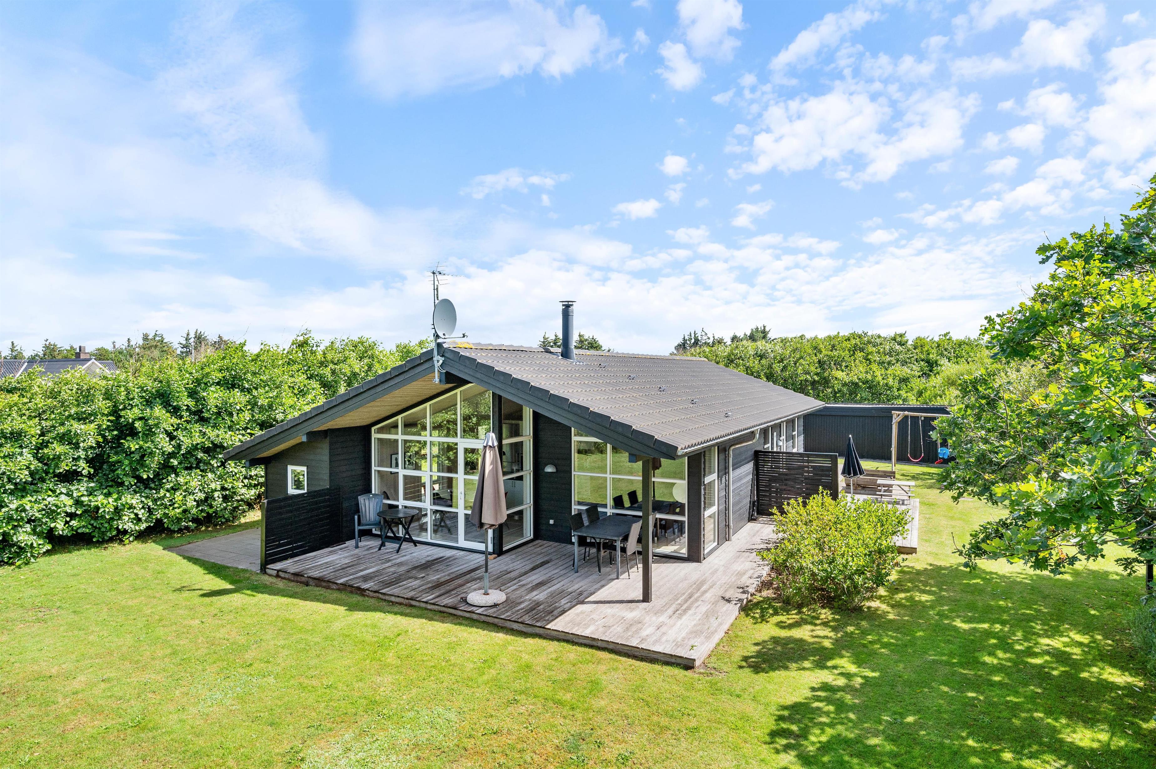 Fra stuen træder I ud på en stor, delvist overdækket terrasse, som omkranser huset næsten hele vejen rundt. Her kan I nyde en dejlig grillmiddag tilberedt på husets grill. For børnens velbehag er der en dejlig stor græsplane med et fodboldmål og en rigtig god sandkasse som kan lukkes, og selvfølgelig er der også en gynge. På terrassen kan de lange lyse sommer aftner nydes i gode møbler. Feriehuset ligger på en naturlig afskærmet grund, ikke langt fra Søndervig centrum.