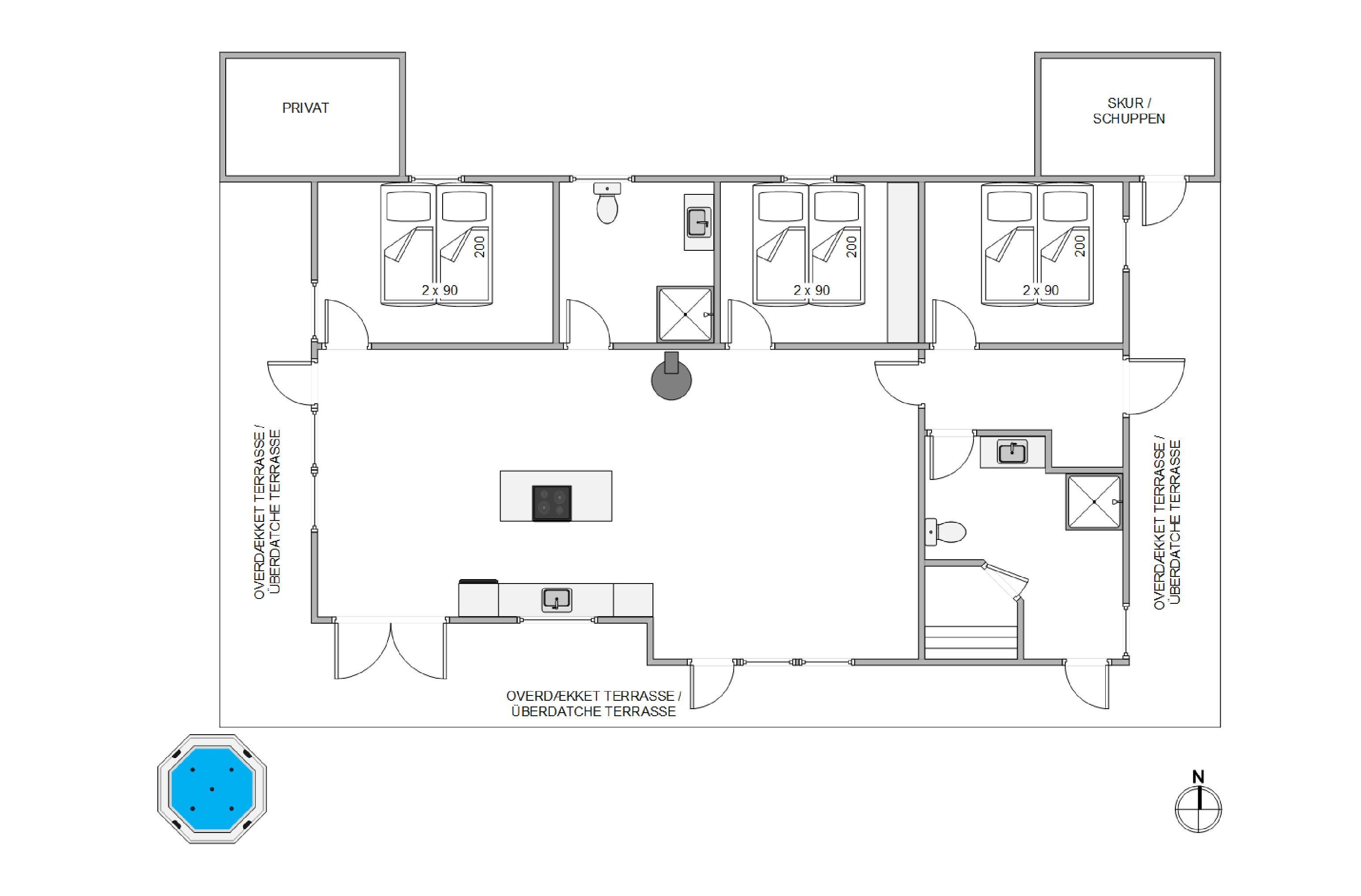 Uden for feriehusets rammer er der også mulighed for at nyde husets lækre faciliteter. Feriehusets terrasse er både overdækket, afskærmet og helt lukket , hvilket giver mulighed for at nyde udendørslivet uanset vind og vejr. Grillen og de komfortable havemøbler indbyder til hyggelige grillaftener med familien eller venner. Med kun 300 meter til havet kan I nemt tage en forfriskende dukkert eller gå en tur langs stranden.