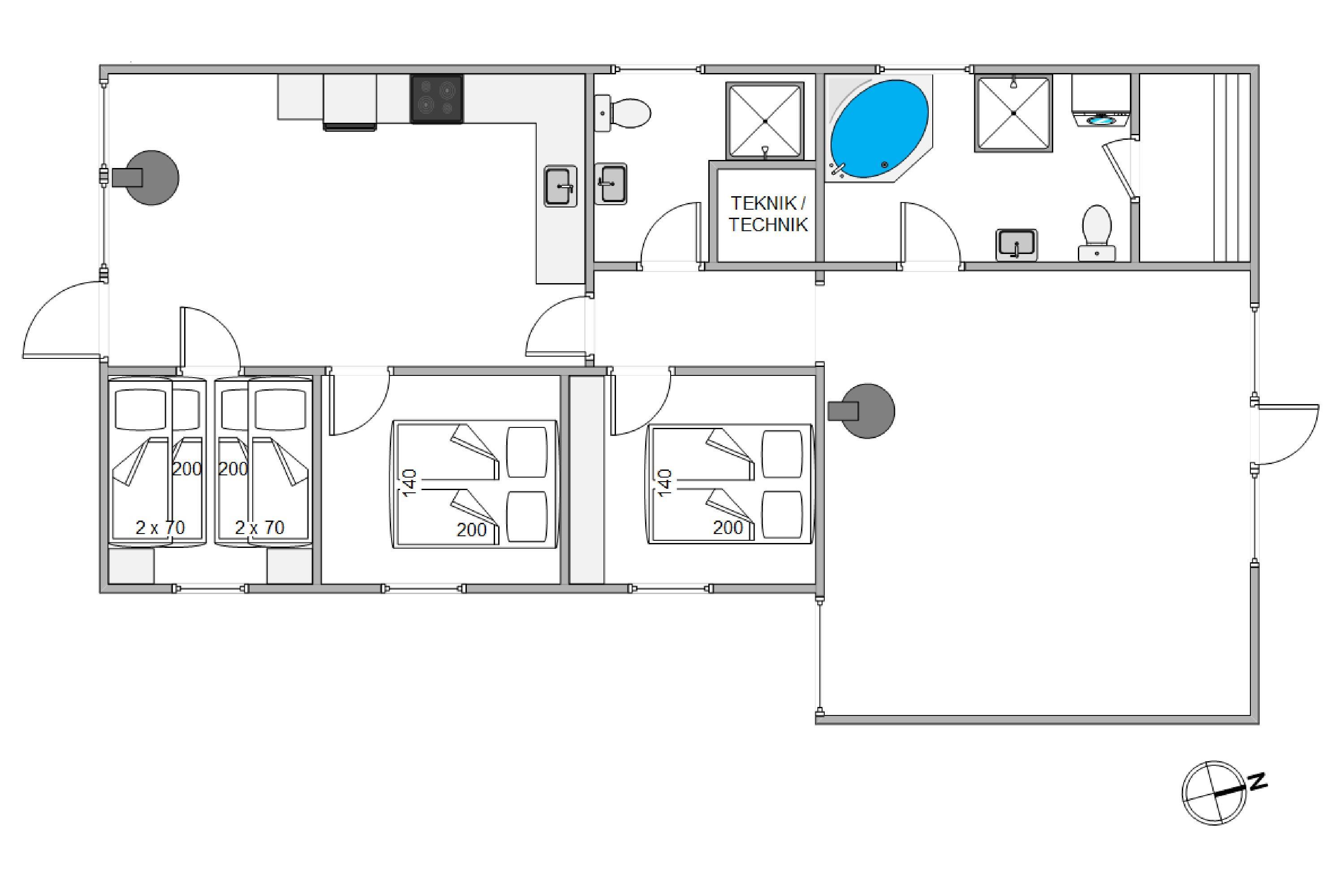 Fra køkkenet er der om aftenen adgang til feriehusets tre soveværelser, hvoraf de to er indrettet med hver en dobbeltseng, mens det sidste soveværelse har to enkeltsenge. Der er to badeværelser i feriehuset, så der ikke er trængsel foran badeværelset om morgenen. Begge badeværelser er udstyret med gulvvarme for at undgå kolde fødder om morgenen.