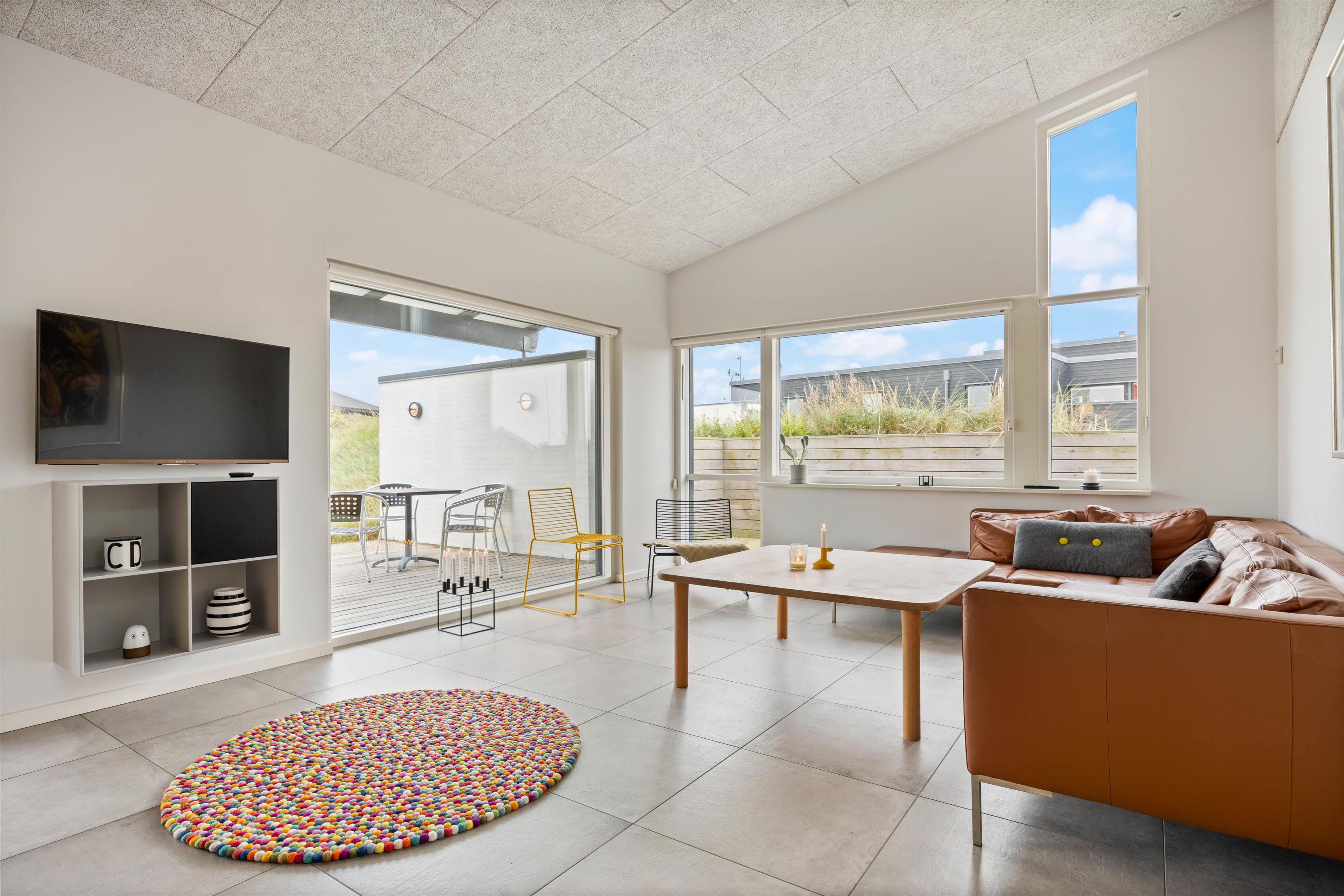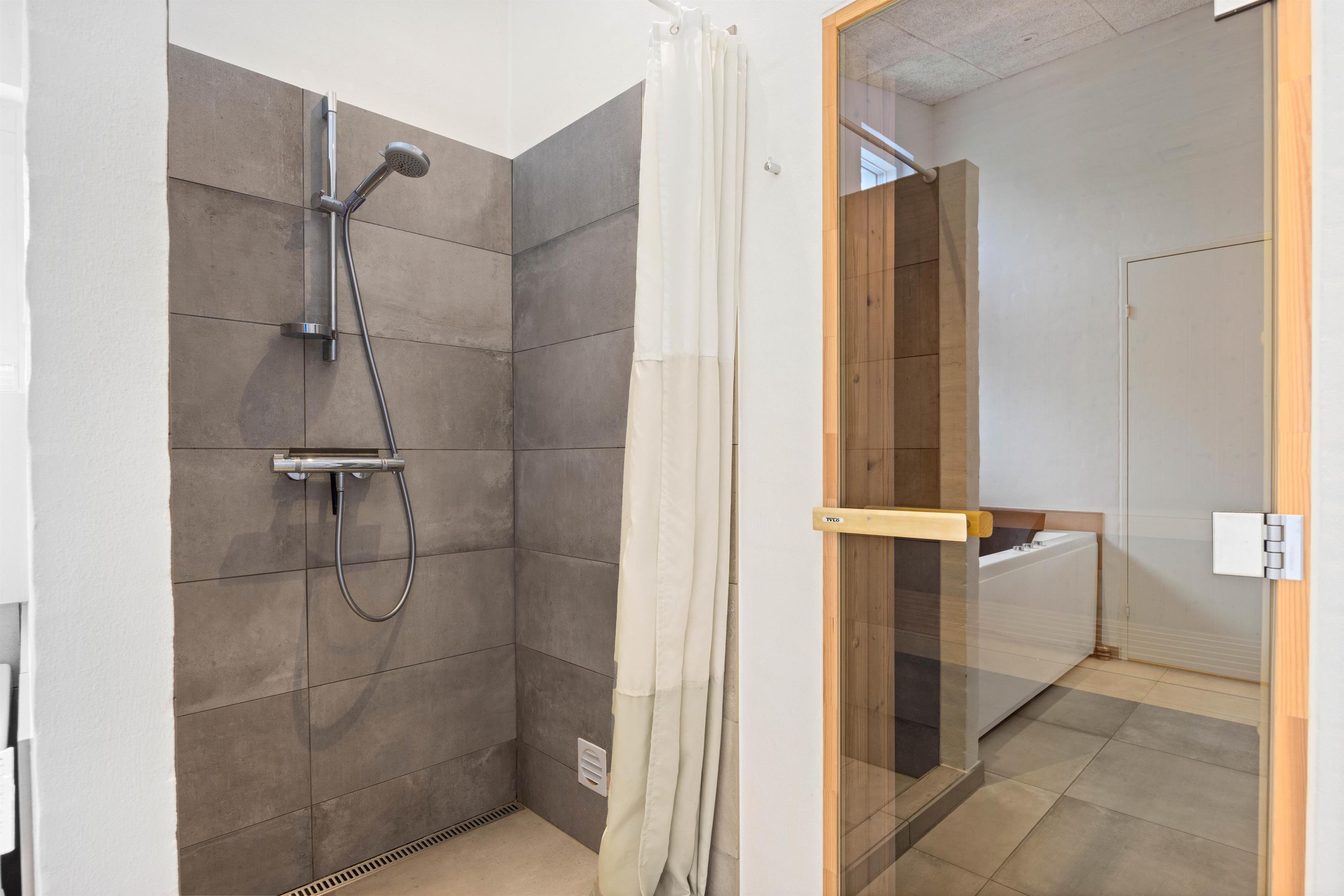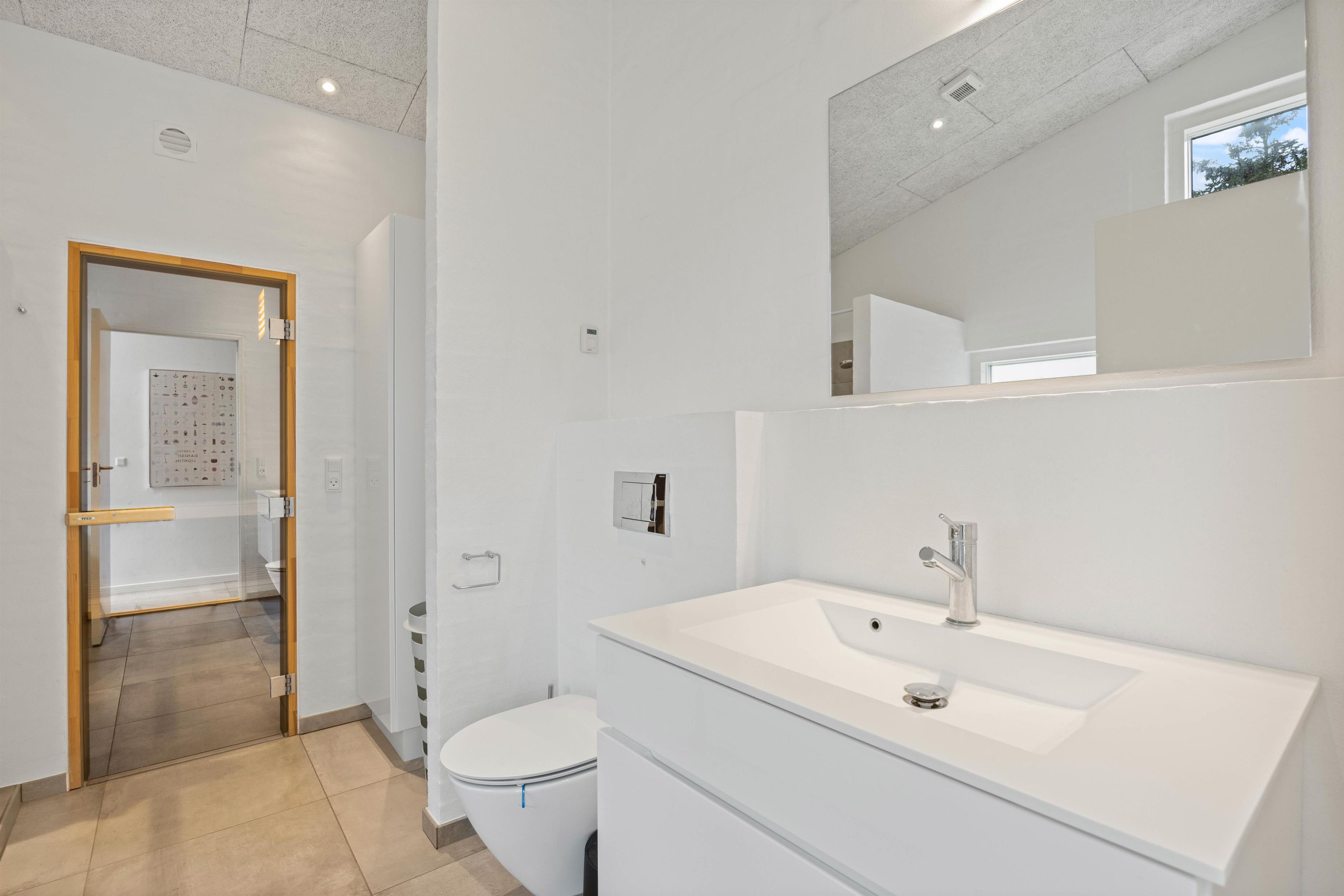 Den røde tråd går igen igennem hele sommerhuset. Her er alle rum med flot troldteks loft der sikrer en god akoustik, samt lækre store fliser der også er yderst praktiske og nemme at rengøre, hvis nu børnene skulle have svinet dem lidt til. For lidt ekstra komfort, er alle rum i huset udstyret med gulvvarme. Sommerhuset råder selvfølgelig over to badeværelser, begge moderne indrettet, giver mulighed for private øjeblikke, hvilket er en fordel, når I er flere der rejser sammen. Efter en dag fyldt med oplevelser, kan I også nyde godt af tømmespa og sauna - de perfekte steder til afslapning og fornyelse.