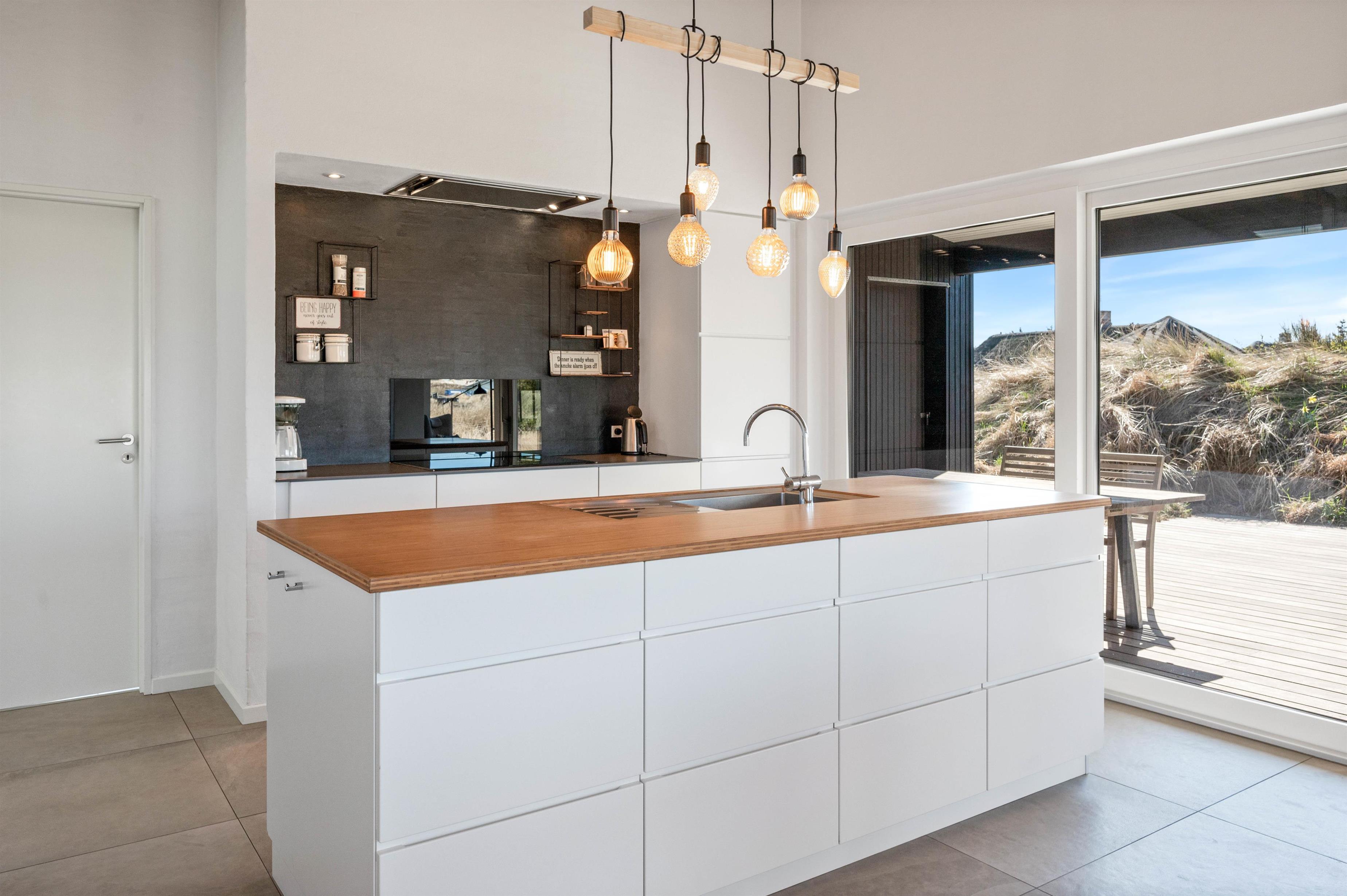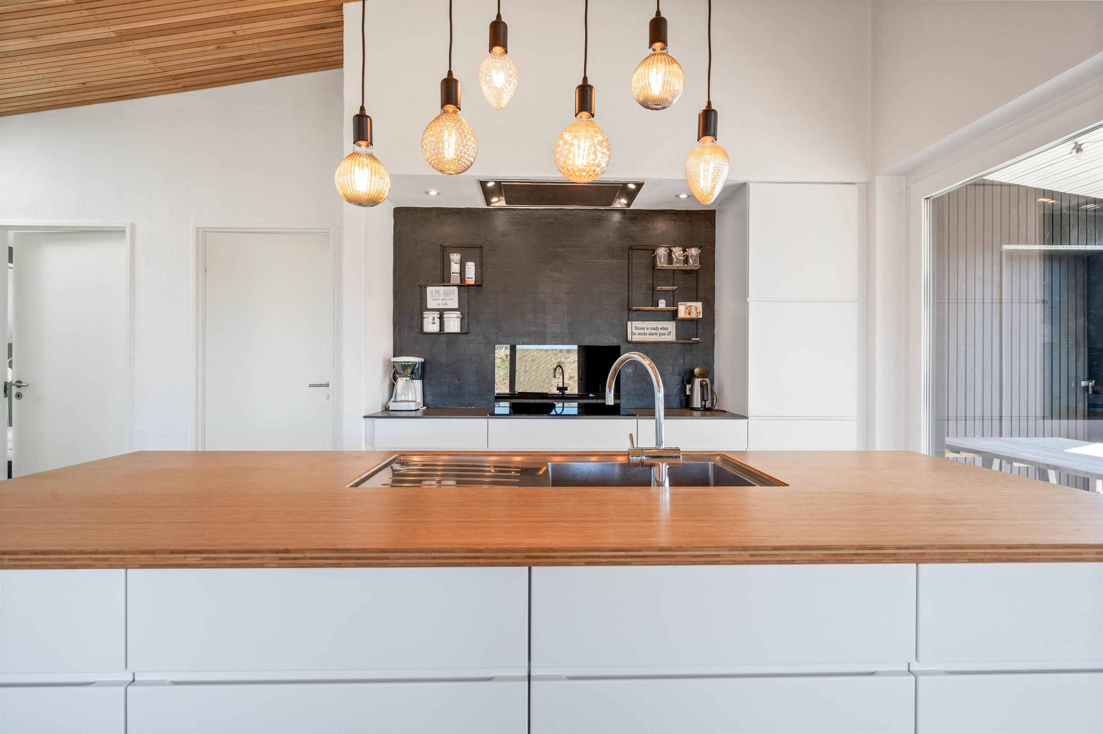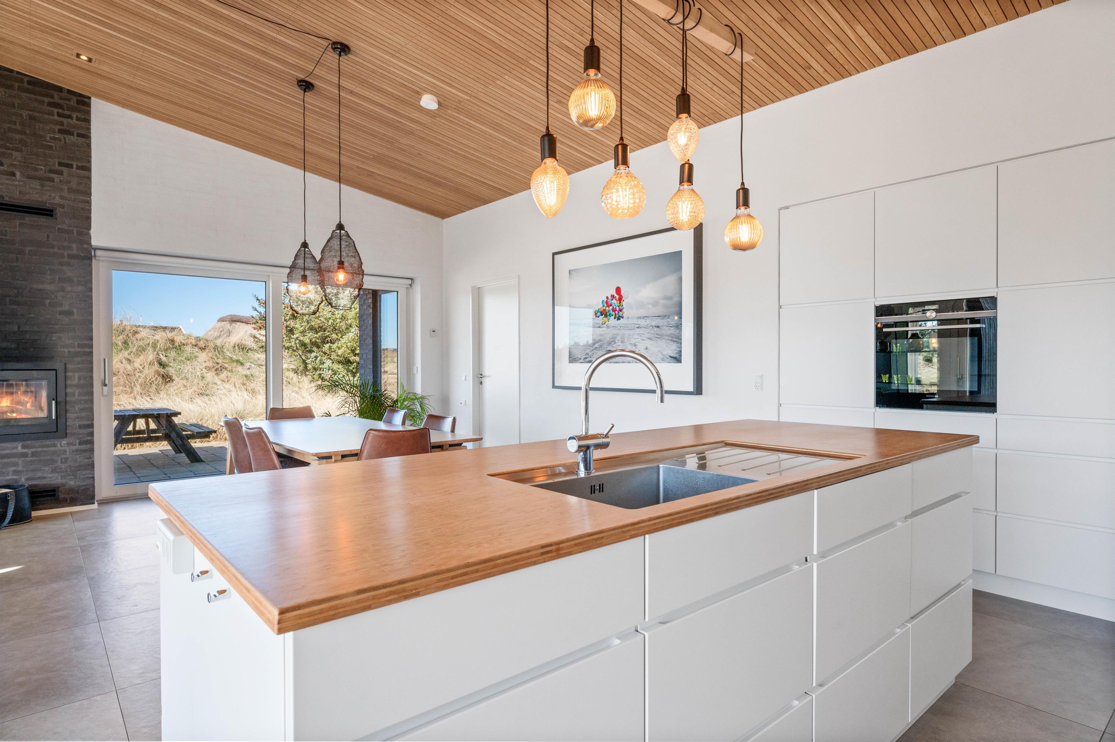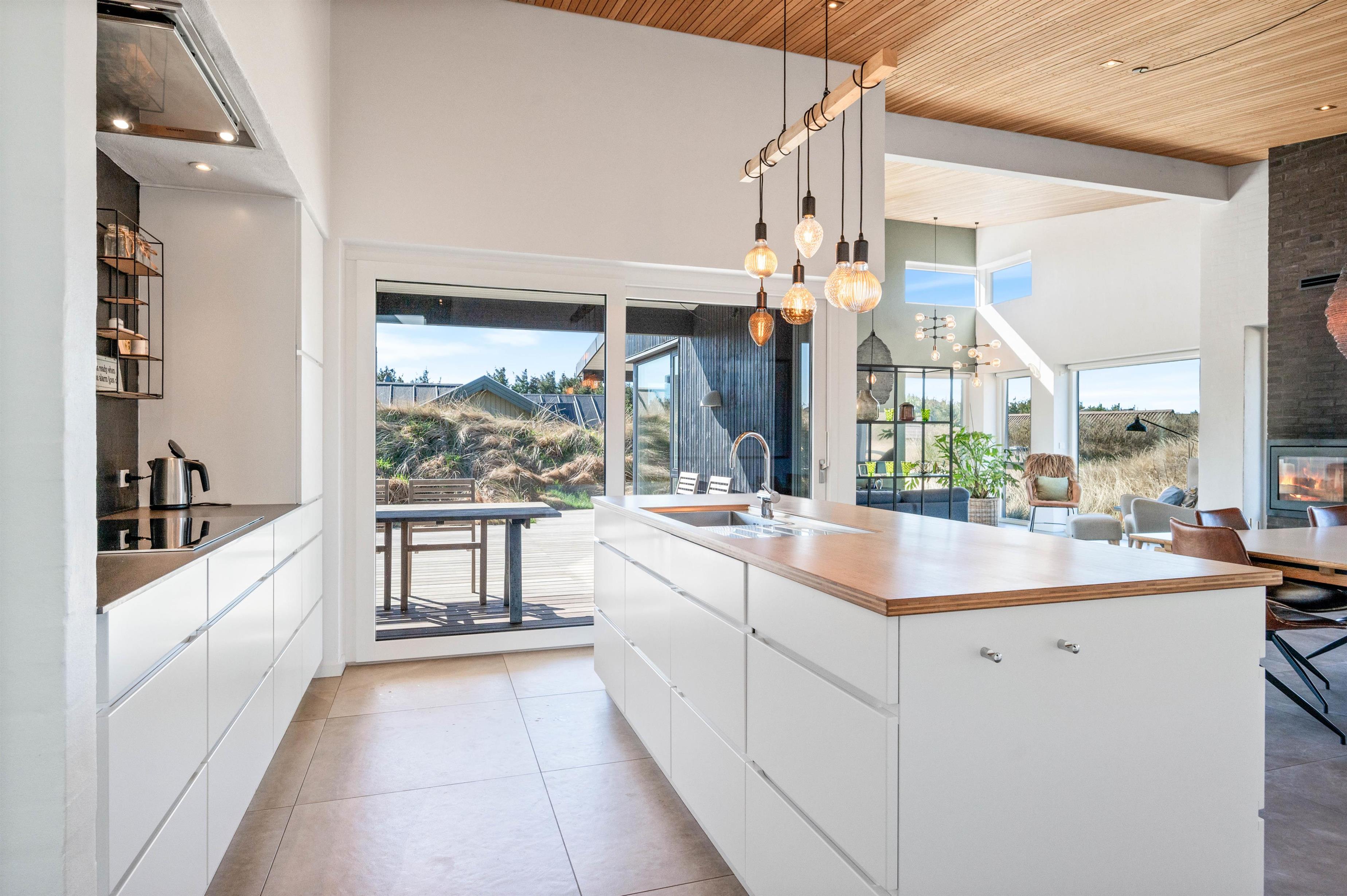 Store vinduespartier åbner feriehuset endnu mere op, og det er især tilfældet i det store køkkenalrum, der ligger i åben forbindelse med stuen. Her er der lagt op til masser af samvær og hyggelige stunder foran den knitrende brændeovn.