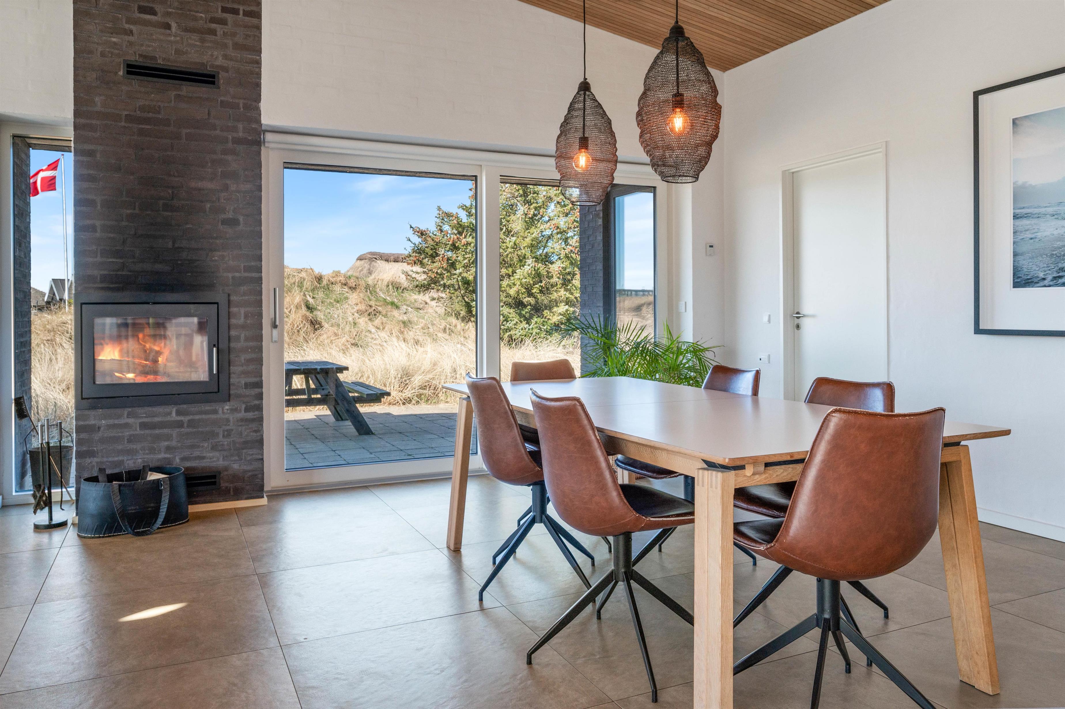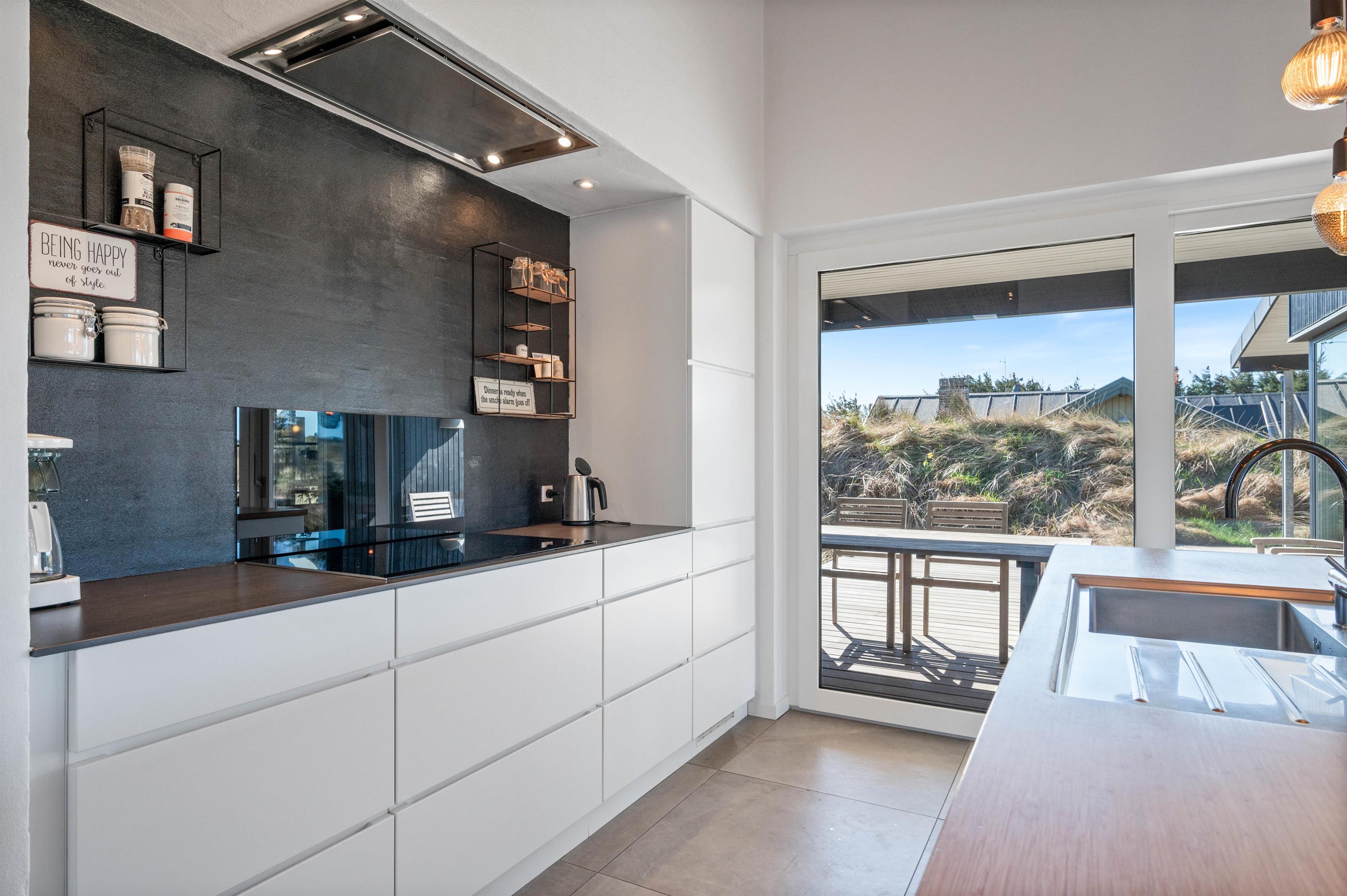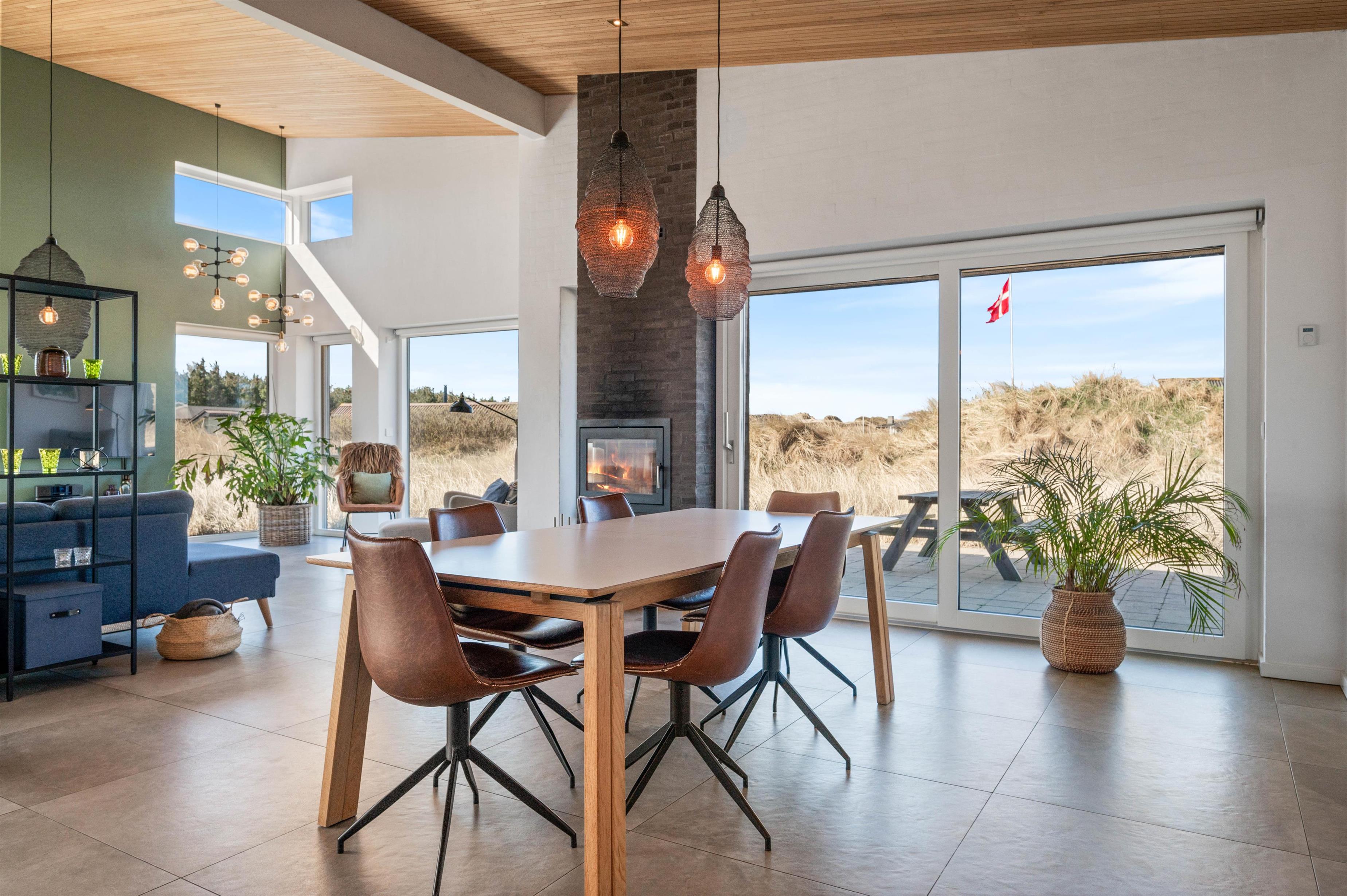 Store vinduespartier åbner feriehuset endnu mere op, og det er især tilfældet i det store køkkenalrum, der ligger i åben forbindelse med stuen. Her er der lagt op til masser af samvær og hyggelige stunder foran den knitrende brændeovn.