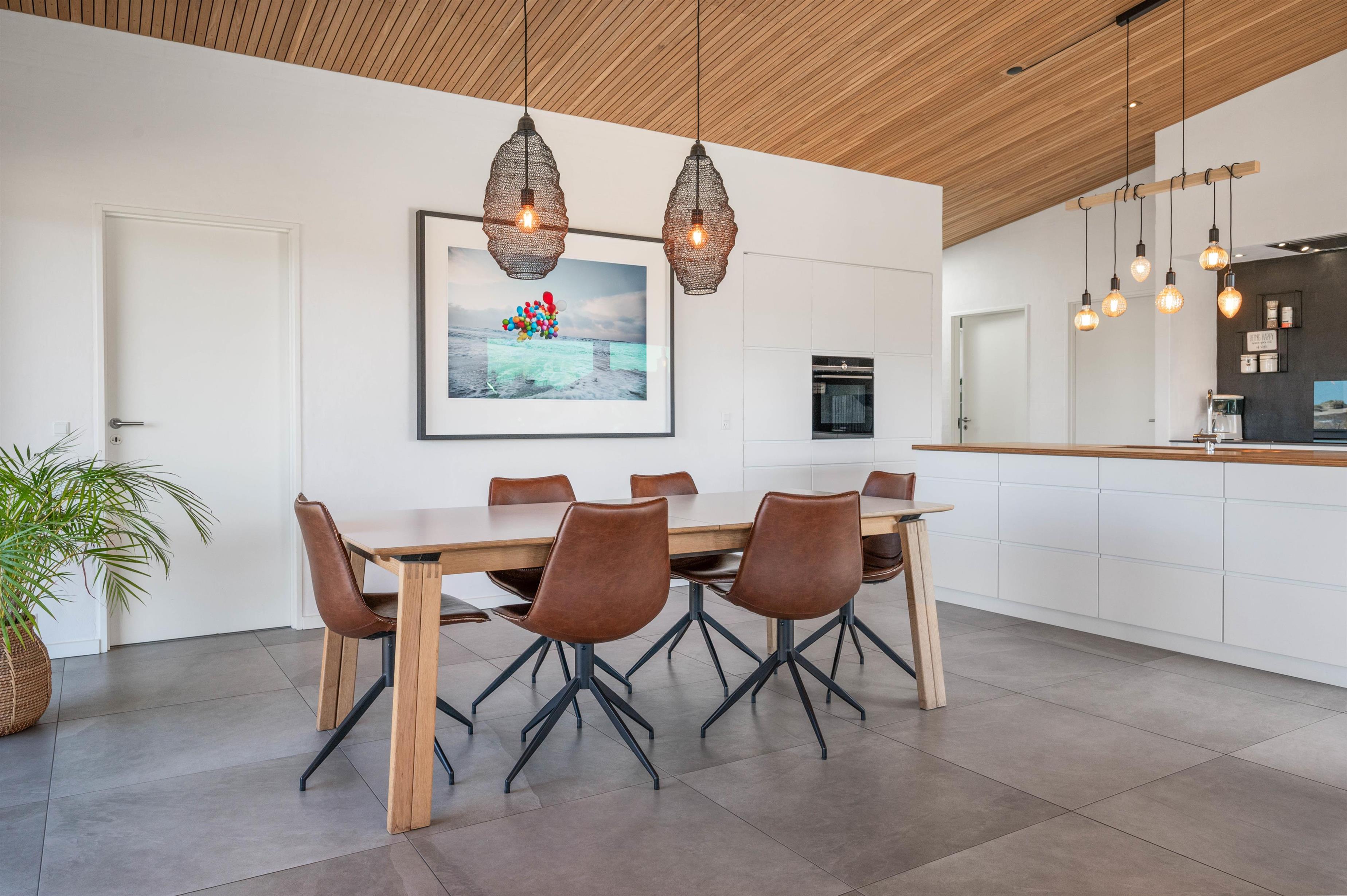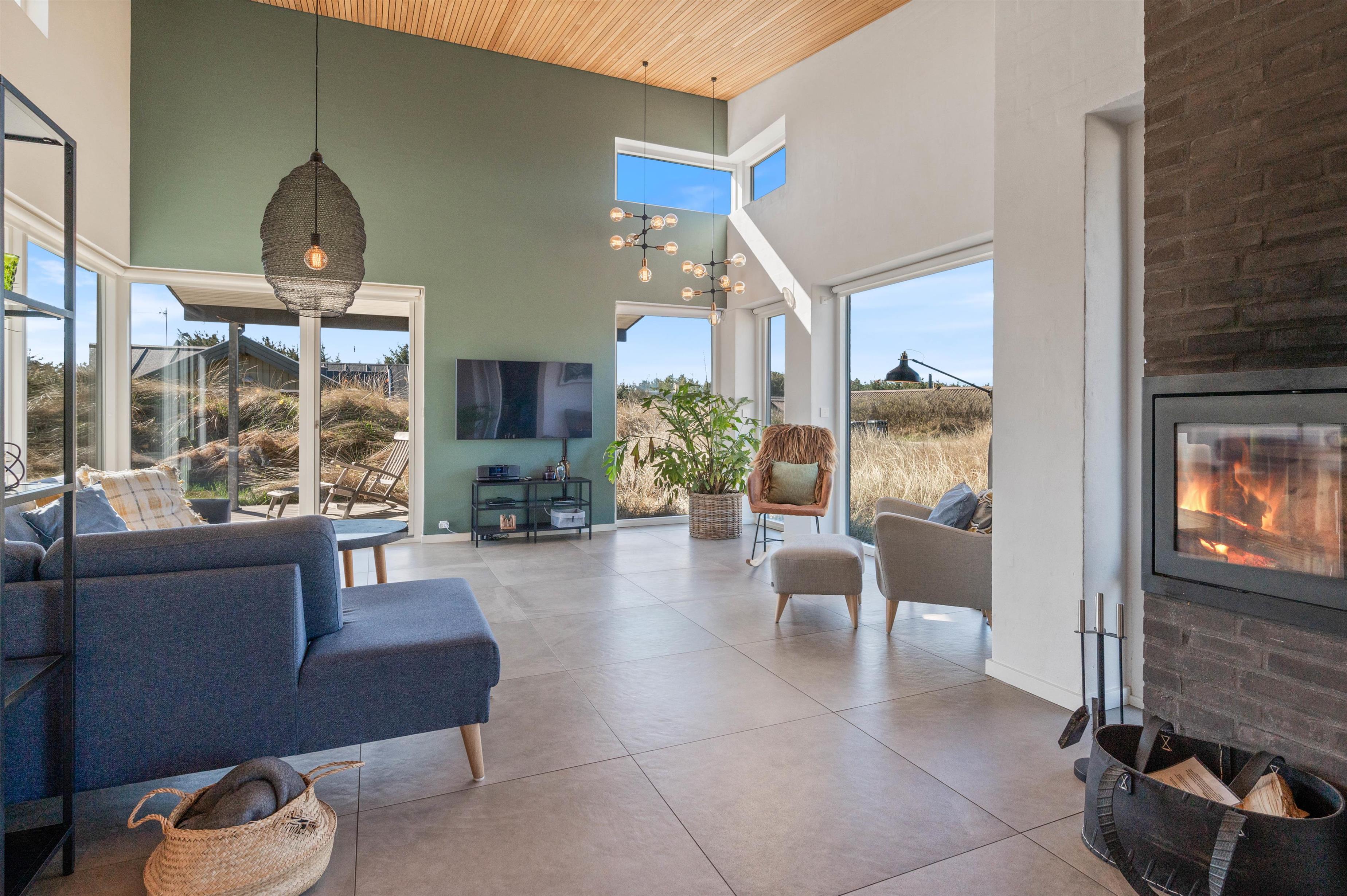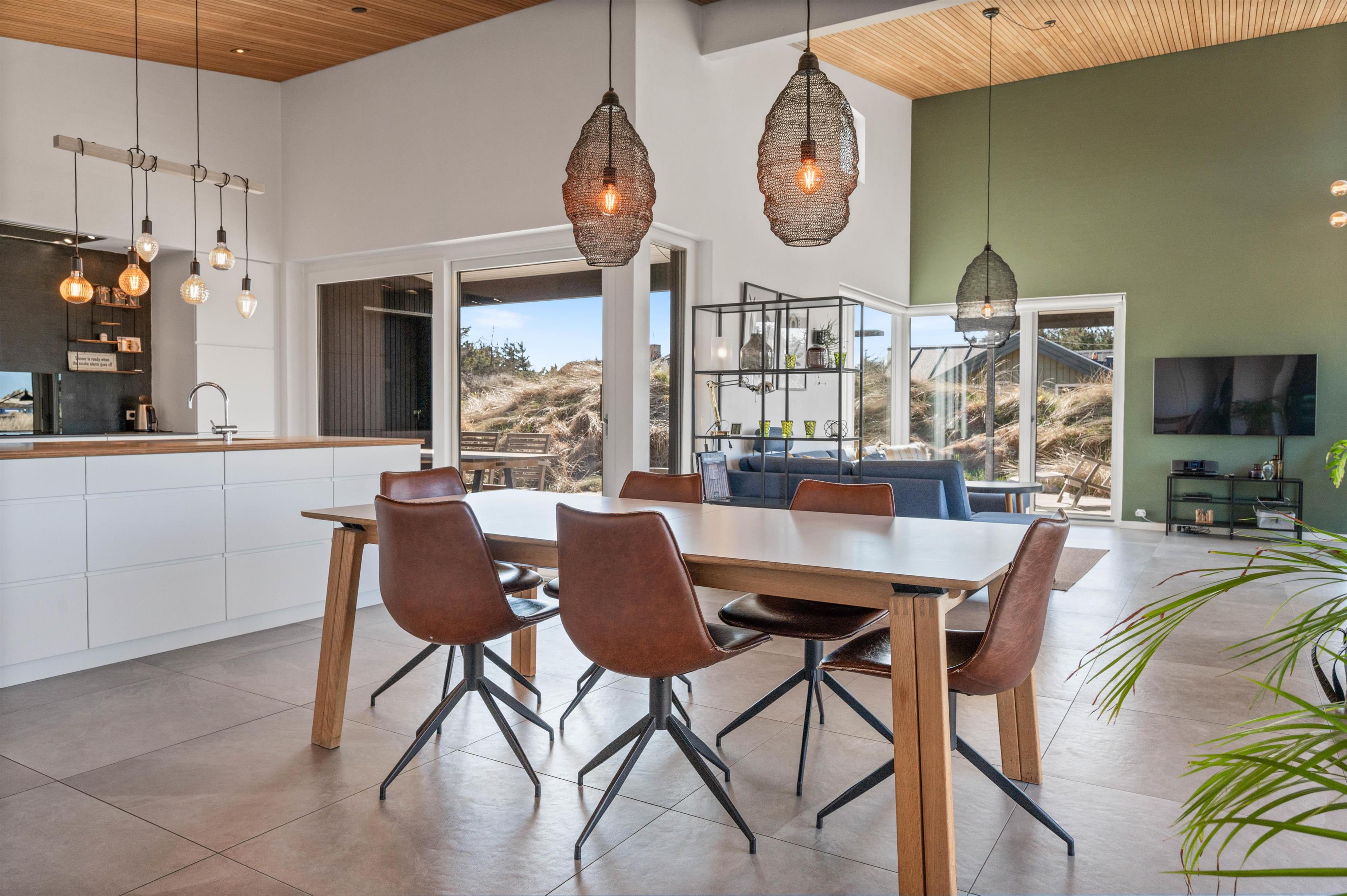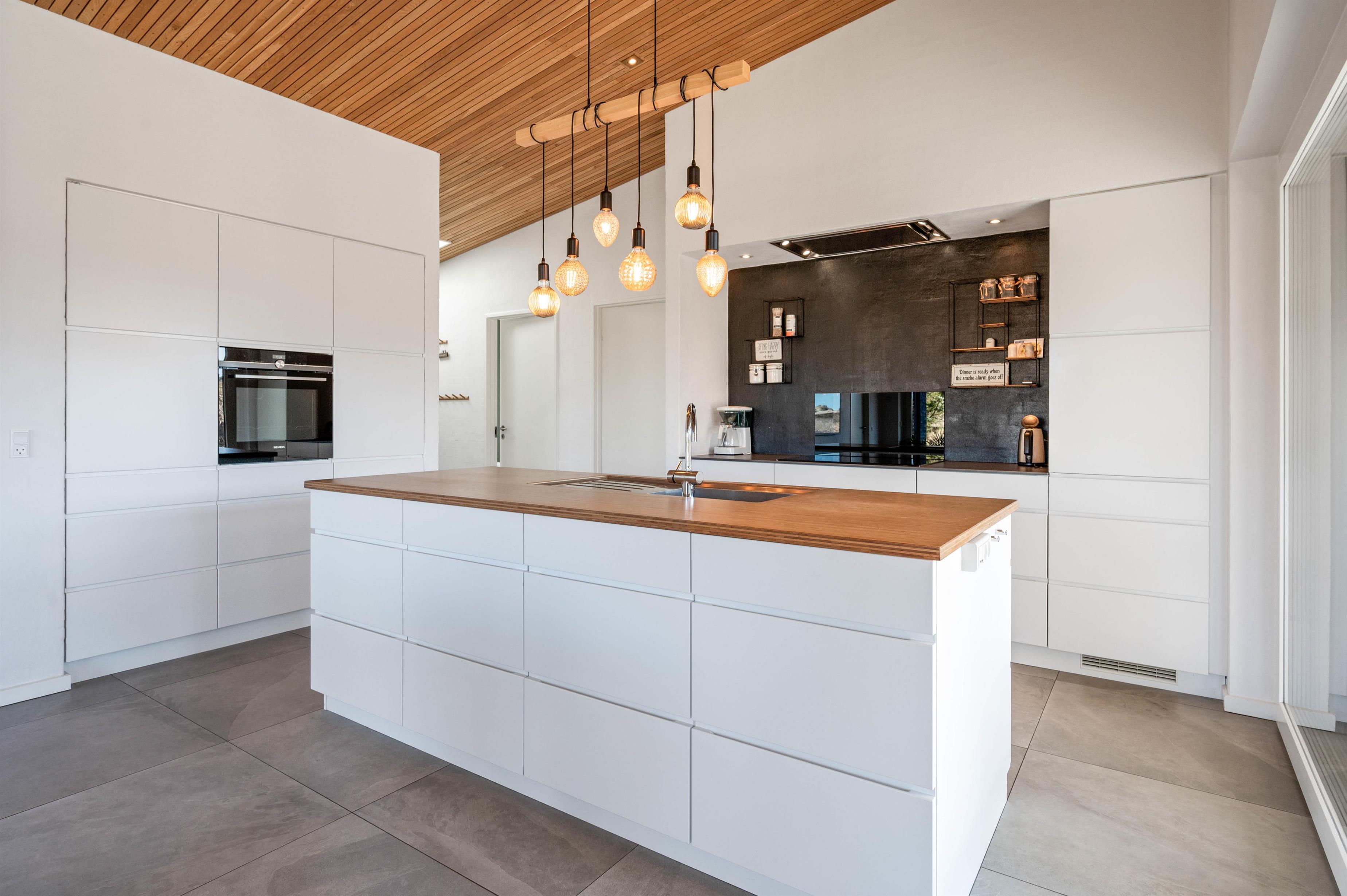 Store vinduespartier åbner feriehuset endnu mere op, og det er især tilfældet i det store køkkenalrum, der ligger i åben forbindelse med stuen. Her er der lagt op til masser af samvær og hyggelige stunder foran den knitrende brændeovn.