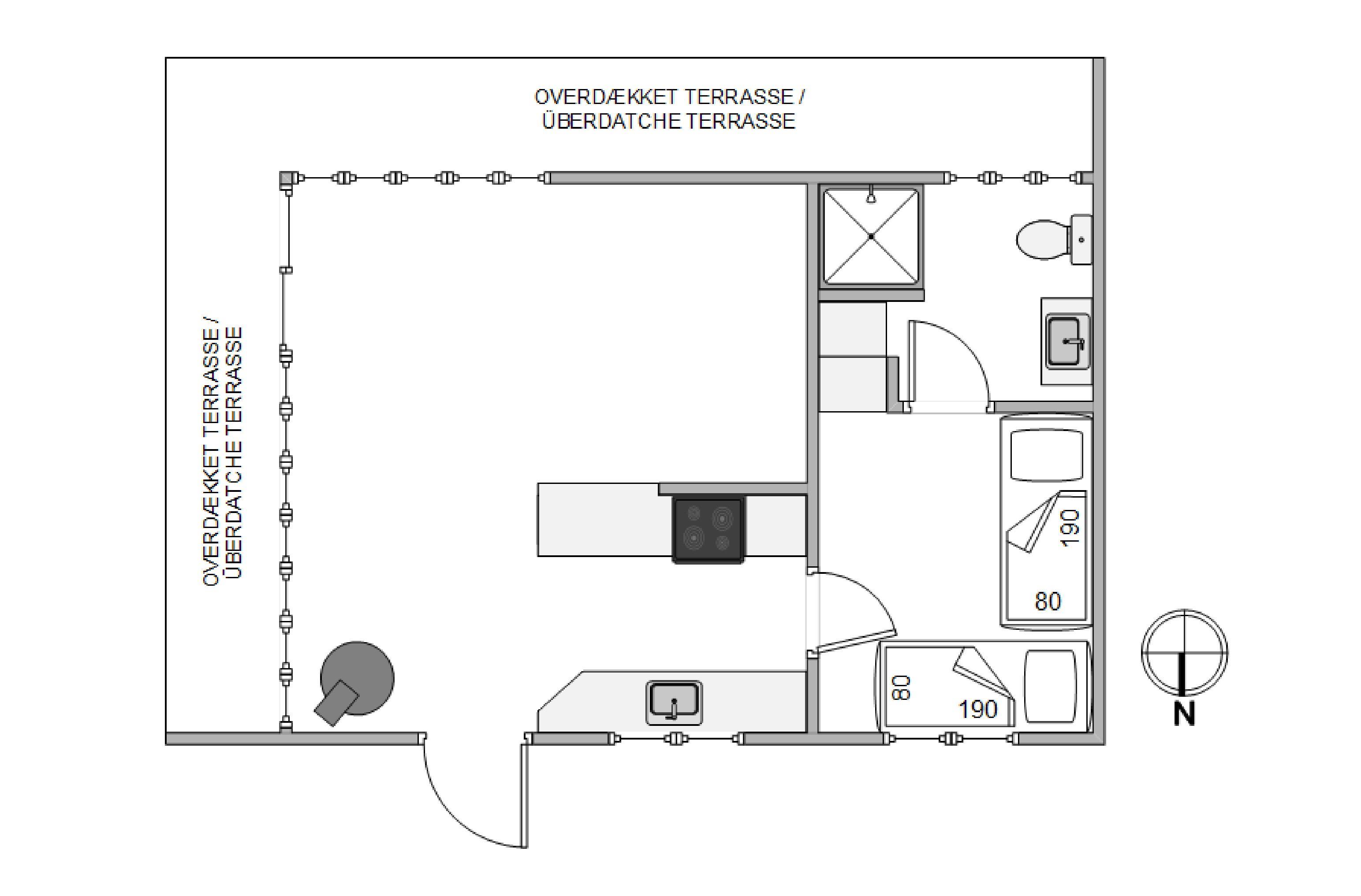 Feriehuset har naturligvis også en terrasse med havemøbler, liggestole og grill. Her kan I nyde en dejlig frokost eller slappe af på langs i skyggen fra halvtaget. Rundt om huset vil I kunne flere hyggelige kroge, der lægger op til at I virkelig kan slappe af. Som tidligere nævnt, så er sommerhuset omkranset af buskadser og træer, hvilket giver en god afskærmning og lægger op til total afslapning. Noget af den overdækkede terrasse er overdækket, hvilket forlænger udetiden og lægger op til endnu mere hygge udendørs hygge og nærvær.