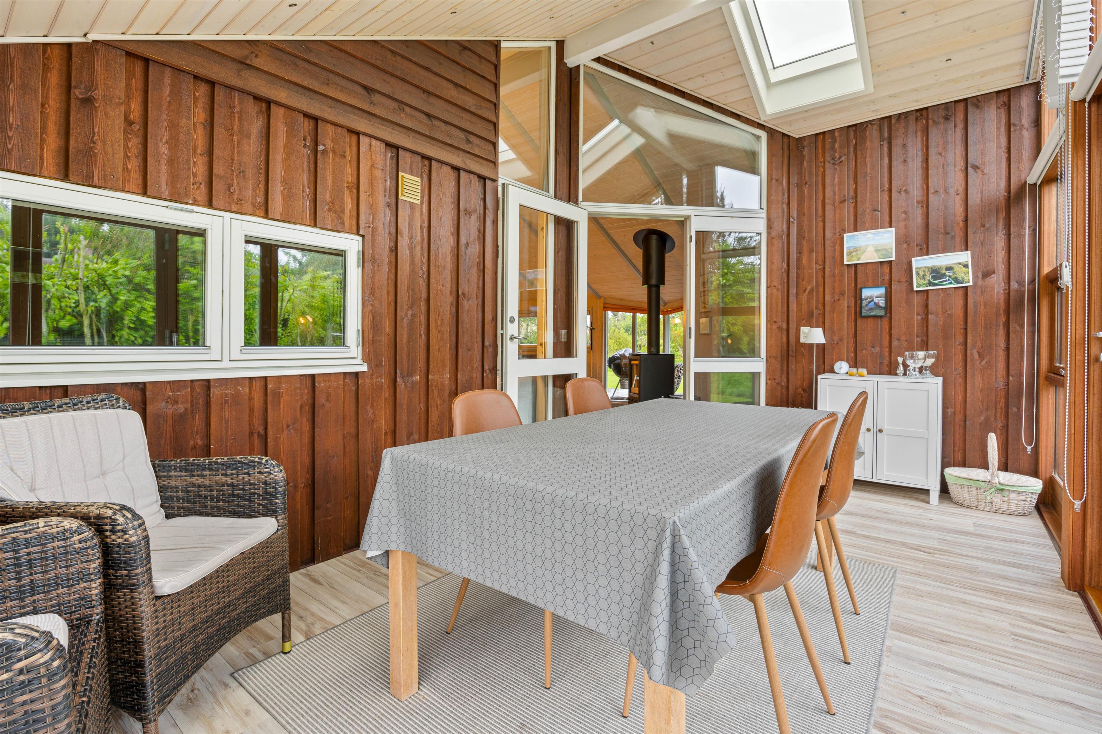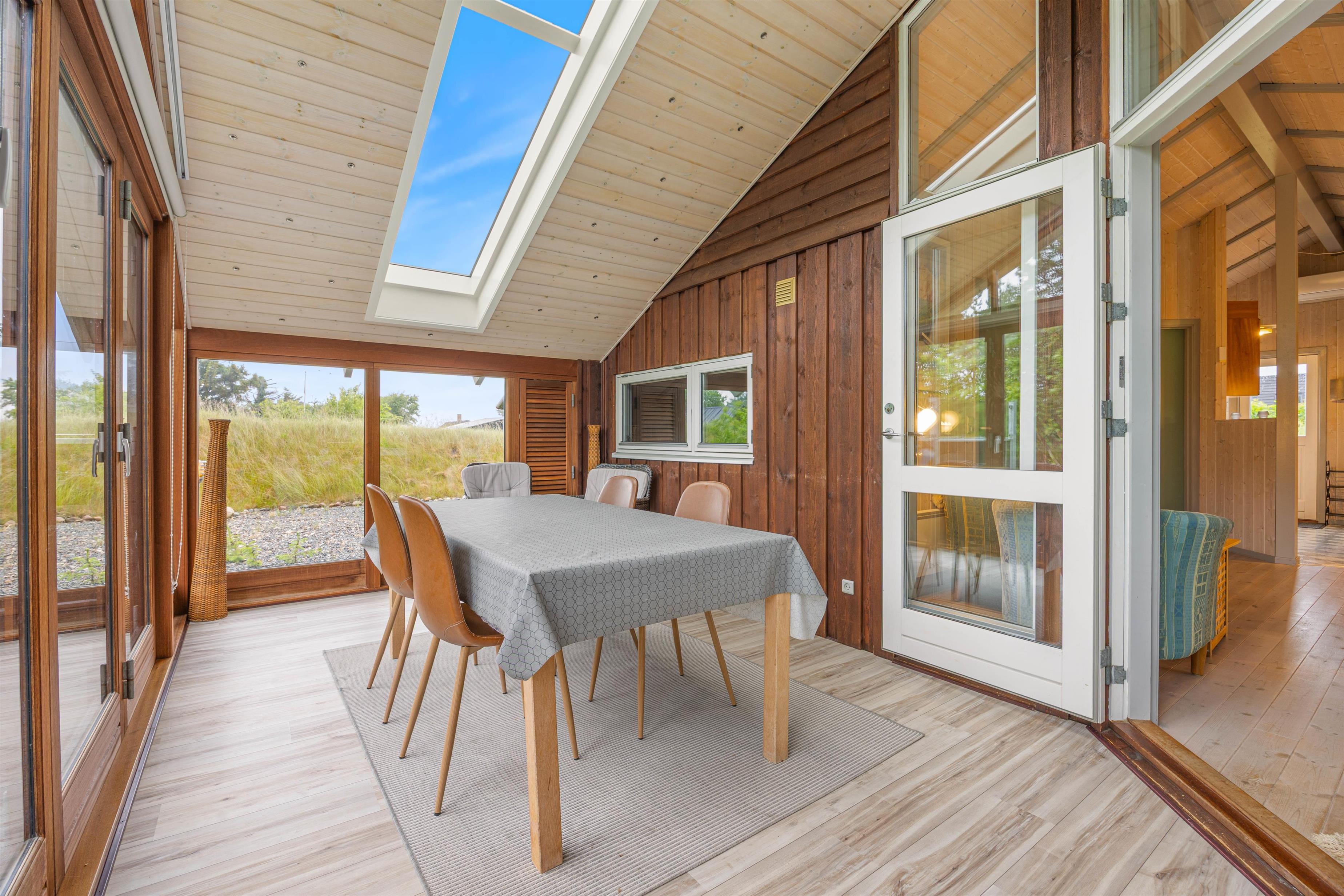 I den flotte udestue står spisebordet, og herfra kan I nyde den naturskønne udsigt, mens I får et godt feriemåltid - eller bare over en kop kaffe på en kølig og blæsende dag. Her er nogle fantastisk ovenlysvinduer, som giver et godt lysindfald. Herfra kan I også holde øje med børnene og hundene, mens de leger på terrassen eller græsplænen.