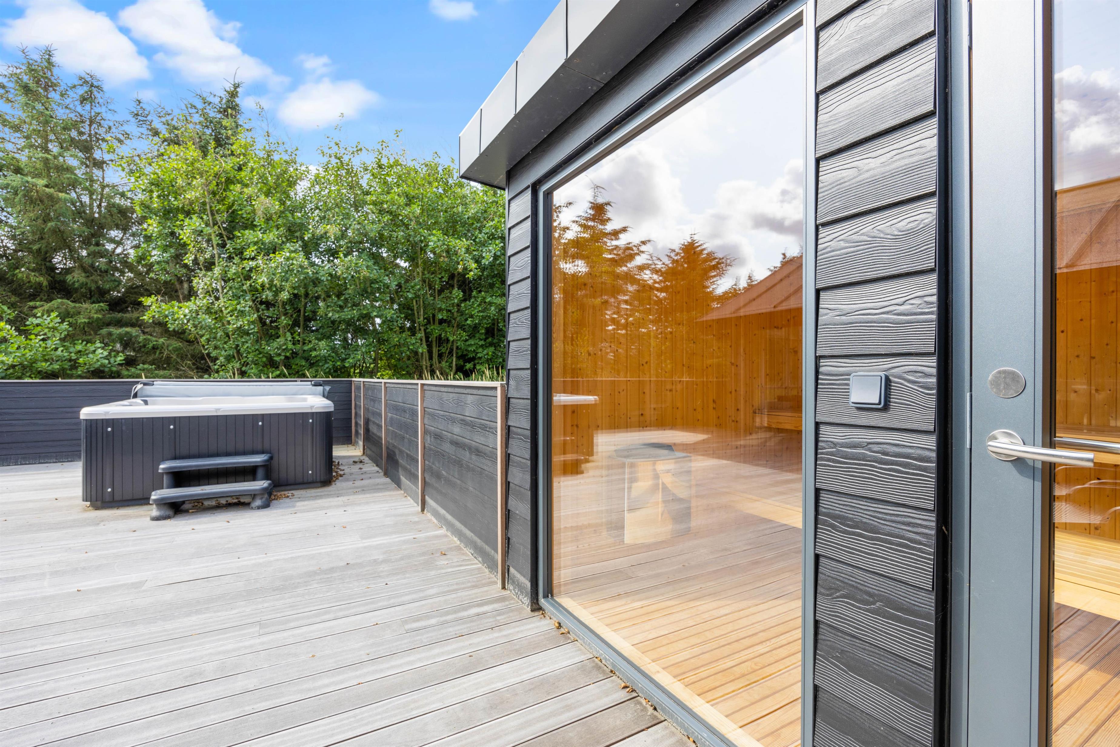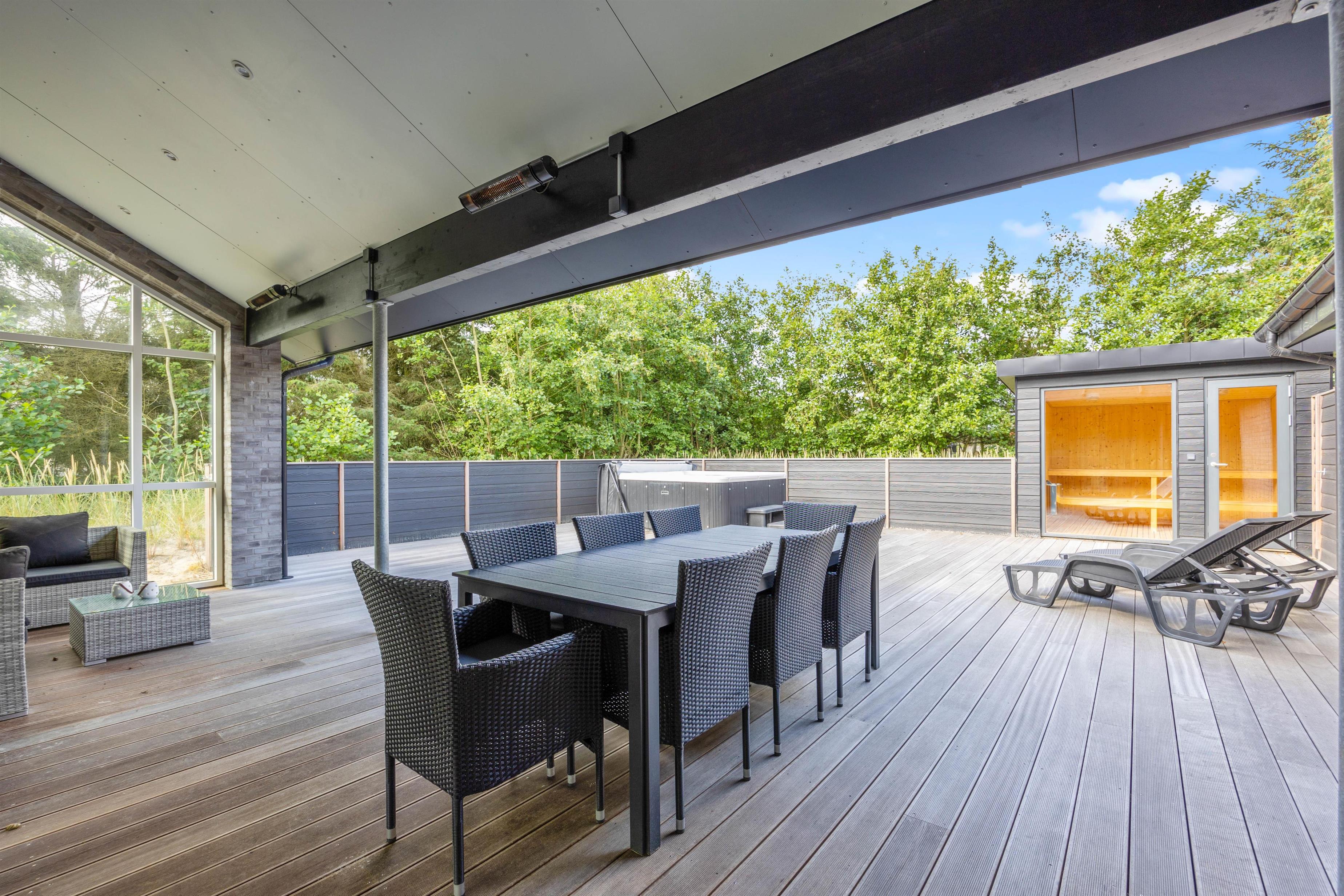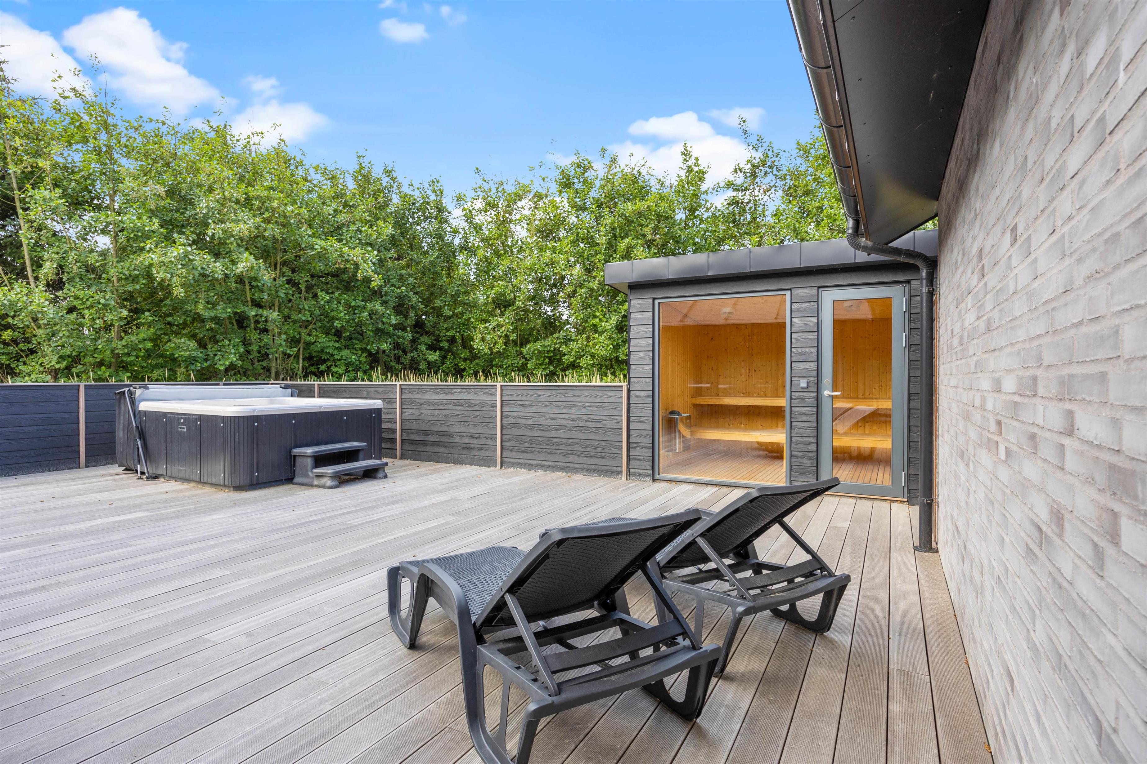Flere gode terrasser, udespa, udesauna og terrassevarmer