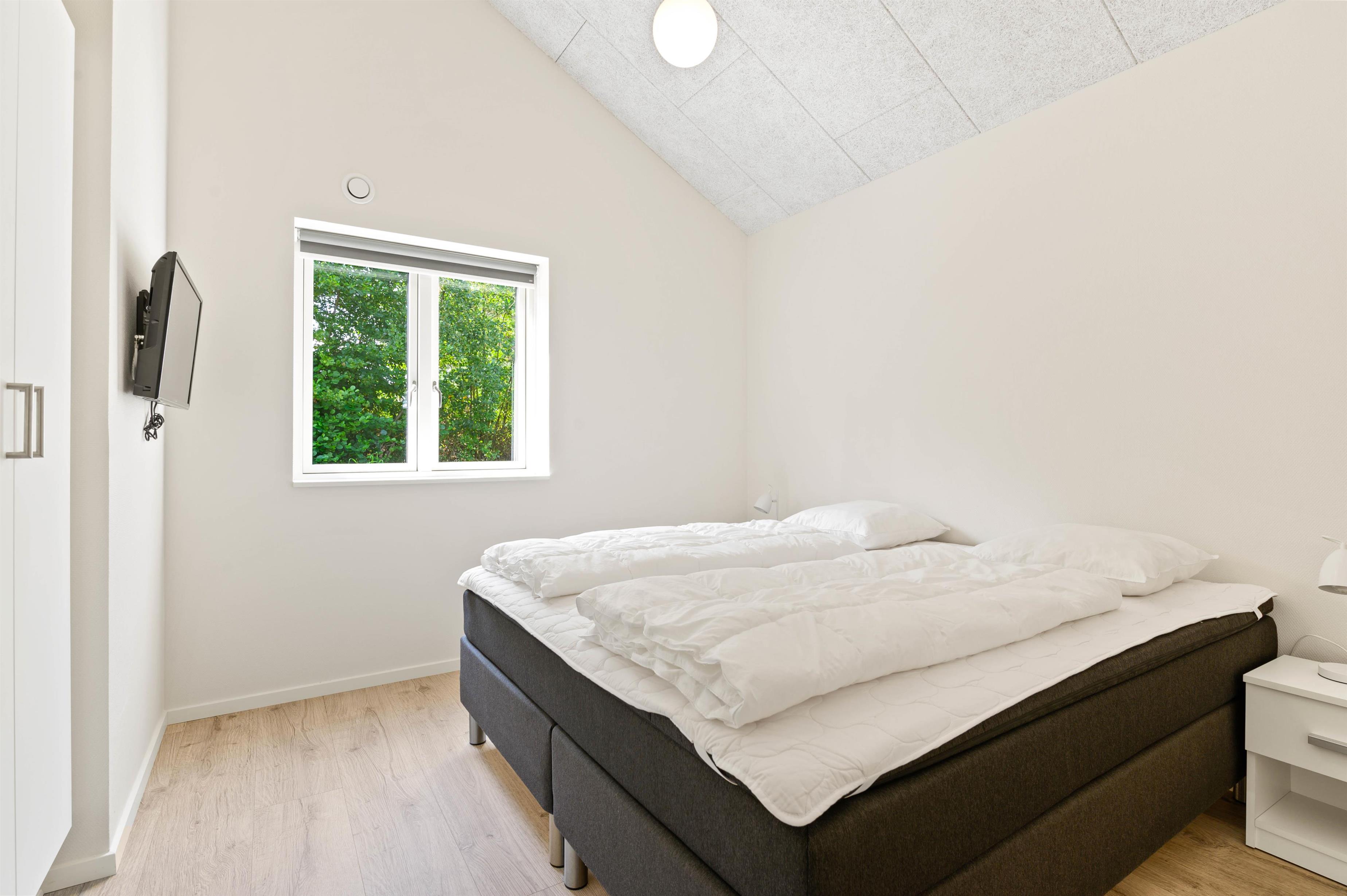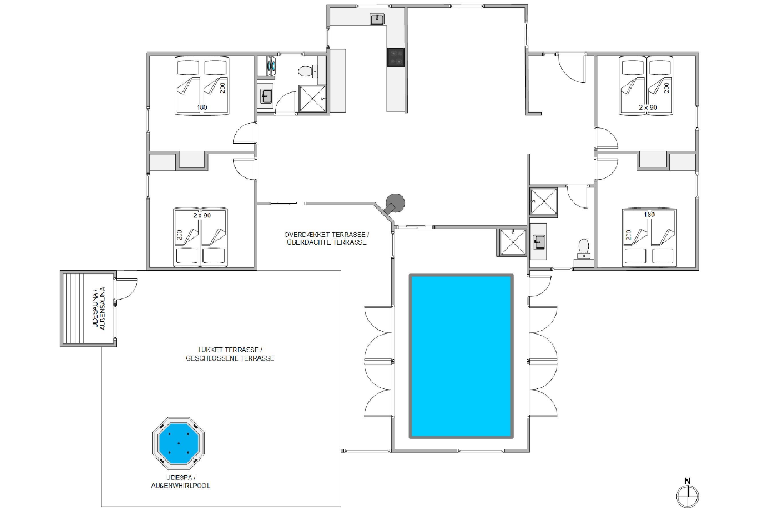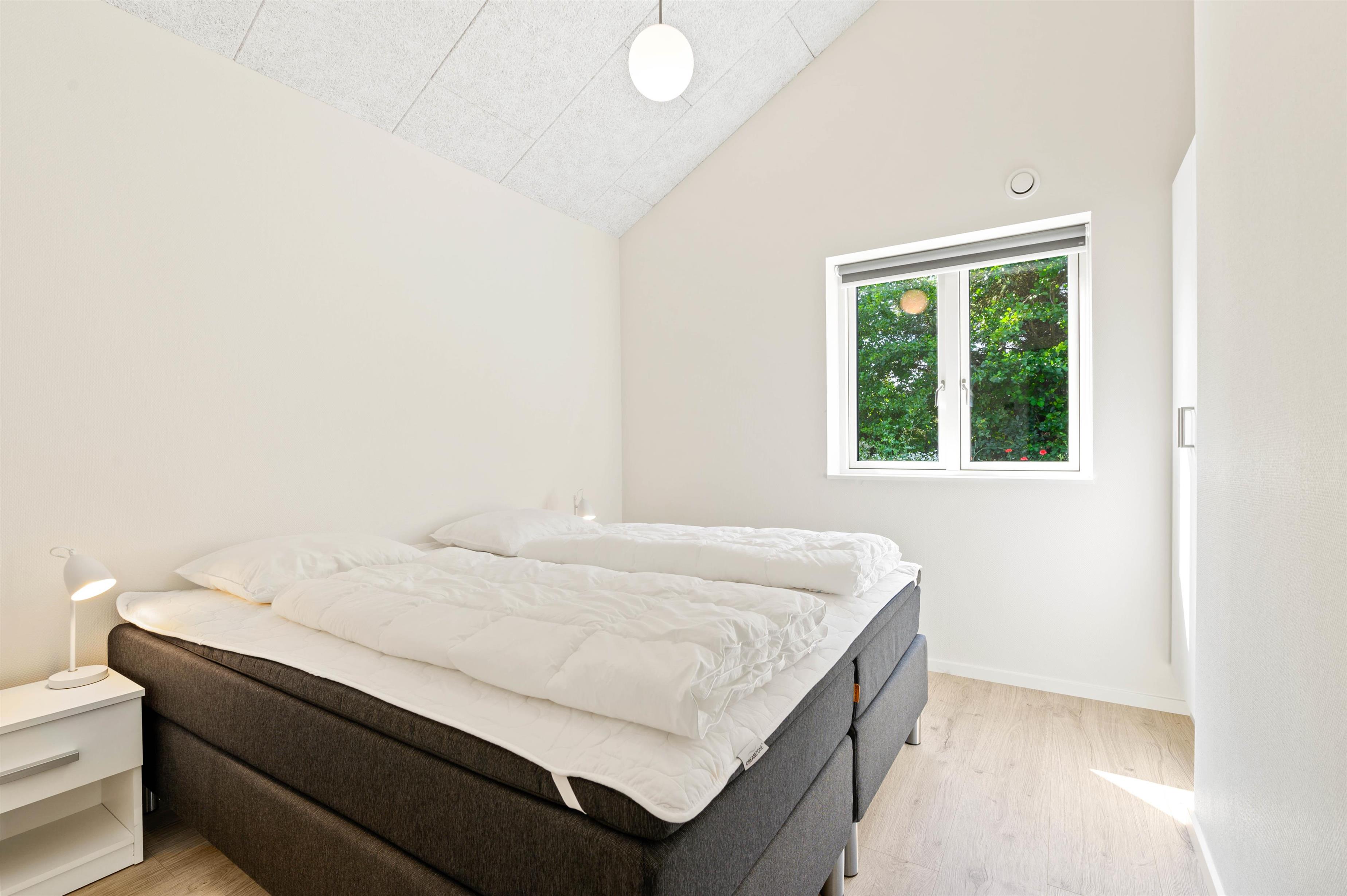 På sommerhusets 180 kvadratmeter er der fire gode soveværelser, der er alle er indrettet med dobbeltsenge. 2 af soveværelserne er placeret i den ene ende af sommerhuset sammen med et badeværelse, mens de resterende to soveværelser er placeret i den anden ende af sommerhuset sammen med det andet badeværelse. Denne indretning gør også sommerhuset oplagt til en ferie, hvor I er flere familier afsted sammen.