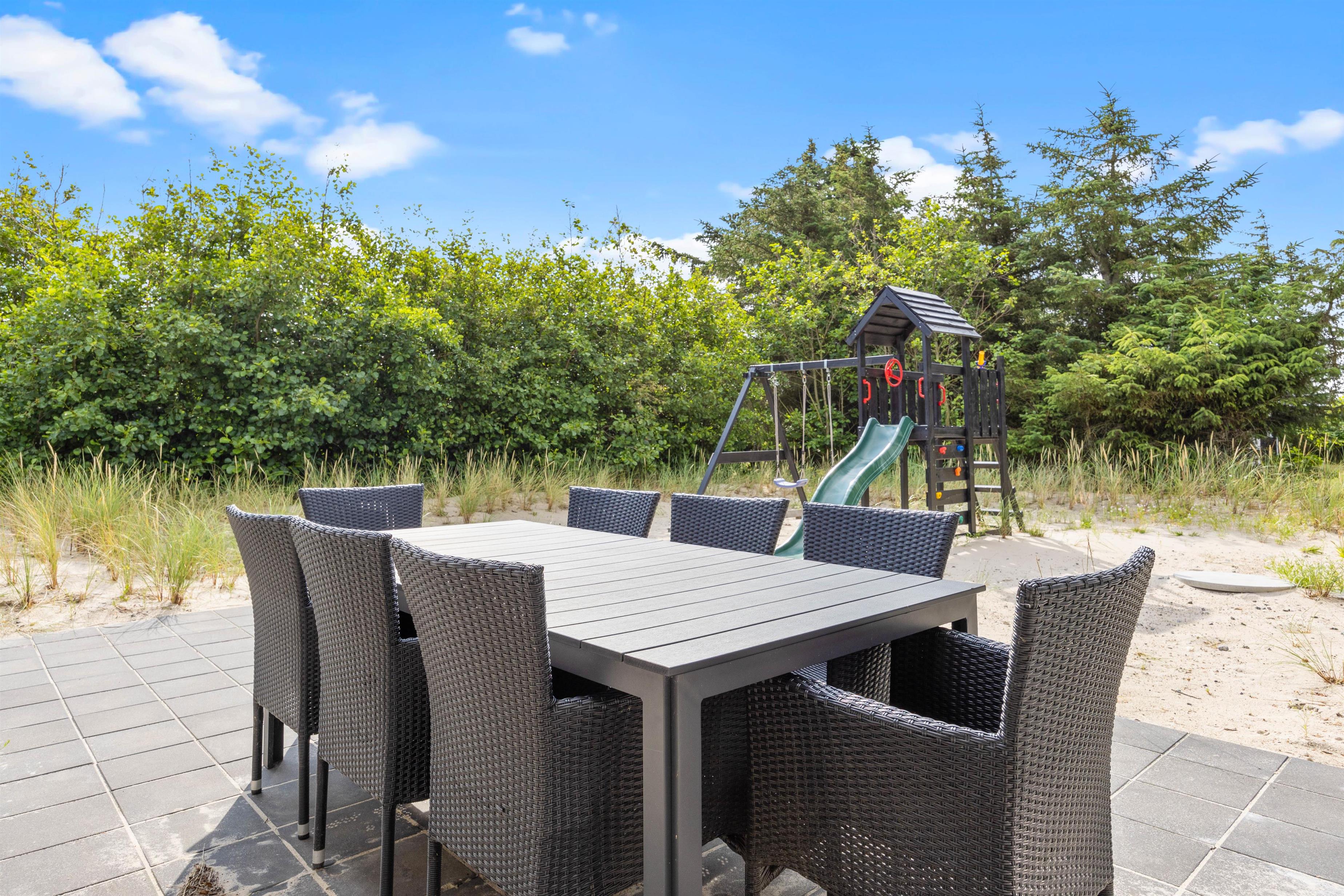 På sommerhusets udeområde venter jer to store terrasser, hvor I har rig mulighed for at nyde de solrige feriedage. Her finder I en lækker udespa, hvor der er lagt op til masser af afslapning i det varme, boblende vand. Efterfølgende kan I hoppe en tur i udesaunaen – det er også helt perfekt efter en tur ved Vesterhavet.