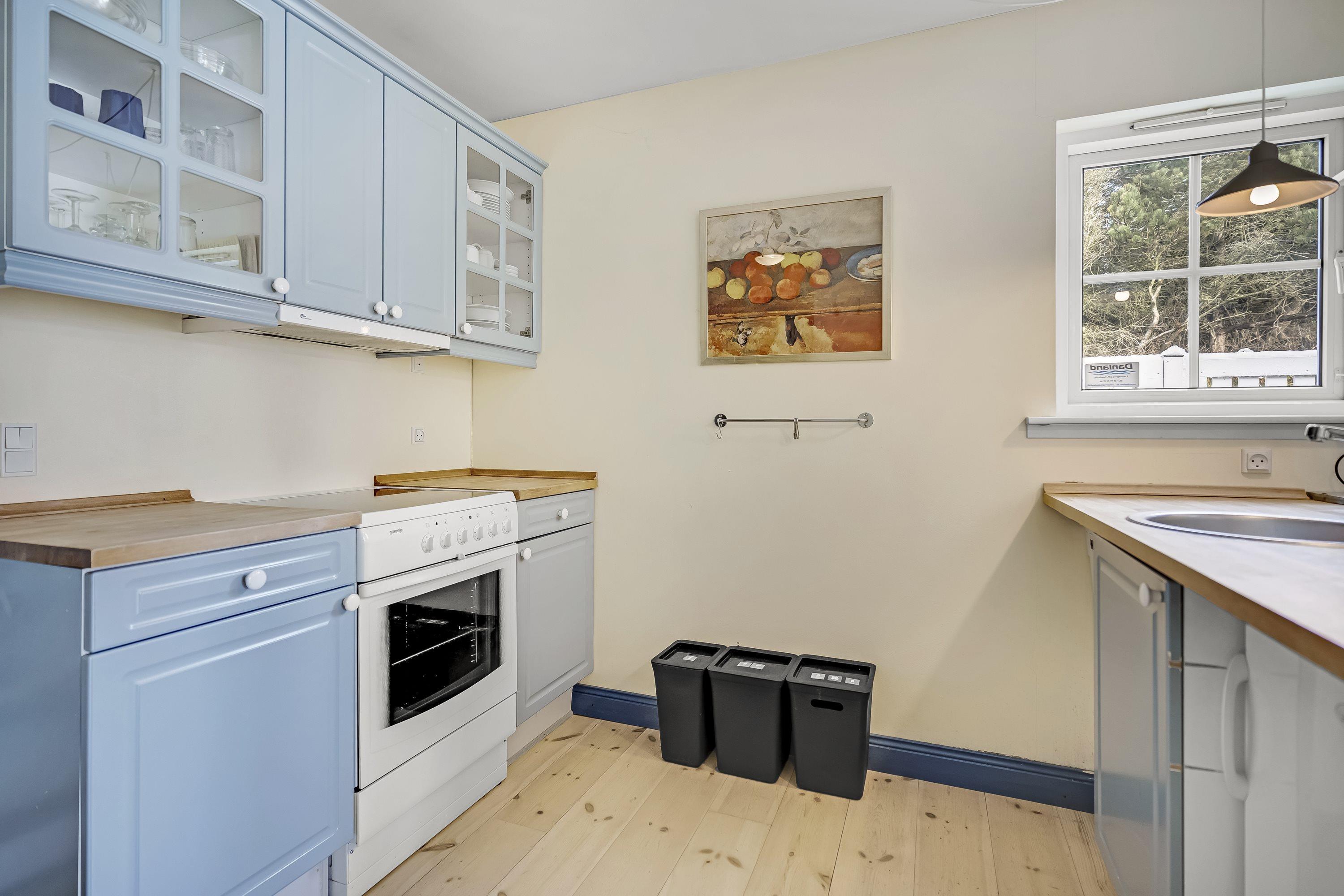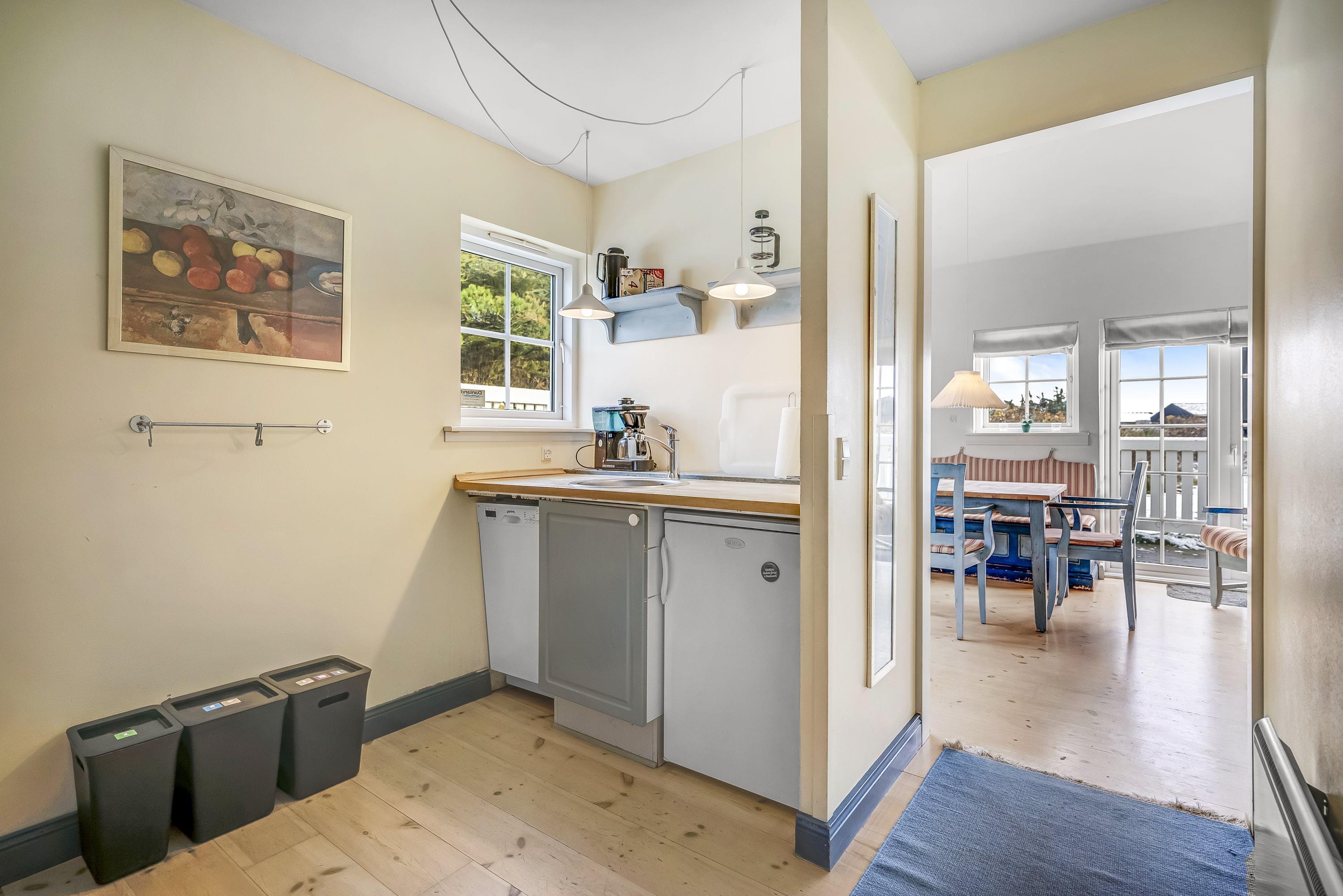Ferielejligheden er udstyret med praktiske faciliteter herunder vaskemaskine, tørretumbler og opvaskemaskine, så I nemt kan holde styr på jeres yndlingsferietøj og service i køkkenet.