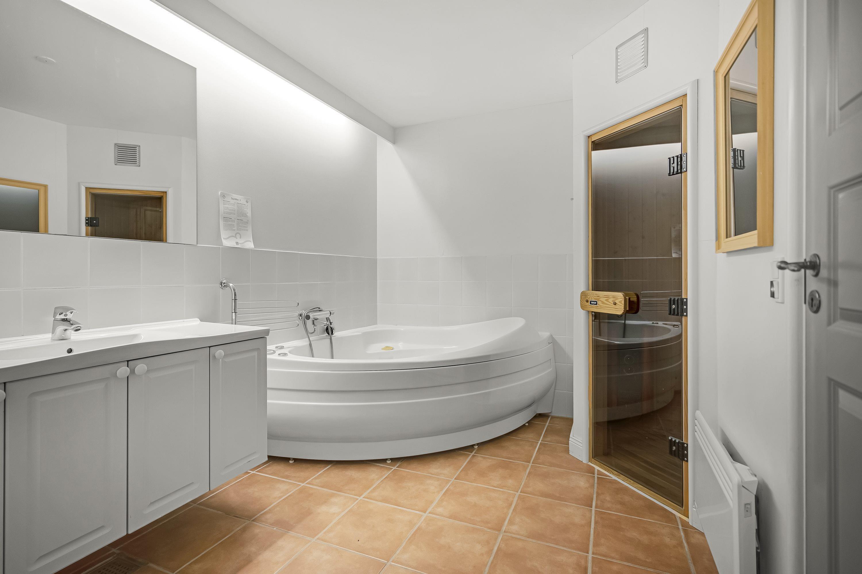 På 1. sal er der 2 soveværelser, hvoraf det ene har en dobbeltseng, og det andet har 2 enkeltsenge, hvilket giver fleksible sovepladser for både familier og venner. I stueplan finder I et badeværelse med gulvvarme og derudover et gæstetoilet, der sikrer at der ikke er kø til toilettet om morgenerne. Til ekstra forkælelse og afslapning kan I bruge saunaen og spaen, så I kan skrue helt ned for tempoet og bare nyde ferien i jeres eget tempo.