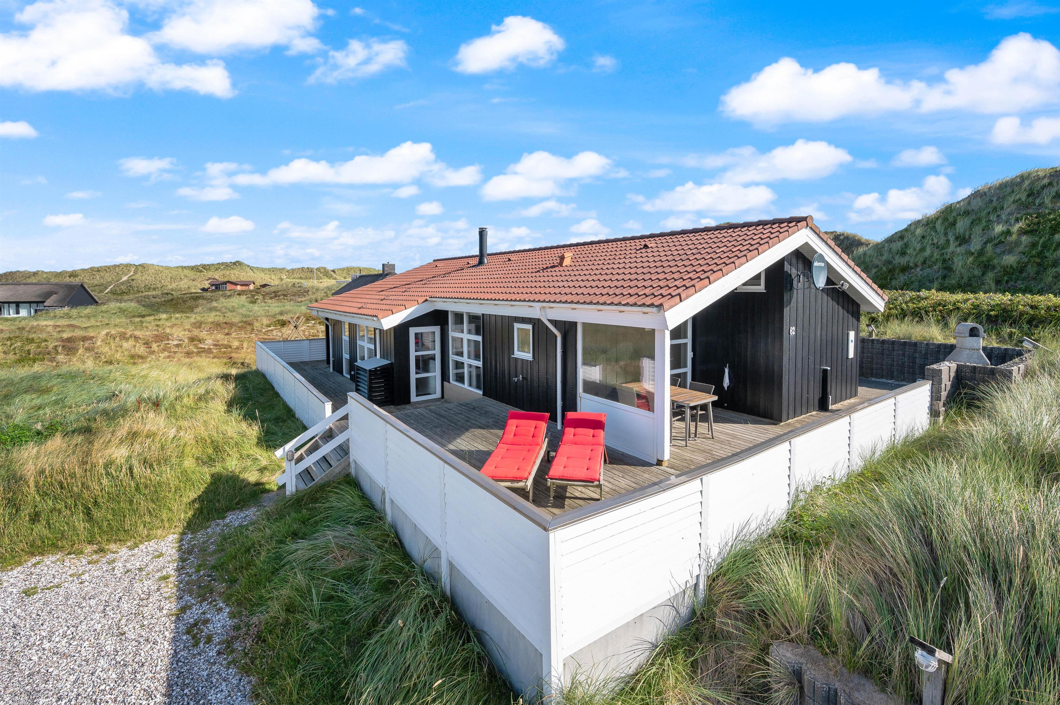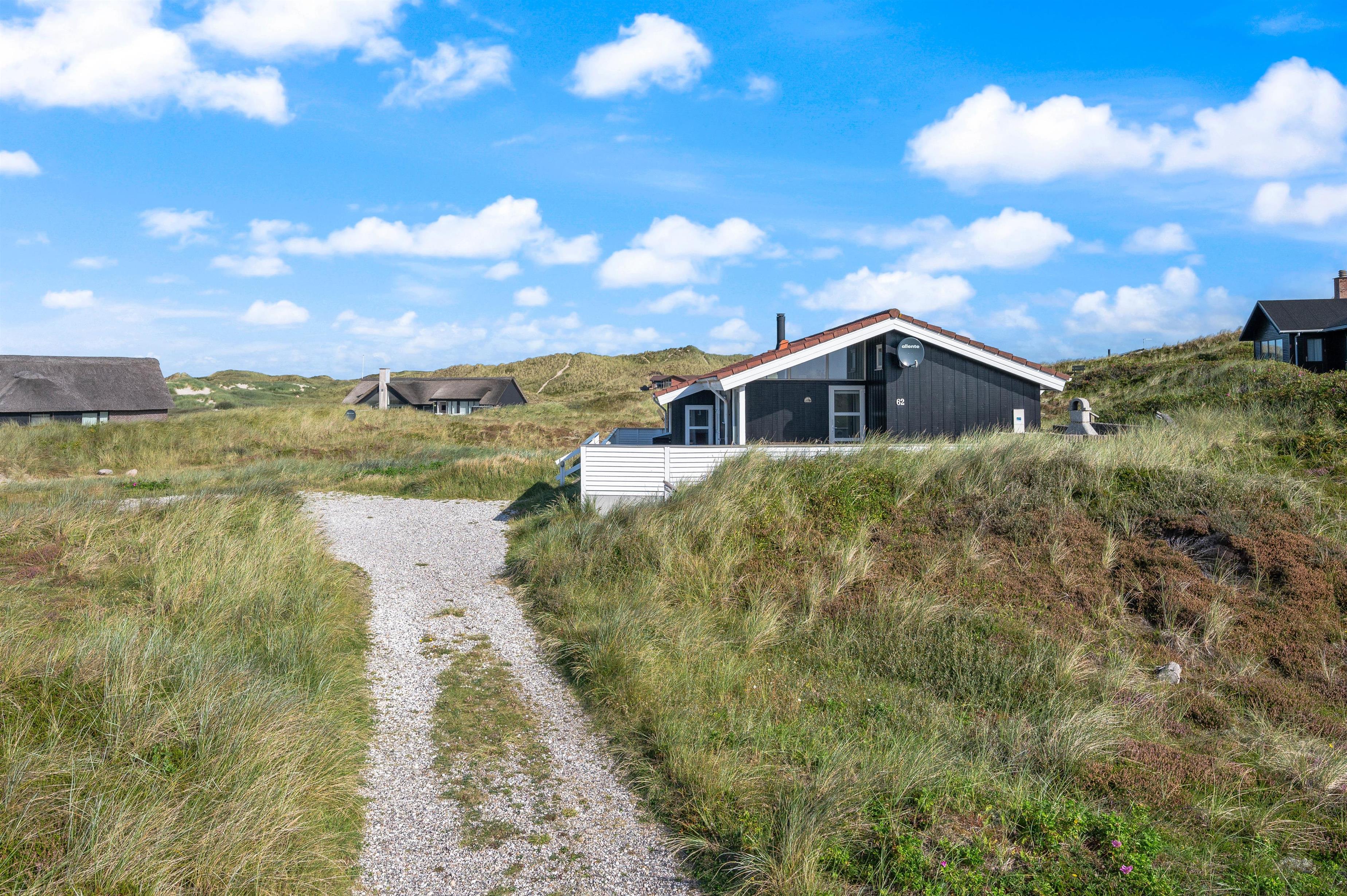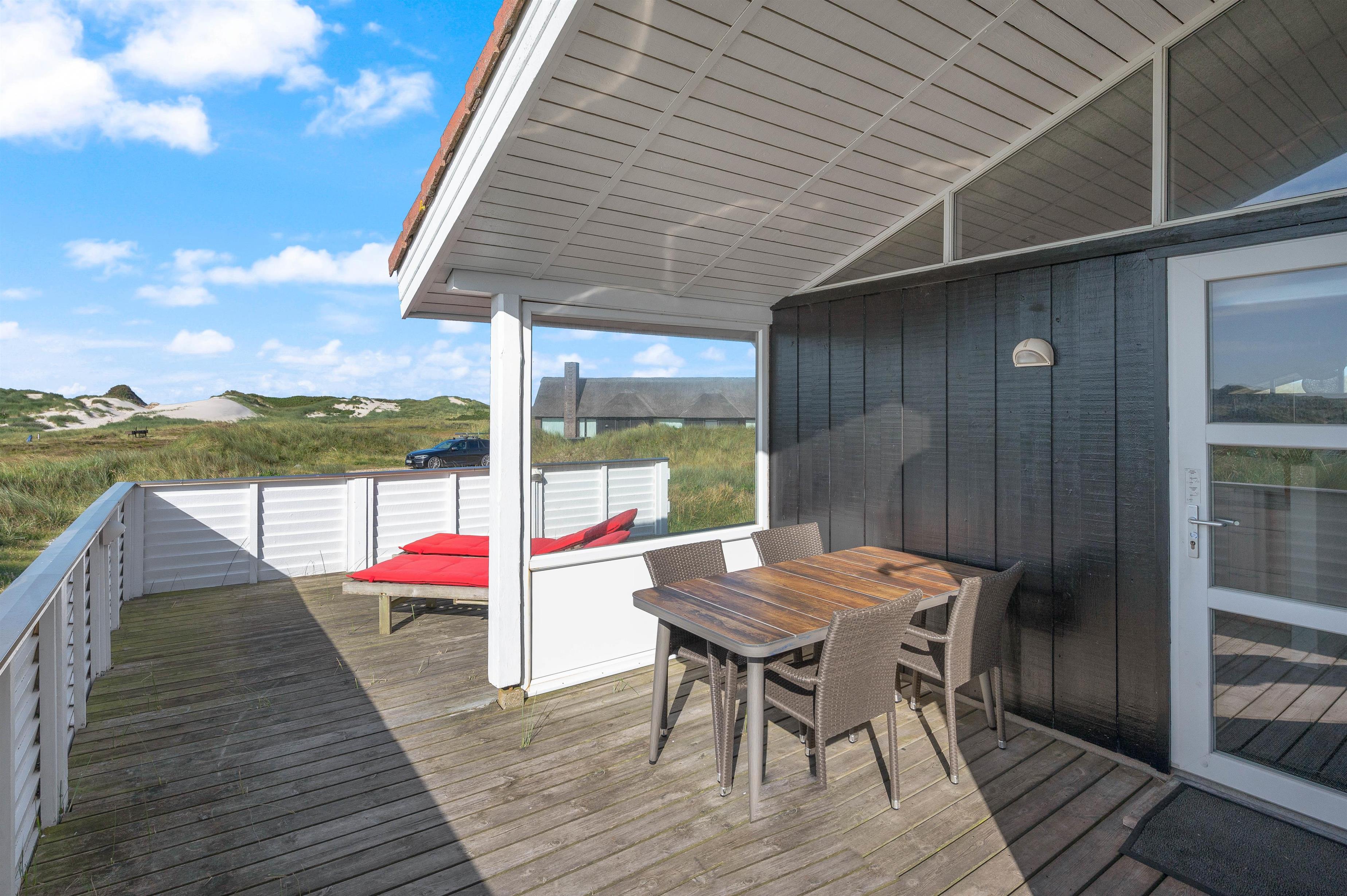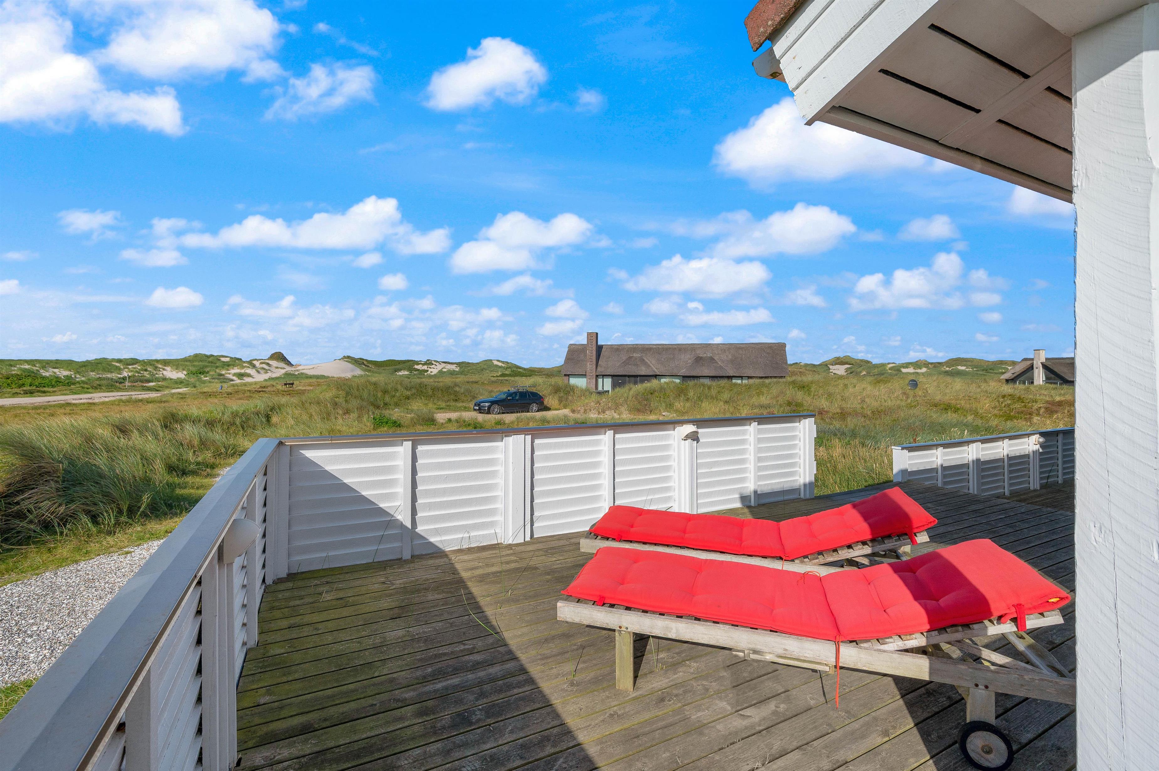 Huset ligger på en smuk, kuperet naturgrund kun få minutters gang fra havet og den endeløse sandstrand. Det er placeret højt på grunden og man har en fantastisk udsigt udover hele området. Fra klitten lige bag huset er der en endnu flottere udsigt over hele klitlandskabet.