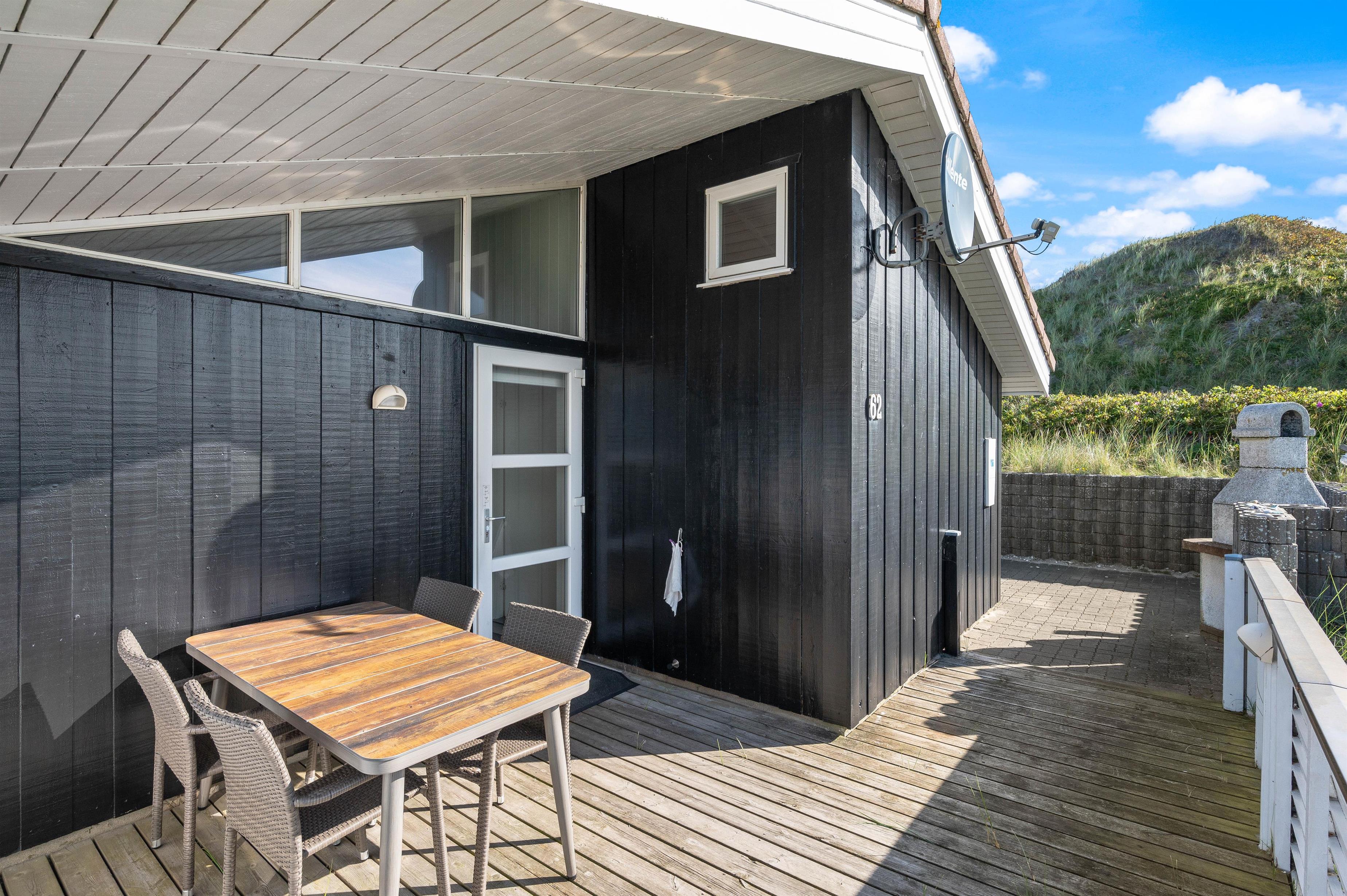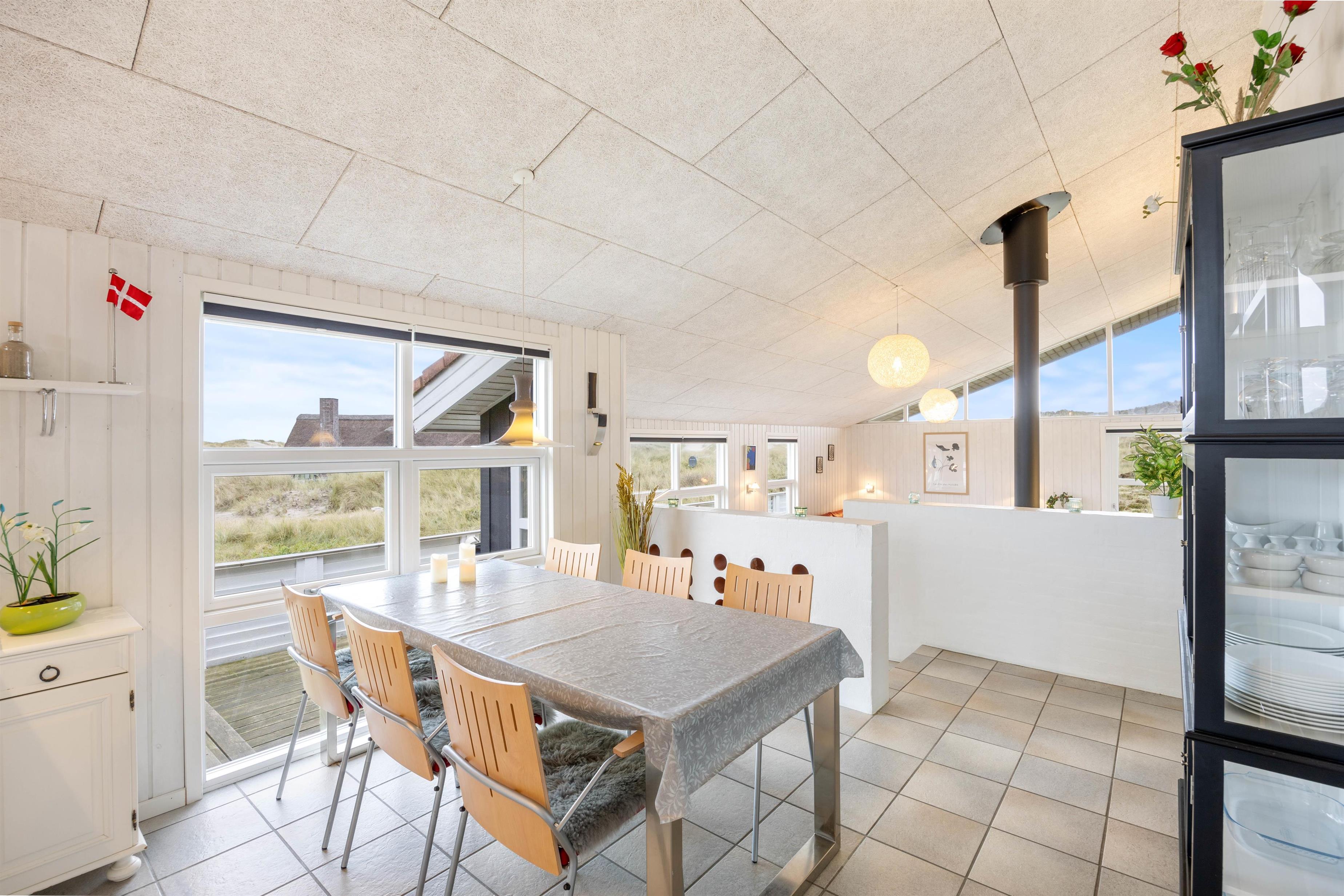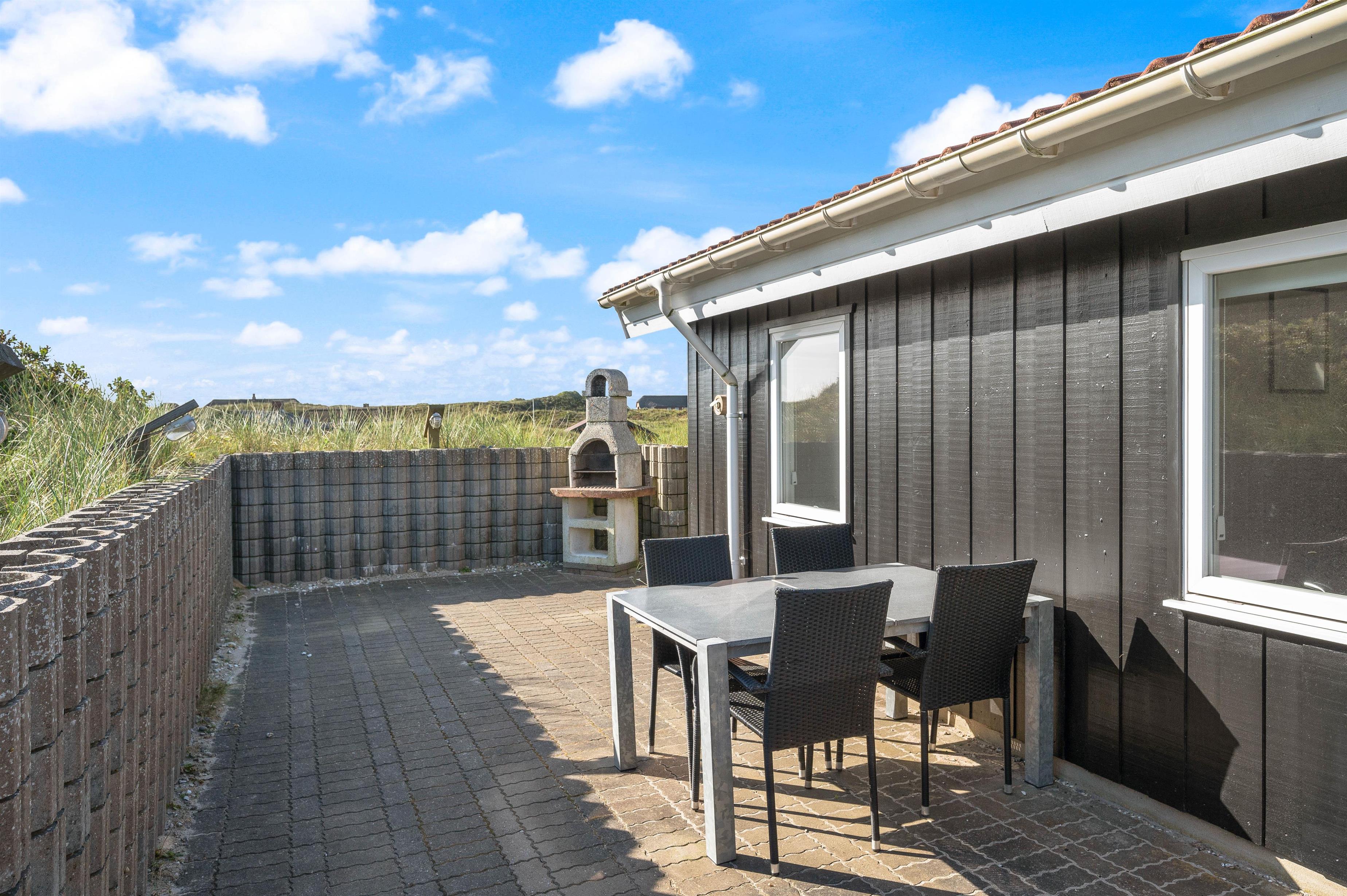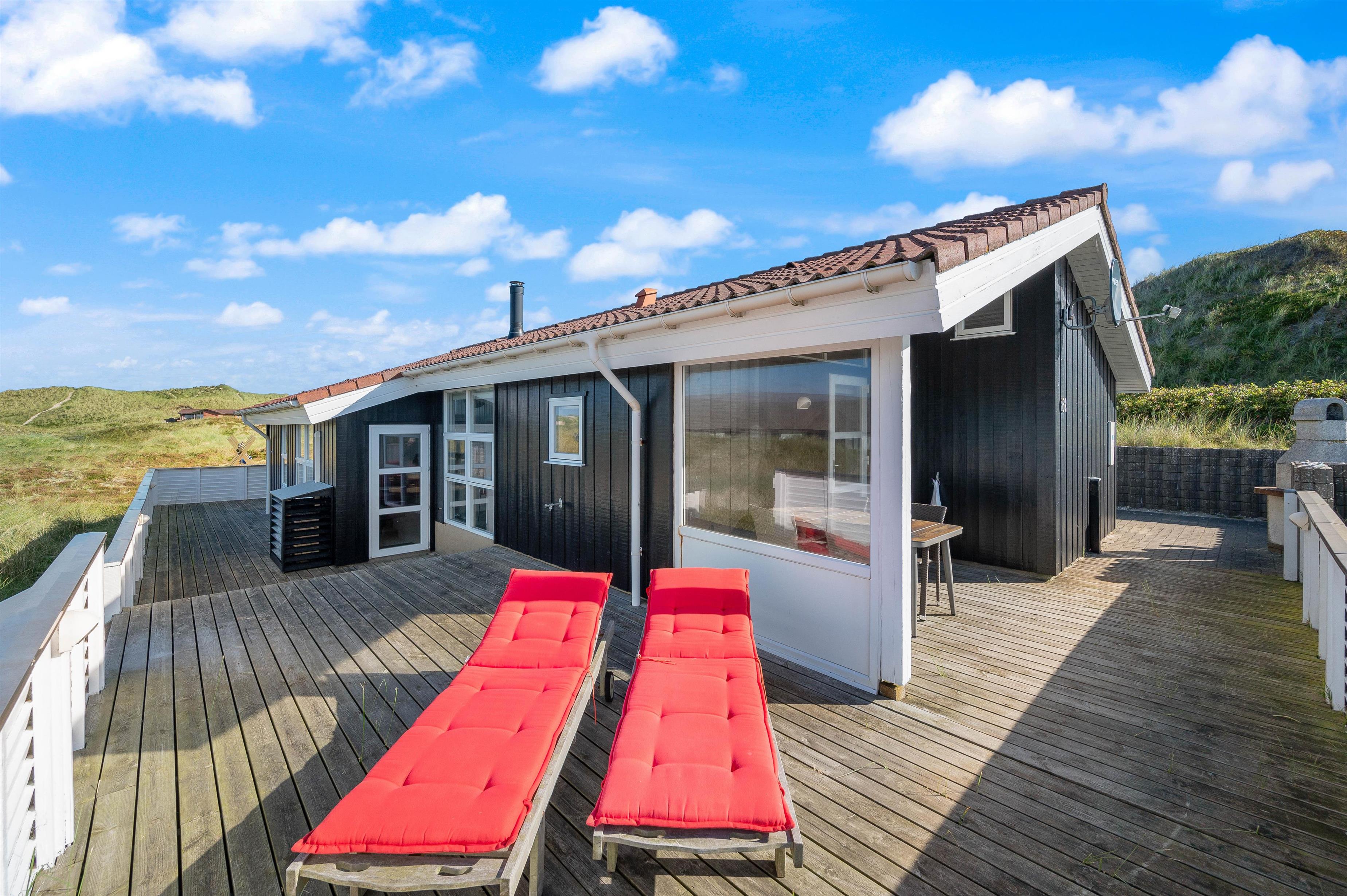 Huset ligger på en smuk, kuperet naturgrund kun få minutters gang fra havet og den endeløse sandstrand. Det er placeret højt på grunden og man har en fantastisk udsigt udover hele området. Fra klitten lige bag huset er der en endnu flottere udsigt over hele klitlandskabet.