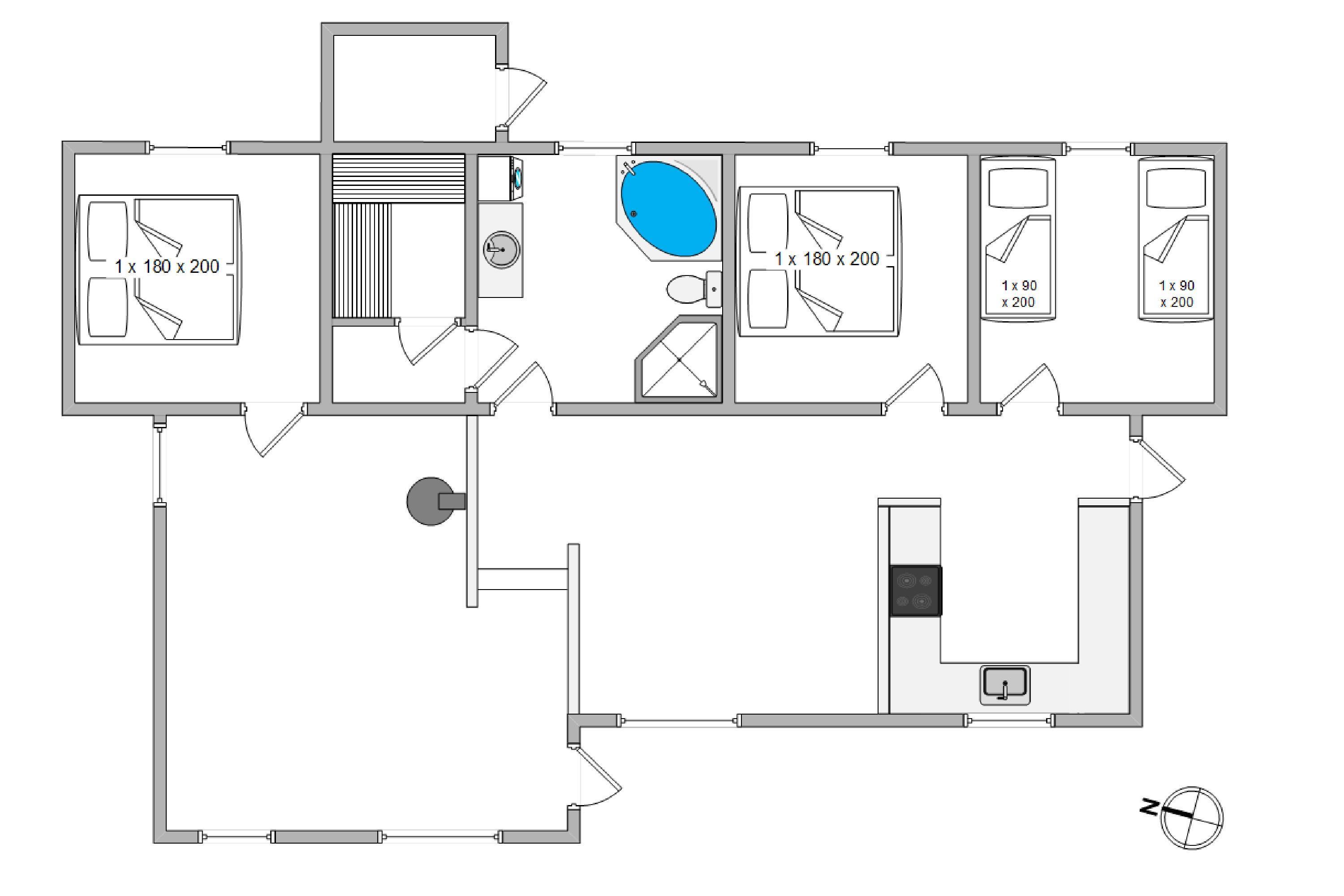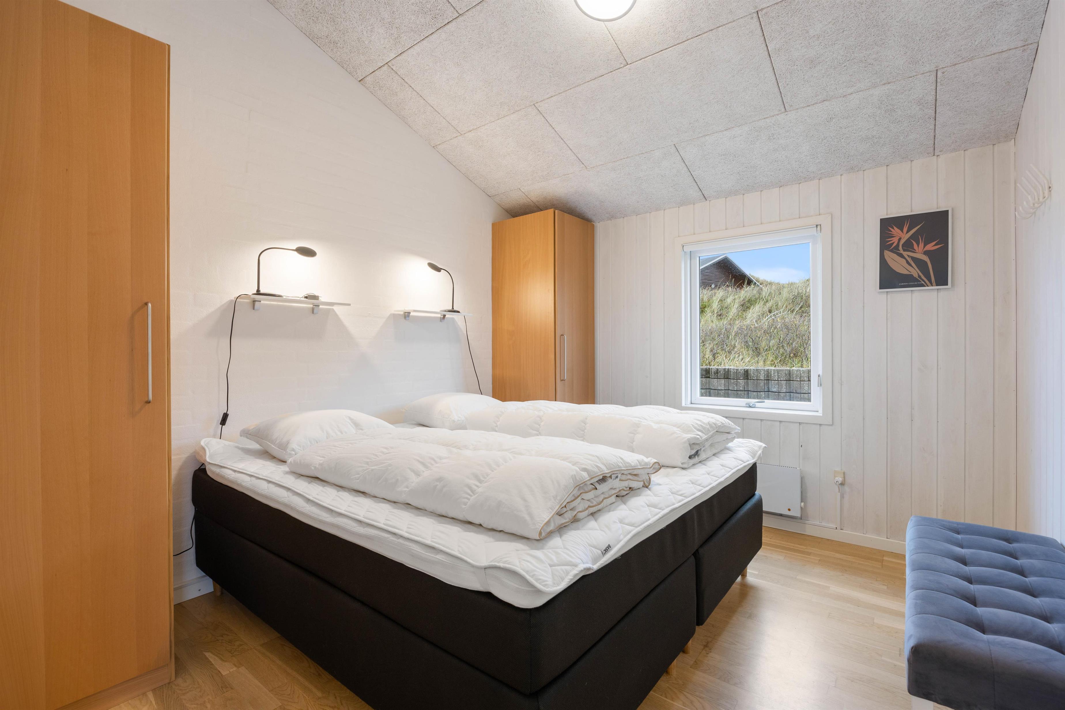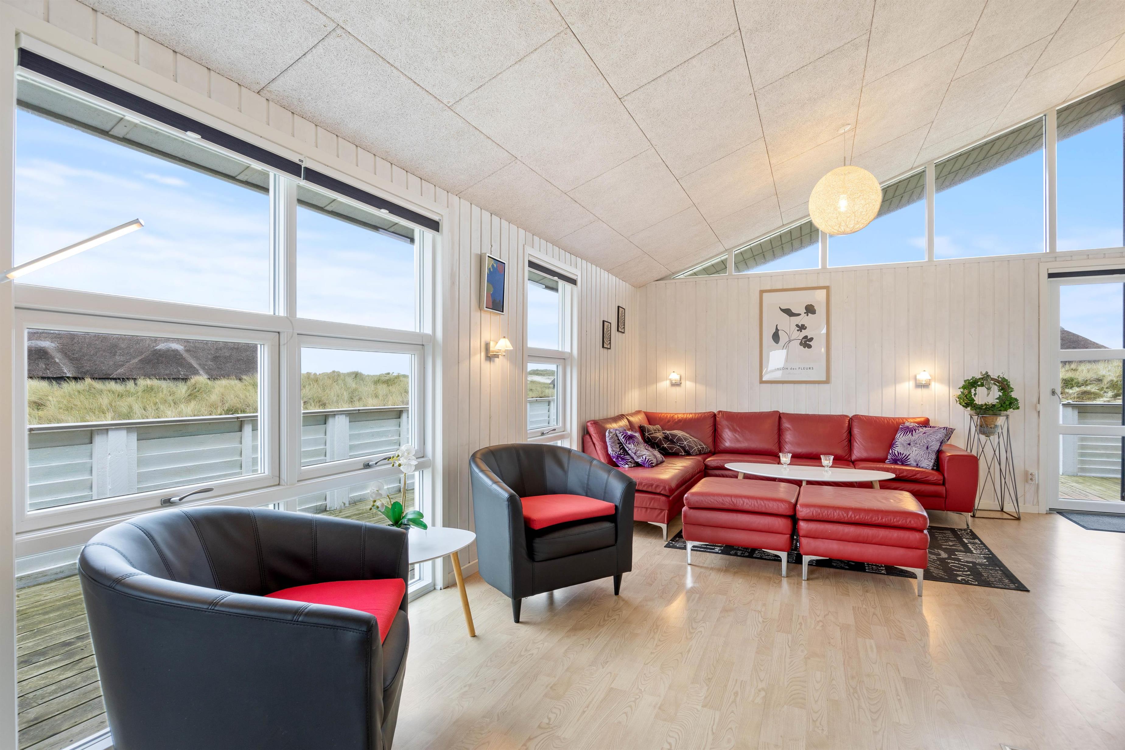 Dette sommerhus er skønt indrettet med store lyse og smagfuldt møblerede rum. Loftet går til kip, så her er en fantastisk højde på rummene. Ydermere sørger de mange store vinduer for et godt lysindfald, hvilket der til at skabe det helt rigtige feriemiljø for jer. I sommerhuset er der plads til seks personer i tre gode soveværelser. To af værelserne er med dobbeltseng og fra det ene af værelserne er der direkte udgang til terrassen. I det tredje værelse er der to seperate senge og en rigtig hyggelig hems.