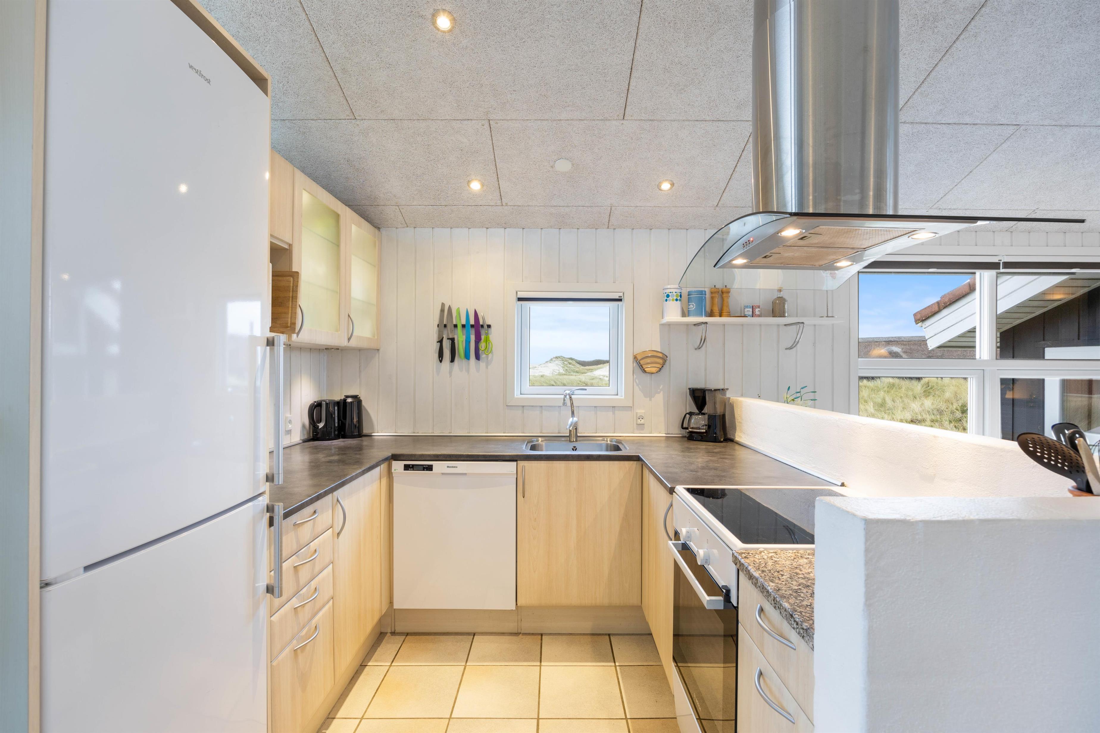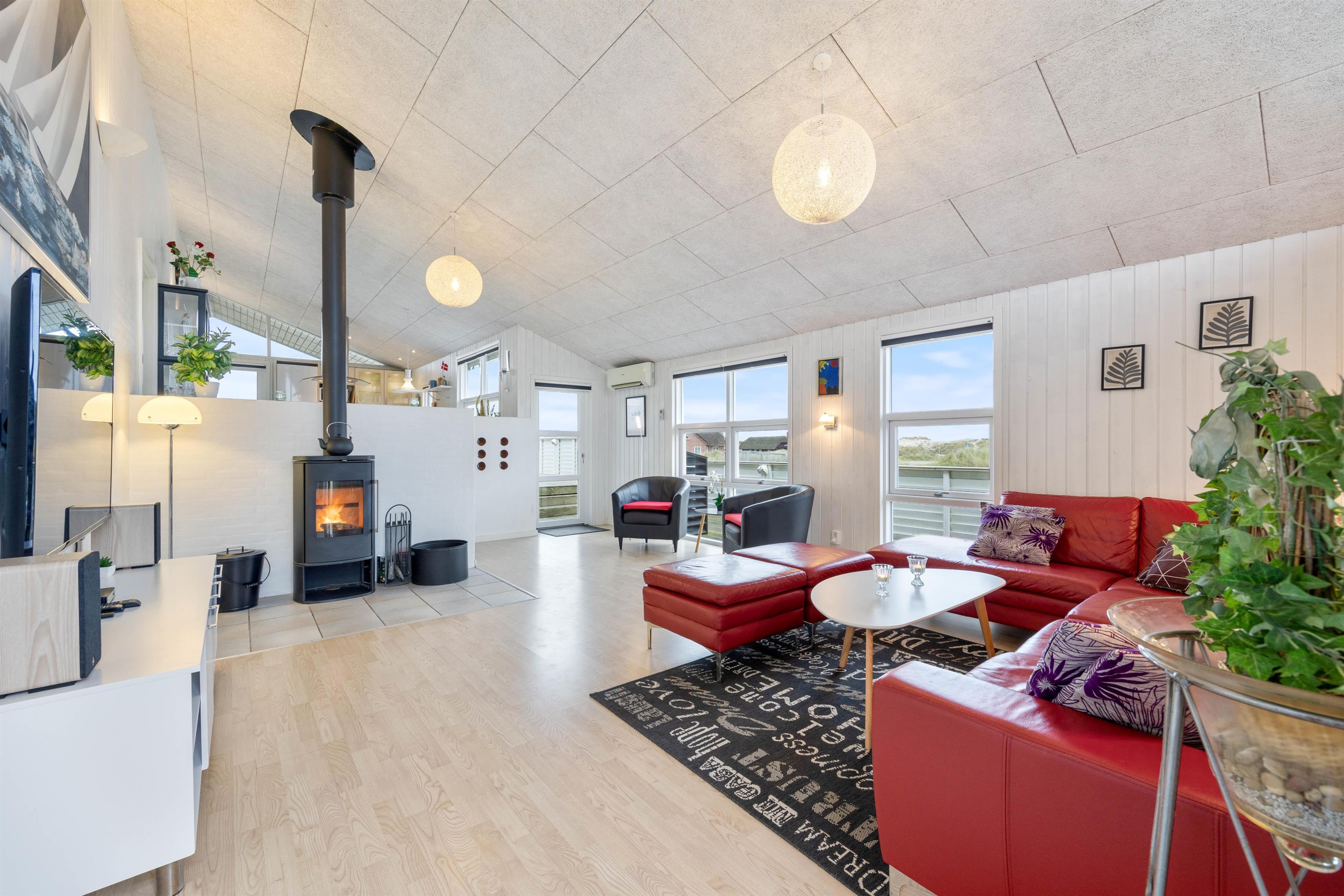 Den hyggelige hems er det perfekte frirum for børnene, hvor de kan spille spil eller bare slappe af uden at blive forstyrret af de voksne. Huset har et dejligt køkken/alrum med flot udsigt, herfra går du ned i en rigtig hyggelig og velindrettet stue med bl.a. brændeovn, fladskærms-TV og parabol. Der hører desuden gratis trådløst internet og en energibesparende varmepumpe til dette dejlige feriehus.