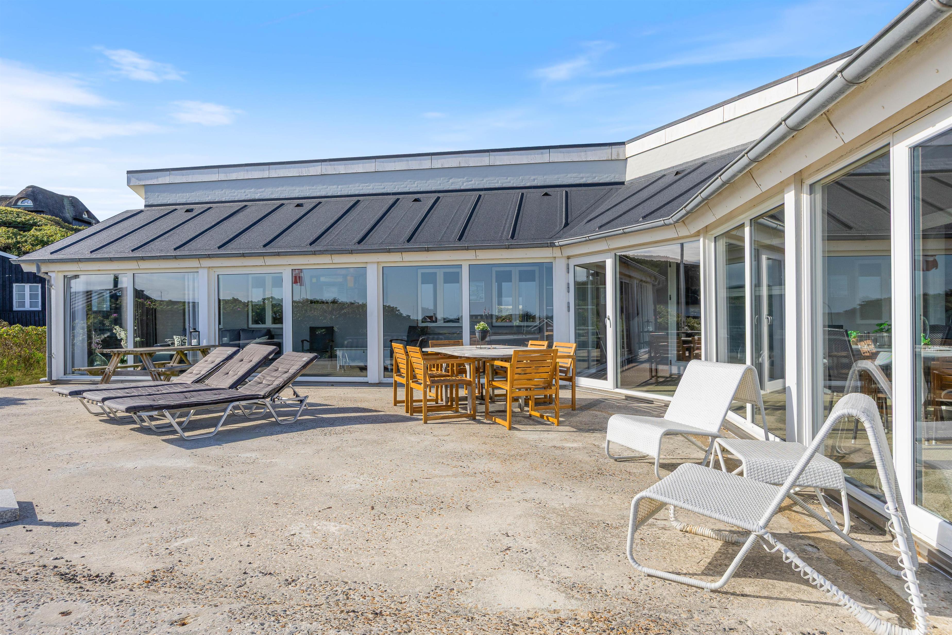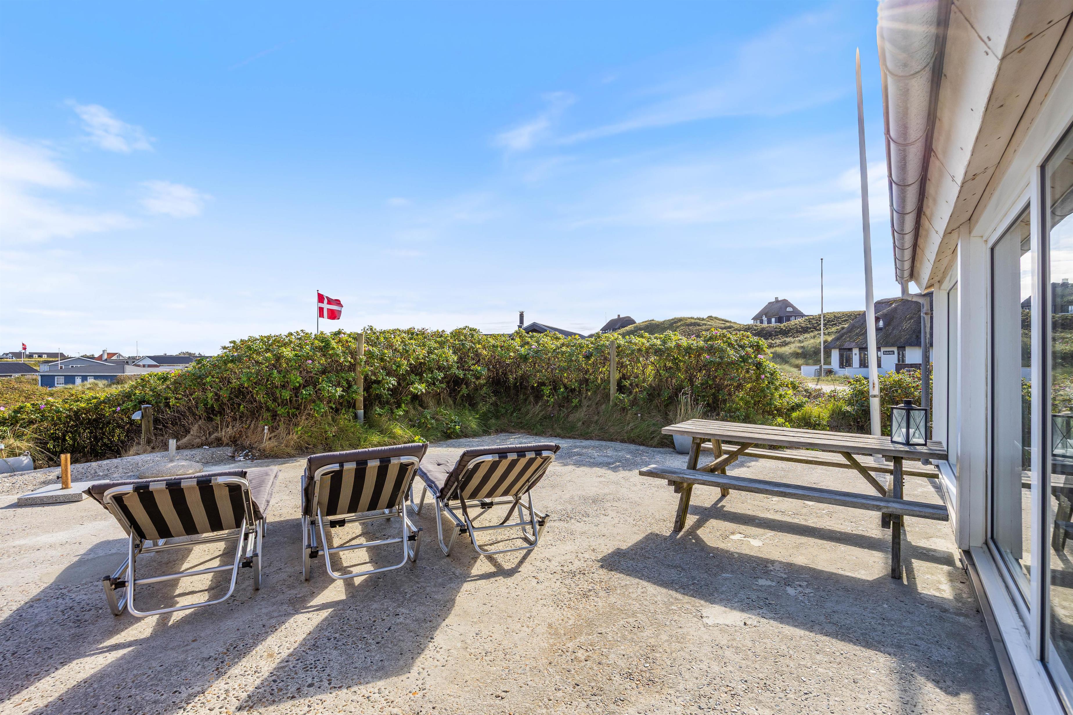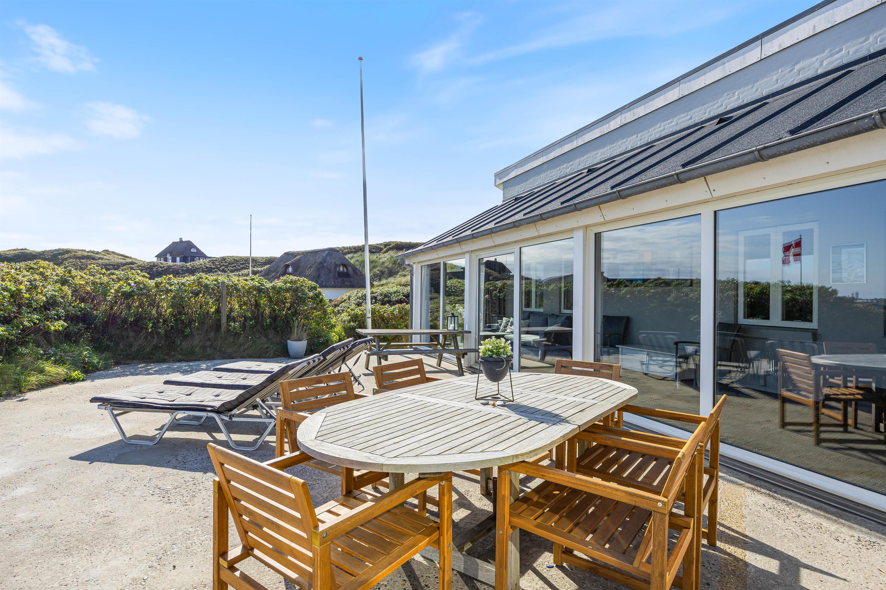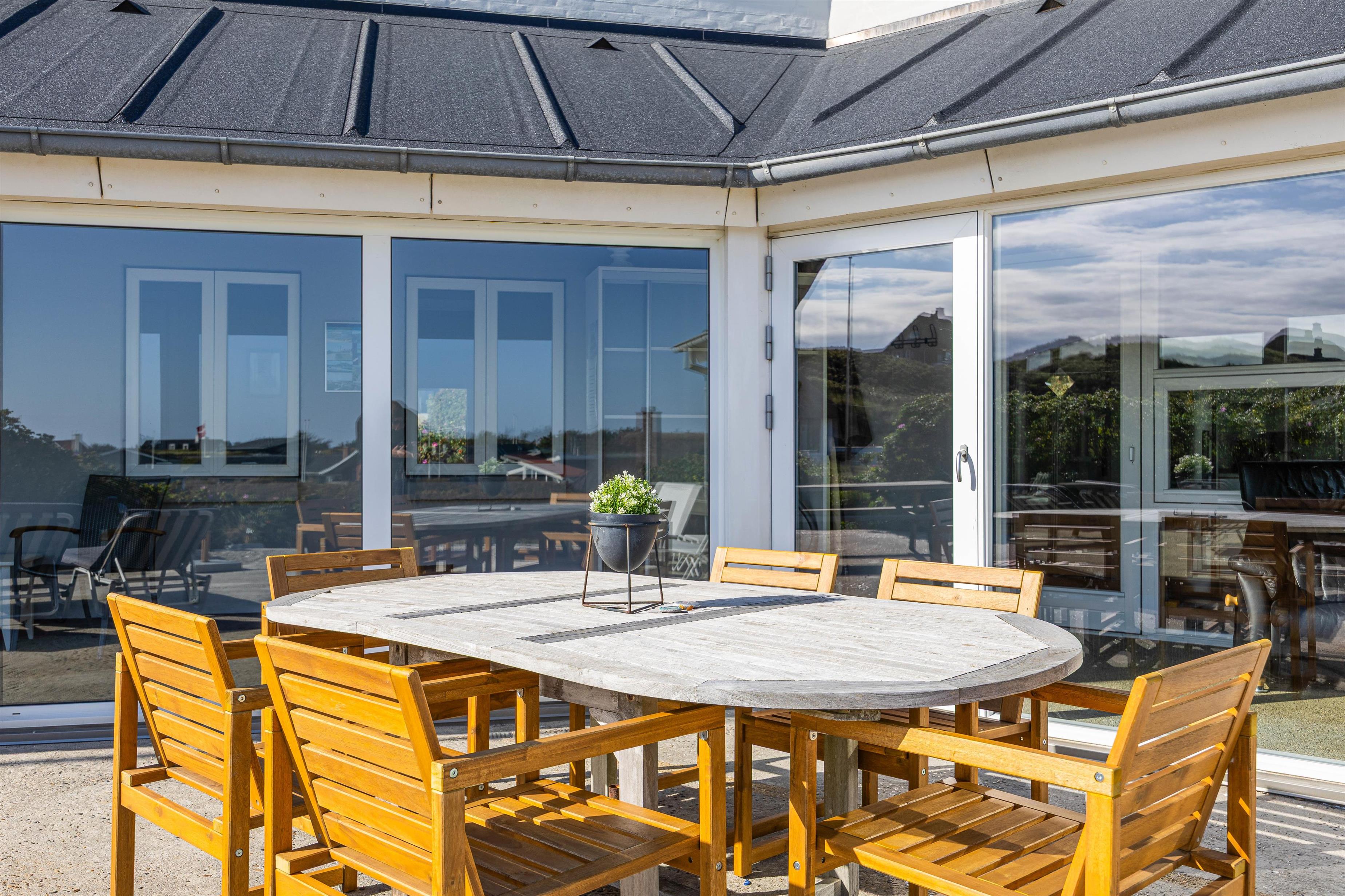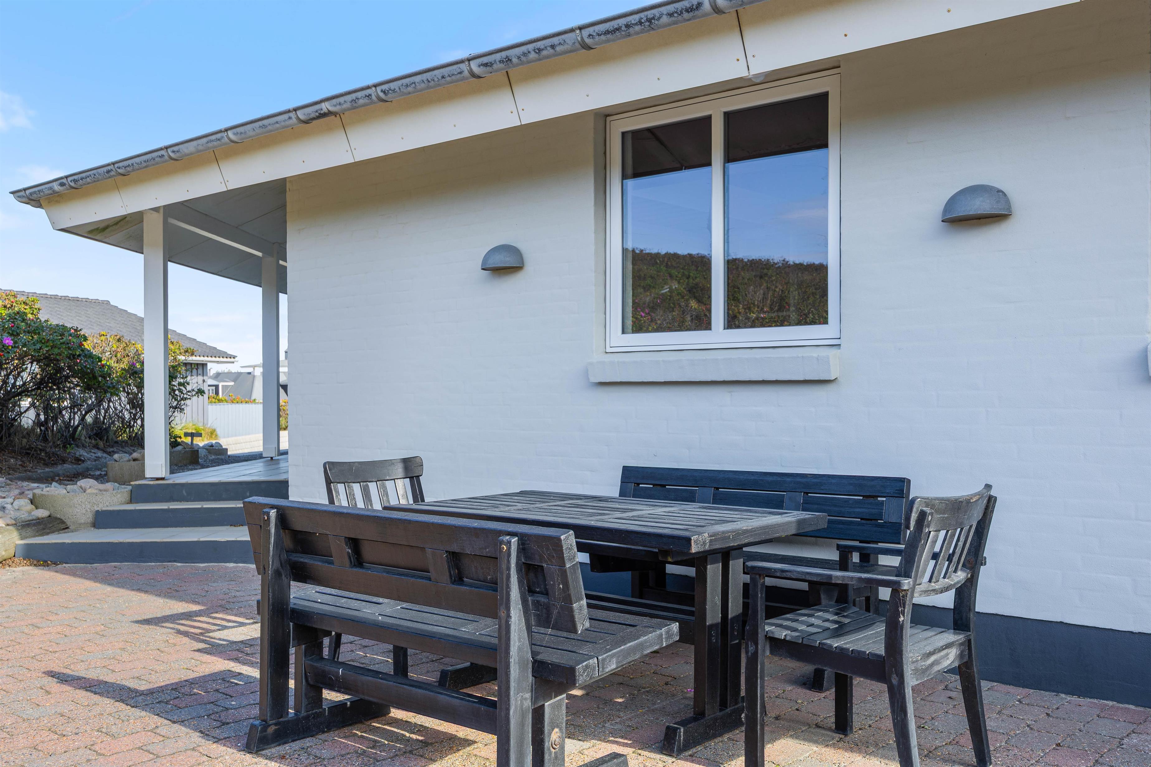 Feriehuset har to dejlige terasser mod nord/øst og syd/vest. Fra terrasserne kan I følge solens gang hele dagen. Ydermere kan I læne jer tilbage i de tilhørende havemøbler og liggestole til sommerhuset samtidig med, at andre står for tilberedning af et lækkert måltid på grillen. Sommerhuset ligger blot et stenkast fra det storslåede Vesterhav og populære badestrand.