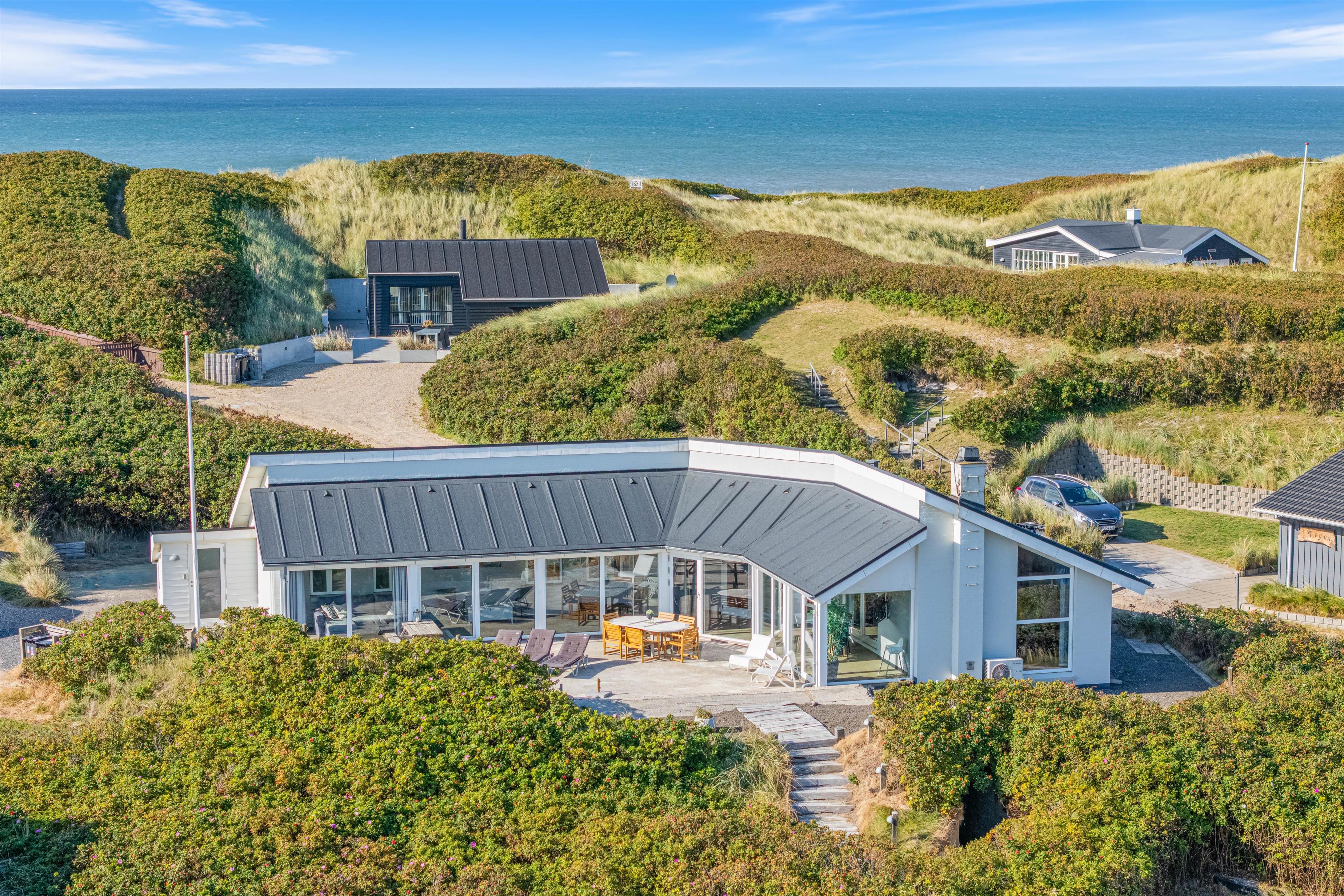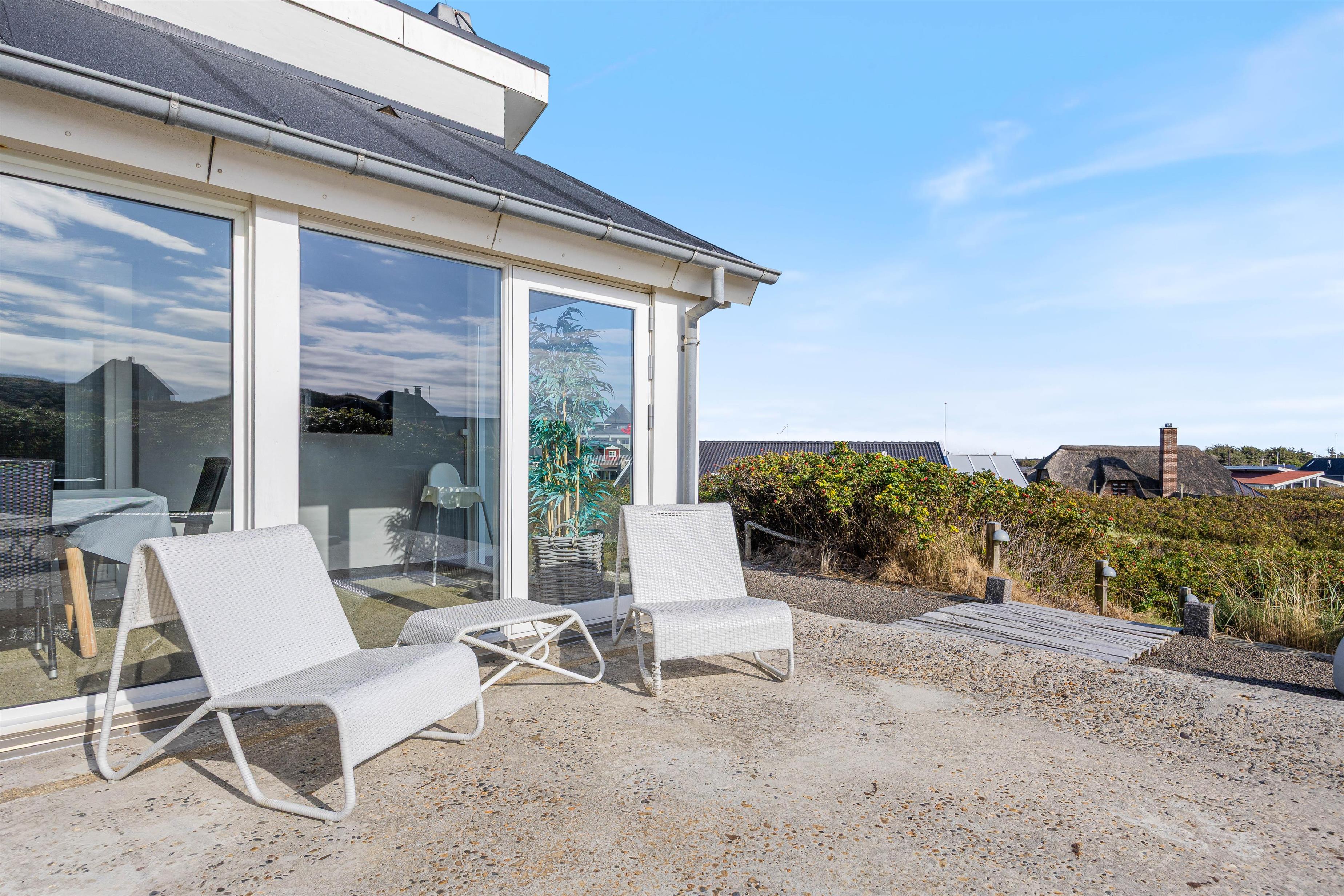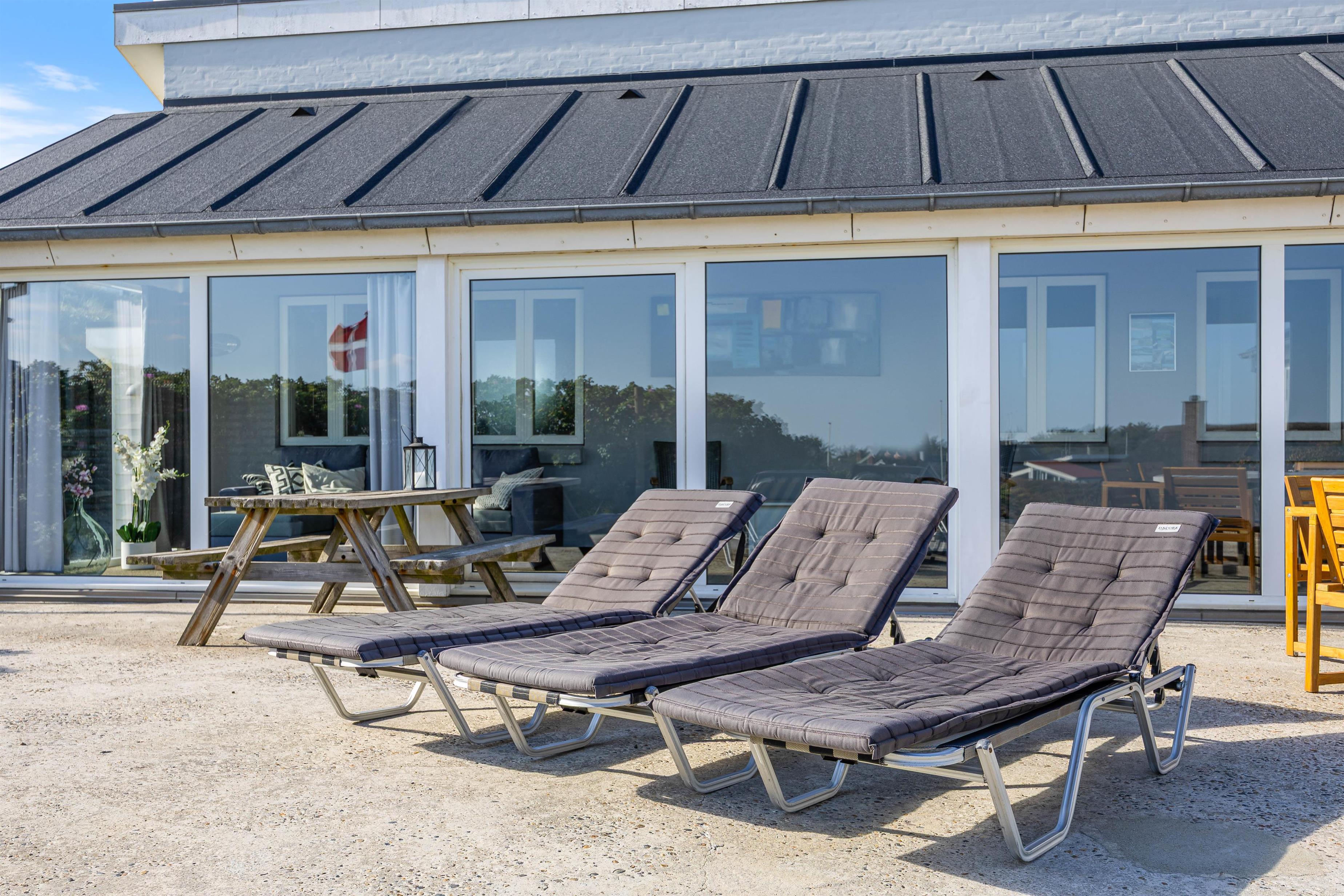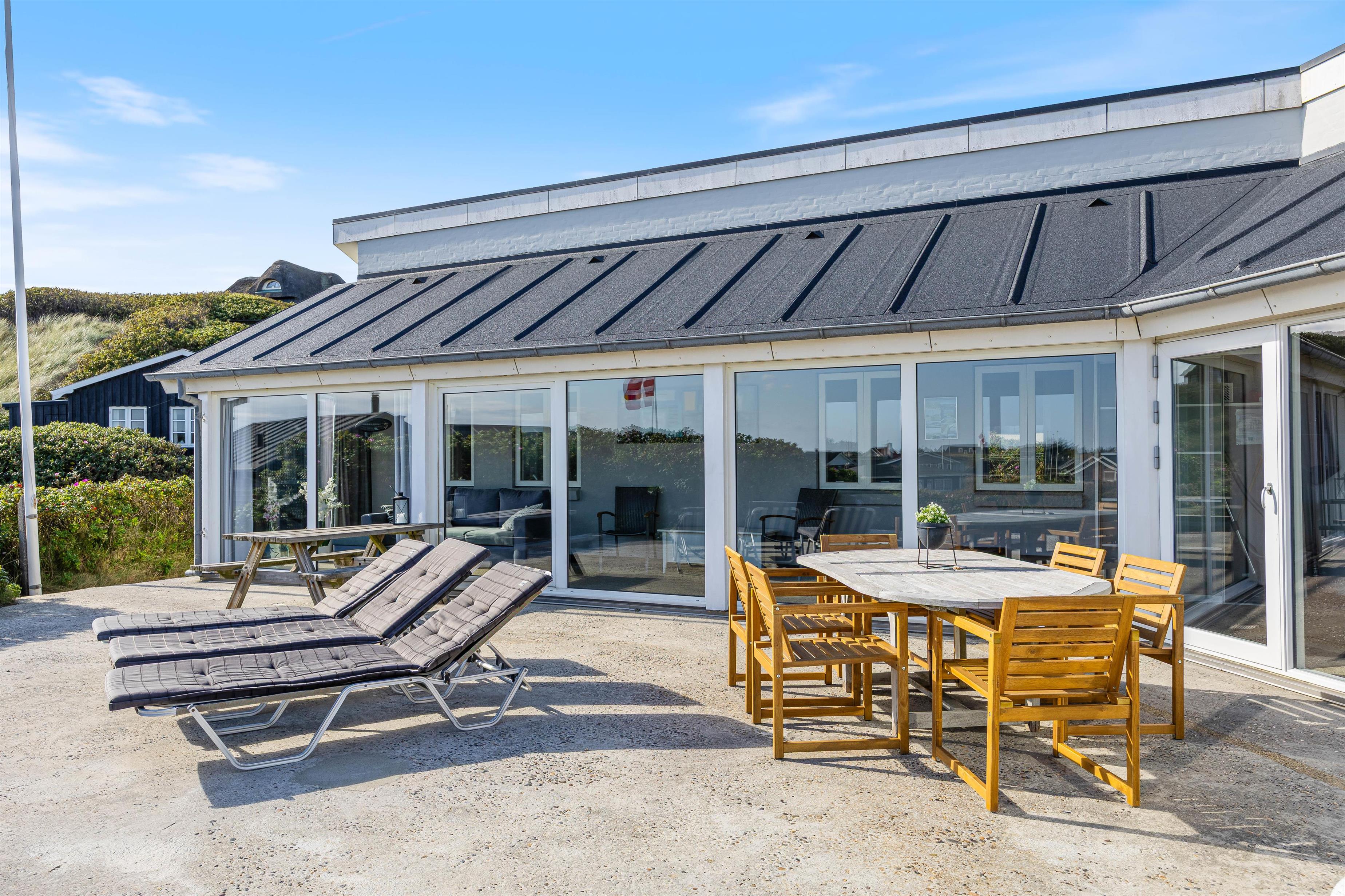 Feriehuset har to dejlige terasser mod nord/øst og syd/vest. Fra terrasserne kan I følge solens gang hele dagen. Ydermere kan I læne jer tilbage i de tilhørende havemøbler og liggestole til sommerhuset samtidig med, at andre står for tilberedning af et lækkert måltid på grillen. Sommerhuset ligger blot et stenkast fra det storslåede Vesterhav og populære badestrand.