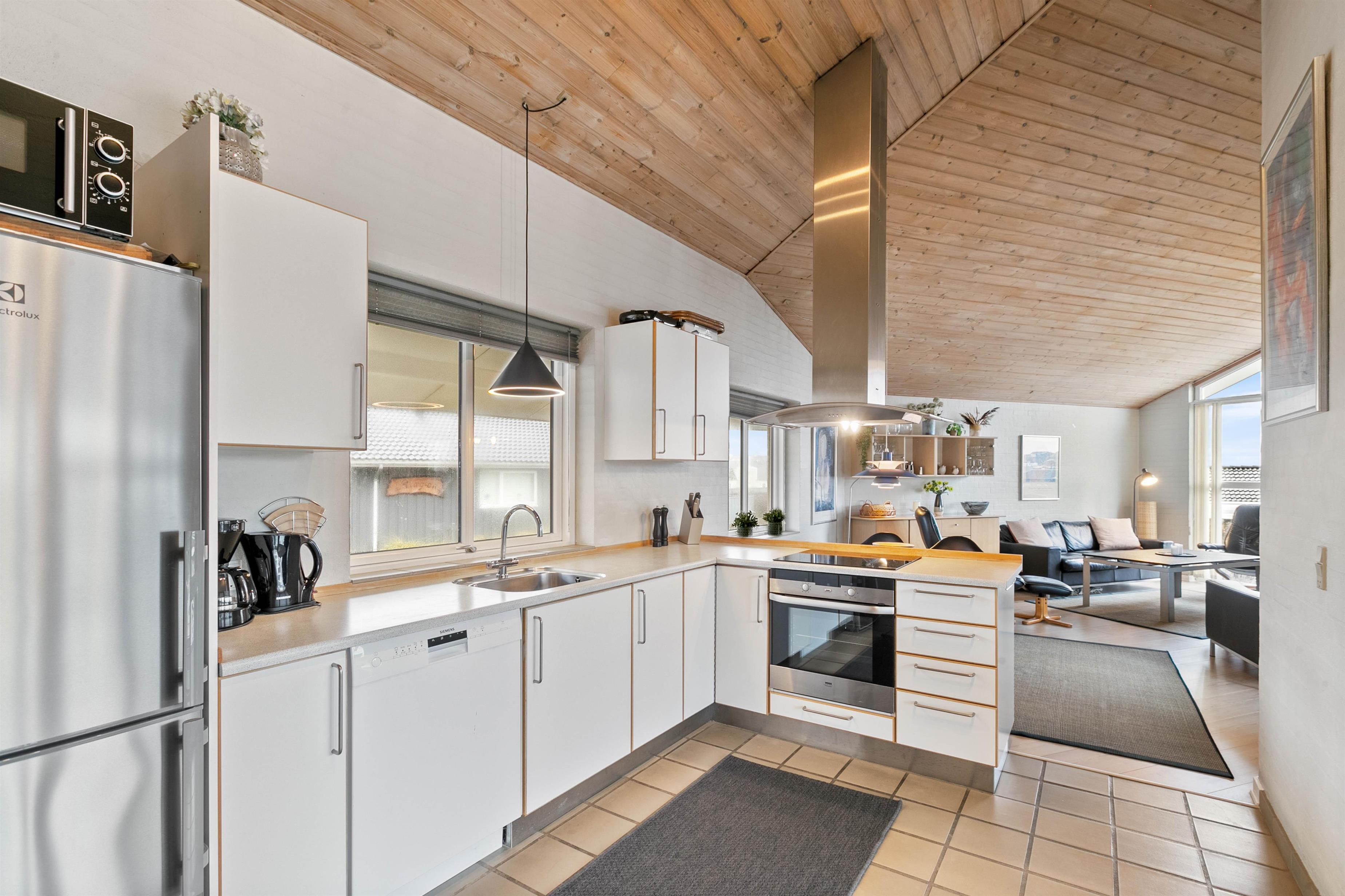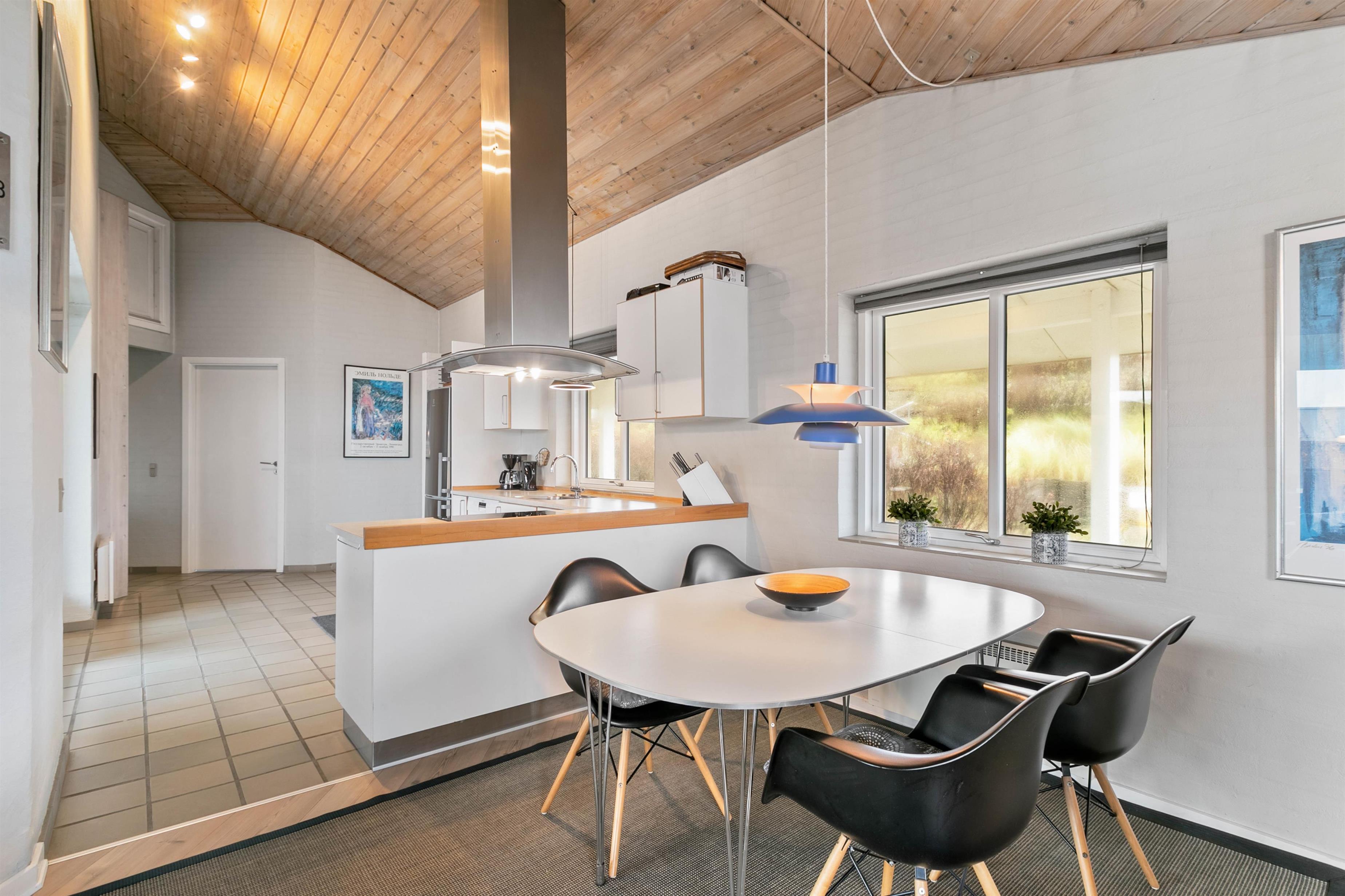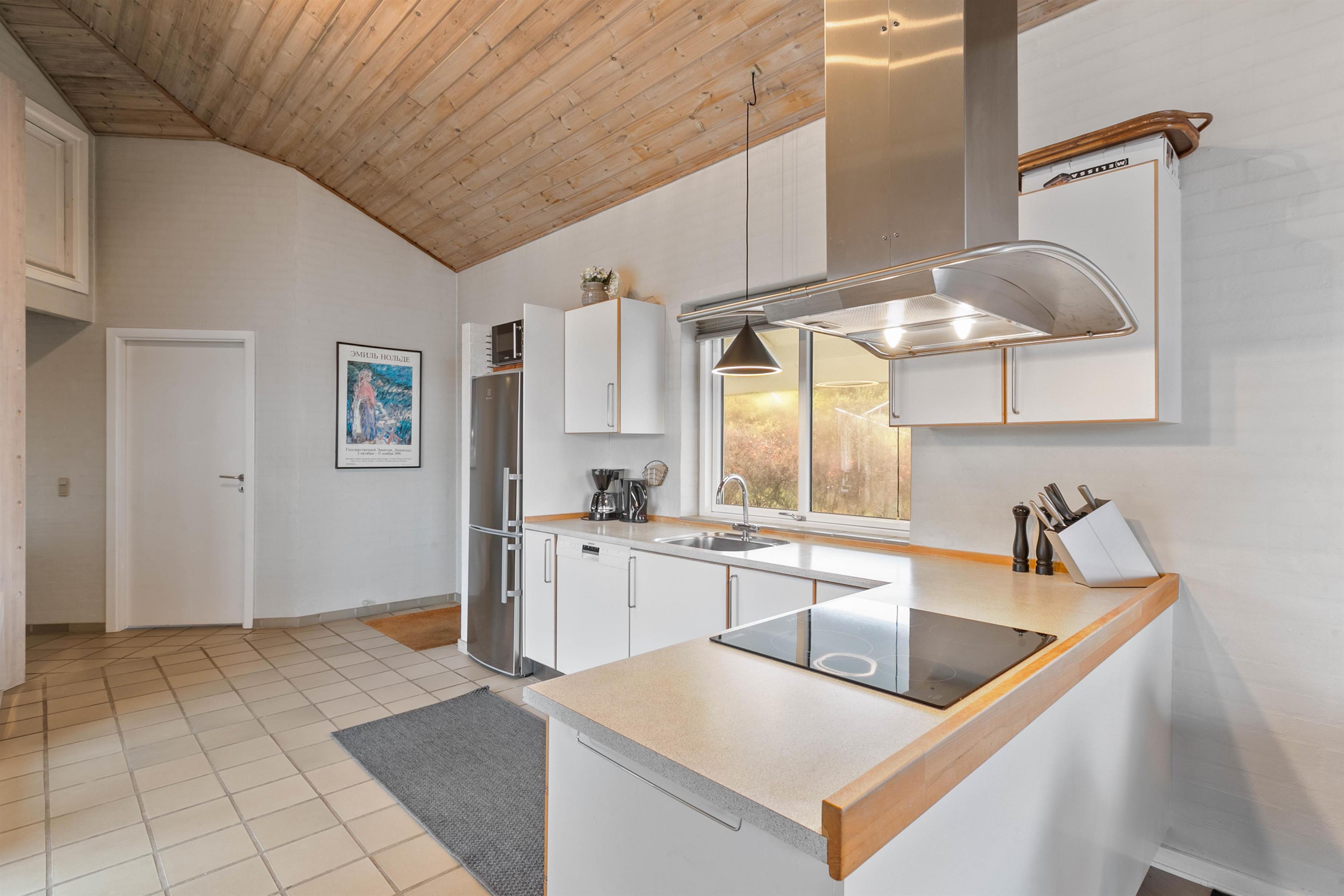 Feriehusets åbne køkken ligger i forlængelse med stuen, så I her har mulighed for enten at samles om madlavningen eller planlægge ugens oplevelser og aktiviteter. I har desuden også mulighed for at smide jer i sofaen med en god bog, en god film eller spille et spil sammen, imens I nyder varmen fra feriehusets brændeovn.