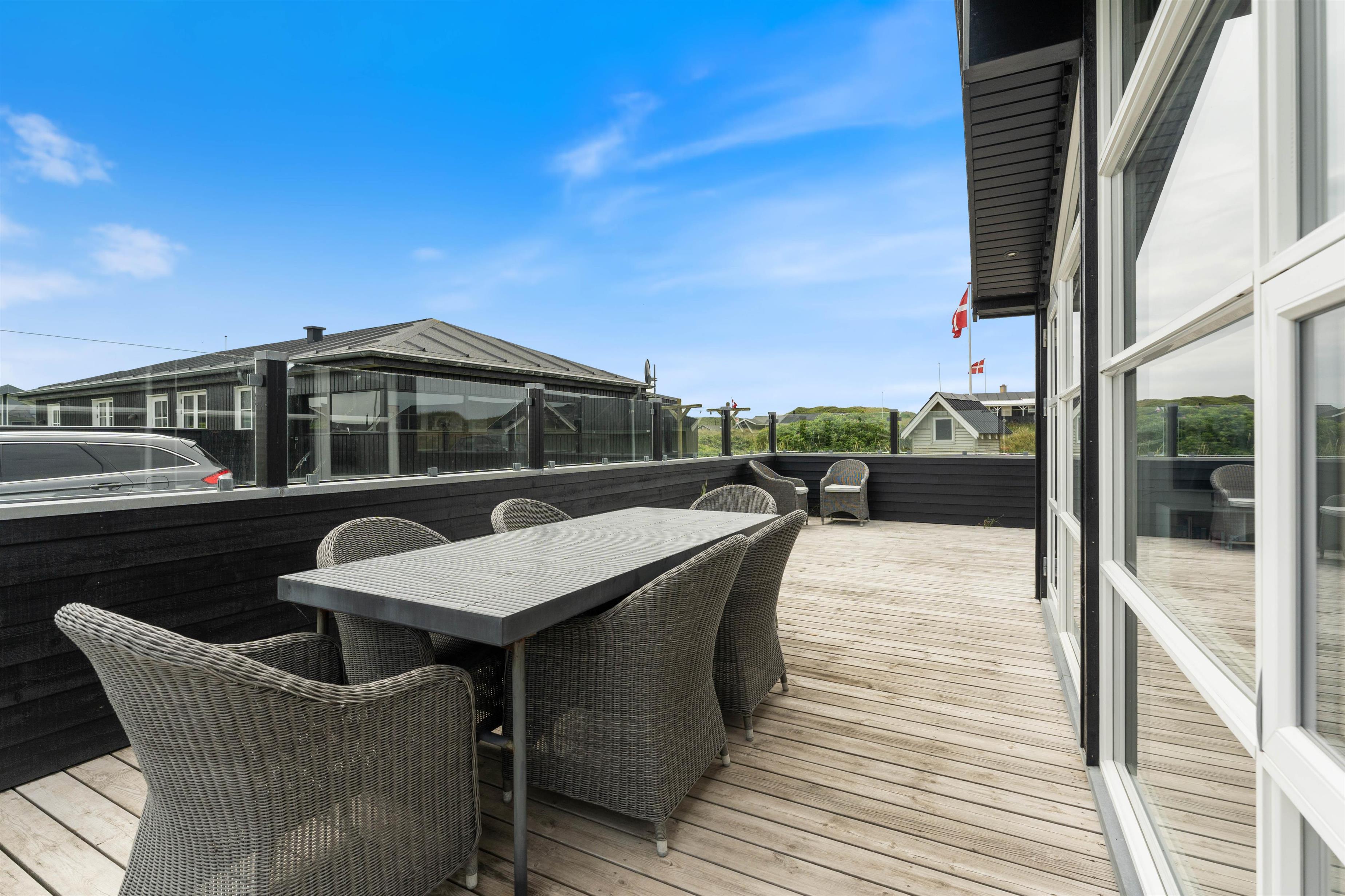Terrassen er dejligt stor og byder på mange muligheder. I kan nyde solen på liggestolene eller læse en god bog. Eller hvad med at nyde en hyggelig grill-middag på en lun sommeraften? Og har I hund eller småbørn med på ferien er den lukkede terrasse perfekt til leg, uden de voksne behøver have et øje på hver finger.