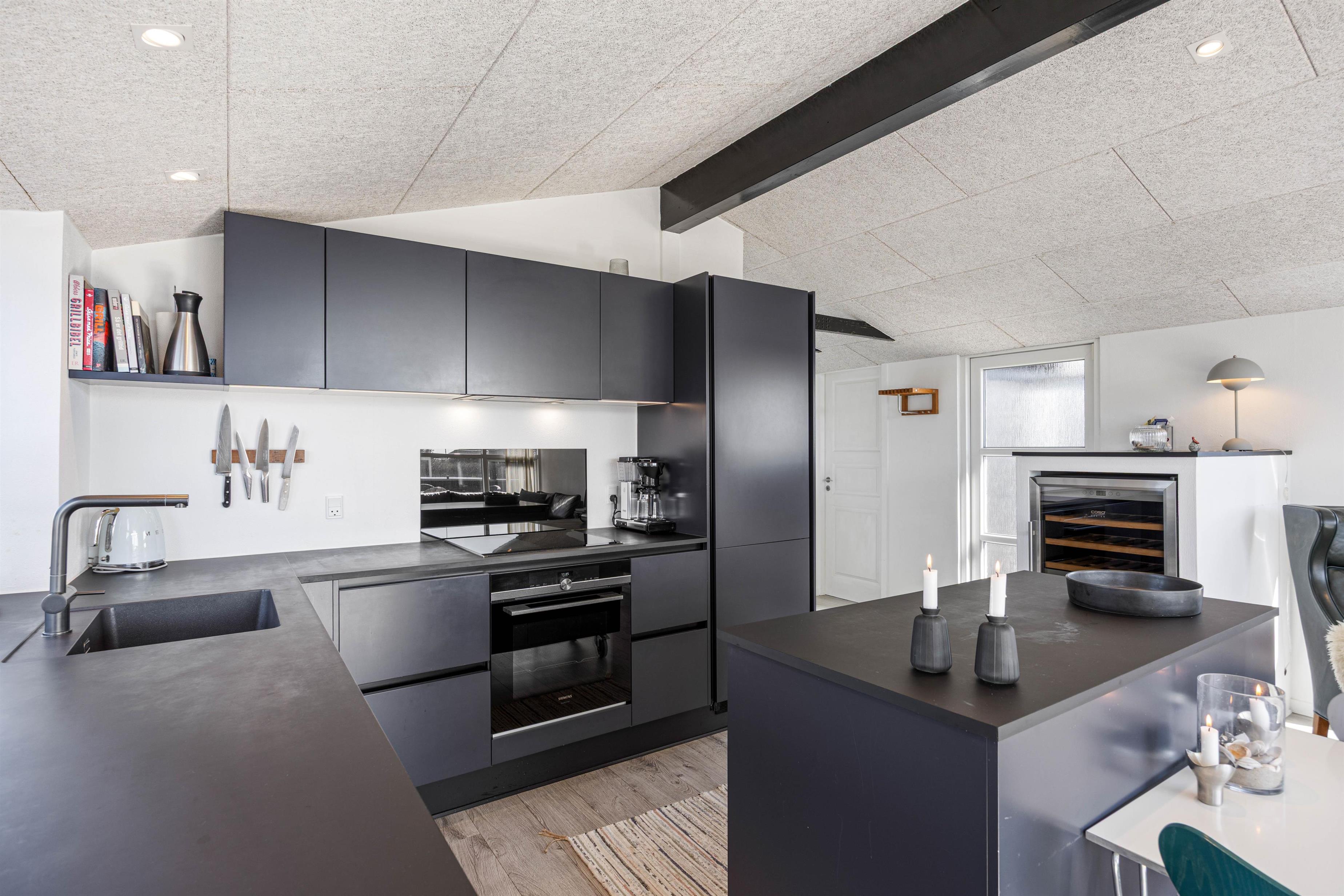 Sommerhuset er lyst og velindrettet, så I kan føle jer rigtig godt tilpas. I det moderne køkken kan I lave lækre retter sammen med familien eller vennerne, mens I nyder et glas vin, der er perfekt tempereret takket være husets vinkøleslab. I sofahjørnet kan I smide fødderne op og hygge jer med jeres yndlingsserier, mens I nyder varmen fra brændeovnen.