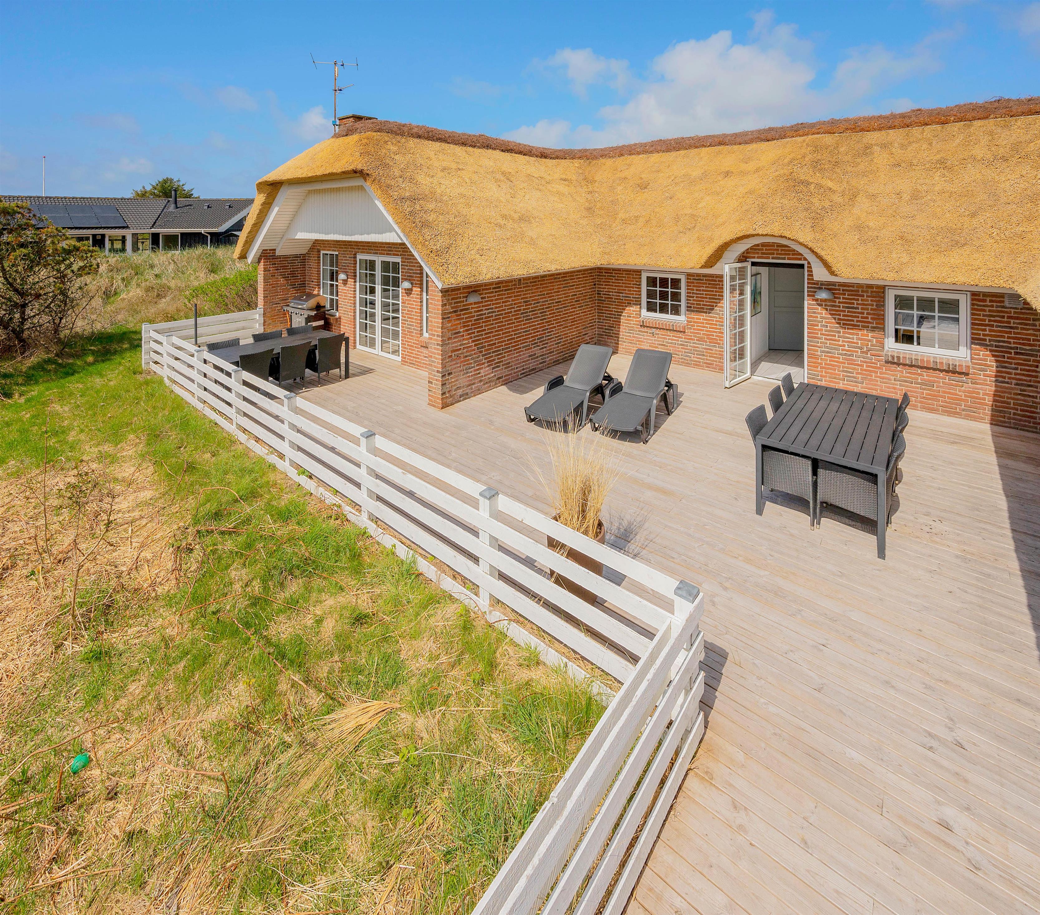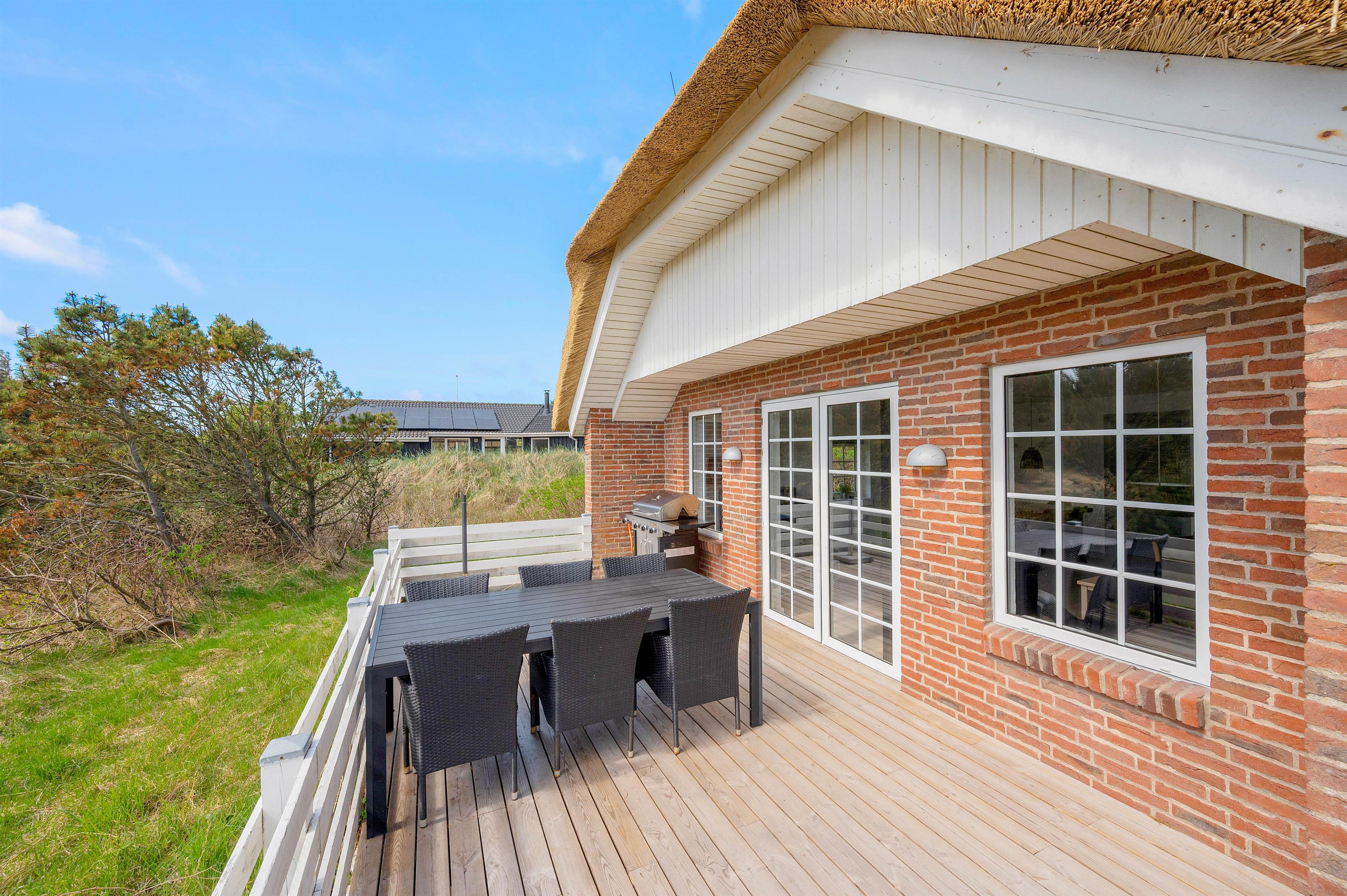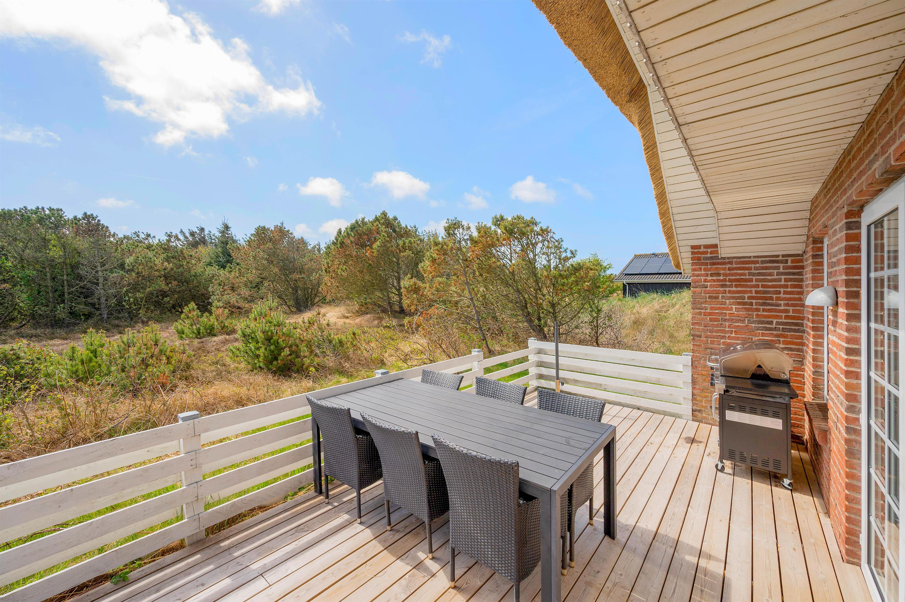 Fra stuen er der adgang til husets terrasse. Sommerhusets udendørs område er lige så imponerende som indendørs faciliteterne. Den lukkede og afskærmede terrasse er ideel til hyggelige stunder med god mad tilberedt på grillen og total afslapning i komfortable havemøbler. Der er også en gynge til de yngste medlemmer, som kan lege og more sig her. Beliggenheden er perfekt med kun 900 meter til det brusende Vesterhav og cirka 1800 meter til de nærmeste indkøbsmuligheder