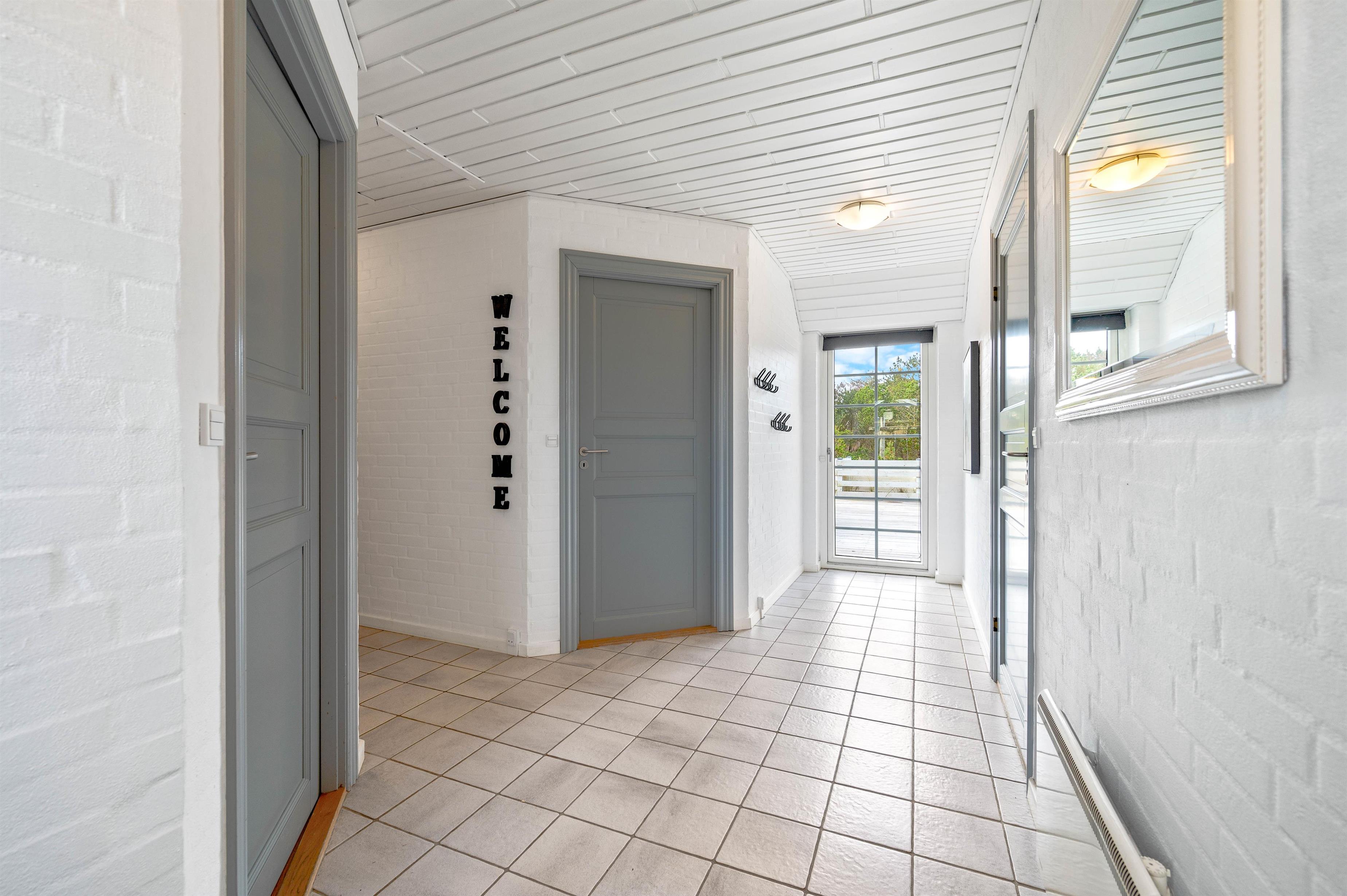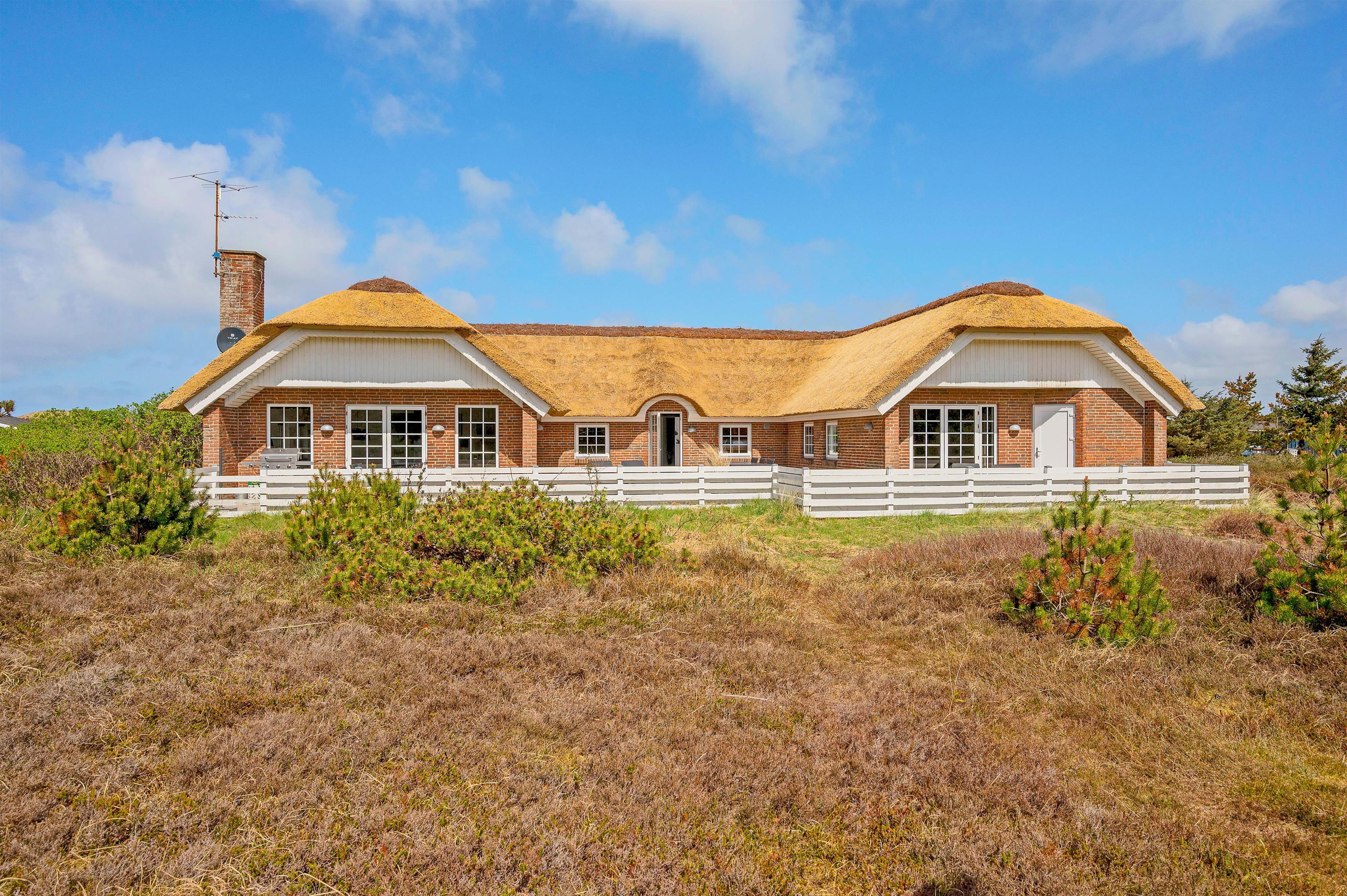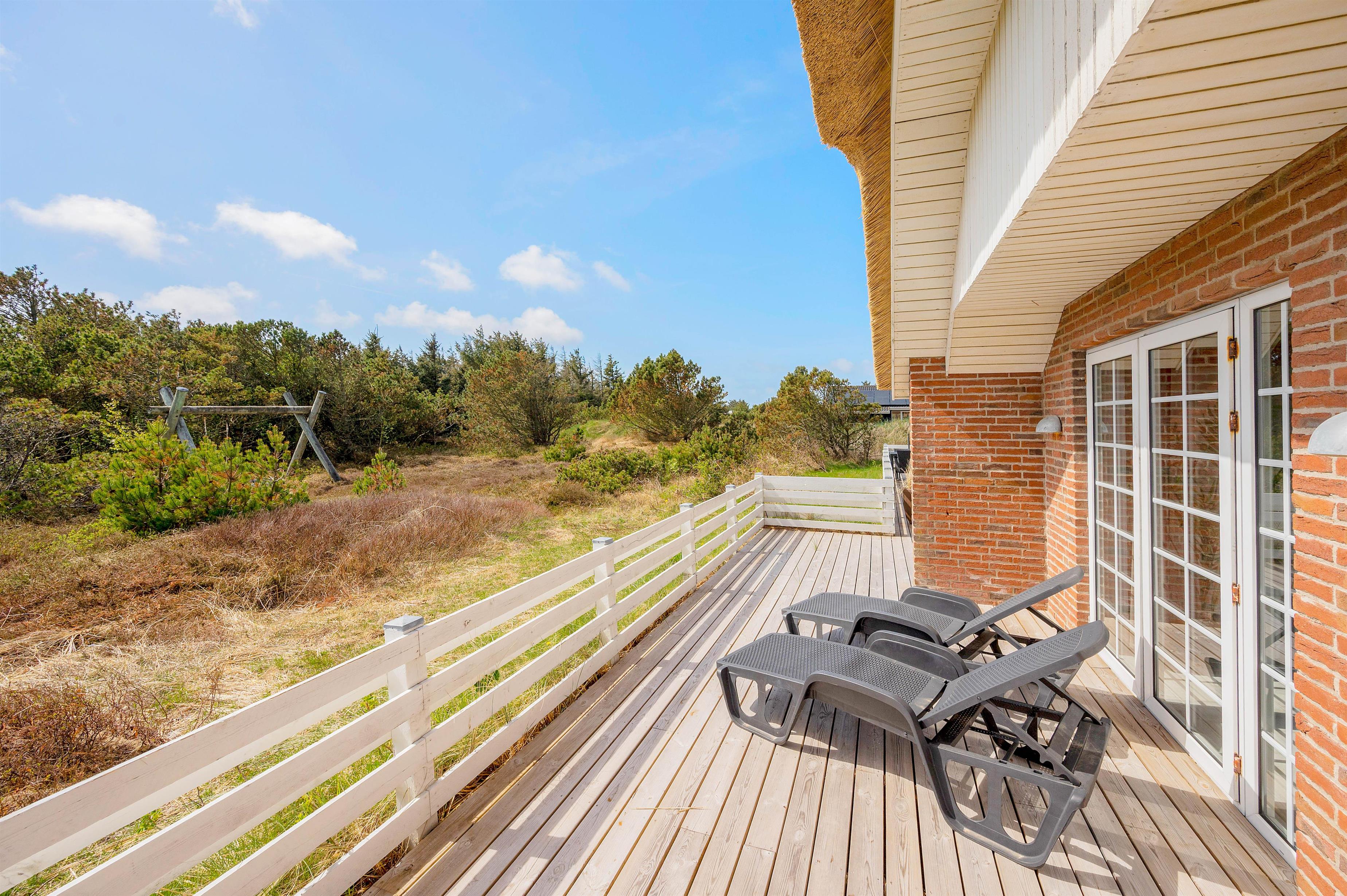 Fra stuen er der adgang til husets terrasse. Sommerhusets udendørs område er lige så imponerende som indendørs faciliteterne. Den lukkede og afskærmede terrasse er ideel til hyggelige stunder med god mad tilberedt på grillen og total afslapning i komfortable havemøbler. Der er også en gynge til de yngste medlemmer, som kan lege og more sig her. Beliggenheden er perfekt med kun 900 meter til det brusende Vesterhav og cirka 1800 meter til de nærmeste indkøbsmuligheder