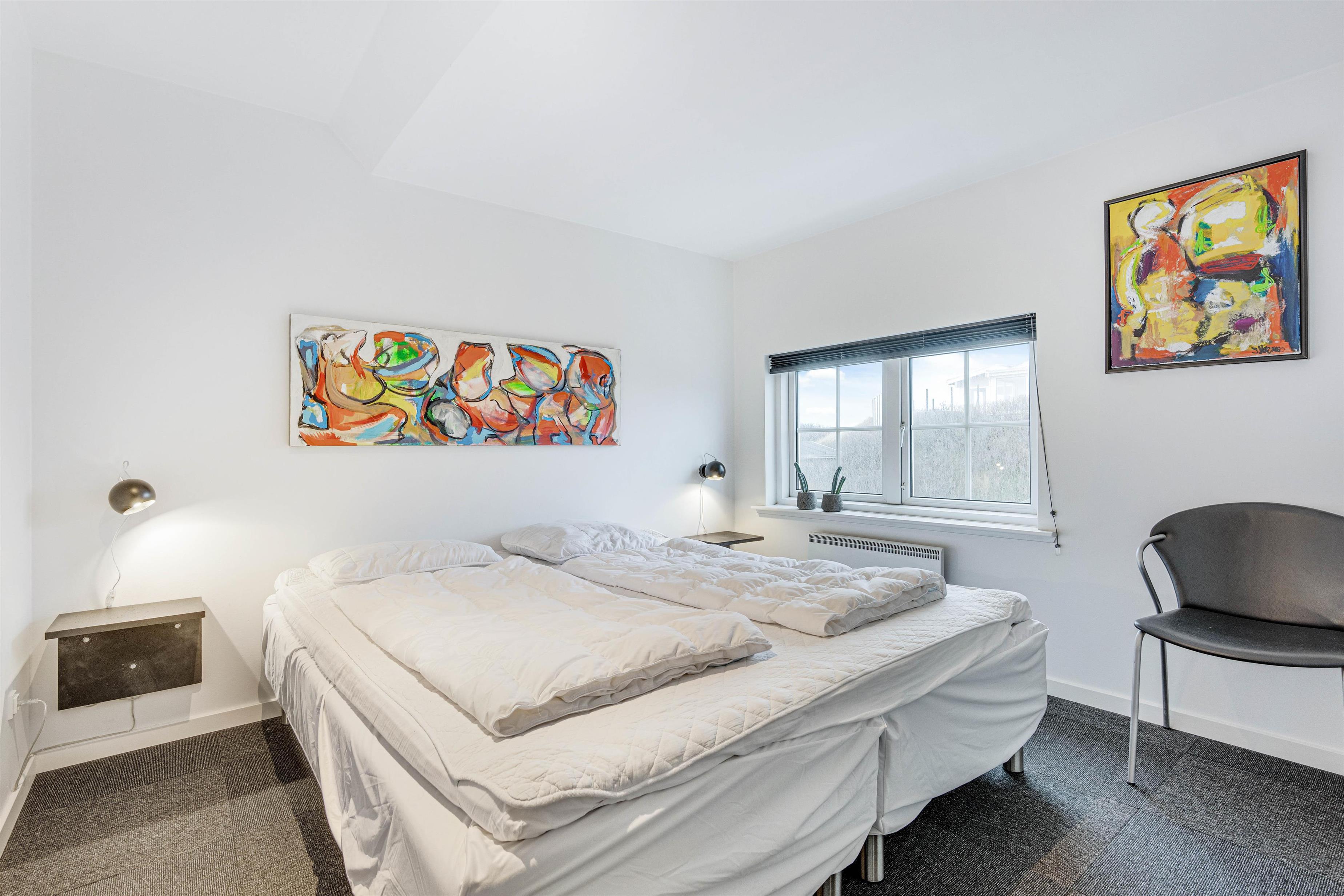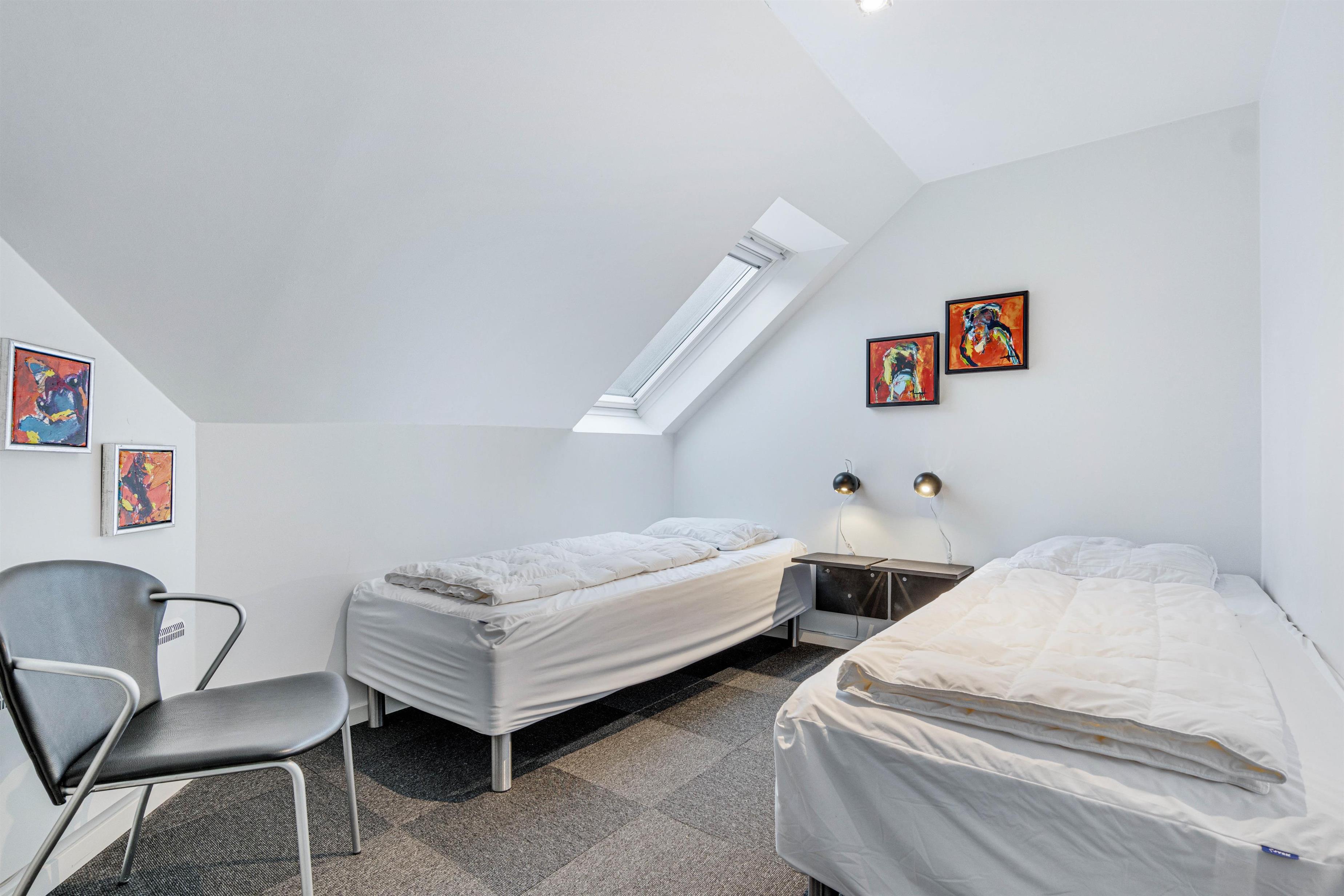 På første sal ligger soveværelserne i form af to soverum; det ene med dobbeltsenge, det andet med to enkelt senge. Der er både opvaskemaskine, vaskemaskine og tørretumbler i ferieboligen.
