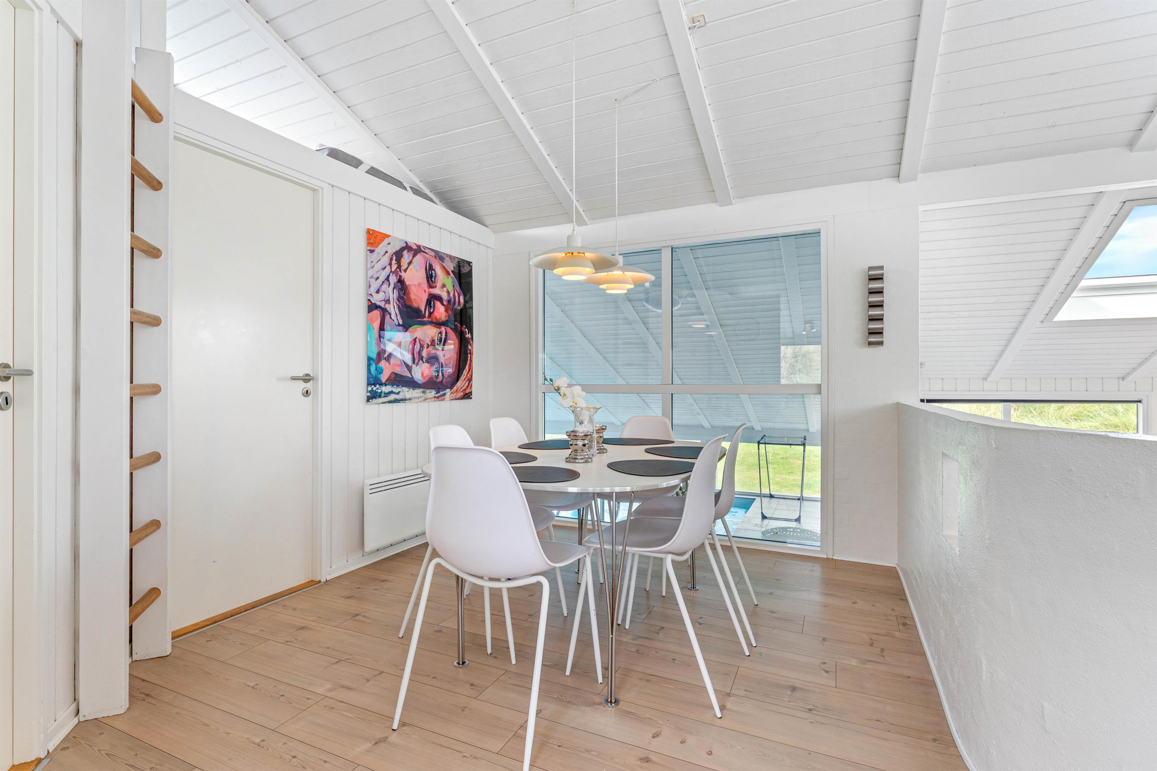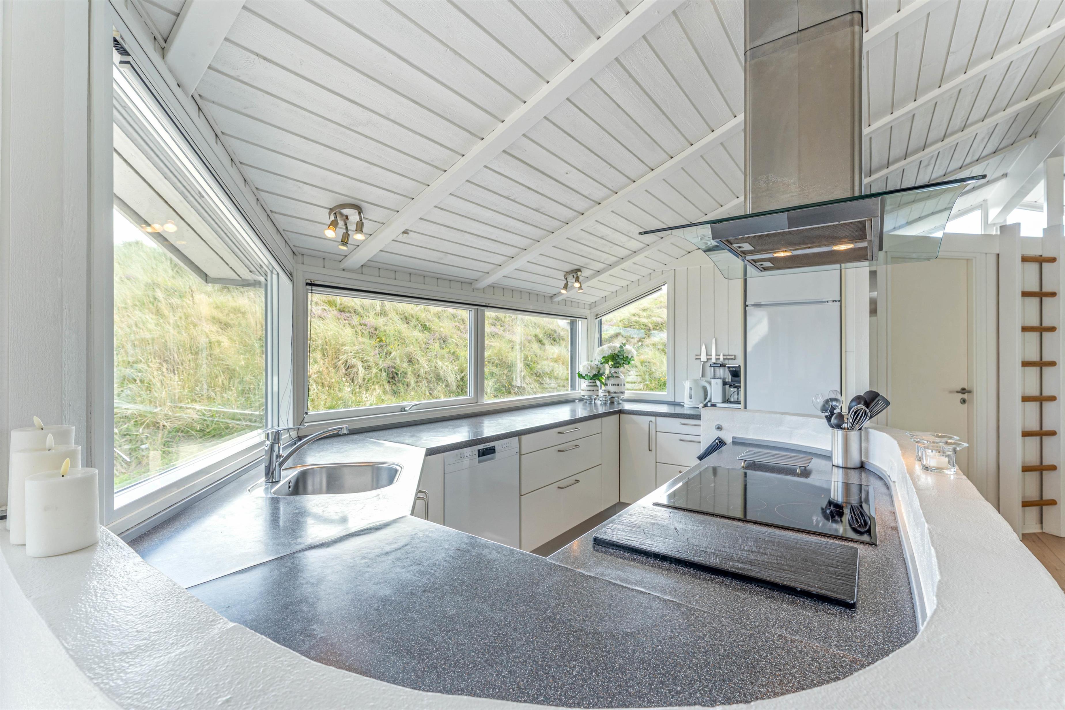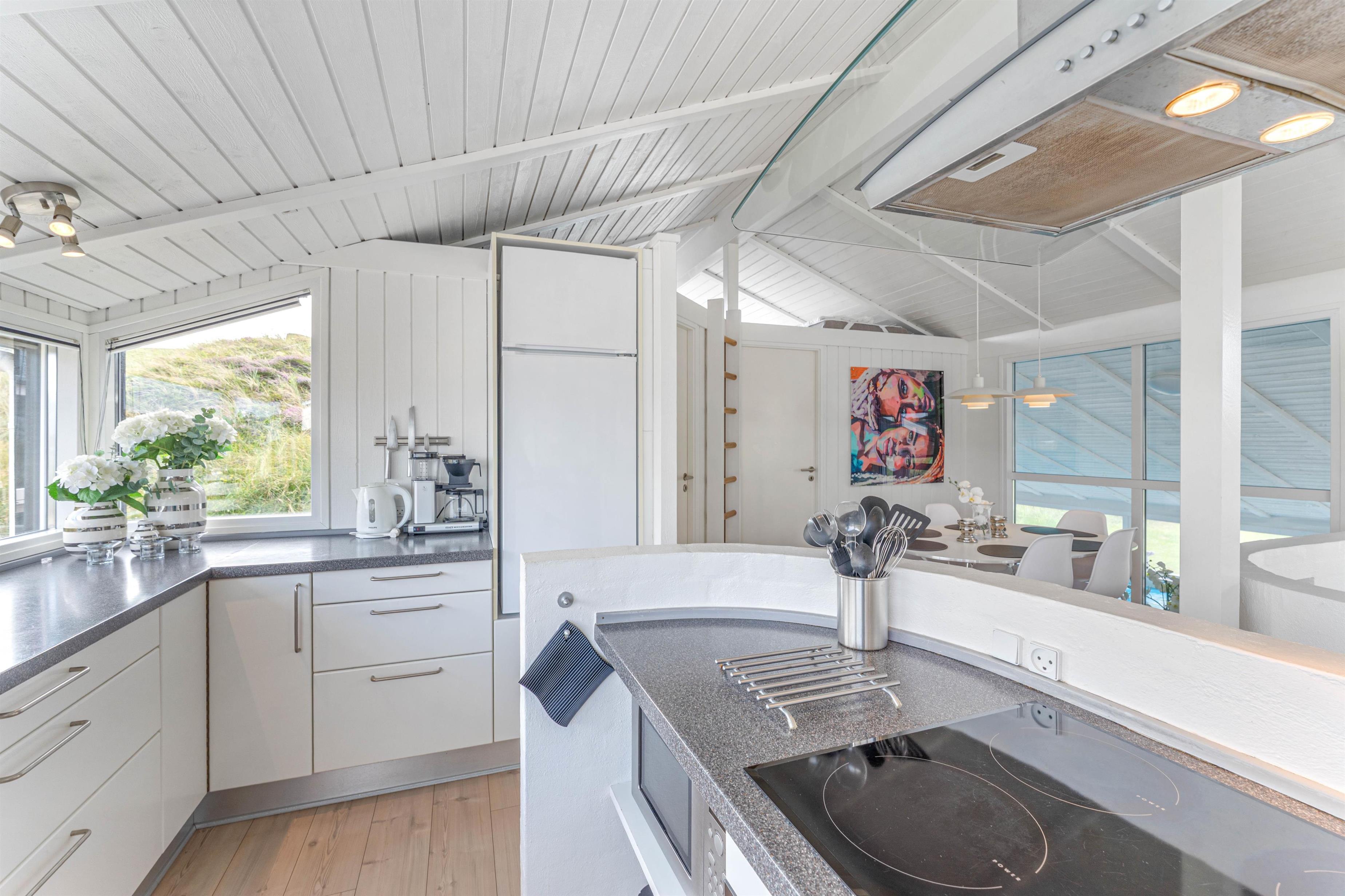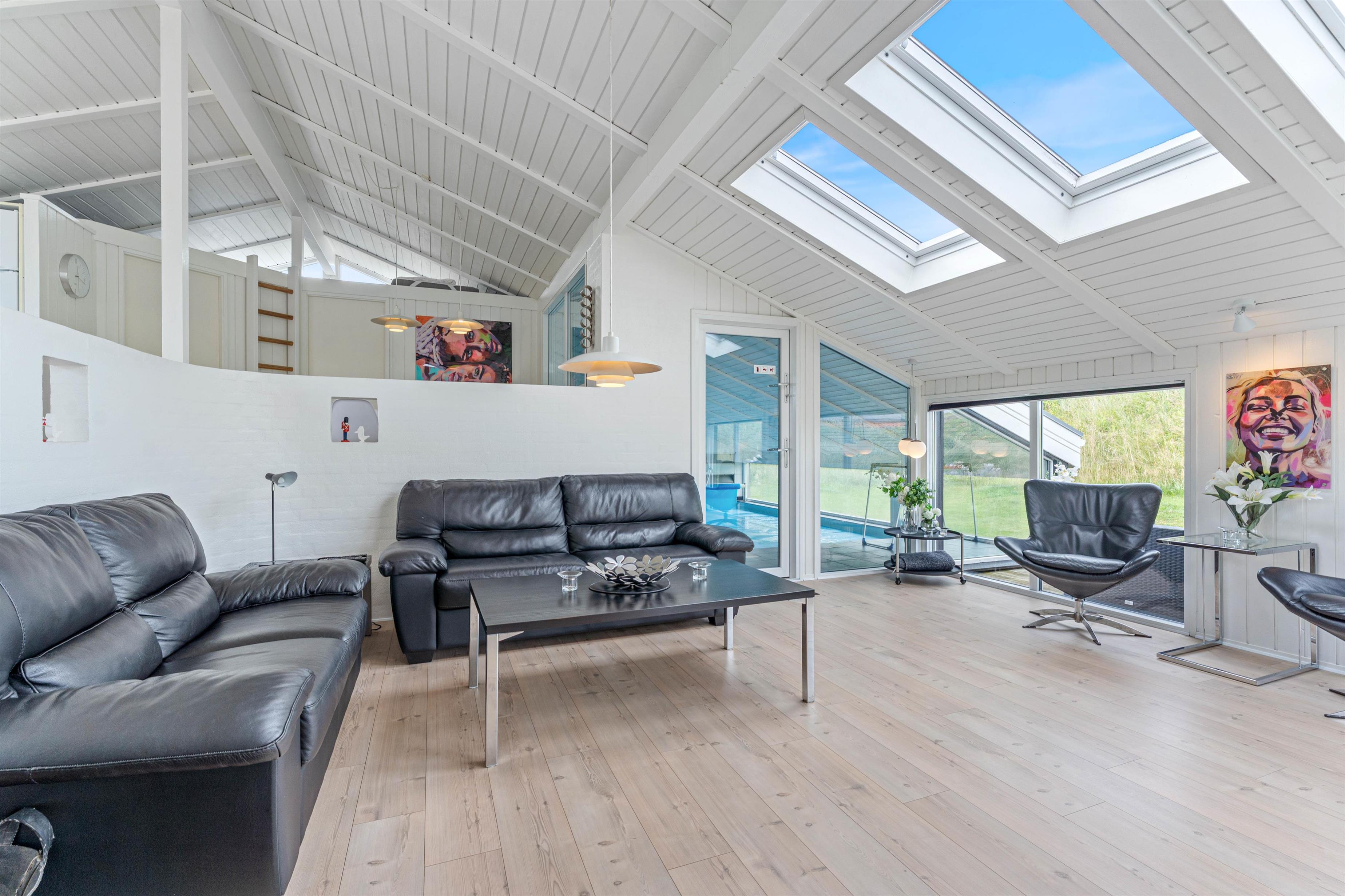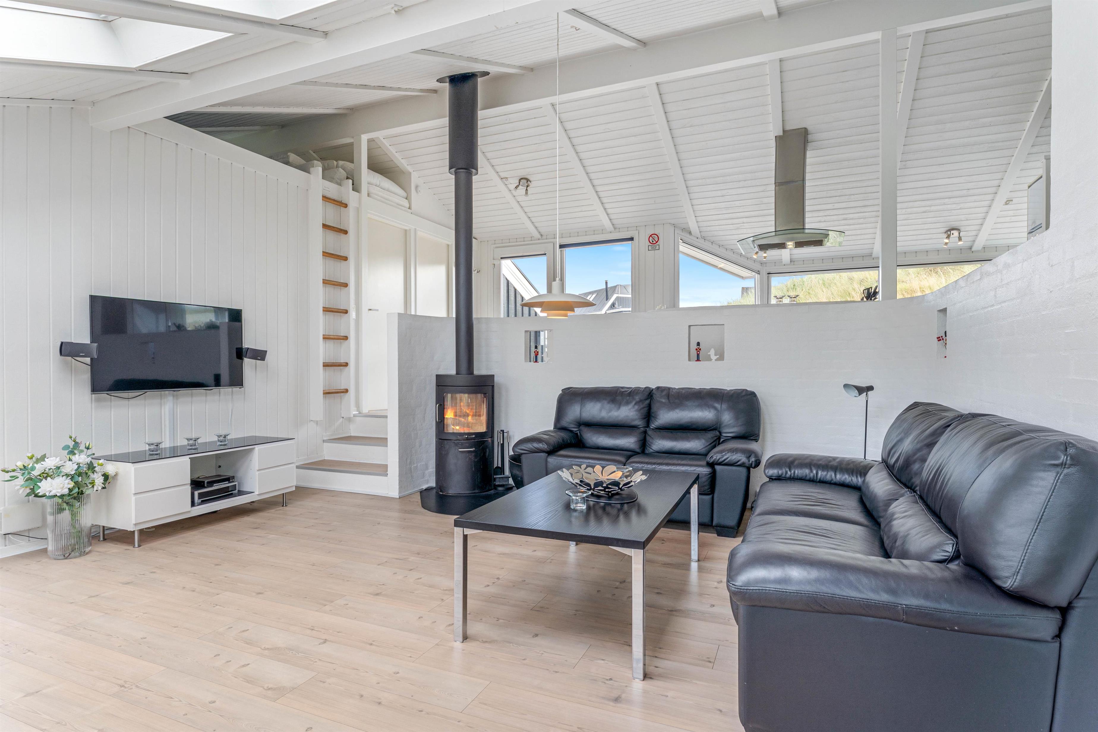 Takket være det åbne opholdskoncept og de mange vinduer er dette feriehus gennemstrømmet af lys. Det er en oplevelse at lave mad i dette køkken, da du samtidig kan have kvalitetstid med dine medmennesker. Hele familien vil elske at spille spil i spiseområdet og læse en god bog foran pejsen. Børnene kan hygge sig i poolen, og efterfølgende blive varmet igennem i saunaen.