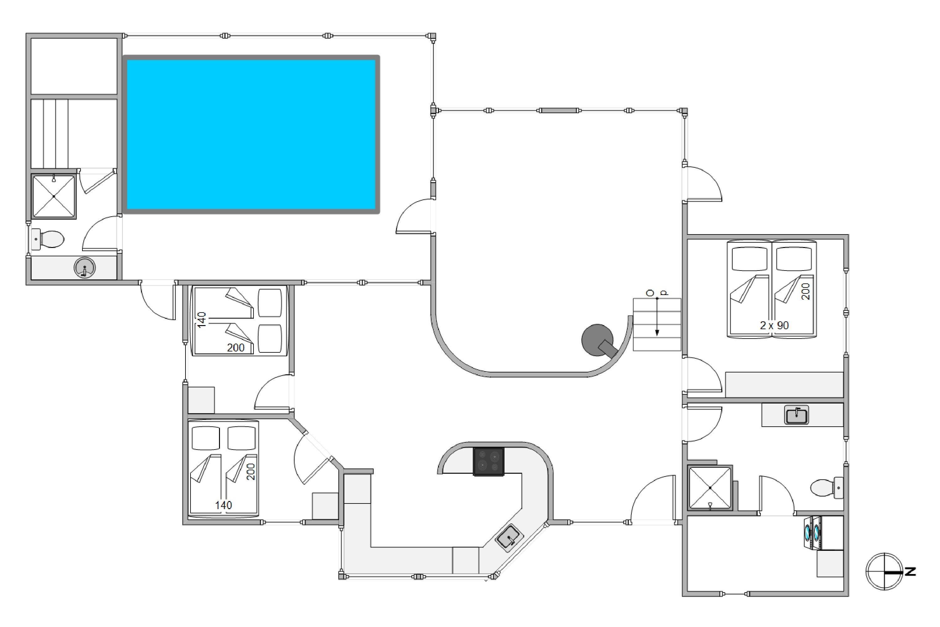 I det 131 m2 store feriehus er der et åbent opholds- og spiseområde, et åbent køkken, et gæstetoilet, et badeværelse, tre soveværelser, en hems og et poolområde. Både køkkenet, poolrummet og de to badeværelser er udstyret med gulvvarme, som sørger for behagelige varme fødder uanset årstiden. Opvarmningen kommer fra elvarmen, som befinder sig i alle rum.