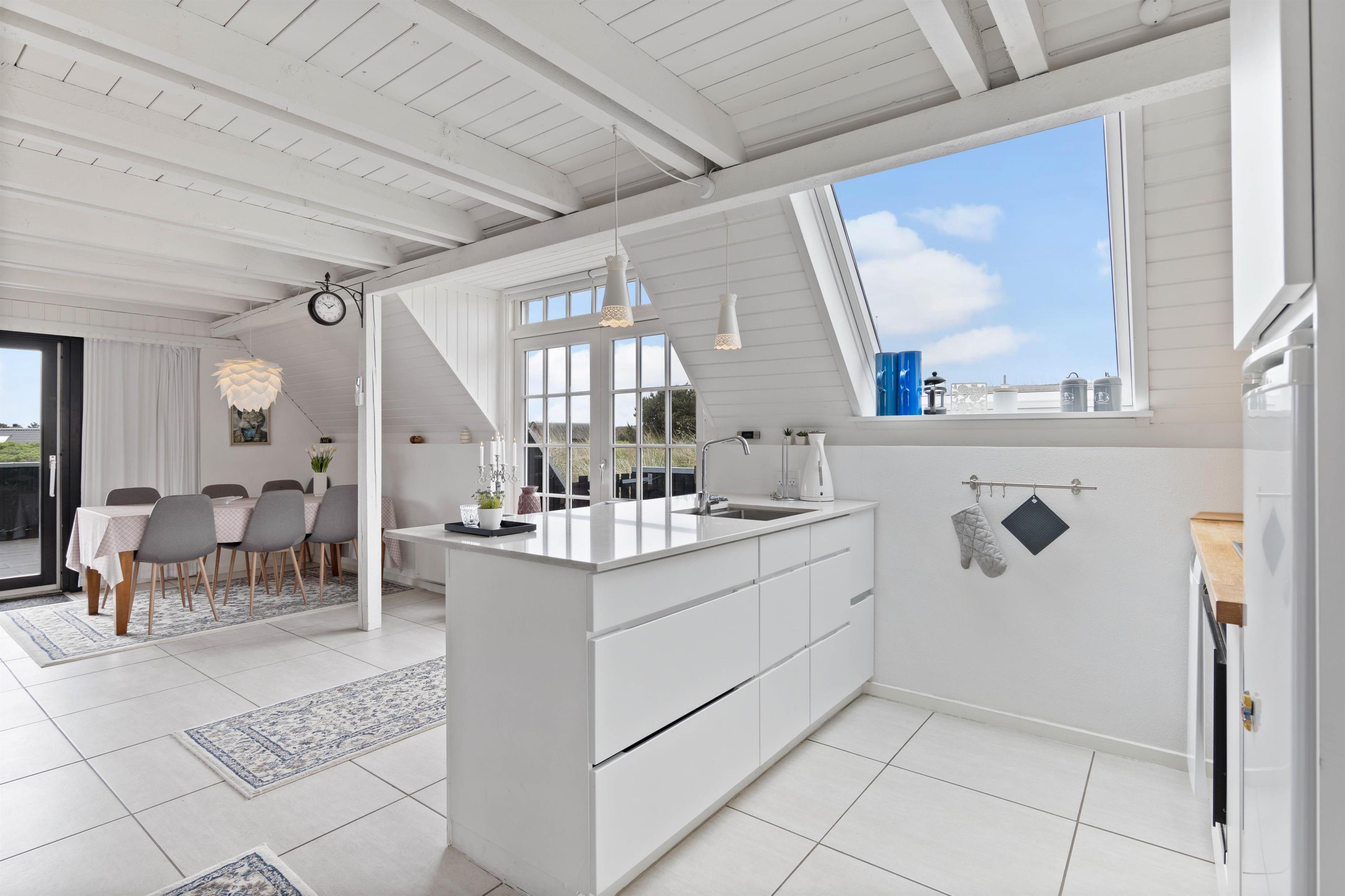 Det kombinerede køkkenal- og stuerum fungerer som husets hjerte, og brændeovnen i midten af rummet sørger for dejlig varme og en hyggelig ferieatmosfære med dens knitrende flammer hele året rundt. Hvis I dog ønsker en mere bæredygtig og økonomisk løsning til at varme huset op, så kan i også bruge husets varmepumpe, der kan sørge for et behagelig temperatur året rundt. De mange vinduer og de hvidmalede vægge- og lofter, sørger for et virkelig lyst og rart opholdsrum, hvor I virkelig kan have nogle hyggelige stunder.