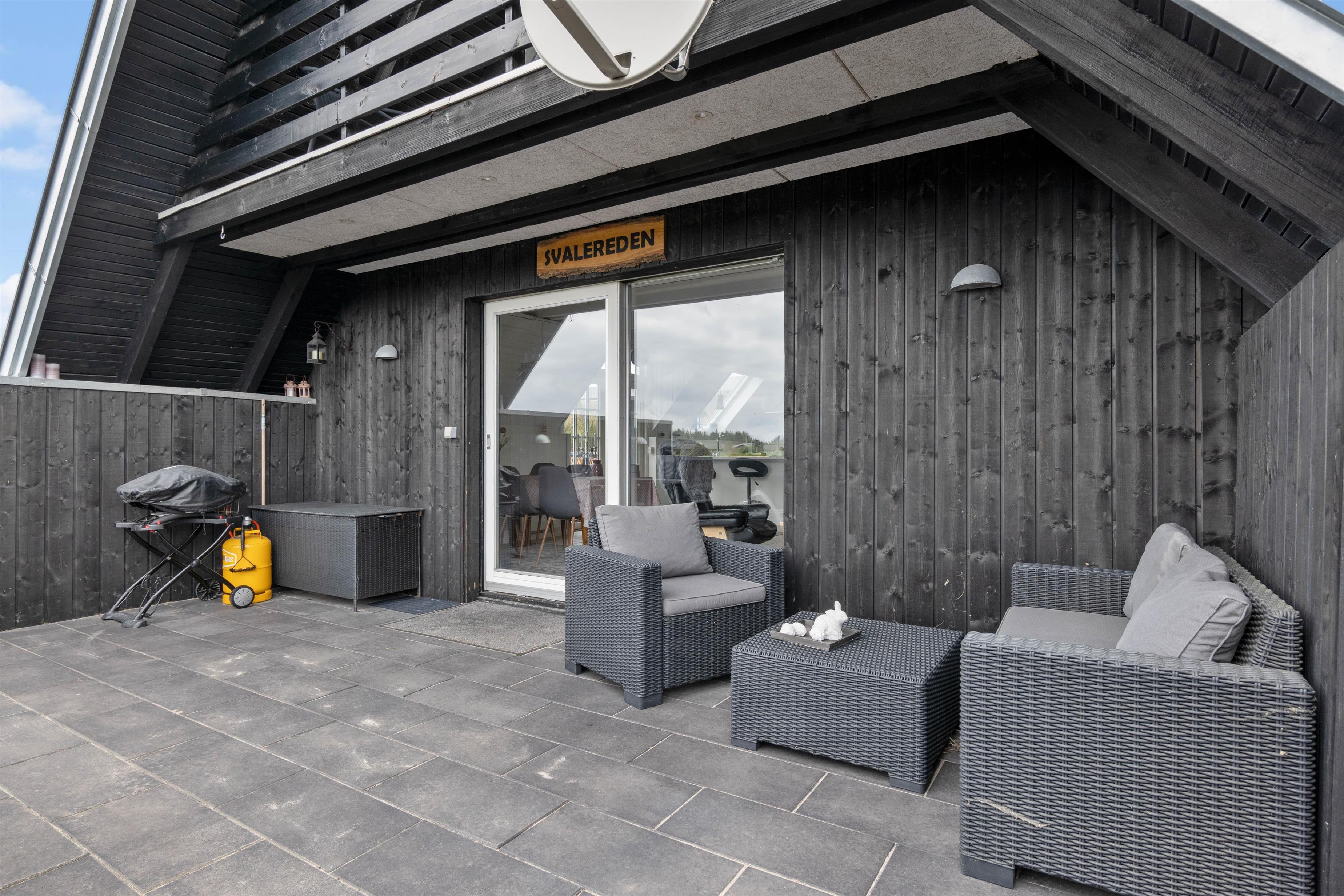 På de gode solskinsdage er det oplagt at rykke feriehyggen ud på terrassen, som er delvist overdækket og afskærmet. Her kan I rigtig slappe af i sommervarmen, mens I betragter den grønne natur og det stemningsfyldte ferieland.