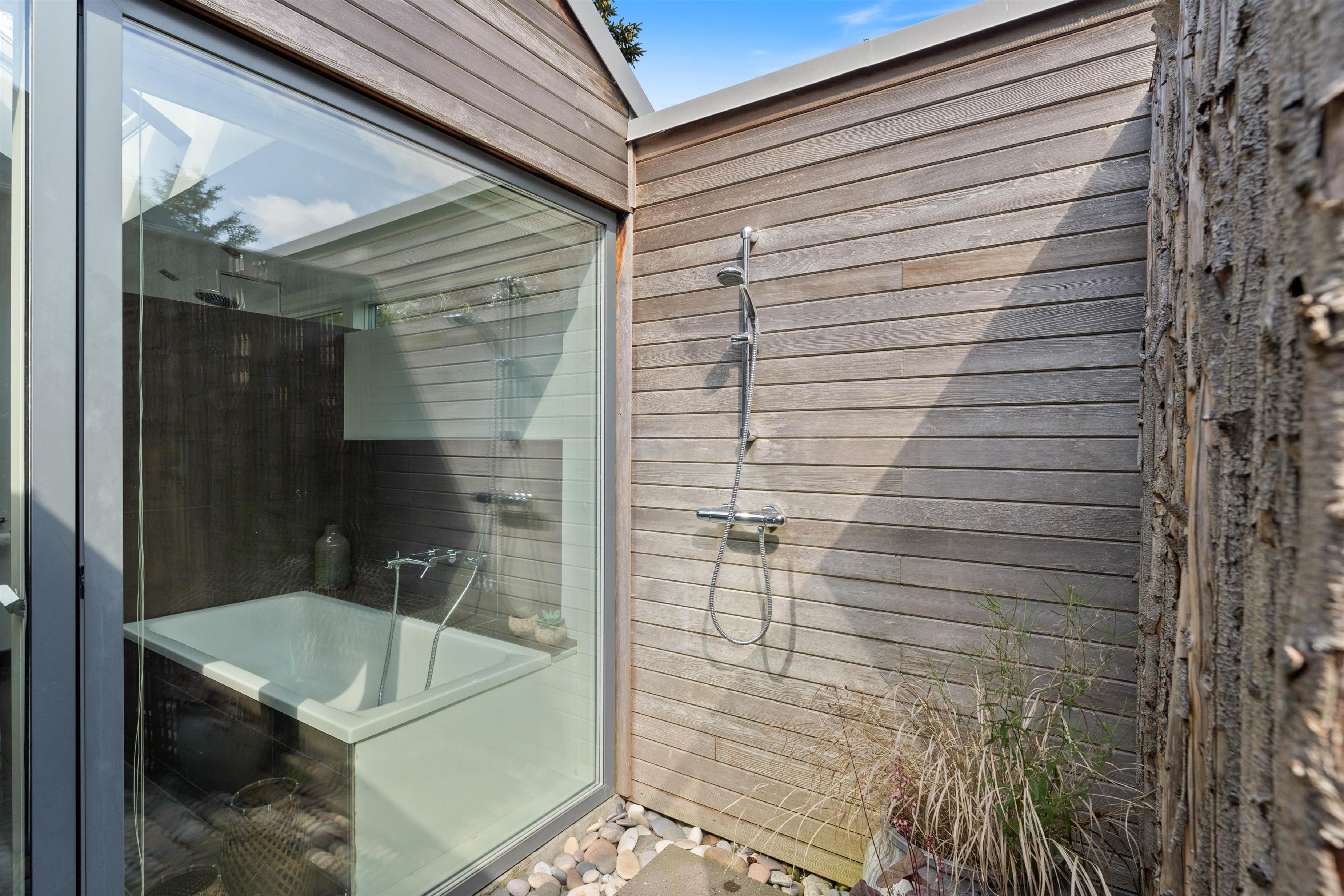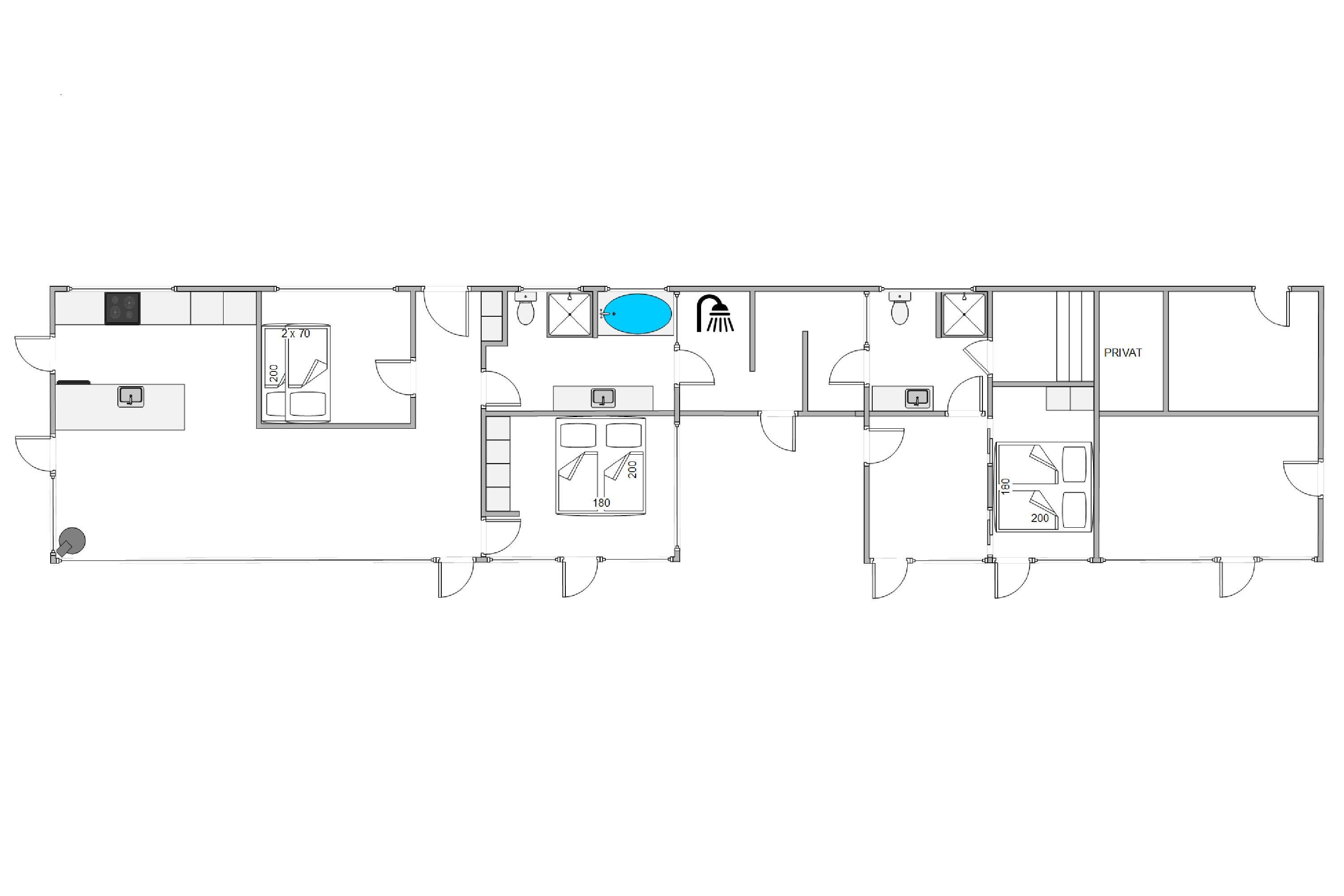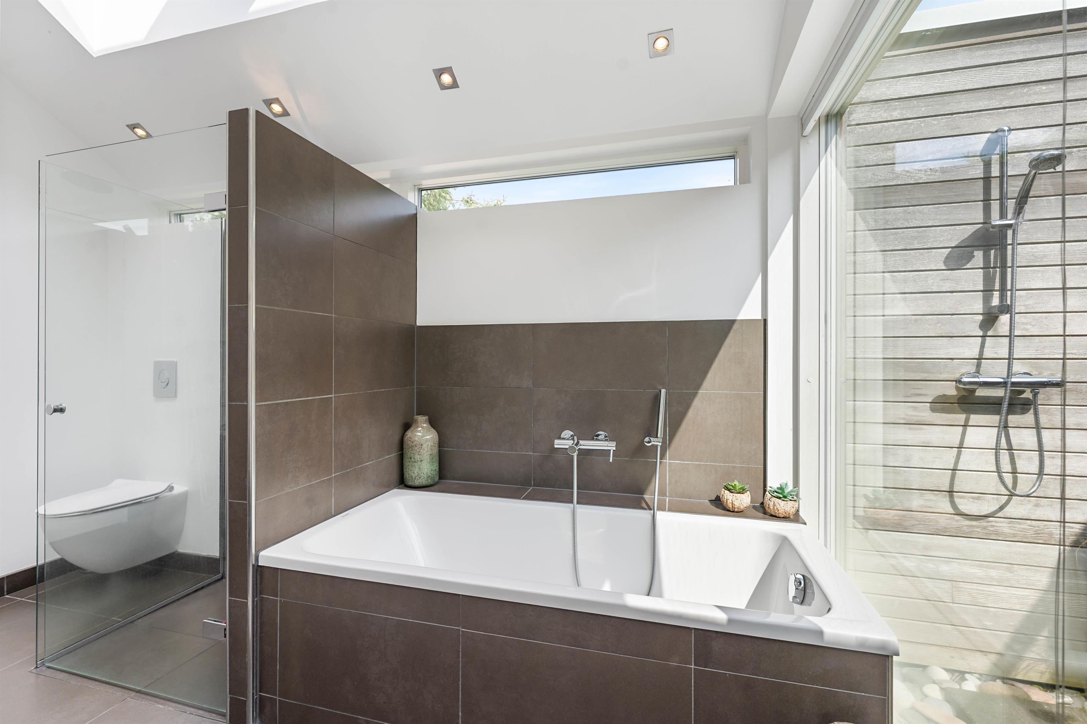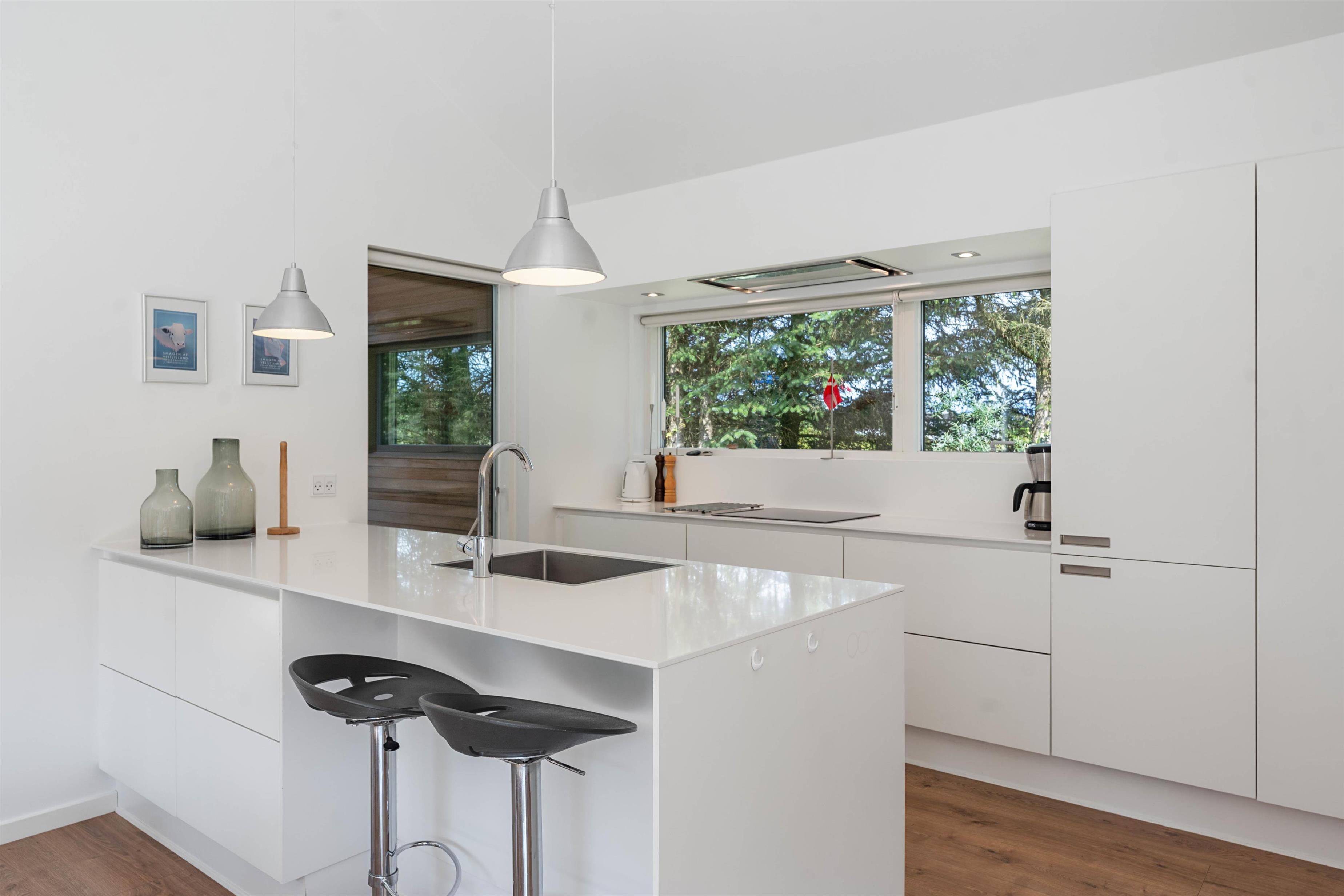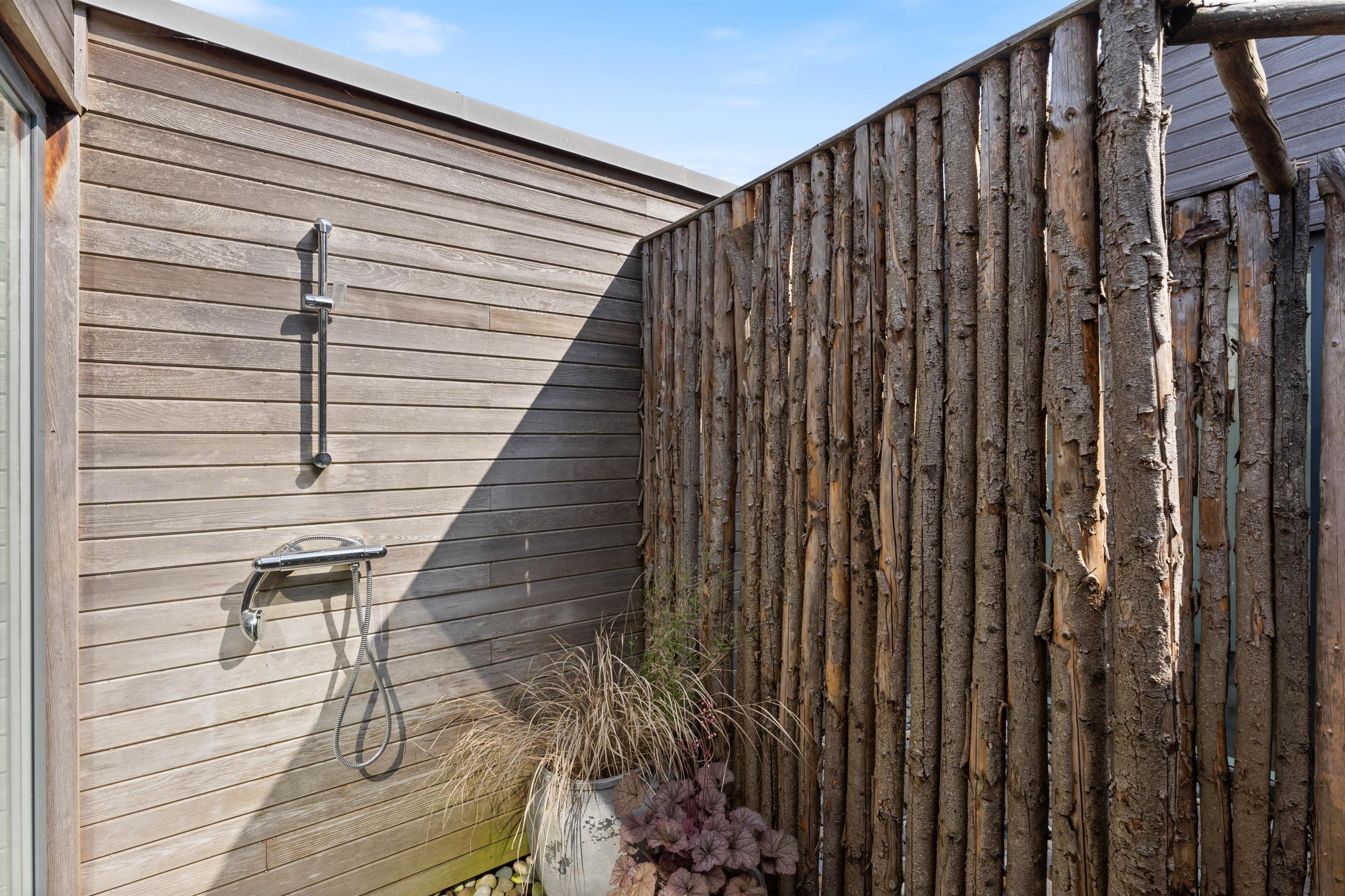 Køkkenet er velindrettet, og det er de 2 badeværelser også. På det ene badeværelse er der også en sauna. Det andet badeværelse kan også byde på lidt ekstra afslapning, i form at et lækkert badekar. Alle rum har gulvvarme, og alle overflader er nemme at holde pæne og rene. Mellem de to afdelinger er der en udendørsbruser og dette område forbinder også de to afsnit af huset. Udebruseren vil ikke kunne benyttes fra november til april.