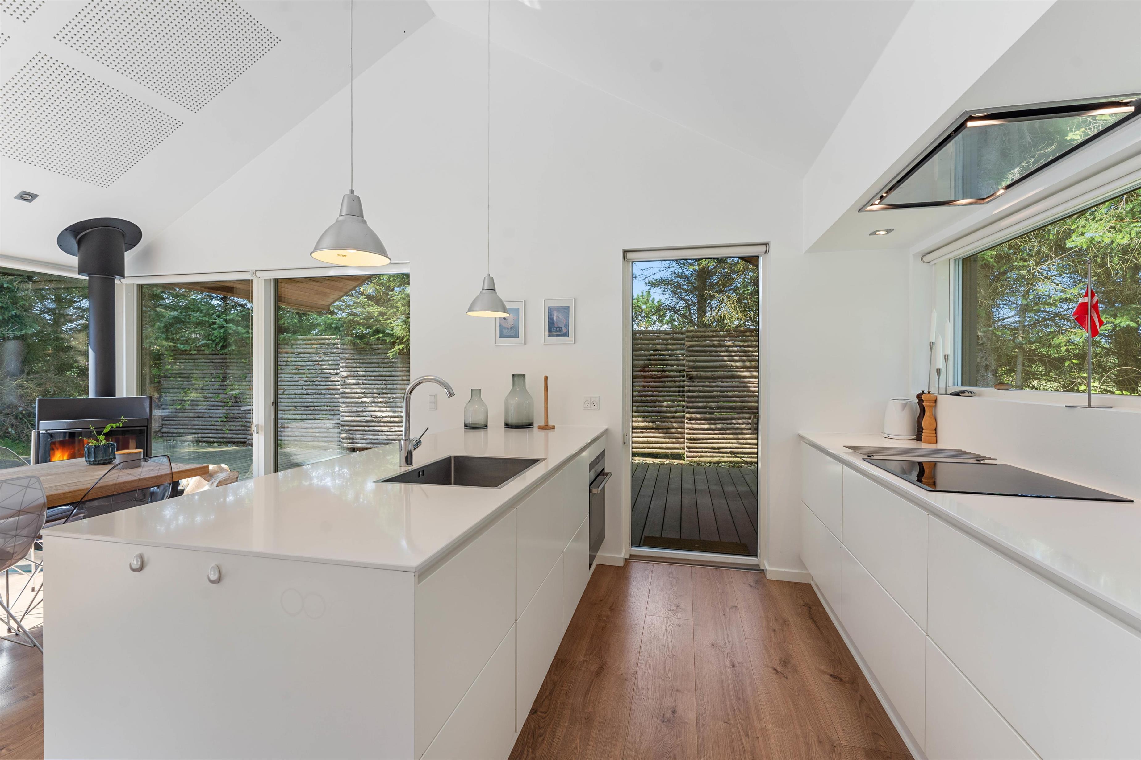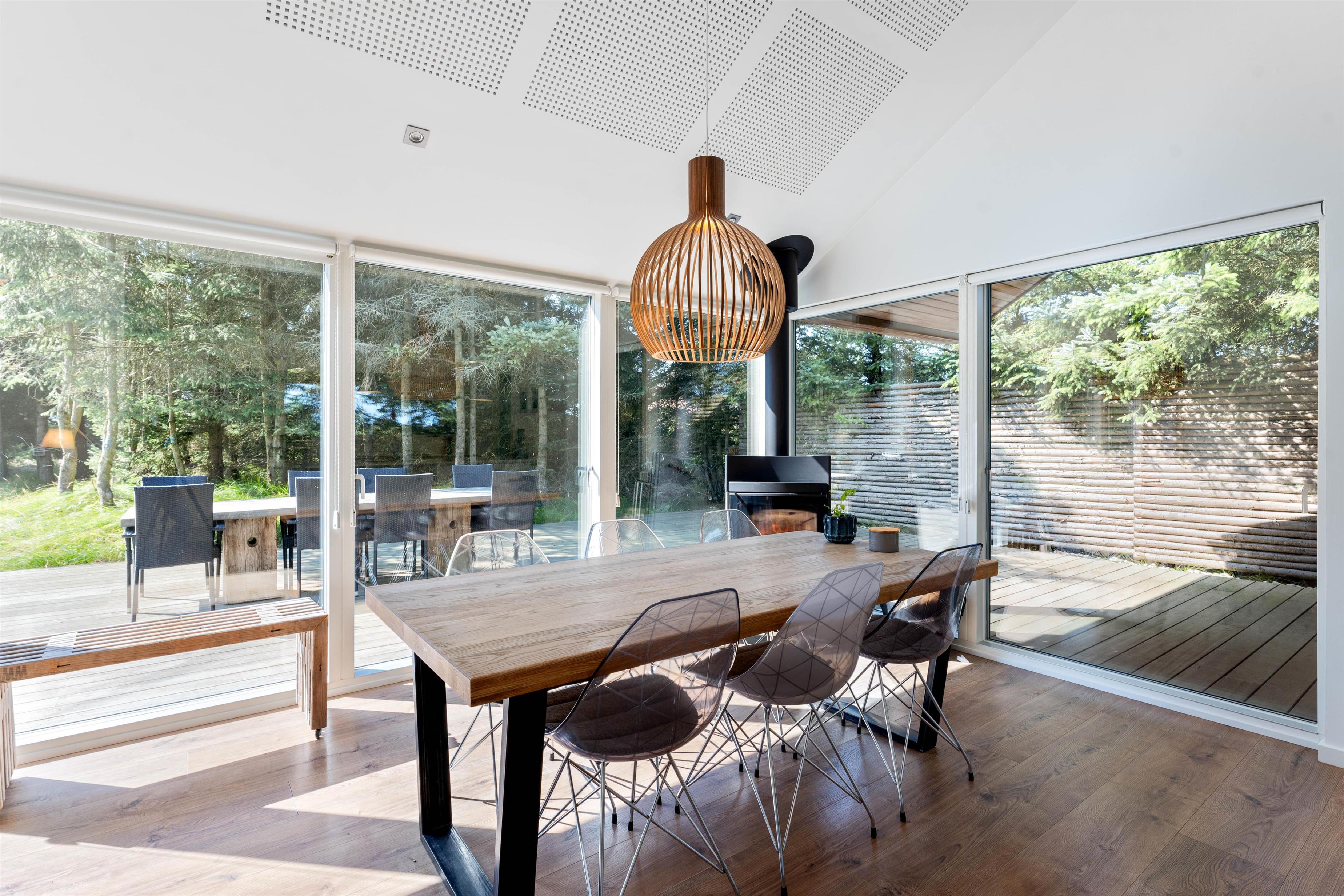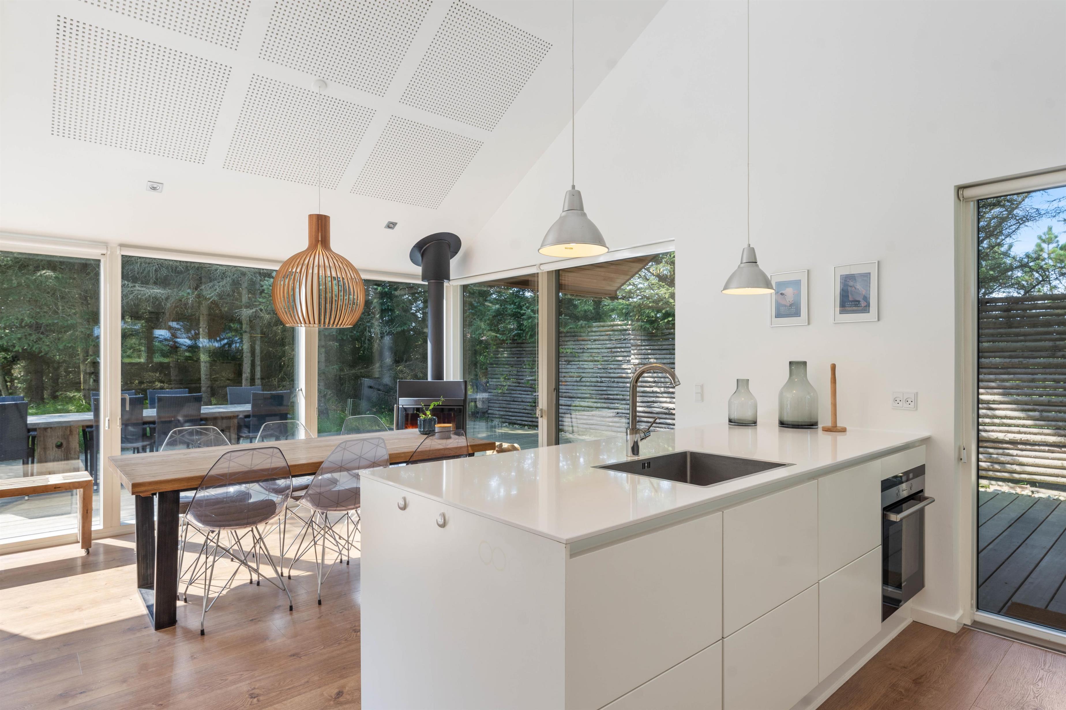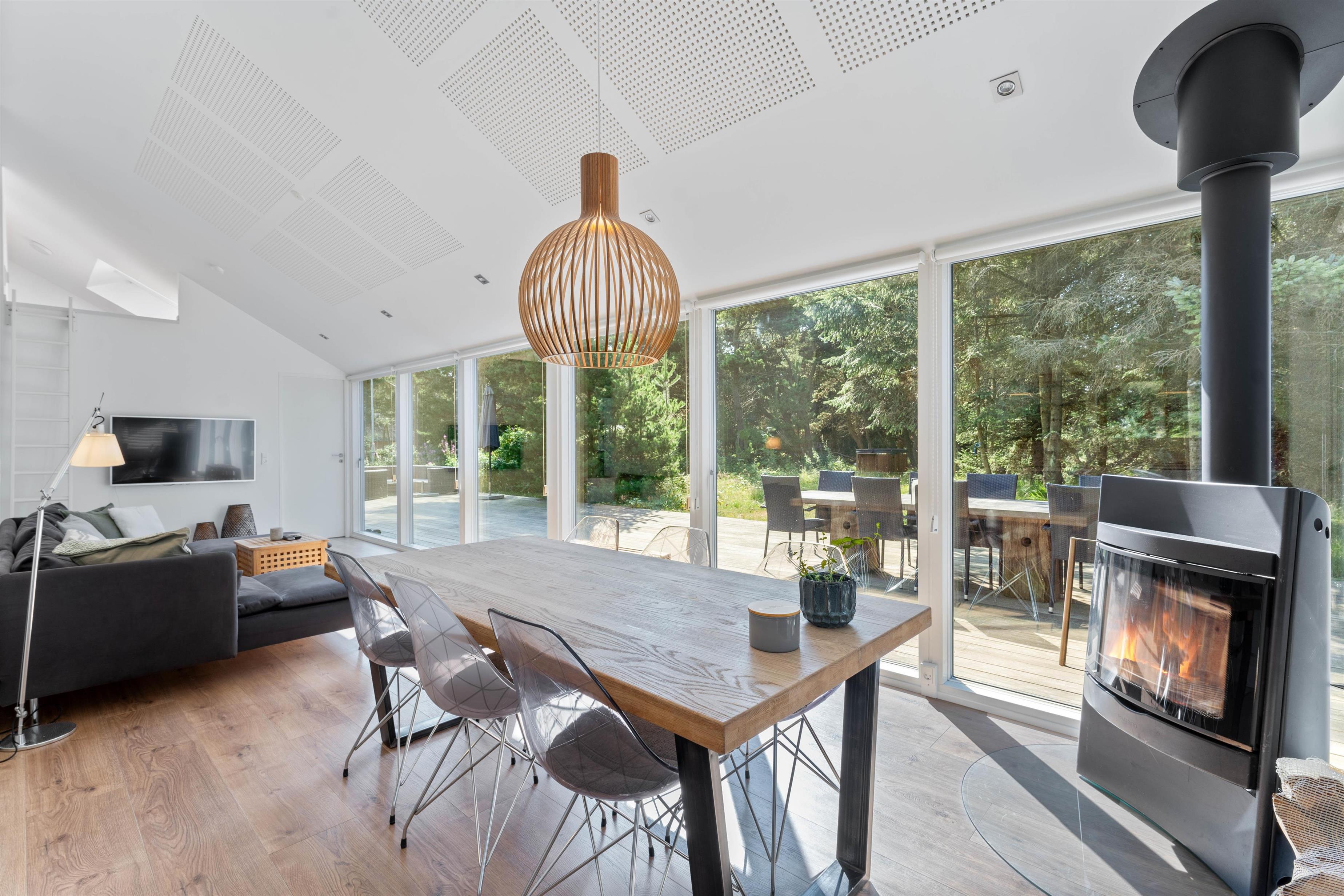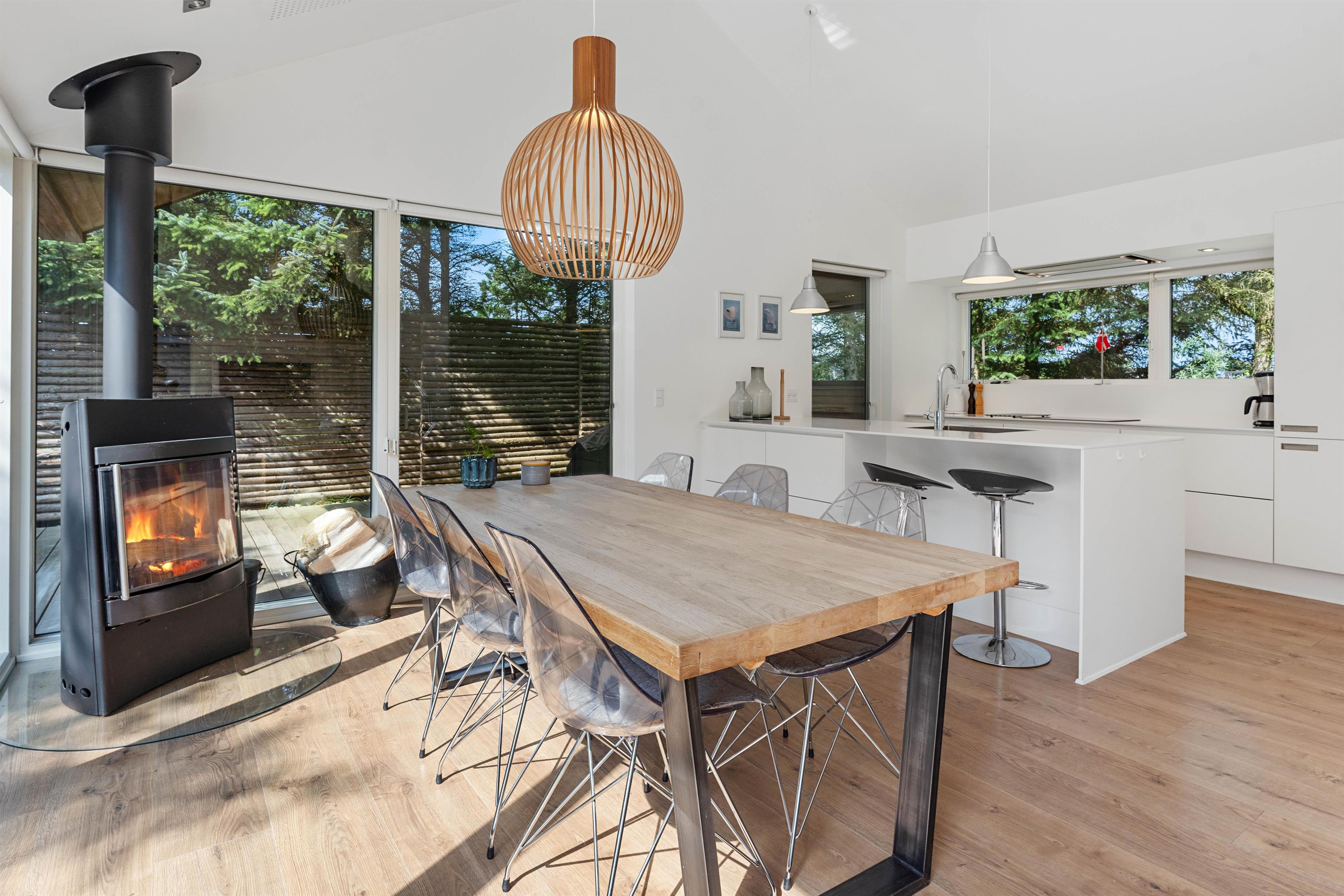 Hele familien kan hygge sig sammen i den vestlige del af huset, hvor I kan lave mad, spise og hygge jer foran brændeovnen. Er brændeovnen ikke i gang, bliver feriehuset varmet op af den meget energibesparende luft-til-vand varmepumpe, som sørger for at i har en behagelig varme hele året rundt.
