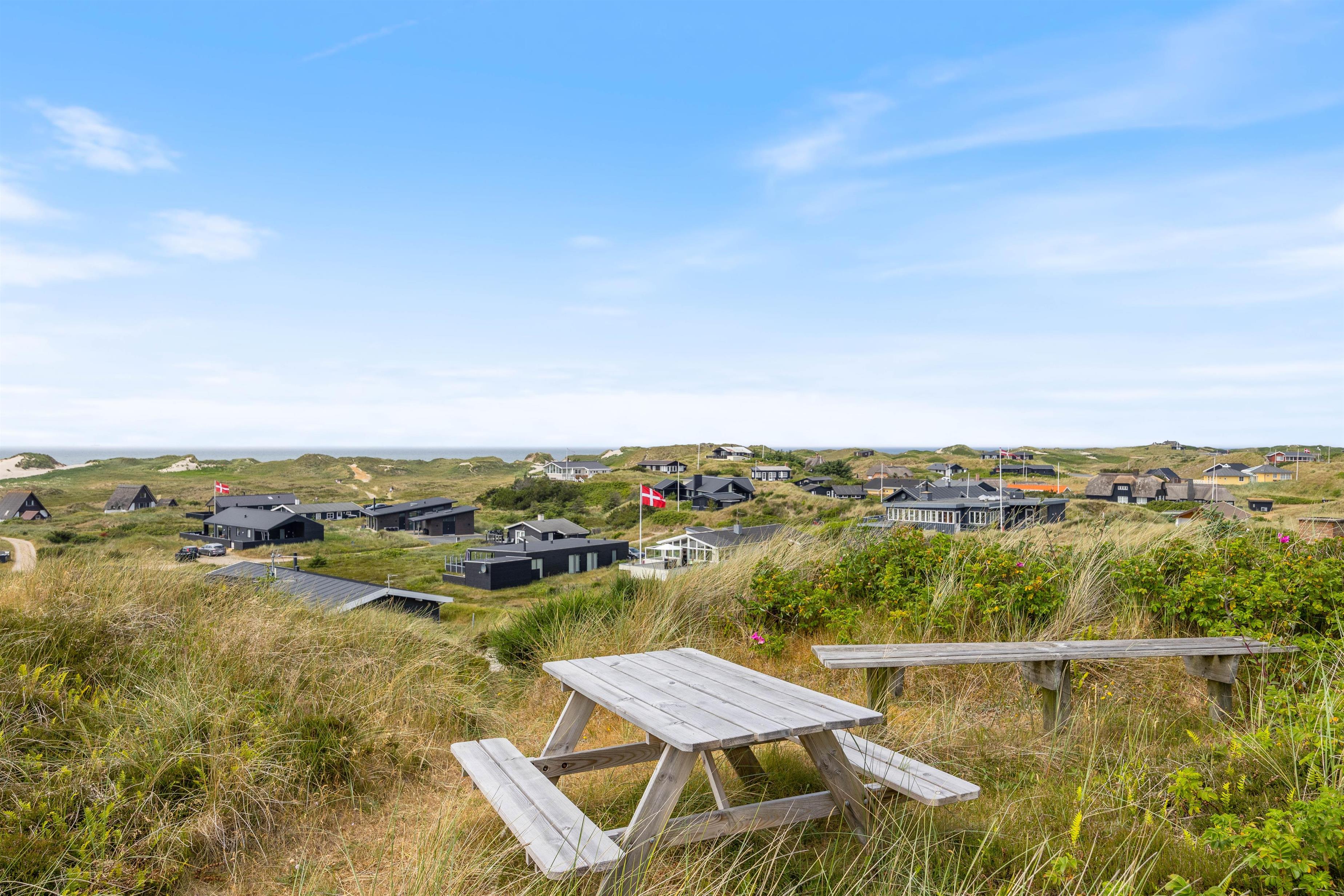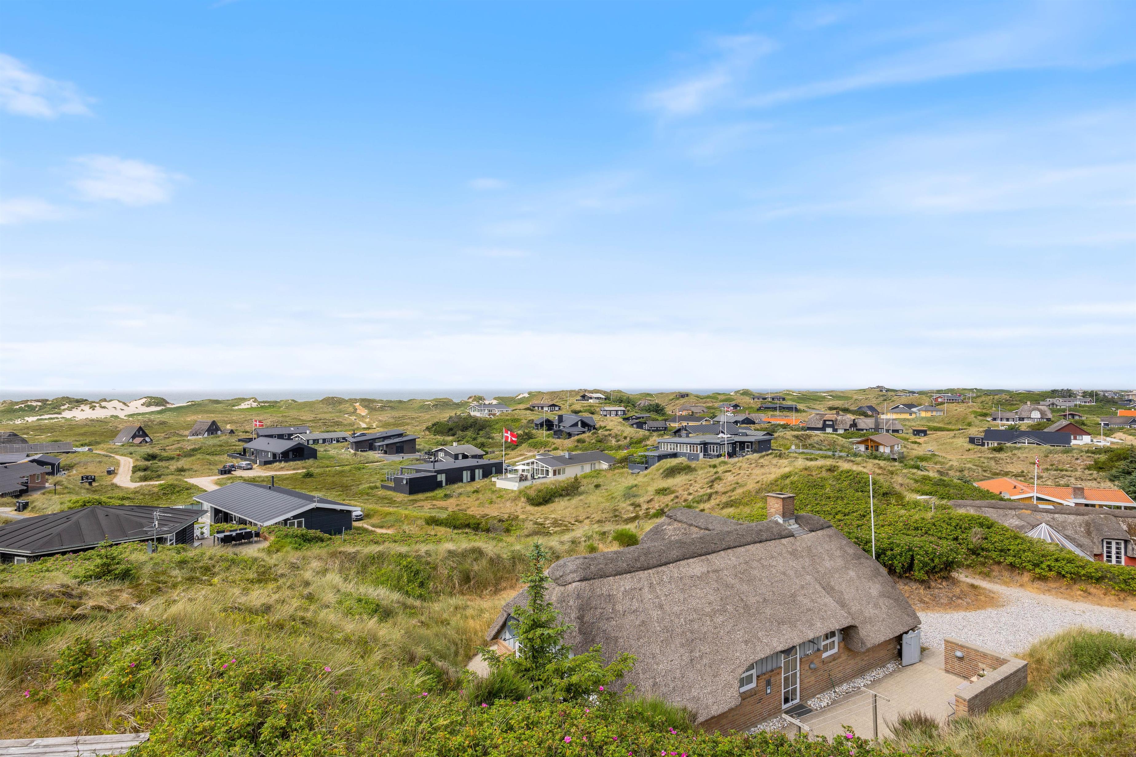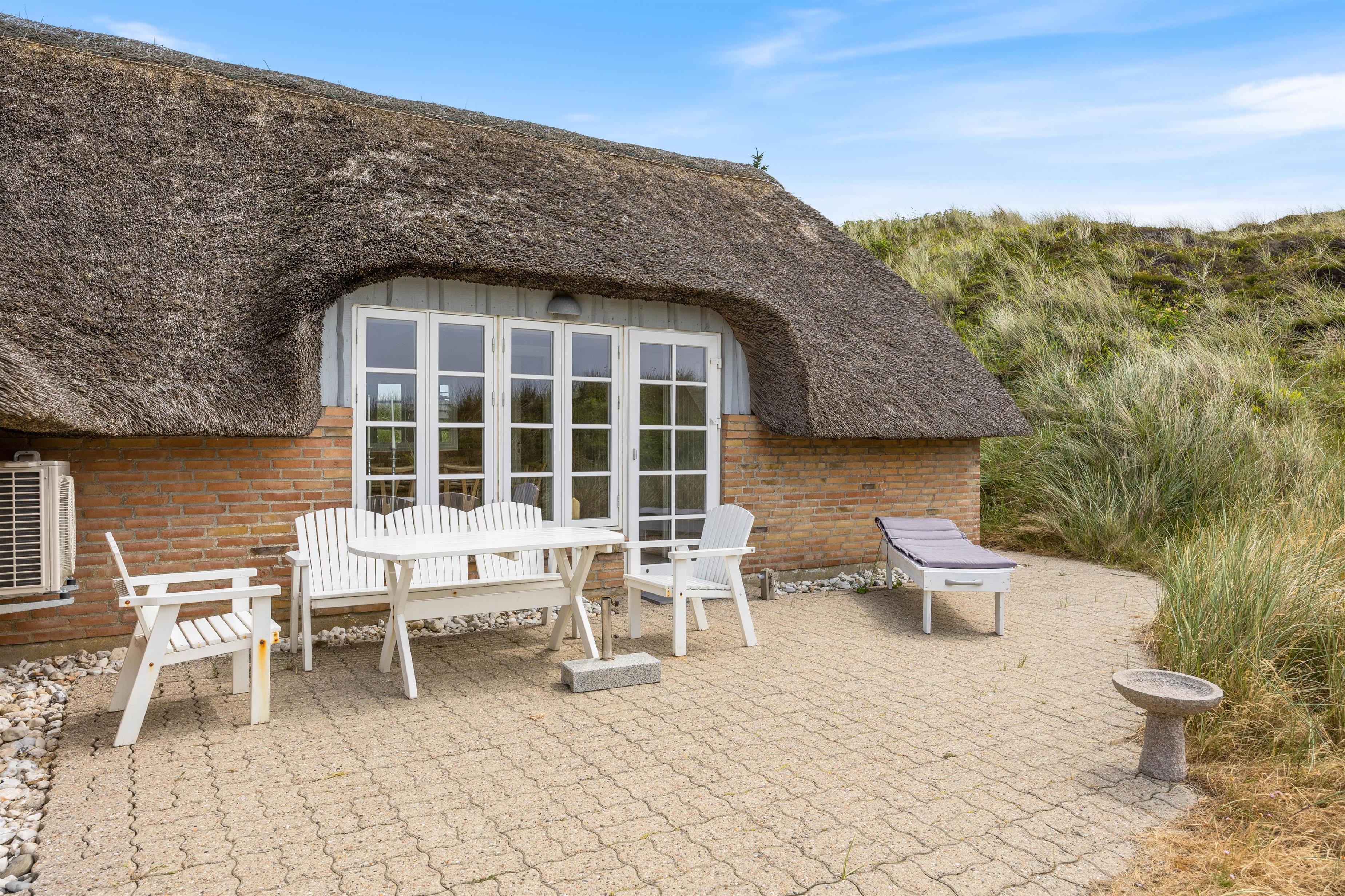 Feriehuset har utroligt flot udsigt over havet og klitterne, og den kan nydes i alt slags vejr, da udsigten ikke blot er fra husets terrasse, men også fra stuen og spisestuen. Ude imponerer feriehuset med sit flotte stråtag, der smelter sammen med det omkringliggende landskab, og på husets dejlige terrasse kan du smide dig på de tilhørende liggestole og nyde den fantastiske udsigt, alt imens du slapper af til lyden af havets brusen. Efter en dejlig grillaften på terrassen, kan I gå op på husets udsigtspunkt, hvor I på bænken kan se én af de mange imponerende solnedgange over Vesterhavet.