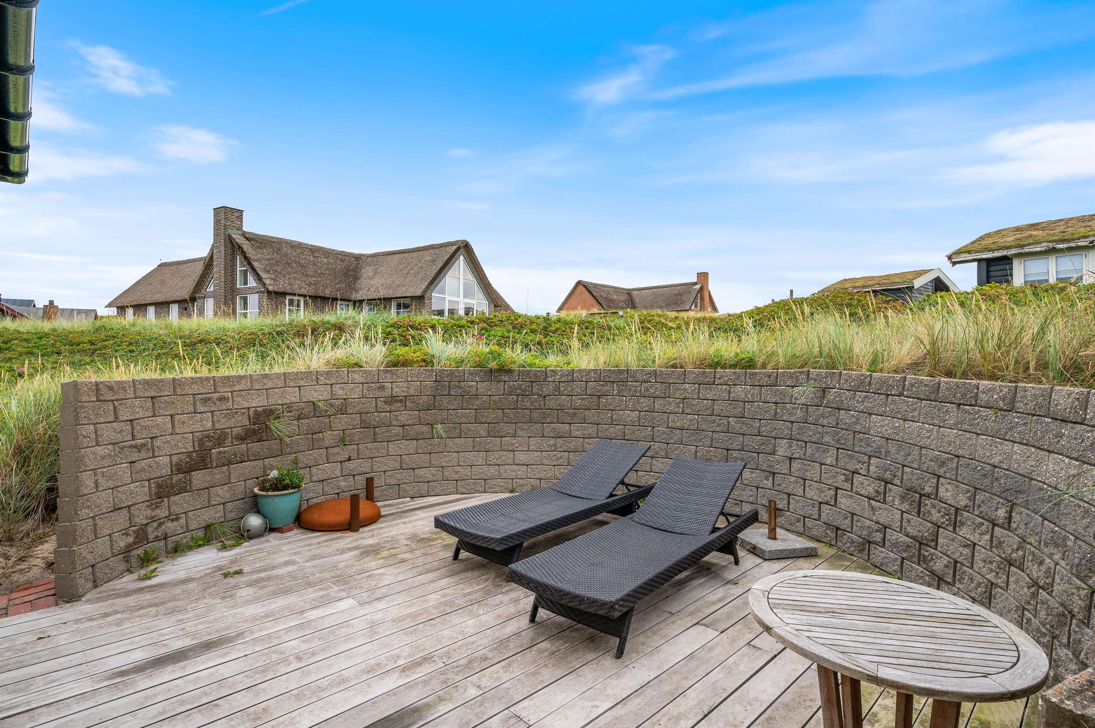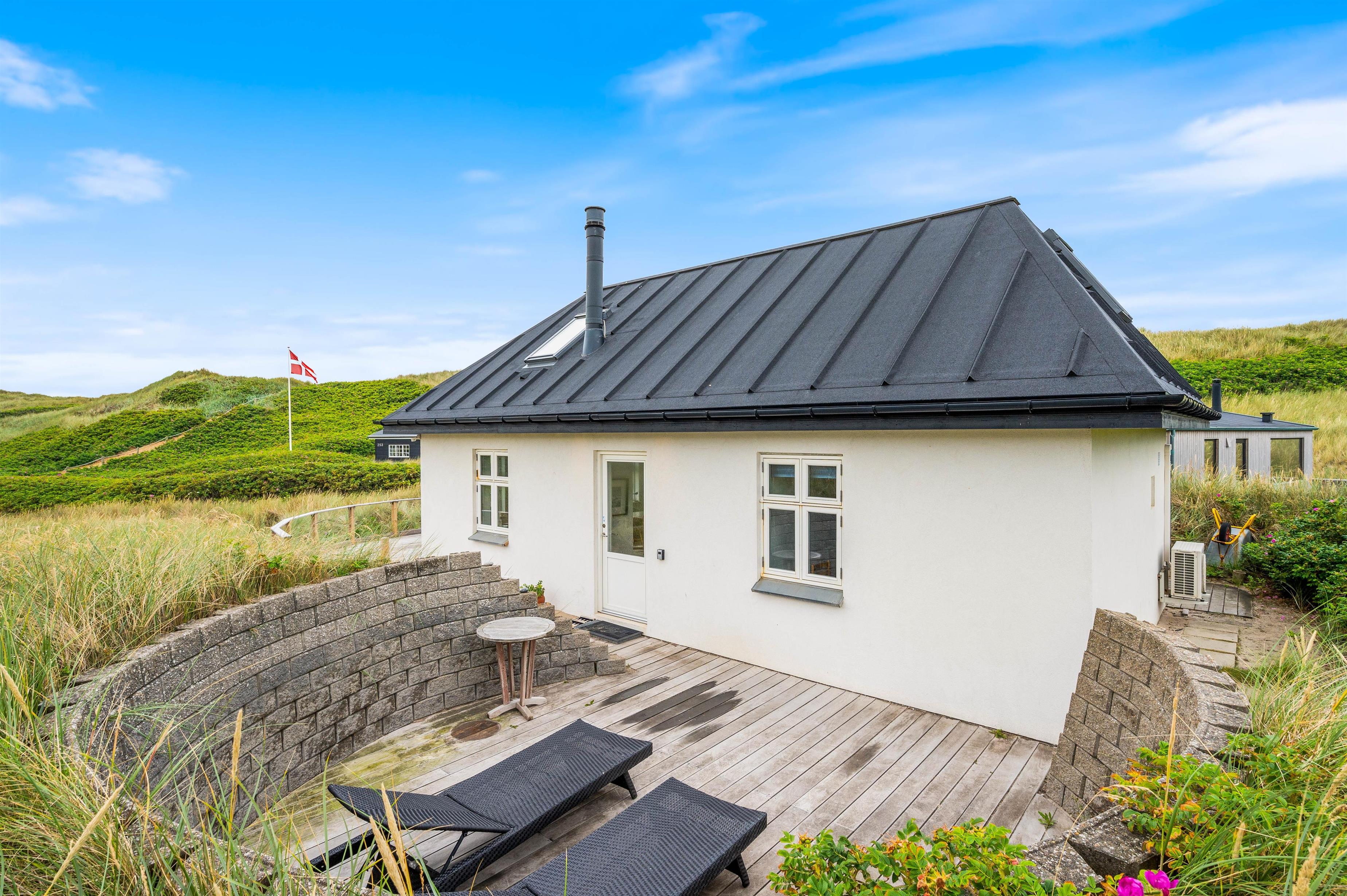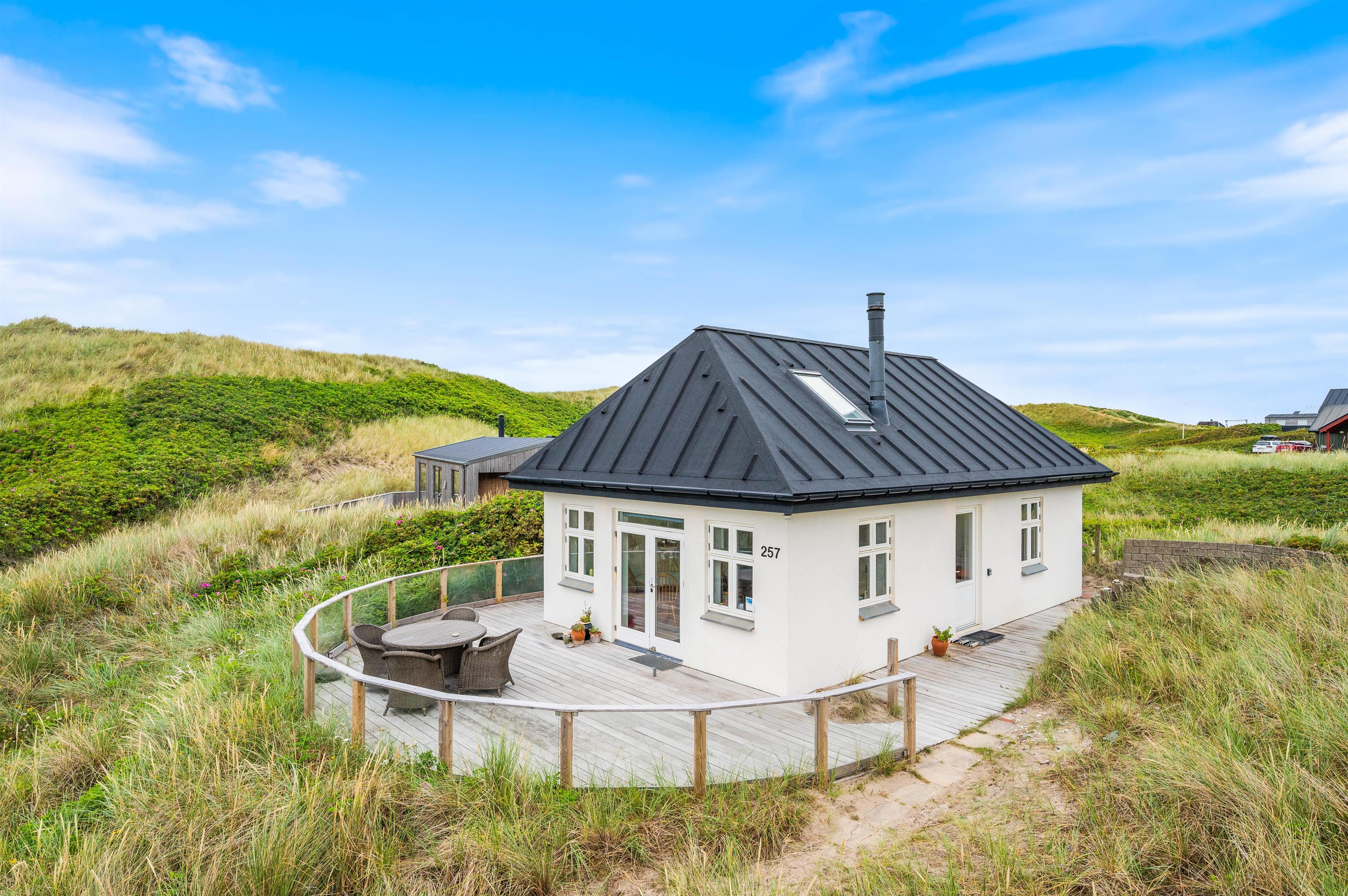 Sommerhuset på Lodbergsvej 257 ligger på en klitgrund på godt 1768m2 omgivet af marehalm. Terrassen på sydsiden af sommerhuset har en lile mur, der afskærmer for vestenvinden. På terrassen finder I havemøbler og grill til rådighed, så I efter en lang og dejlig dag kan sætte jer og nyde en kold drink eller tilberede et lækkert måltid mad.