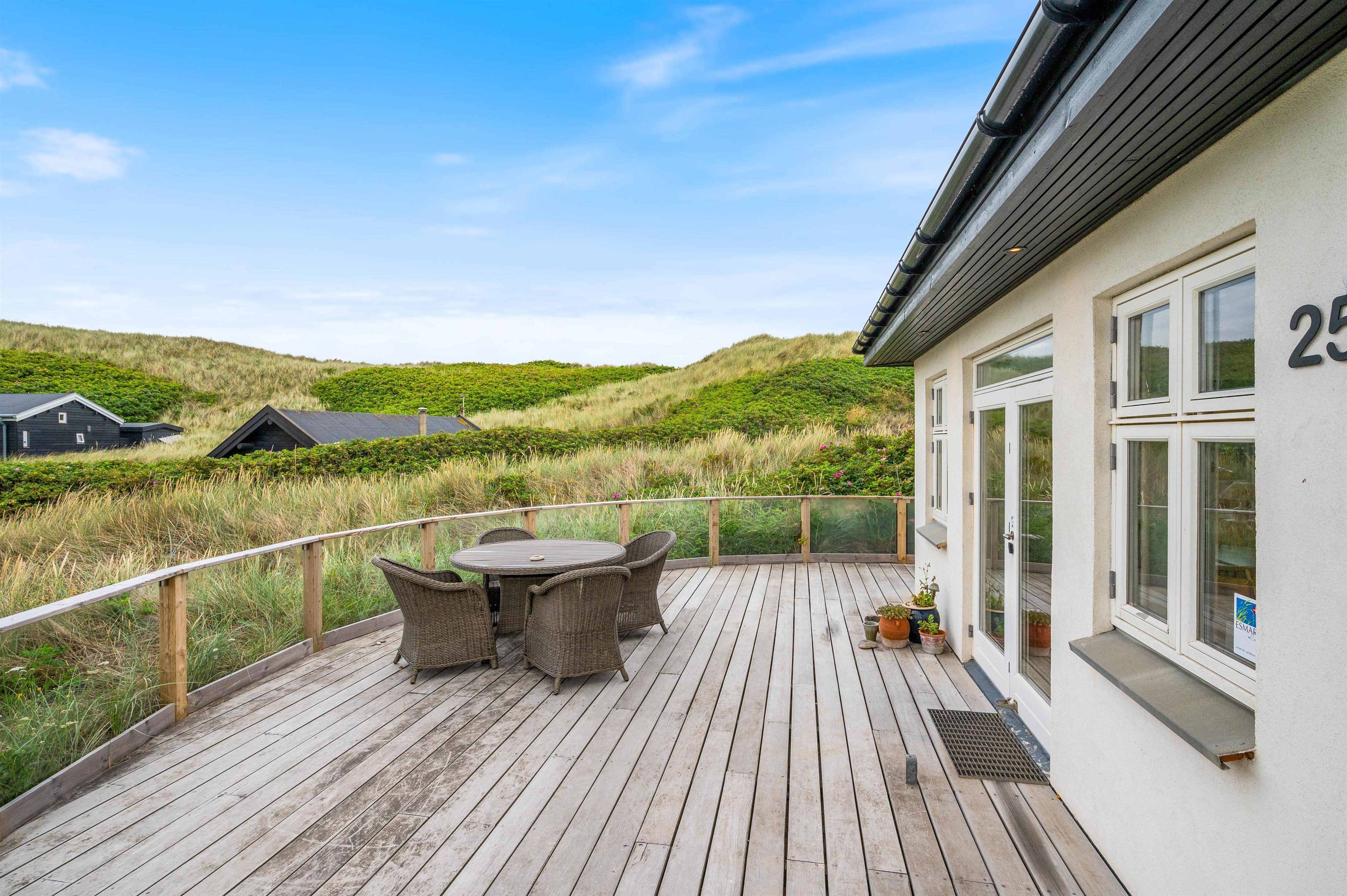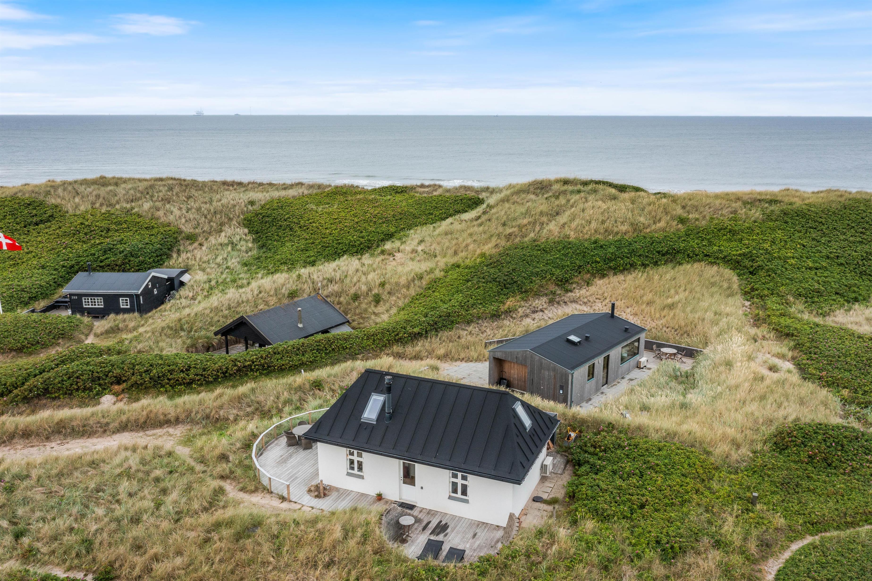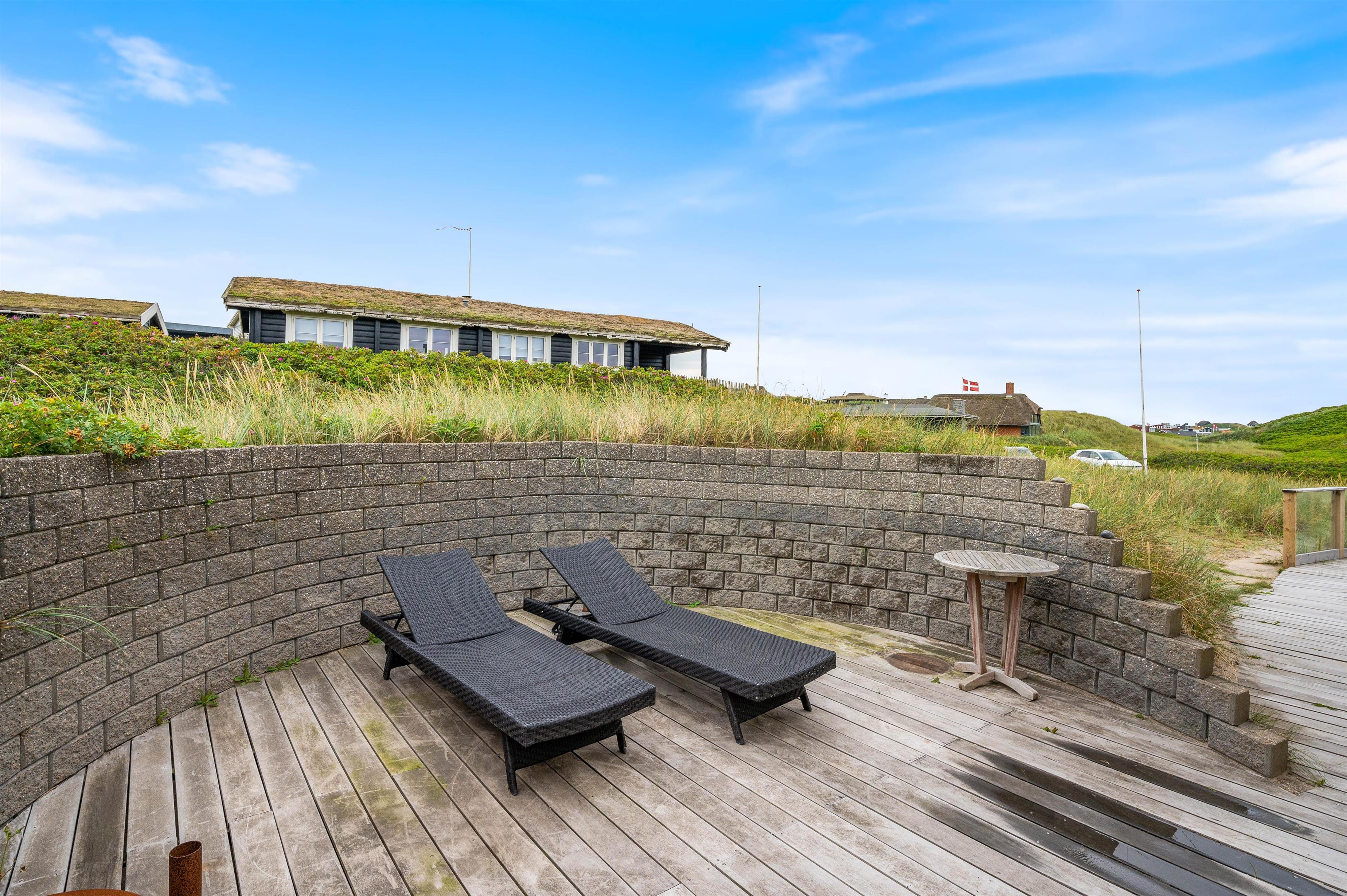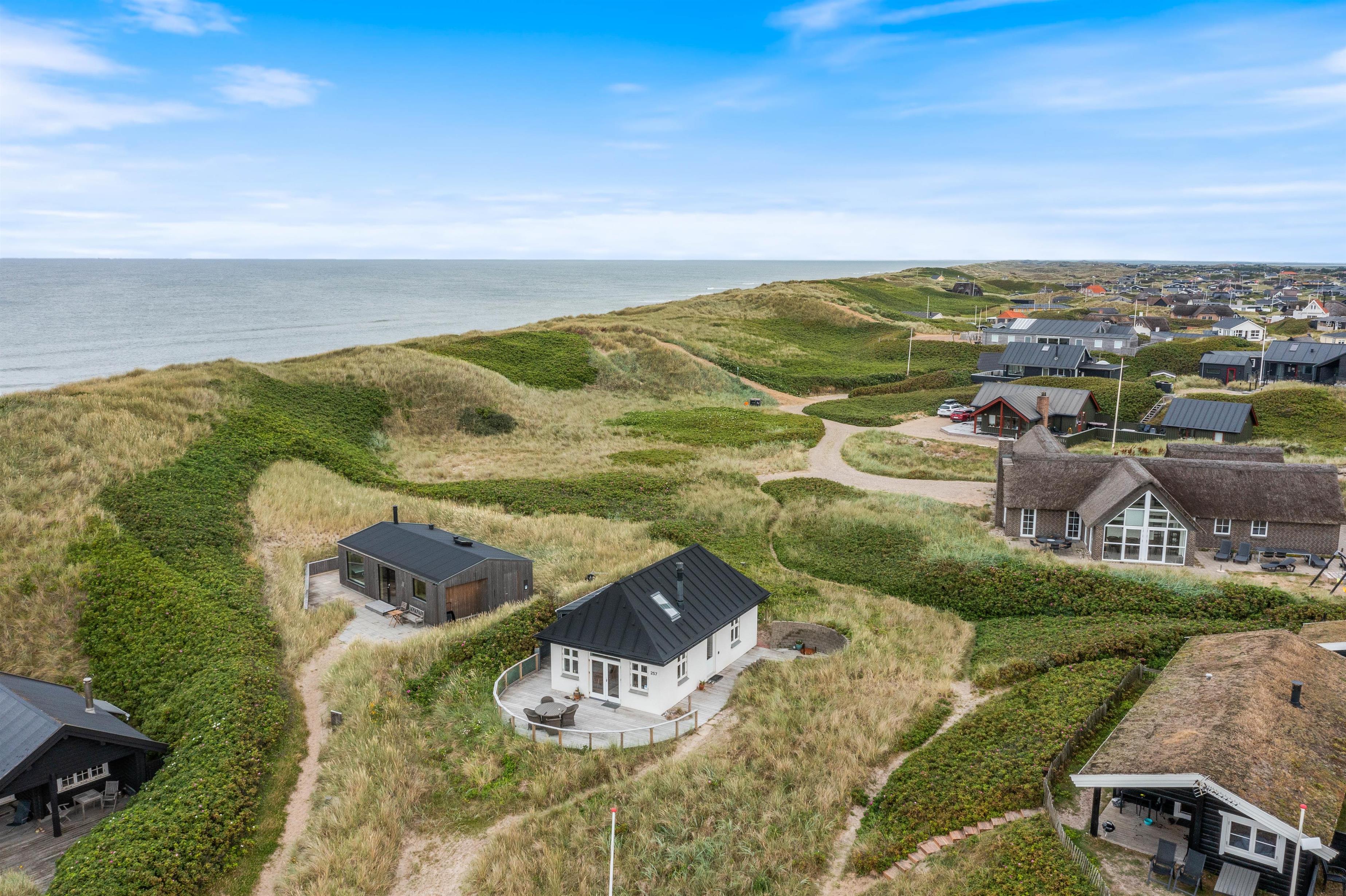 Sommerhuset på Lodbergsvej 257 ligger på en klitgrund på godt 1768m2 omgivet af marehalm. Terrassen på sydsiden af sommerhuset har en lile mur, der afskærmer for vestenvinden. På terrassen finder I havemøbler og grill til rådighed, så I efter en lang og dejlig dag kan sætte jer og nyde en kold drink eller tilberede et lækkert måltid mad.
