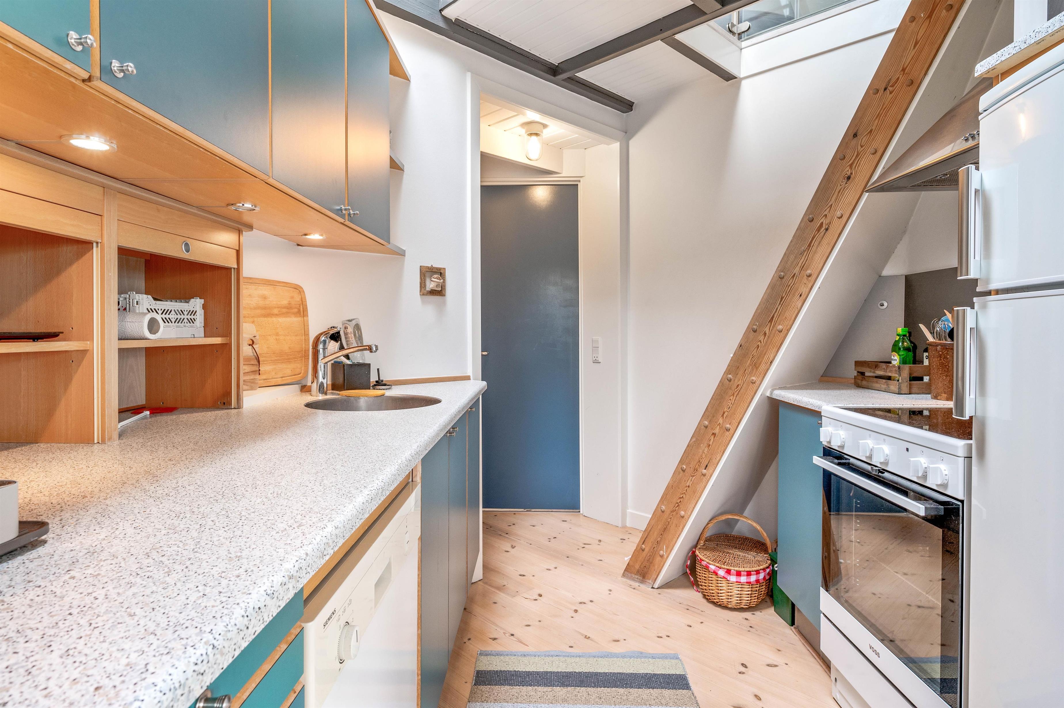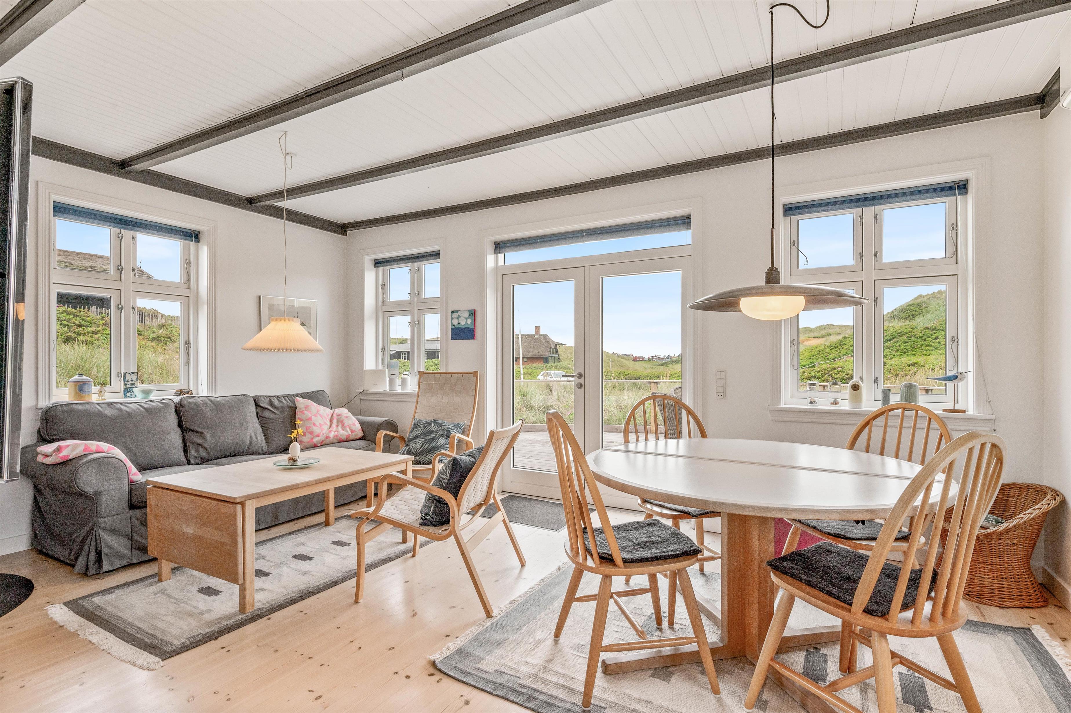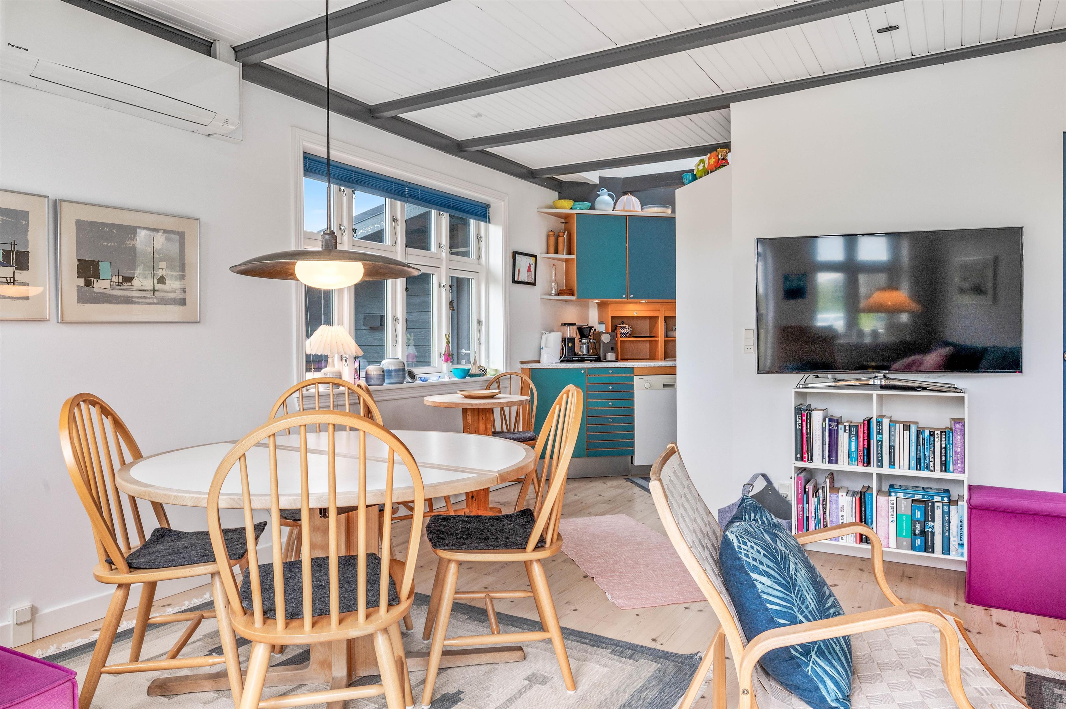 Sommerhusets hjerterum er stuen med det integrerede køkken og spiseplads. Her kan I planlægge jeres ferieaktiviteter, lave mad sammen og spille fælles spil. Om aftenen kan I streame jeres yndlingsfilm på Apple tv'et eller læse en god bog foran brændeovnen, der sørger for ægte sommerhusstemning i det lille hus. I køkkenet finde I også en opvaskemaskine, så I ikke behøver at vaske op på ferien. Derudover sørger den energivenlige luft-til-luft-varmepumpe for et behageligt indeklima.