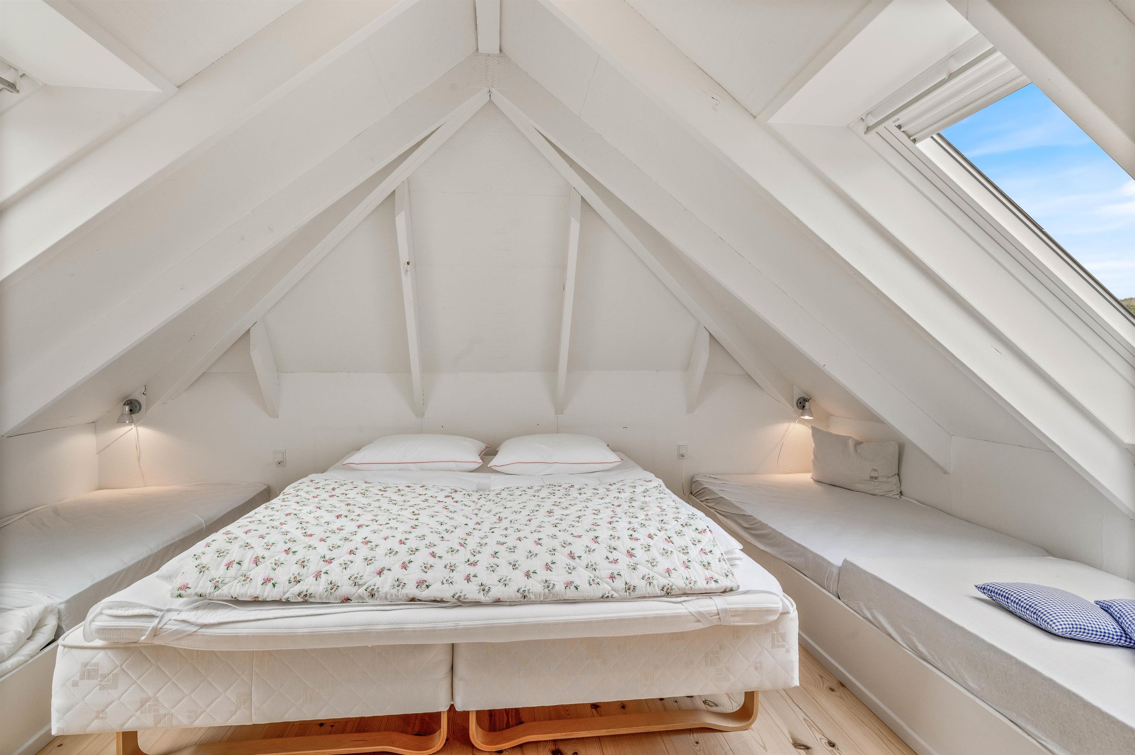 Sommerhuset på Lodbergsvej 257 indeholder 3 soveværelser, så der er god plads til at fordele sig på, om det er en ferie iblandt venner eller den lille familie, hvor hvert barn har sit eget værelse. Et af soveværelserne ligger i stueetagen, mens de to andre soveværelser ligger på første sal, som I når via en trappe i køkkenet. På badeværelset finder I også både tørretumbler og vaskemaskine, og der er installeret gulvvarme i badeværelset.