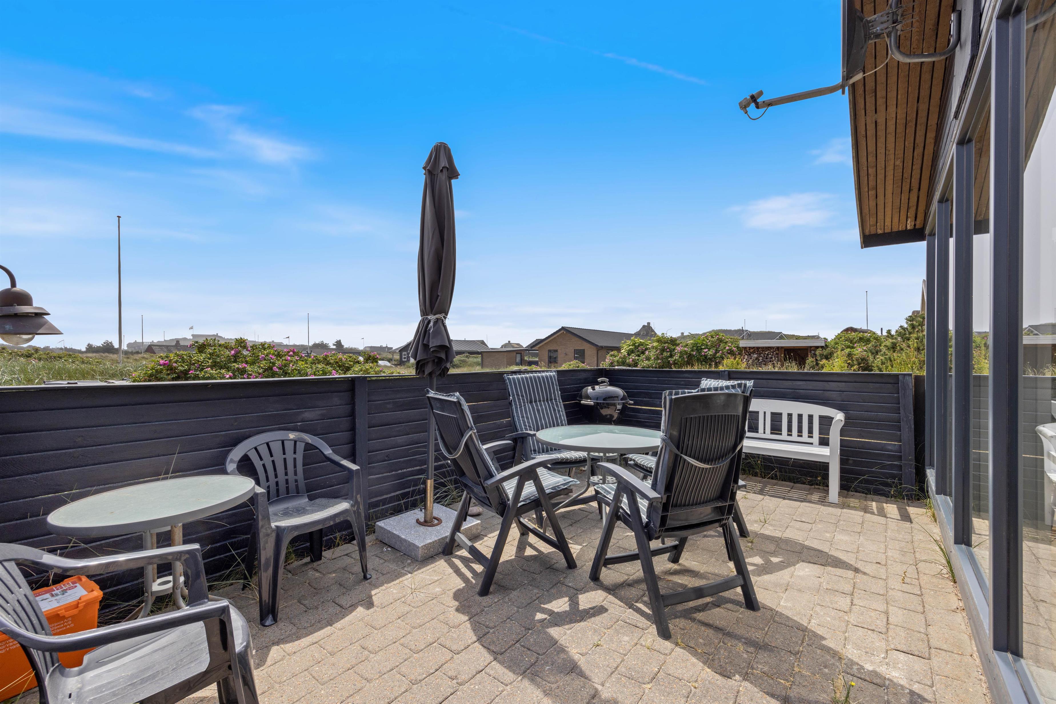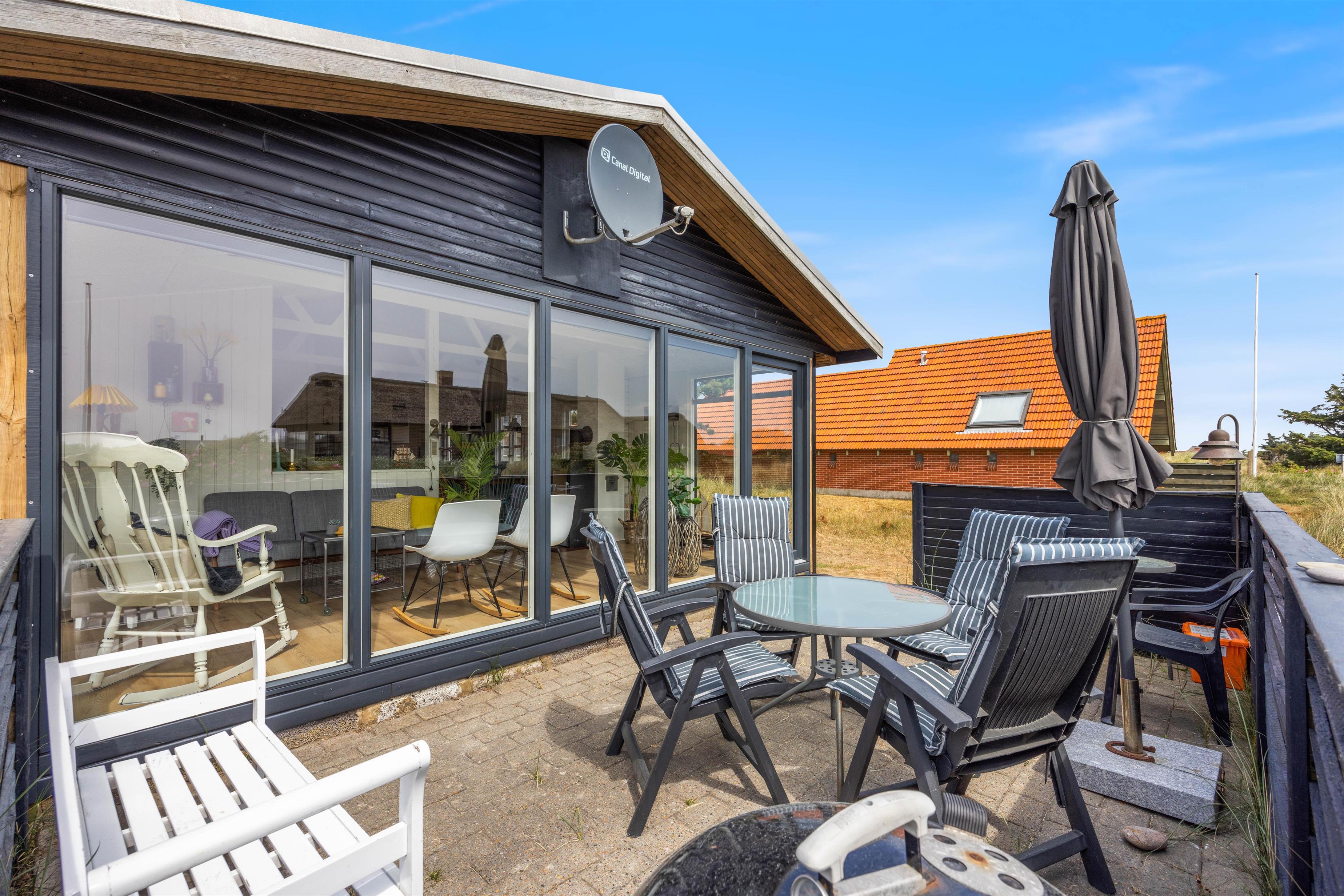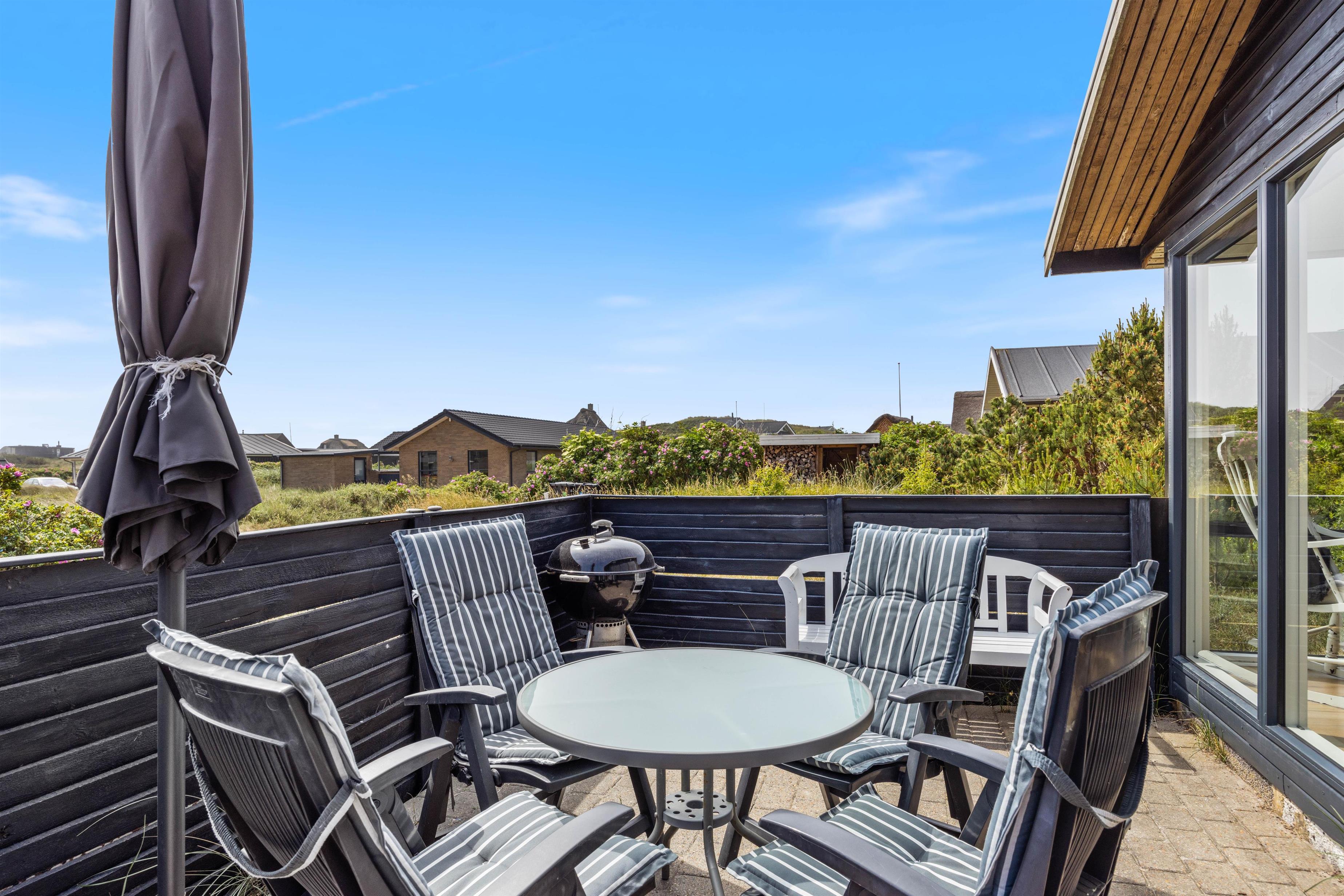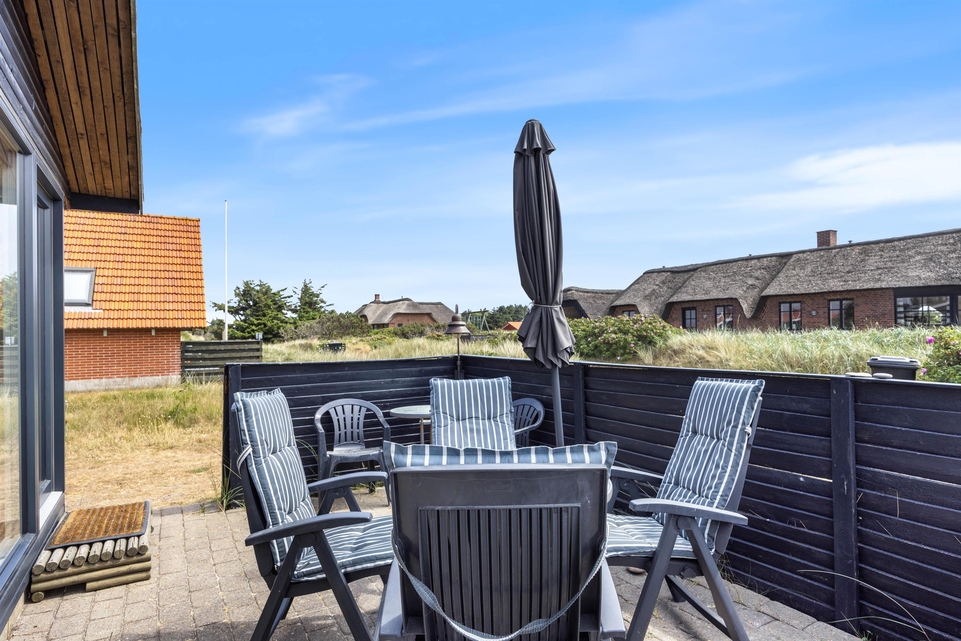 Fra sommerhusets udestue kan I bevæge jer videre ud på terrassen, hvor I kan sætte jer godt til rette i havemøbler og liggestole på de feriedage, hvor vejret er i top. Terrassen vender mod syd, og I vil derfor kunne nyde solen det meste af dagen.