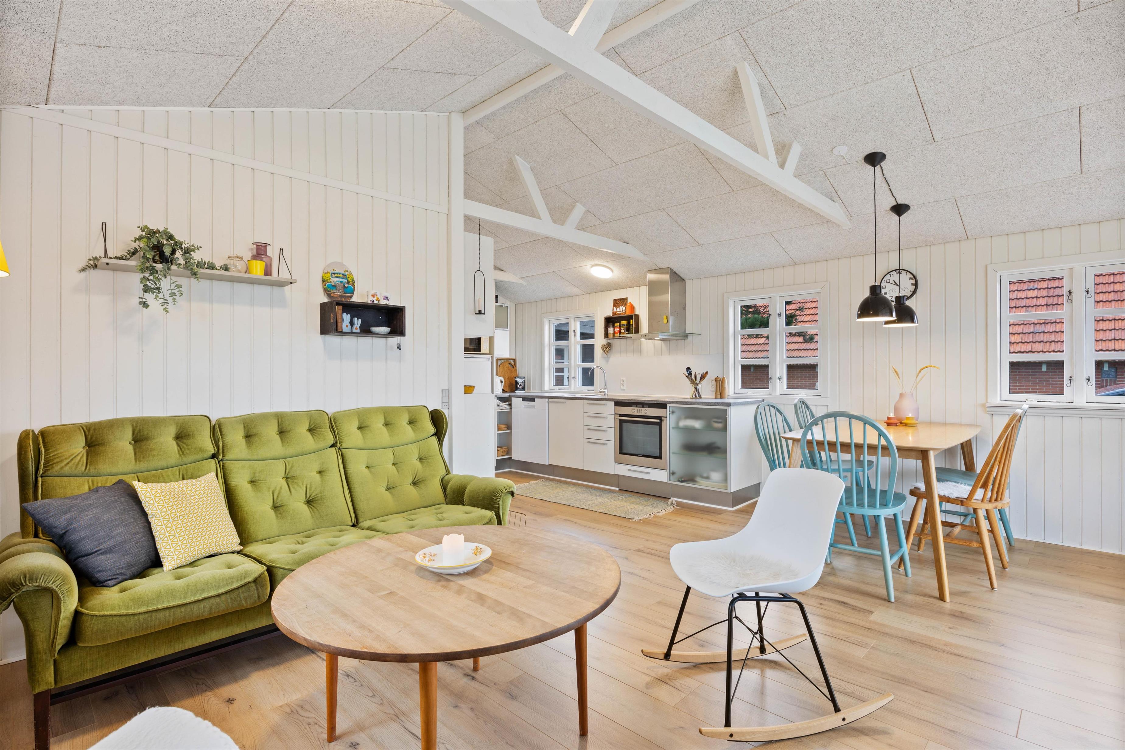 I sommerhuset på Molsvej 28 udgør alrummet hjertet og samlingspunktet, hvor I kan tilbringe og nyde mange hyggelige timer og stunder sammen i løbet af ferien. Her har I både mulighed for at lave mad sammen, spille spil ved bordet og samles i sofaen til film i Smart tv’et.