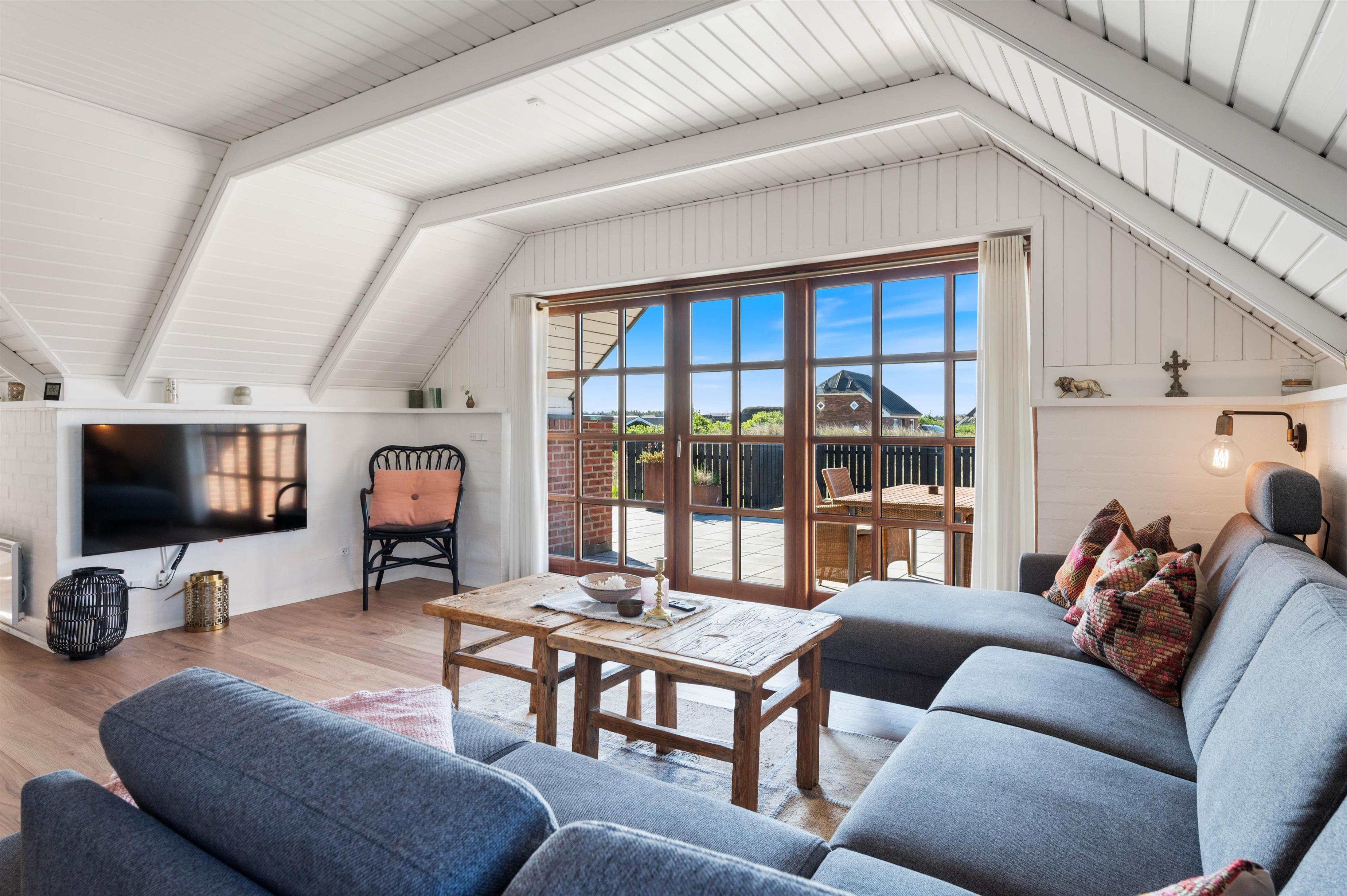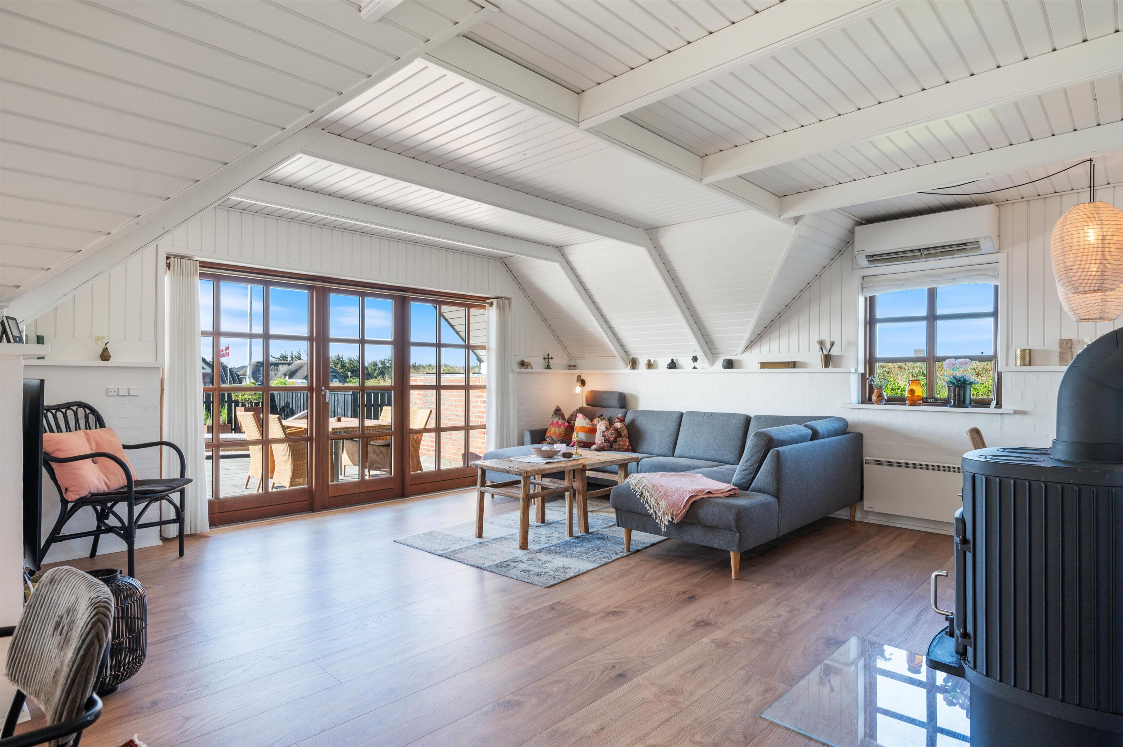 Fra opholdsrummet er der udgang til husets terrasser med en overdækket, afskærmet og åben del. Her kan I rigtig dase på de varme sommerdage med en kold drink eller læse en god bog i skyggen under den overdækkede terrasse. Om aftenen kan I tænde op i grillen, spise en dejlig middag og nyde et glas vin i den gyldne aftensol.